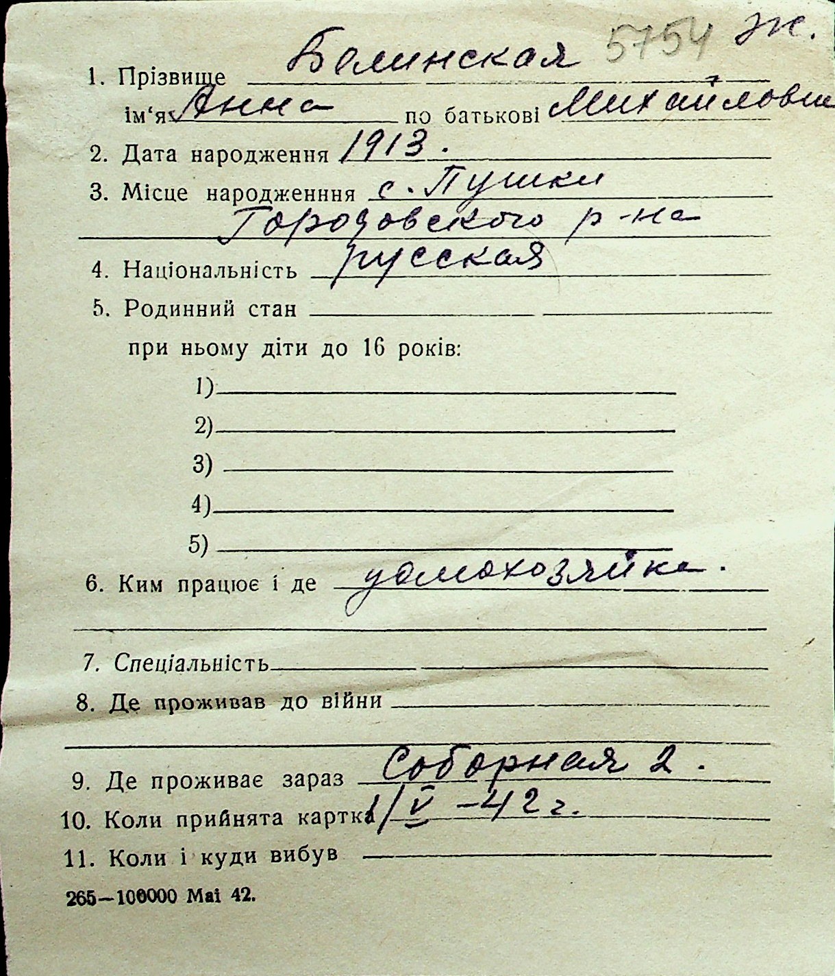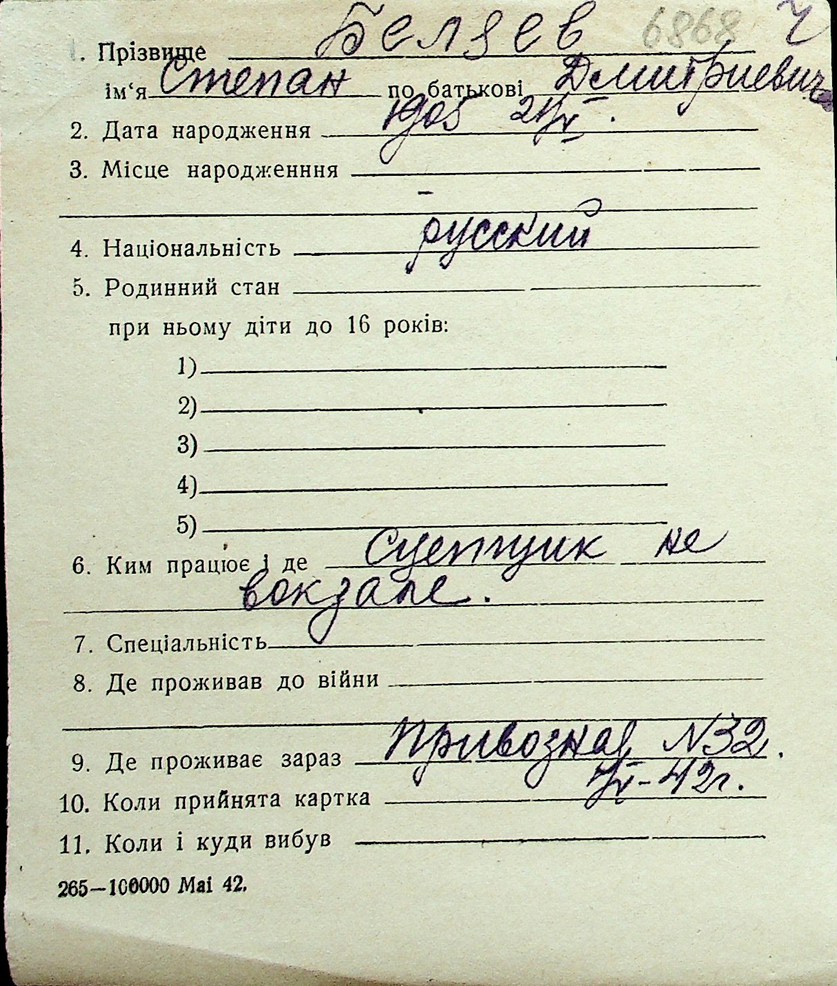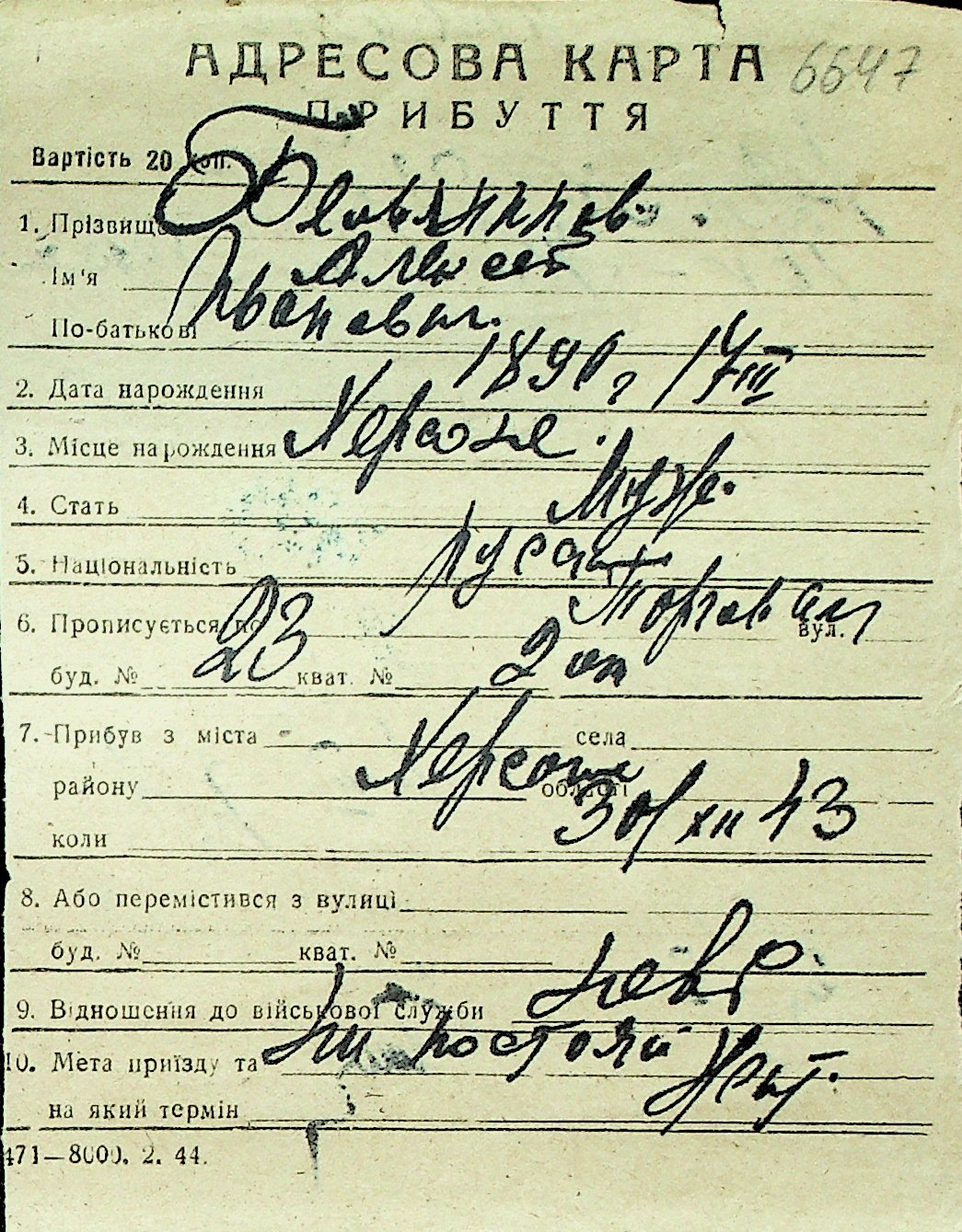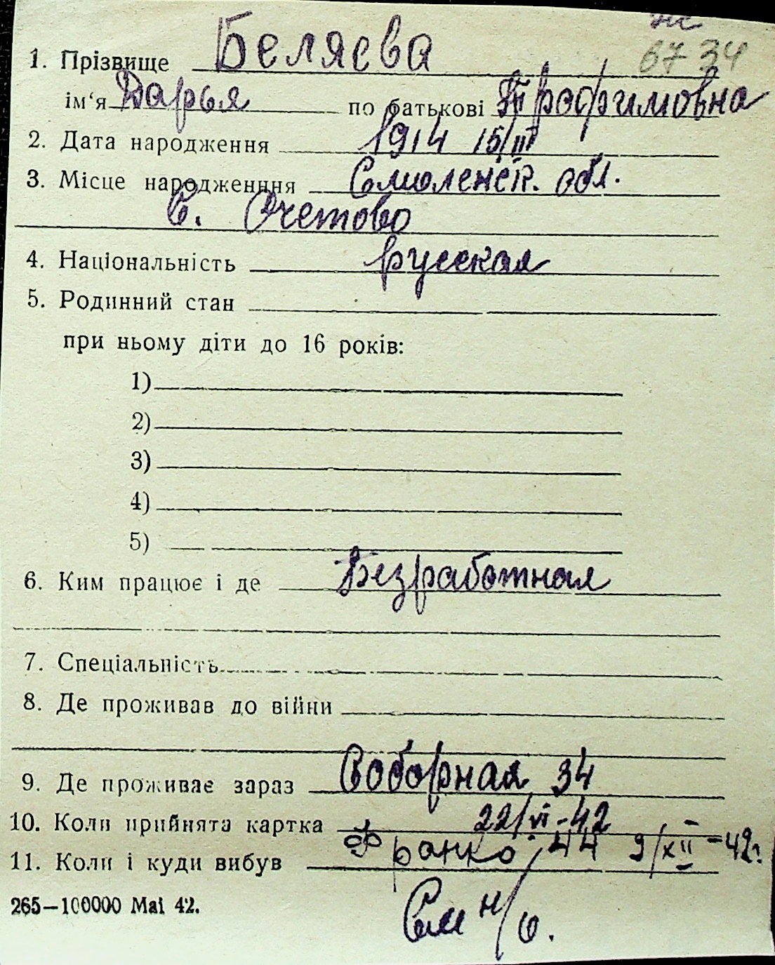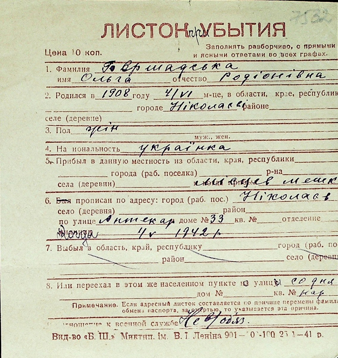 ◦ ◦ Перелік карток на осіб, які мешкали у м. Миколаїв у період окупації 1941–1944 років