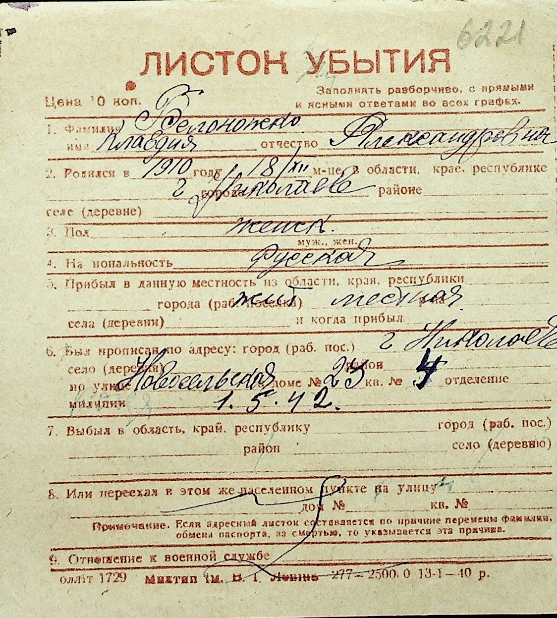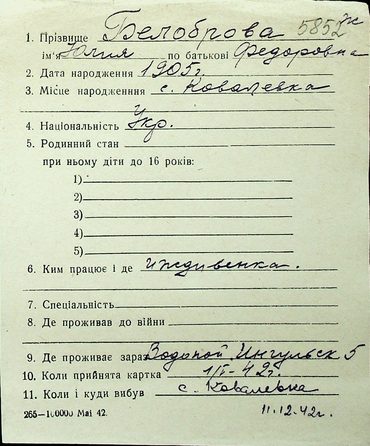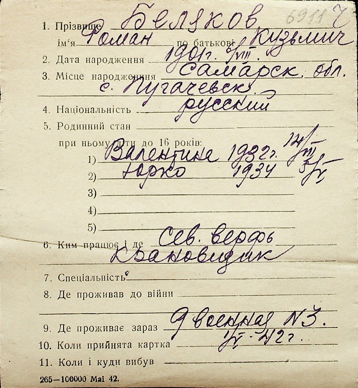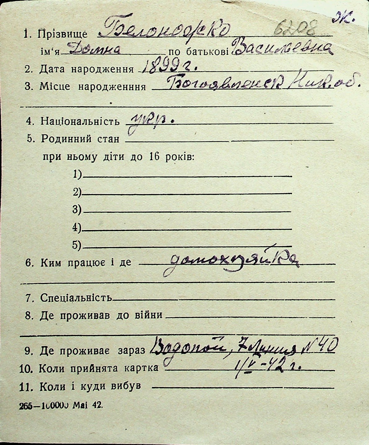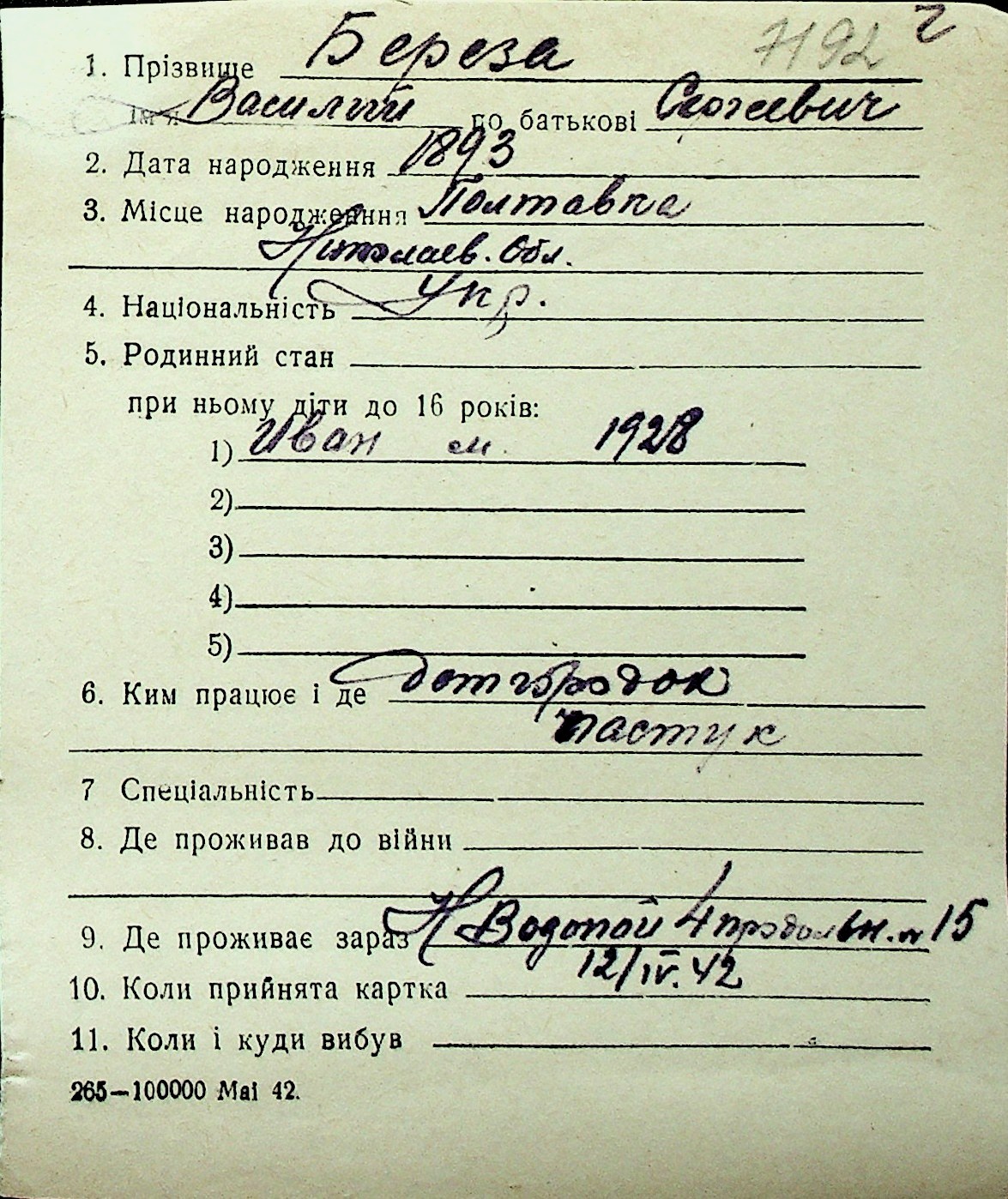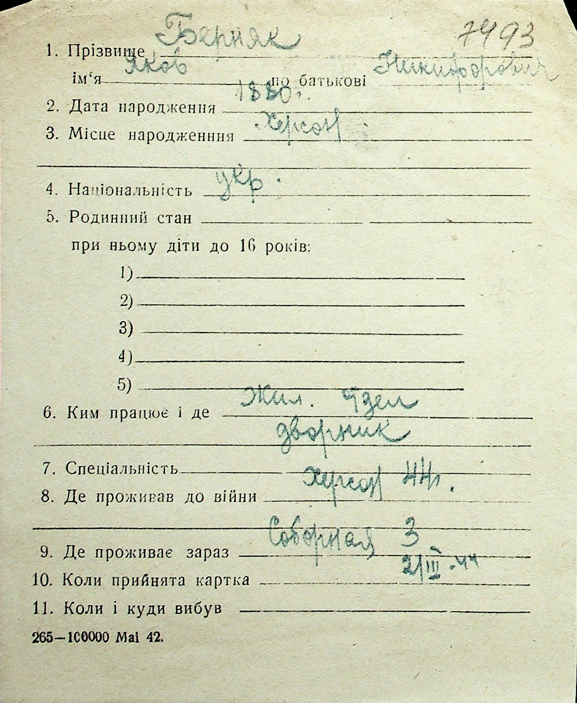 ◦ ◦ Перелік карток на осіб, які мешкали у м. Миколаїв у період окупації 1941–1944 років