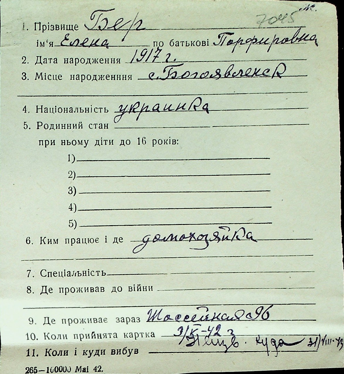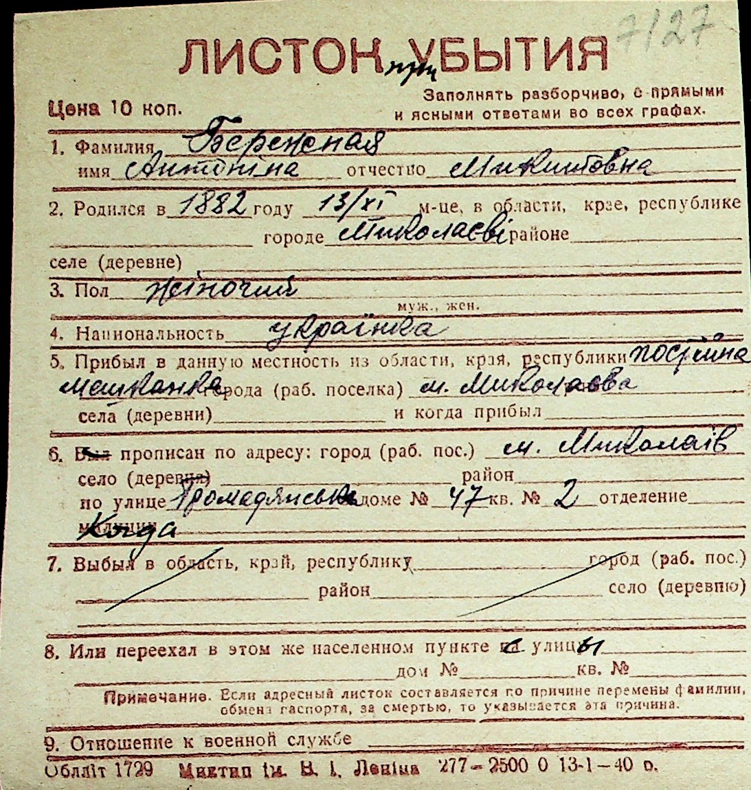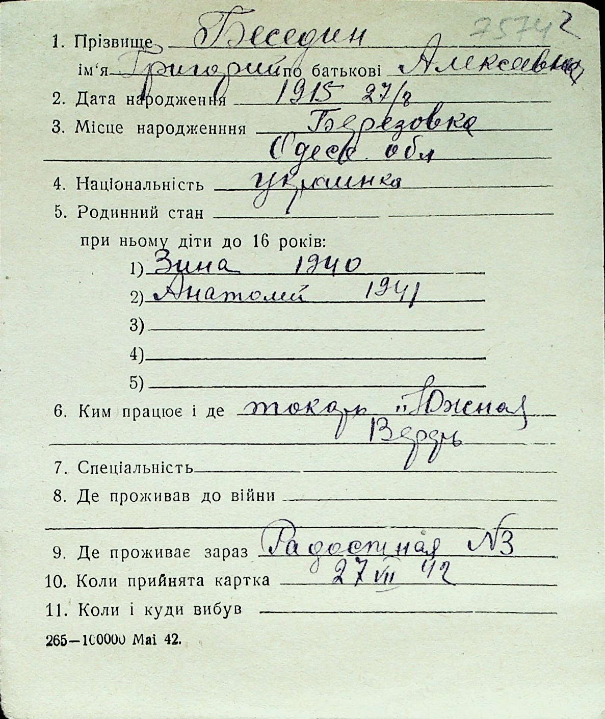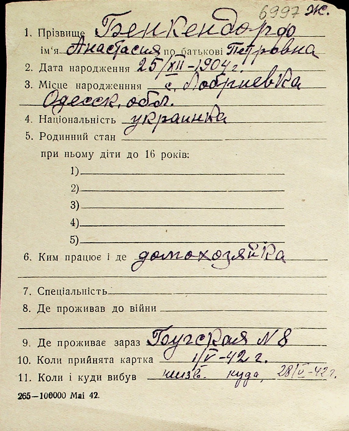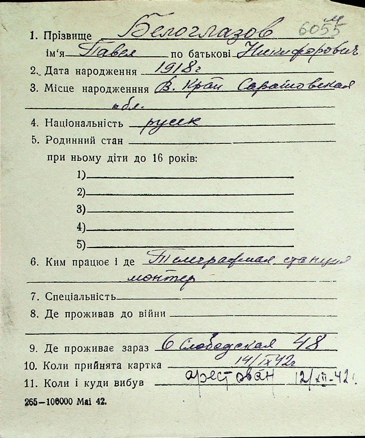 ◦ ◦ Перелік карток на осіб, які мешкали у м. Миколаїв у період окупації 1941–1944 років