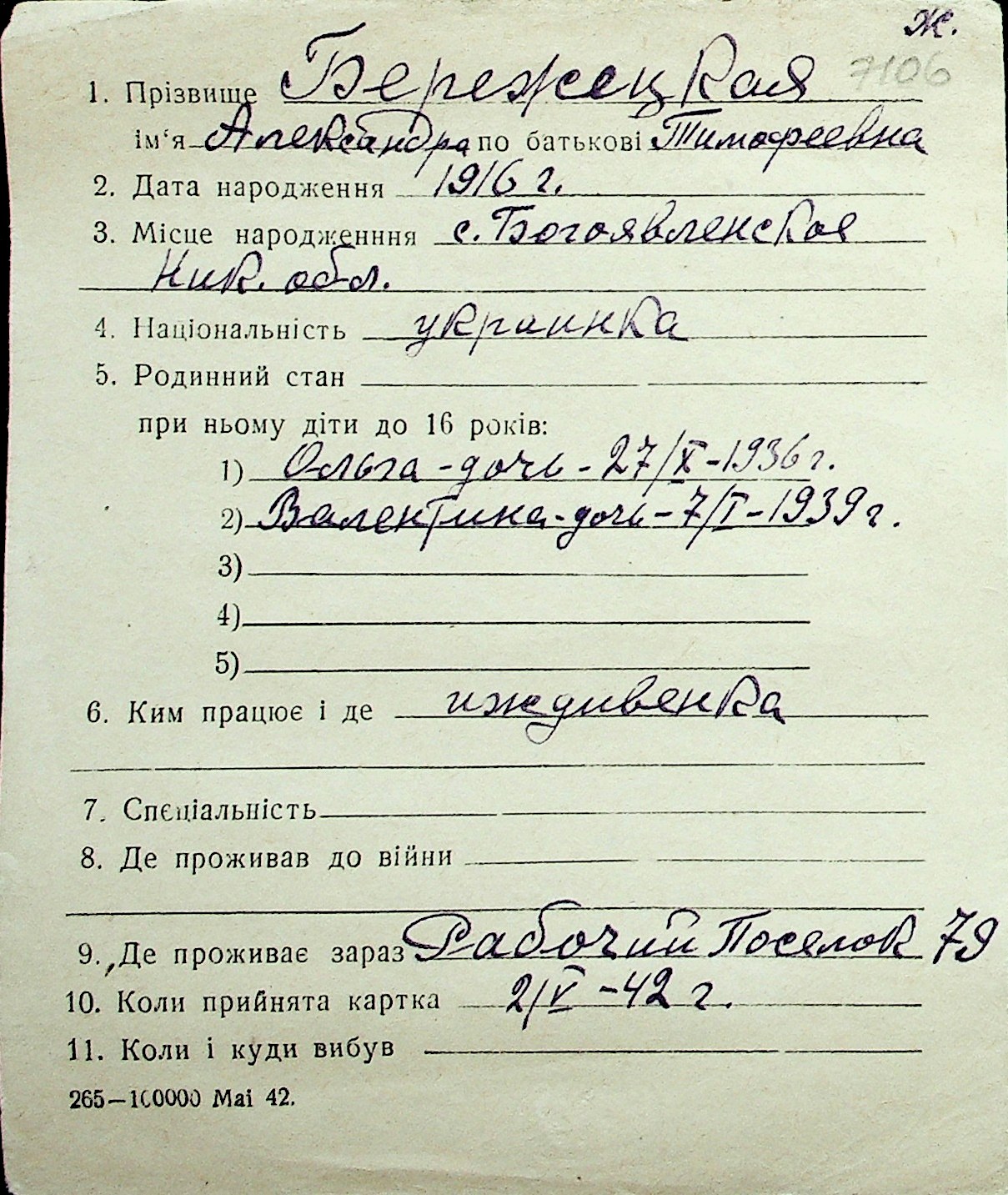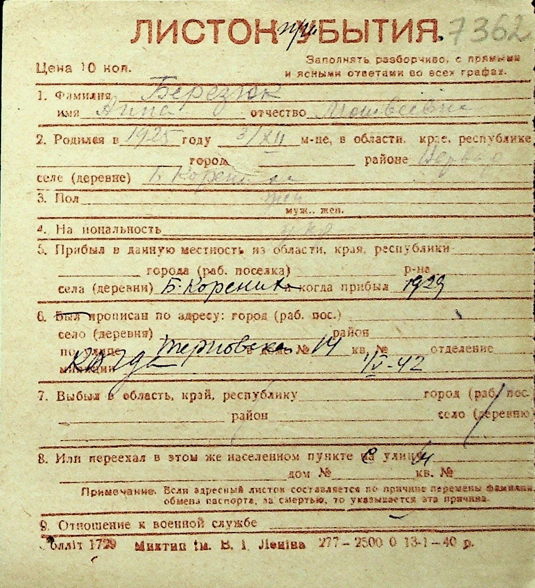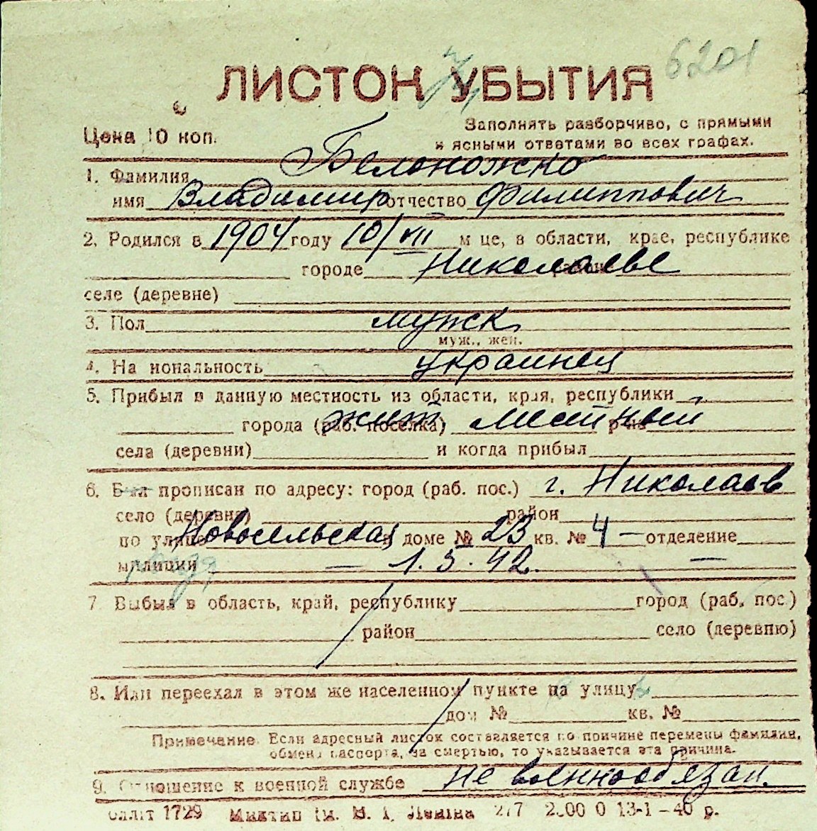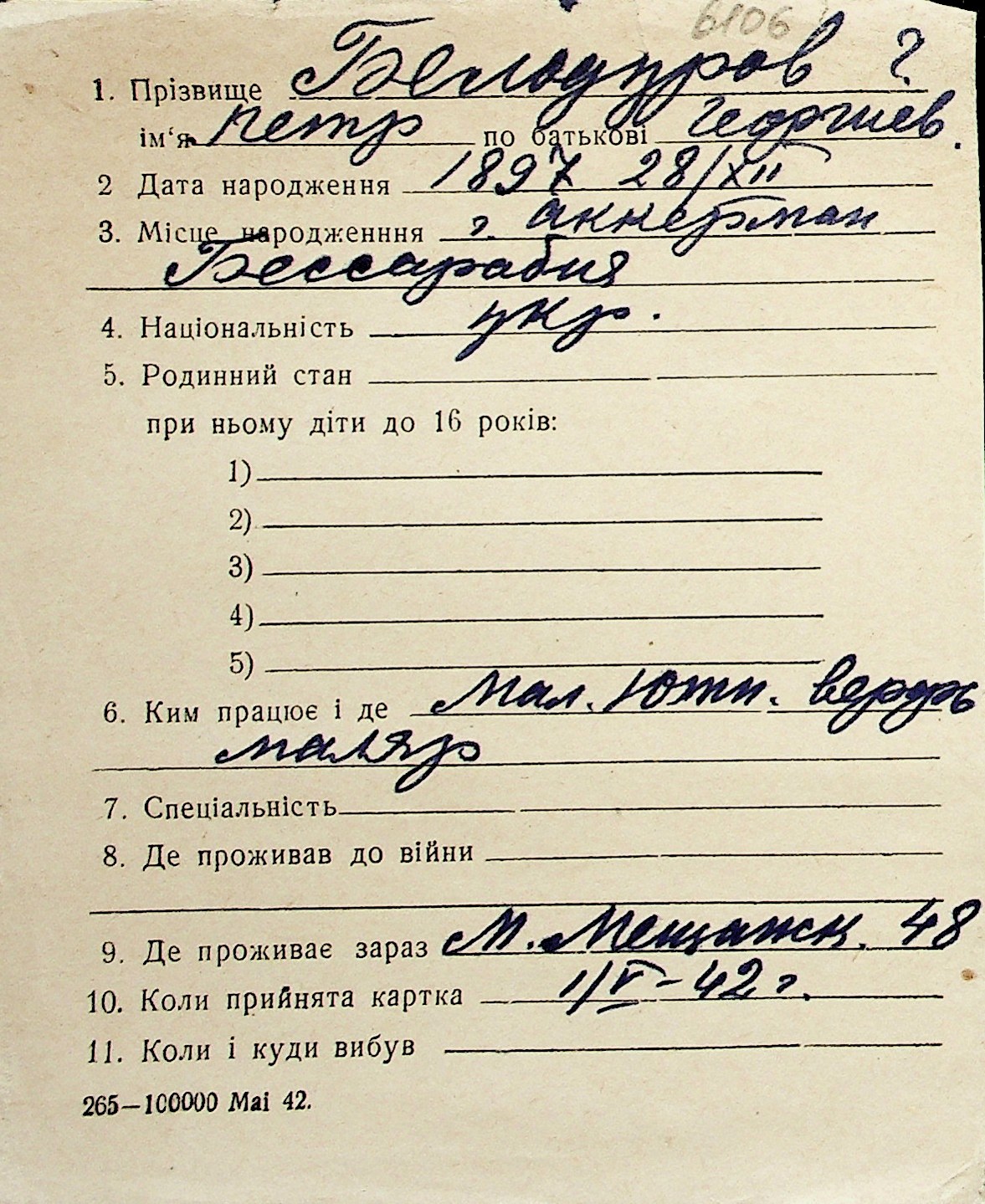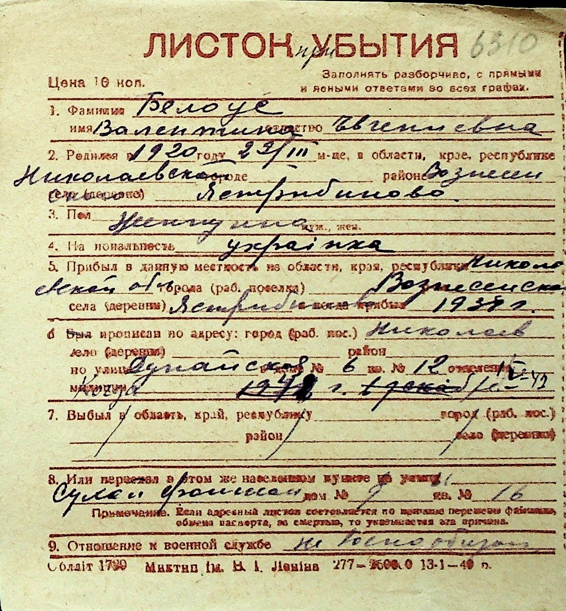 ◦ ◦ Перелік карток на осіб, які мешкали у м. Миколаїв у період окупації 1941–1944 років