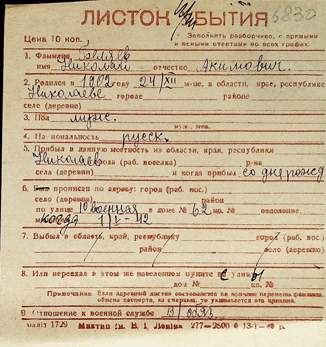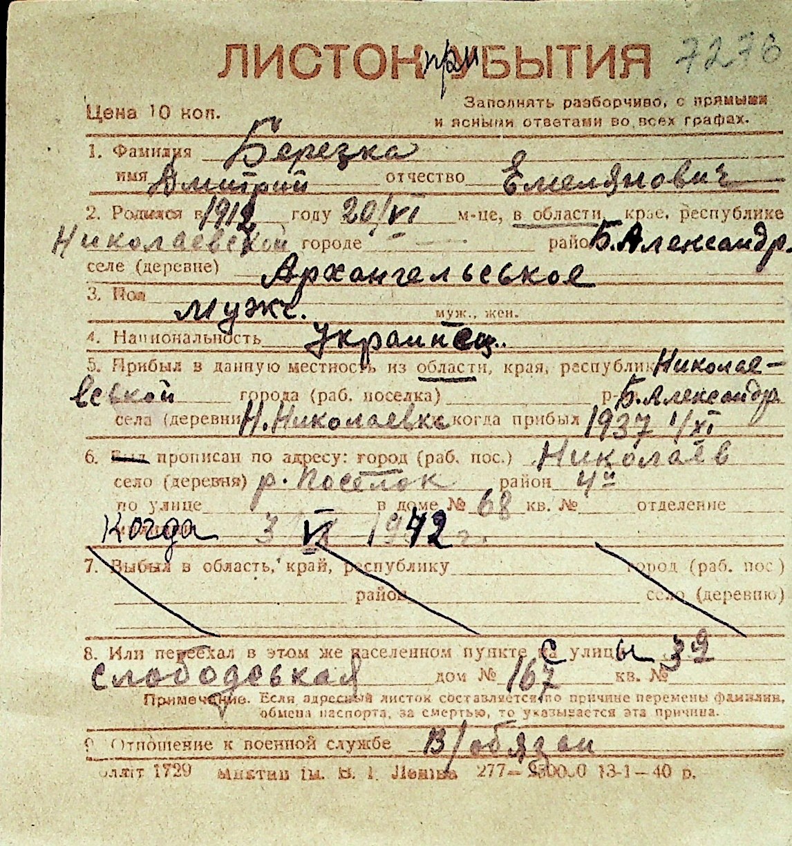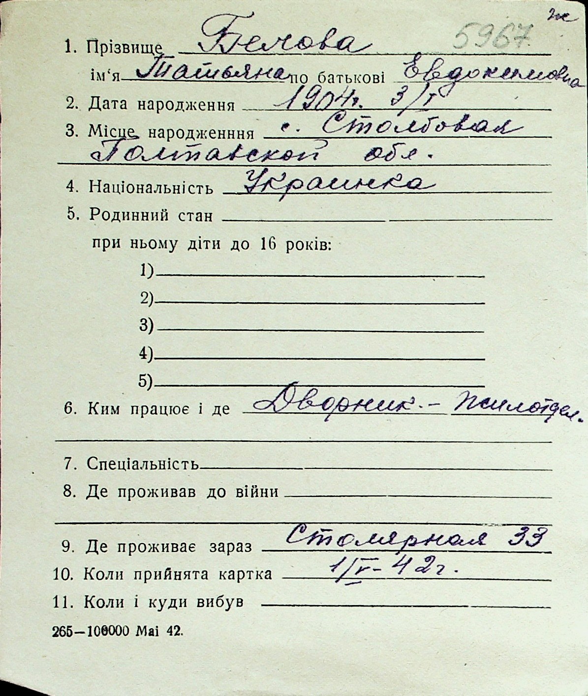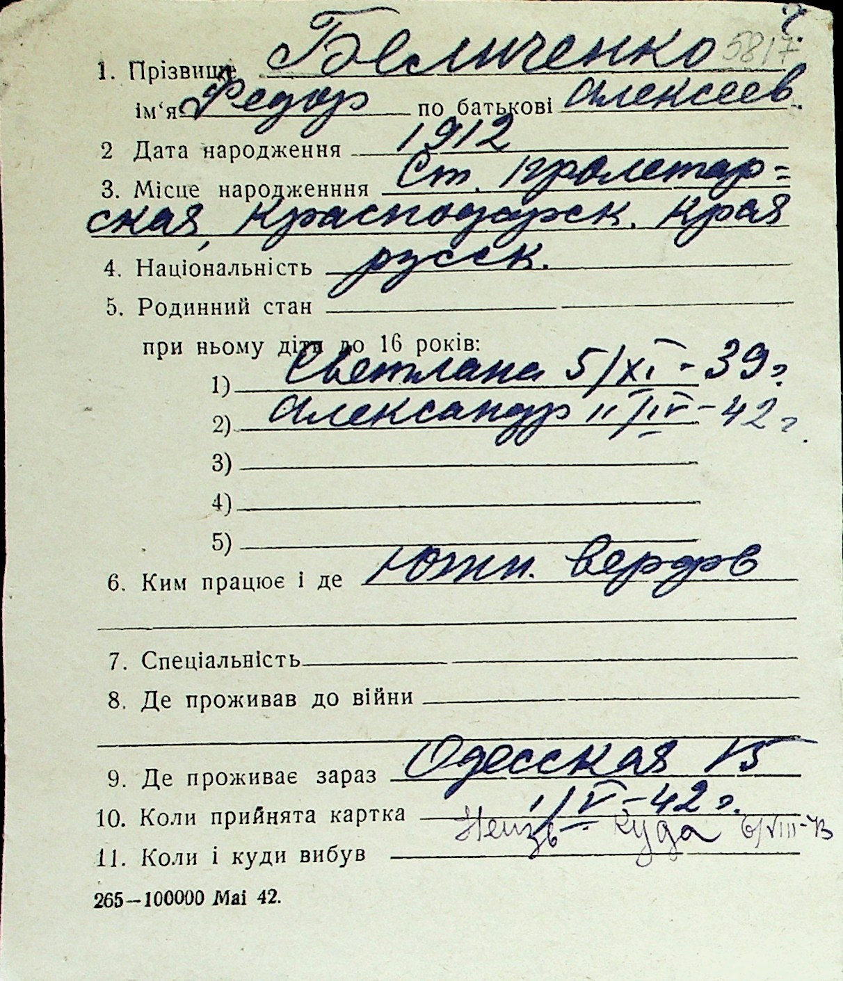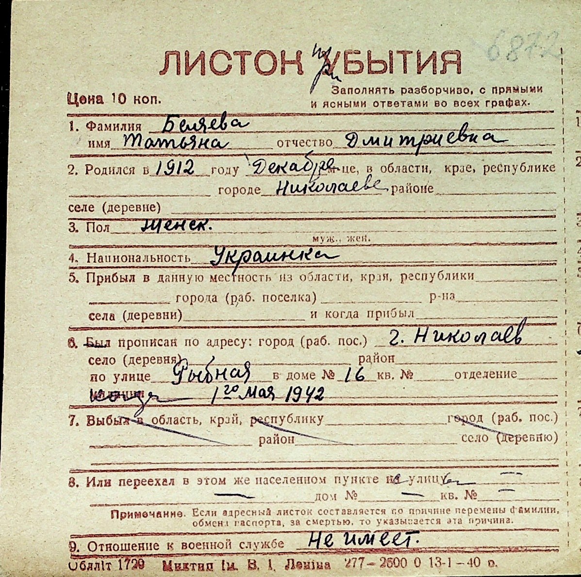 ◦ ◦ Перелік карток на осіб, які мешкали у м. Миколаїв у період окупації 1941–1944 років