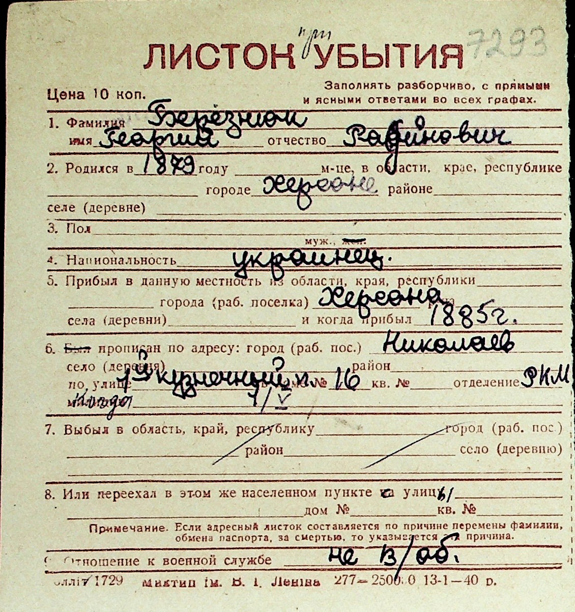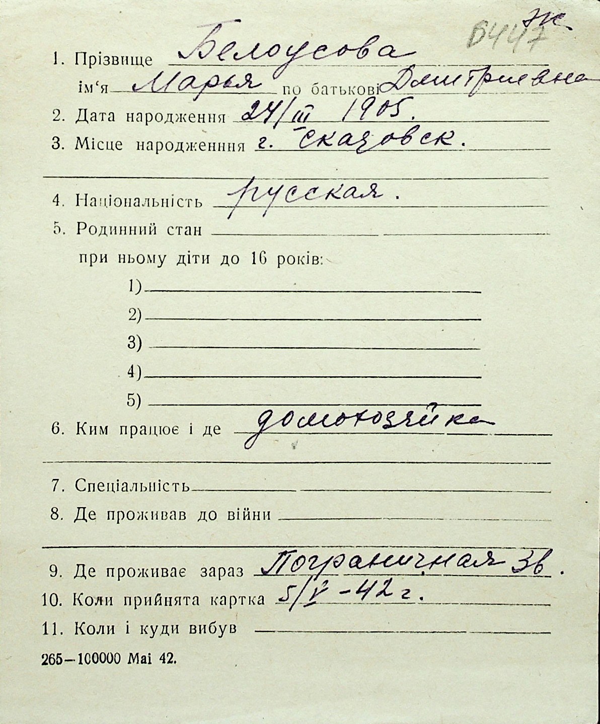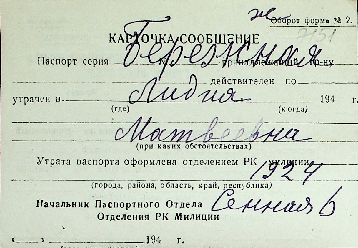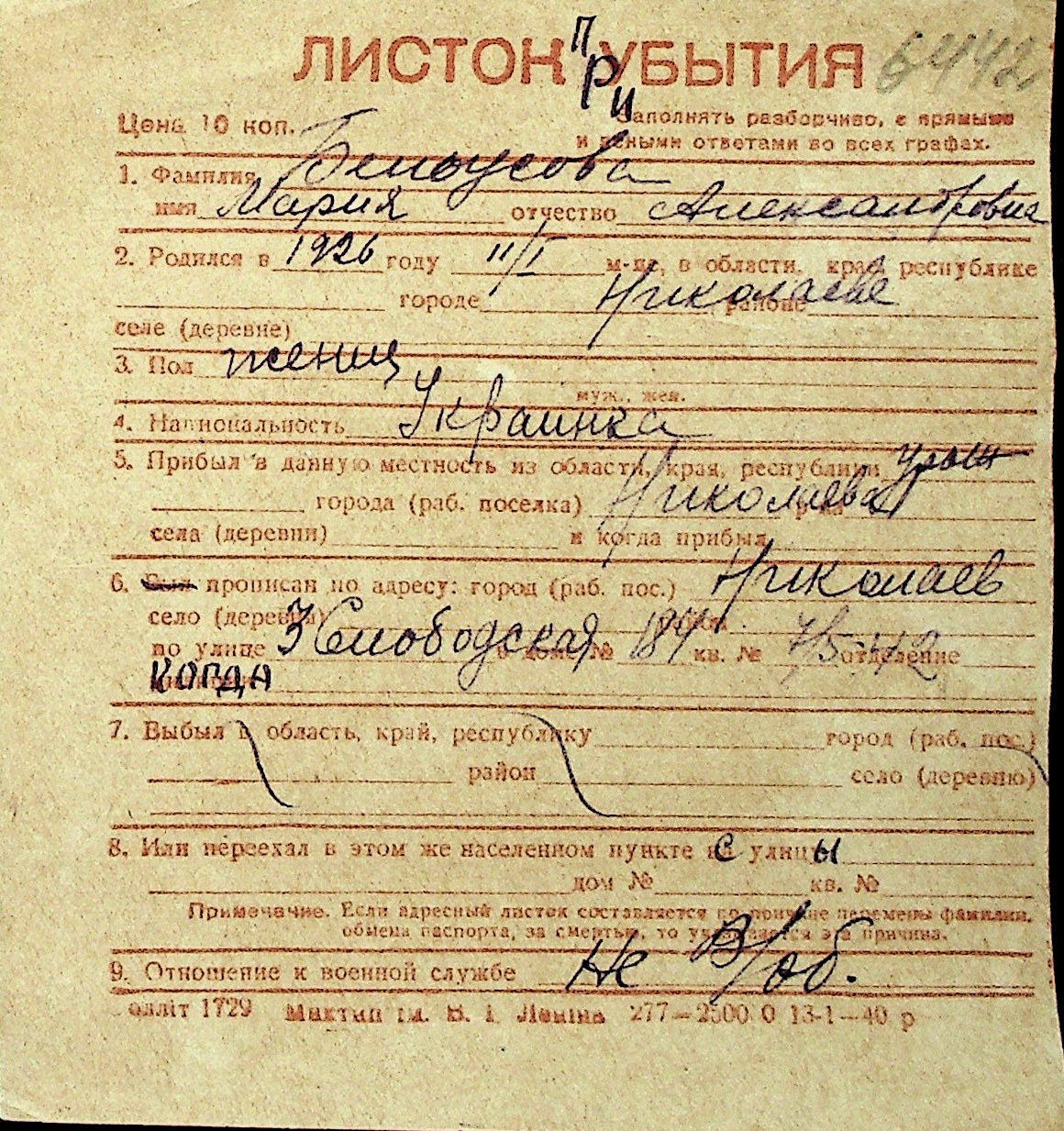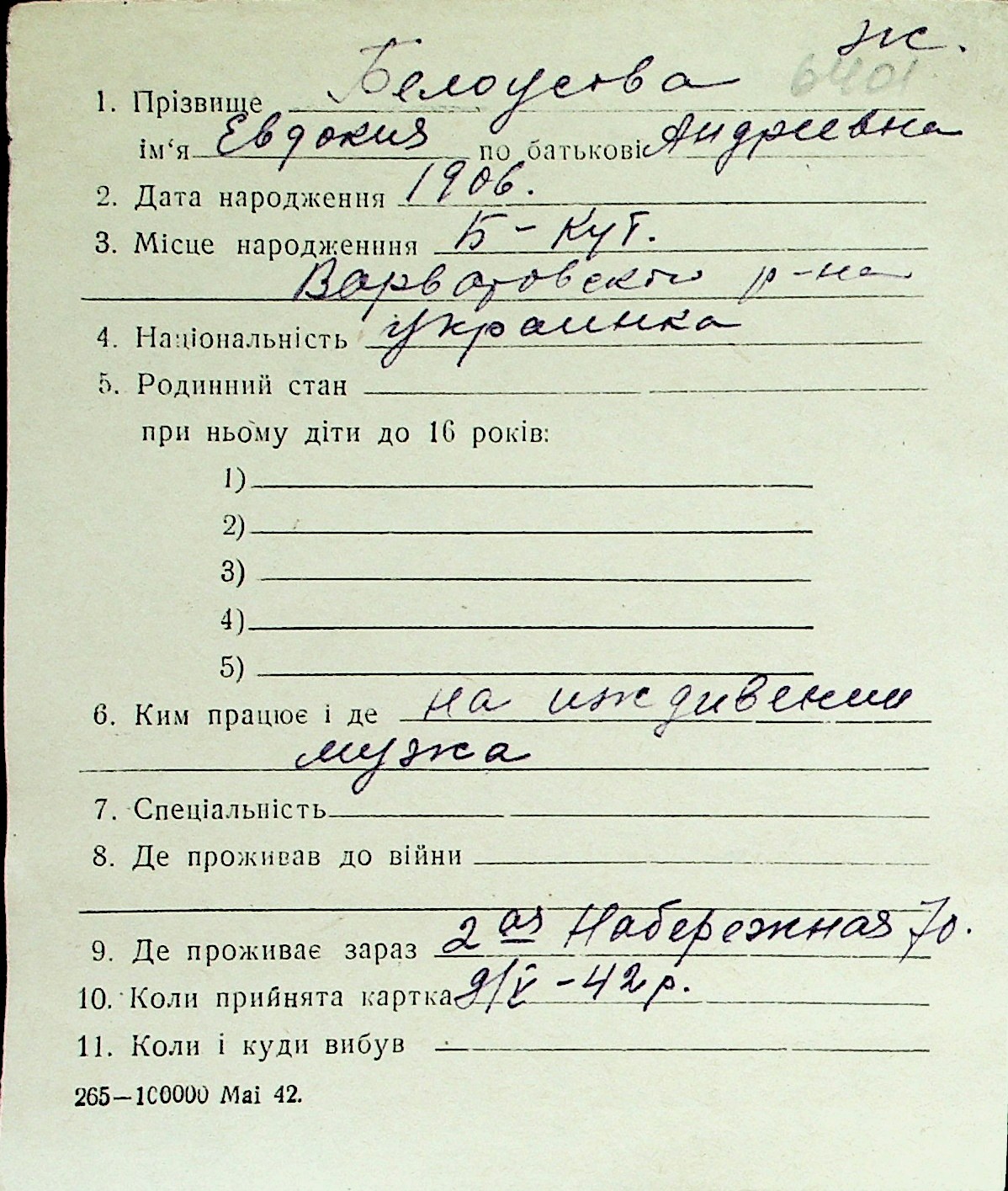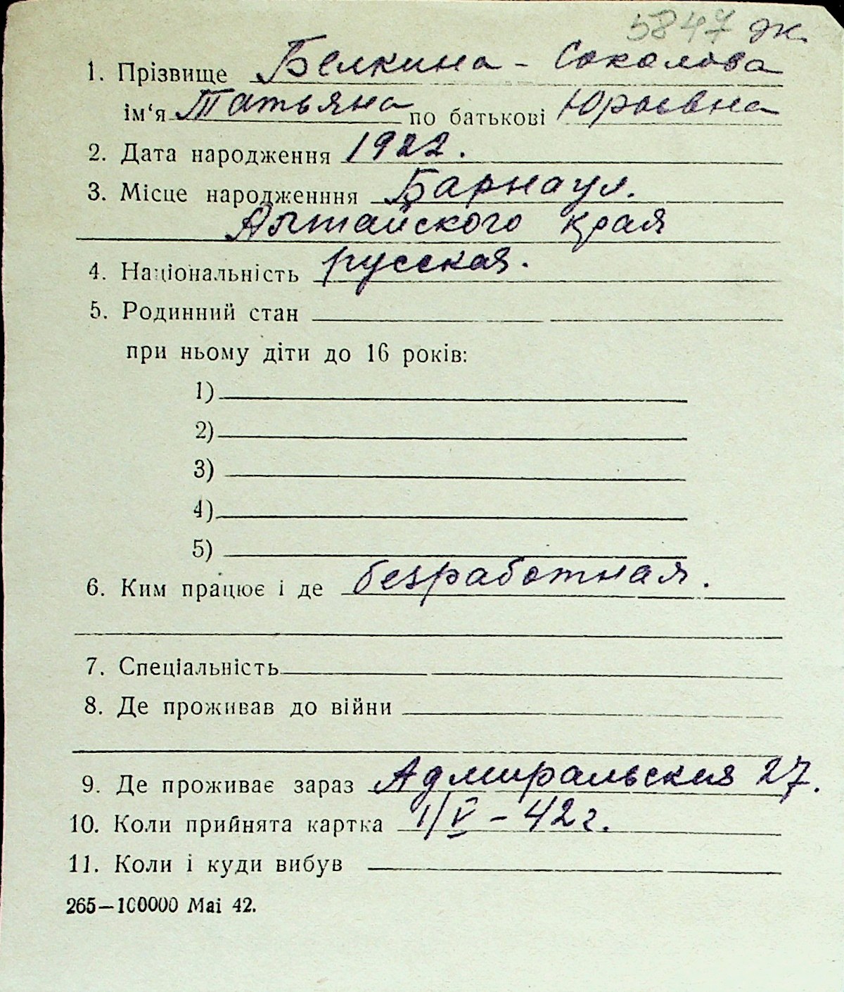 ◦ ◦ Перелік карток на осіб, які мешкали у м. Миколаїв у період окупації 1941–1944 років