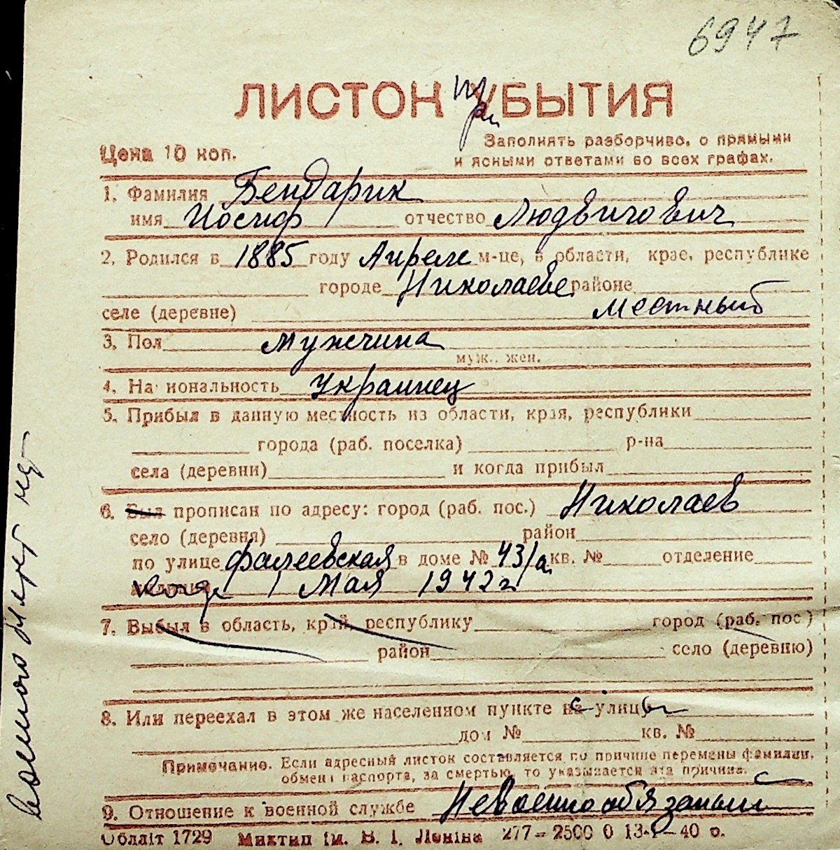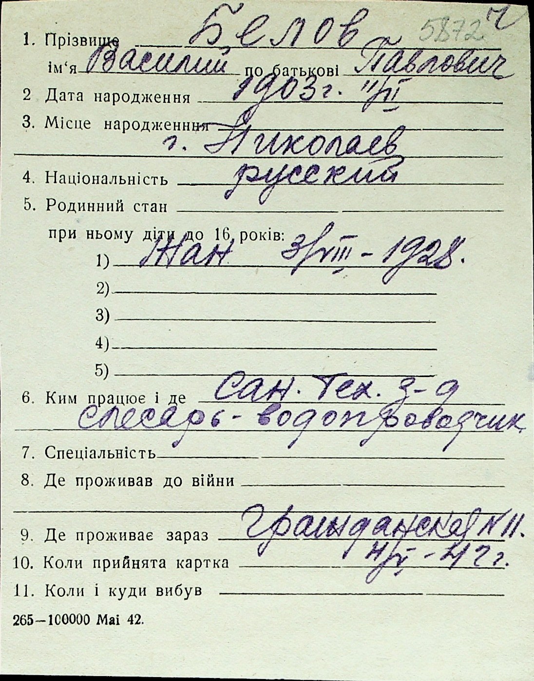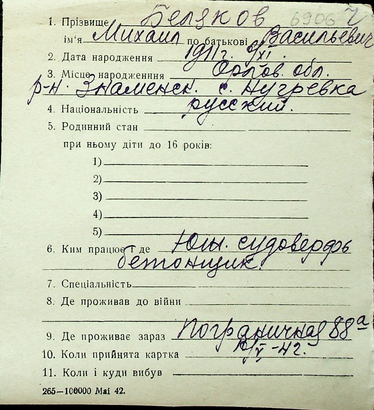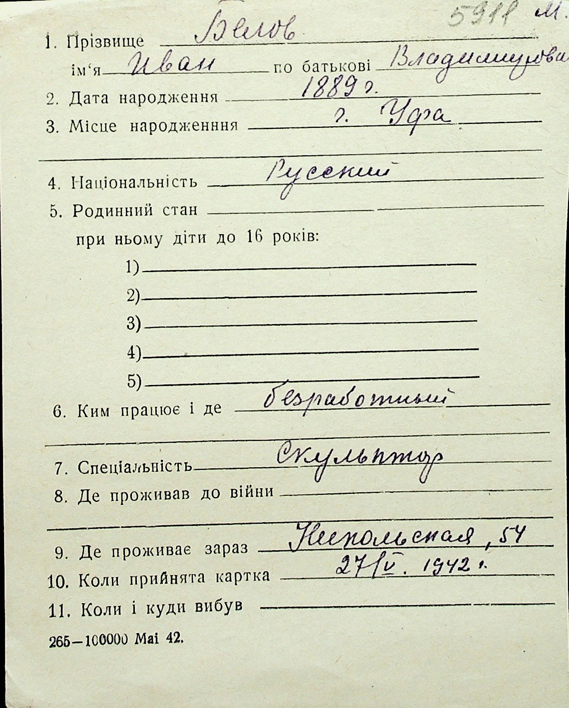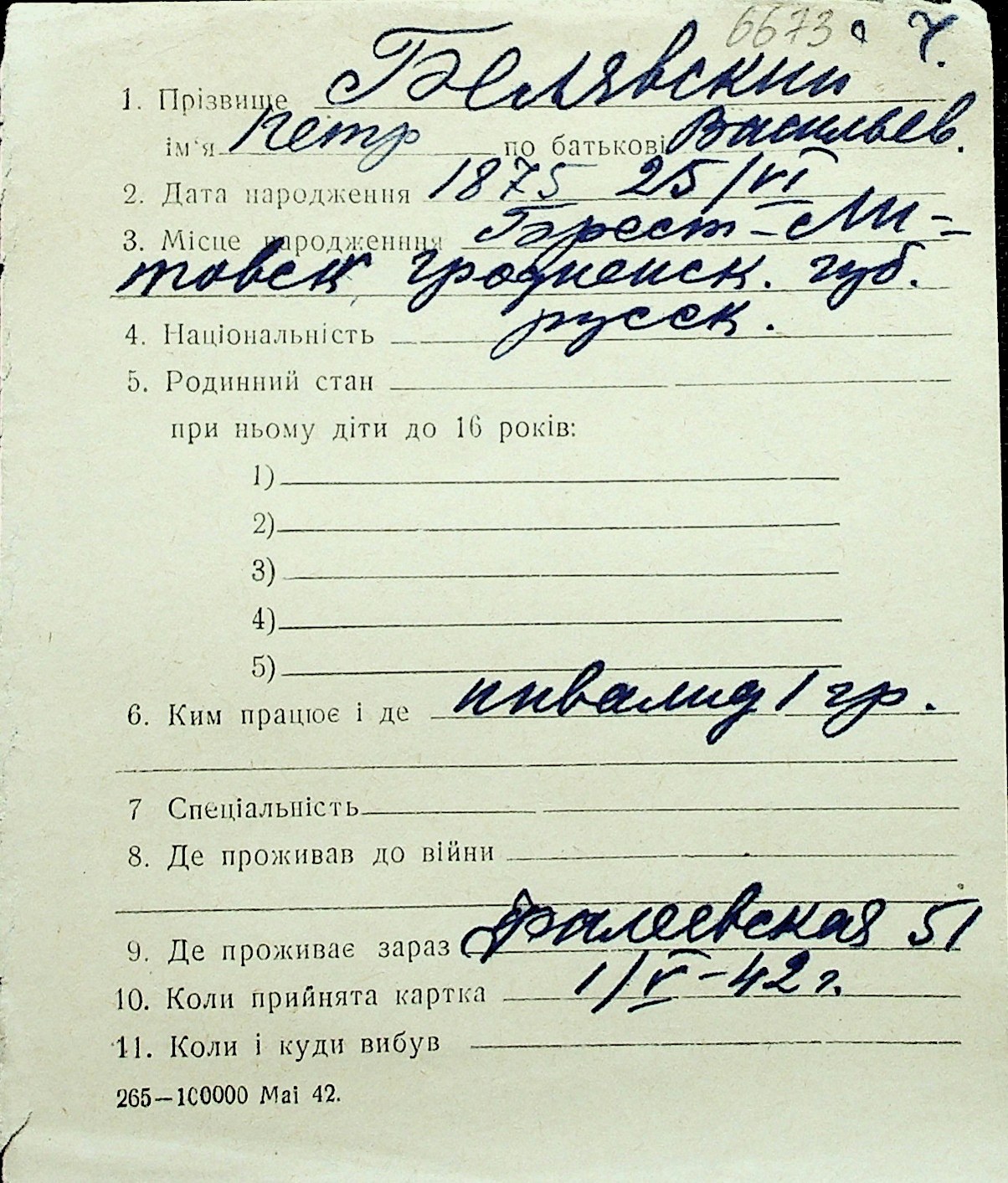 ◦ ◦ Перелік карток на осіб, які мешкали у м. Миколаїв у період окупації 1941–1944 років