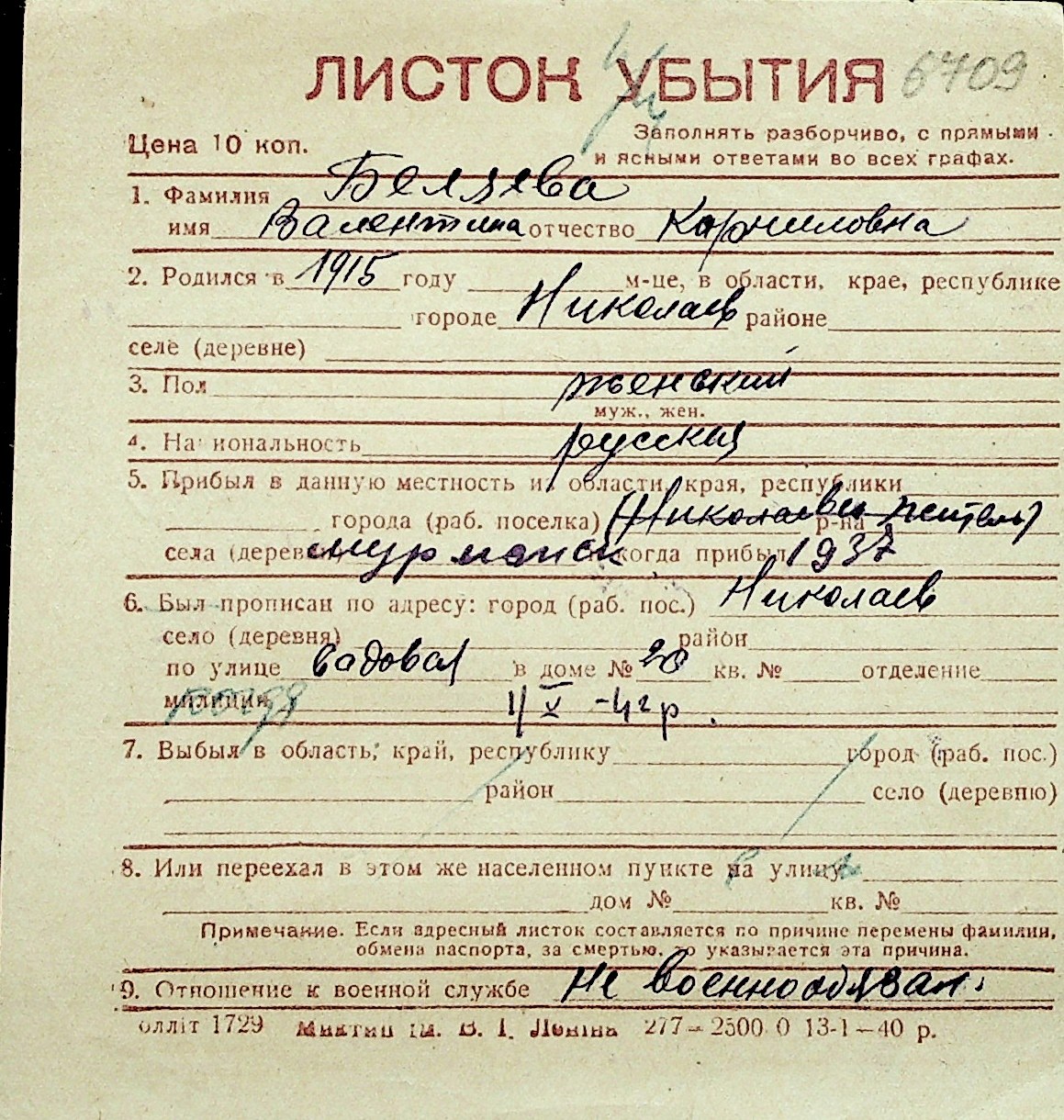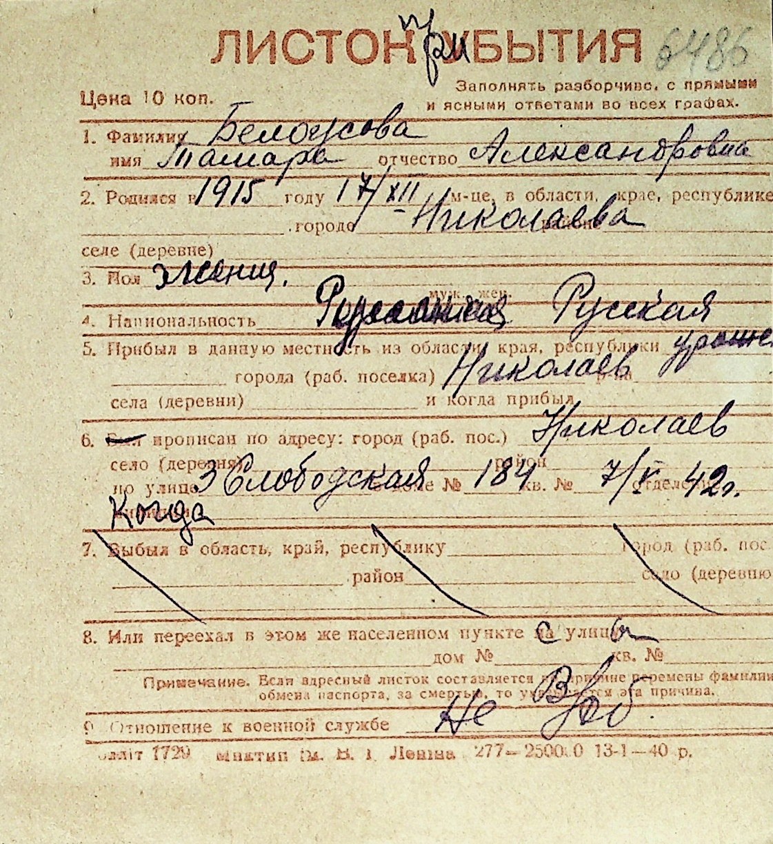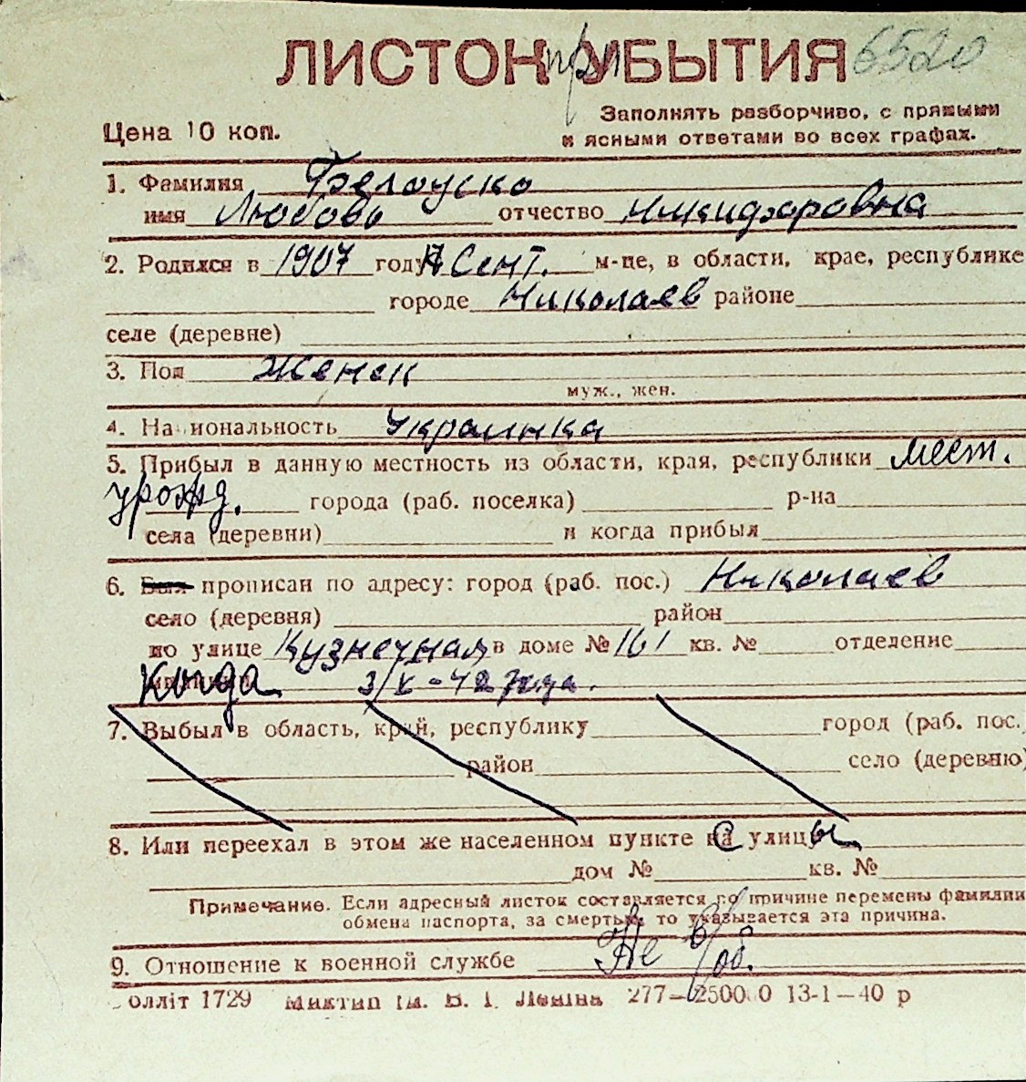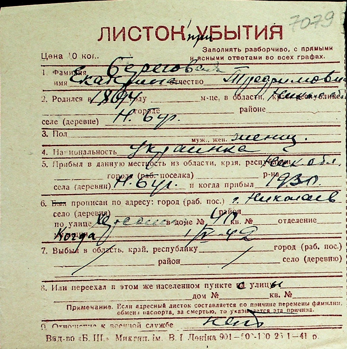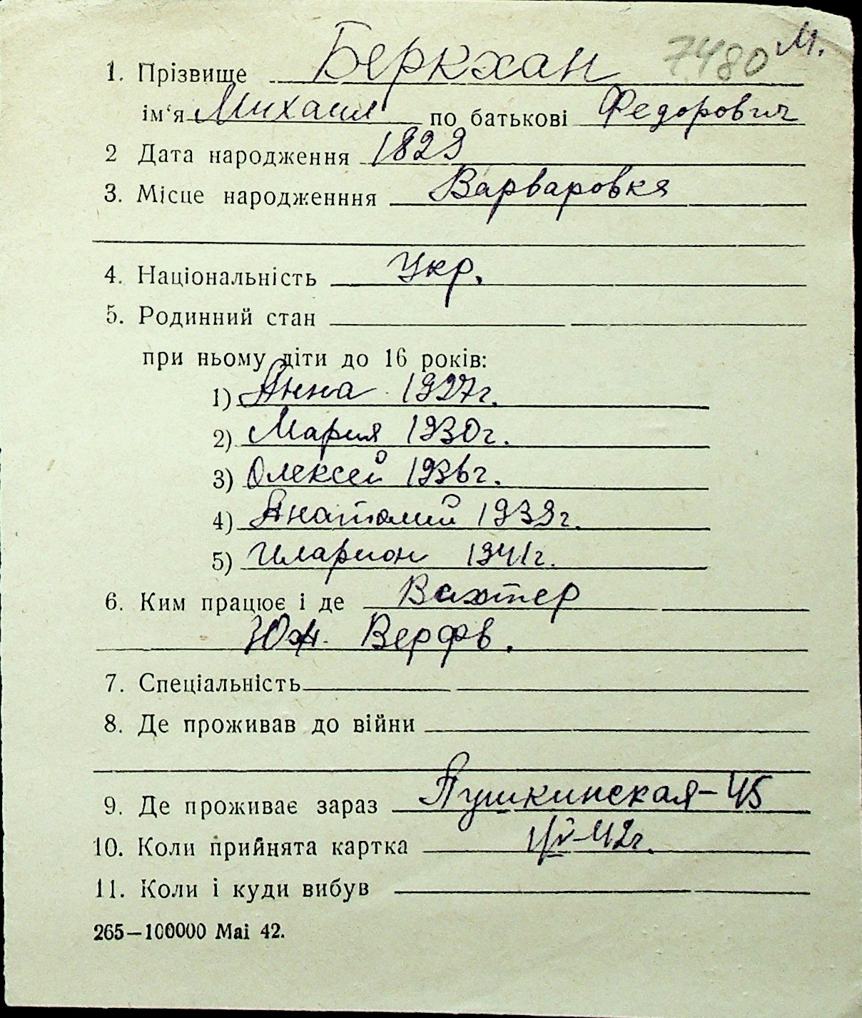 ◦ ◦ Перелік карток на осіб, які мешкали у м. Миколаїв у період окупації 1941–1944 років