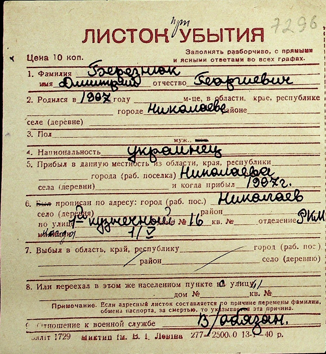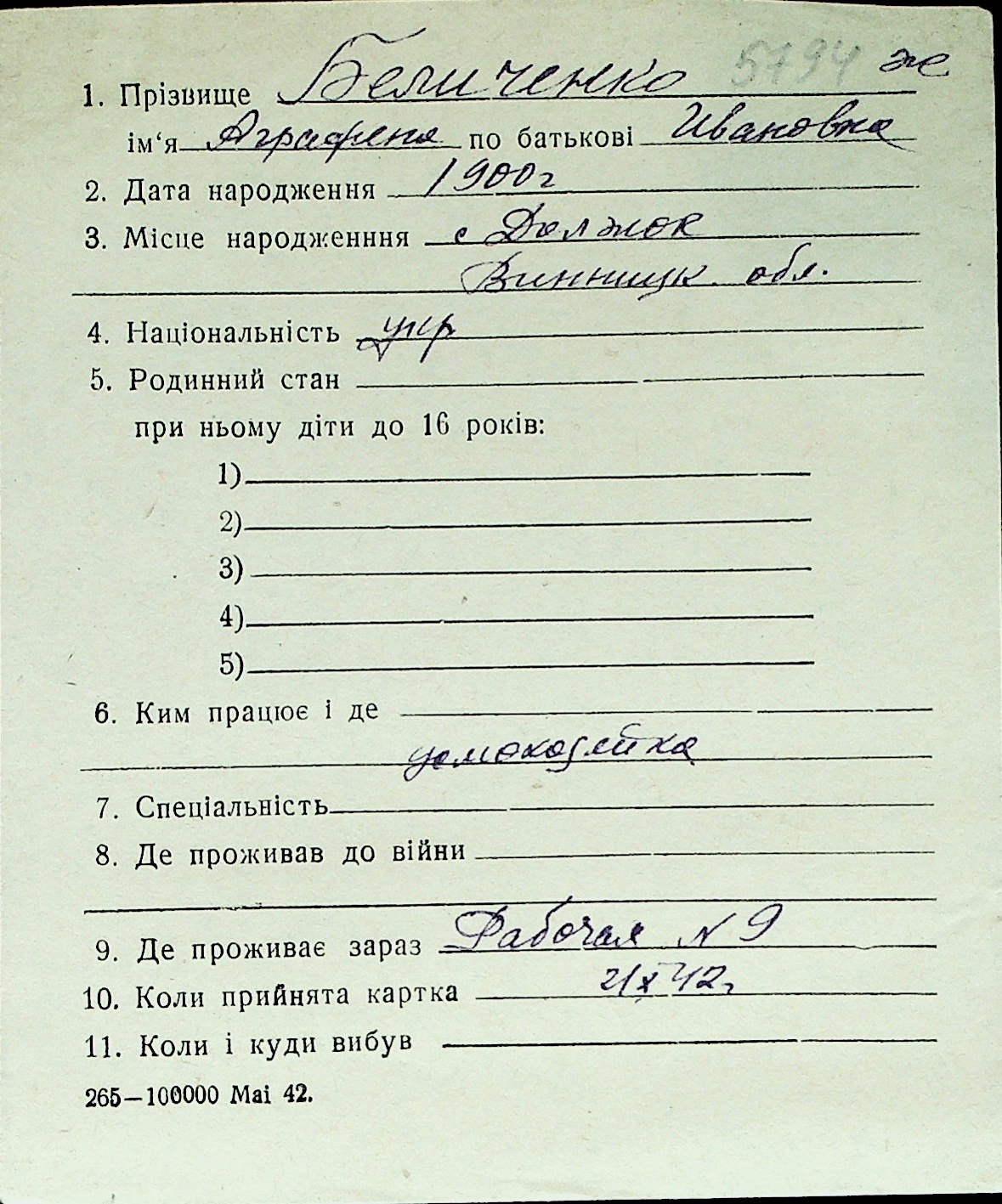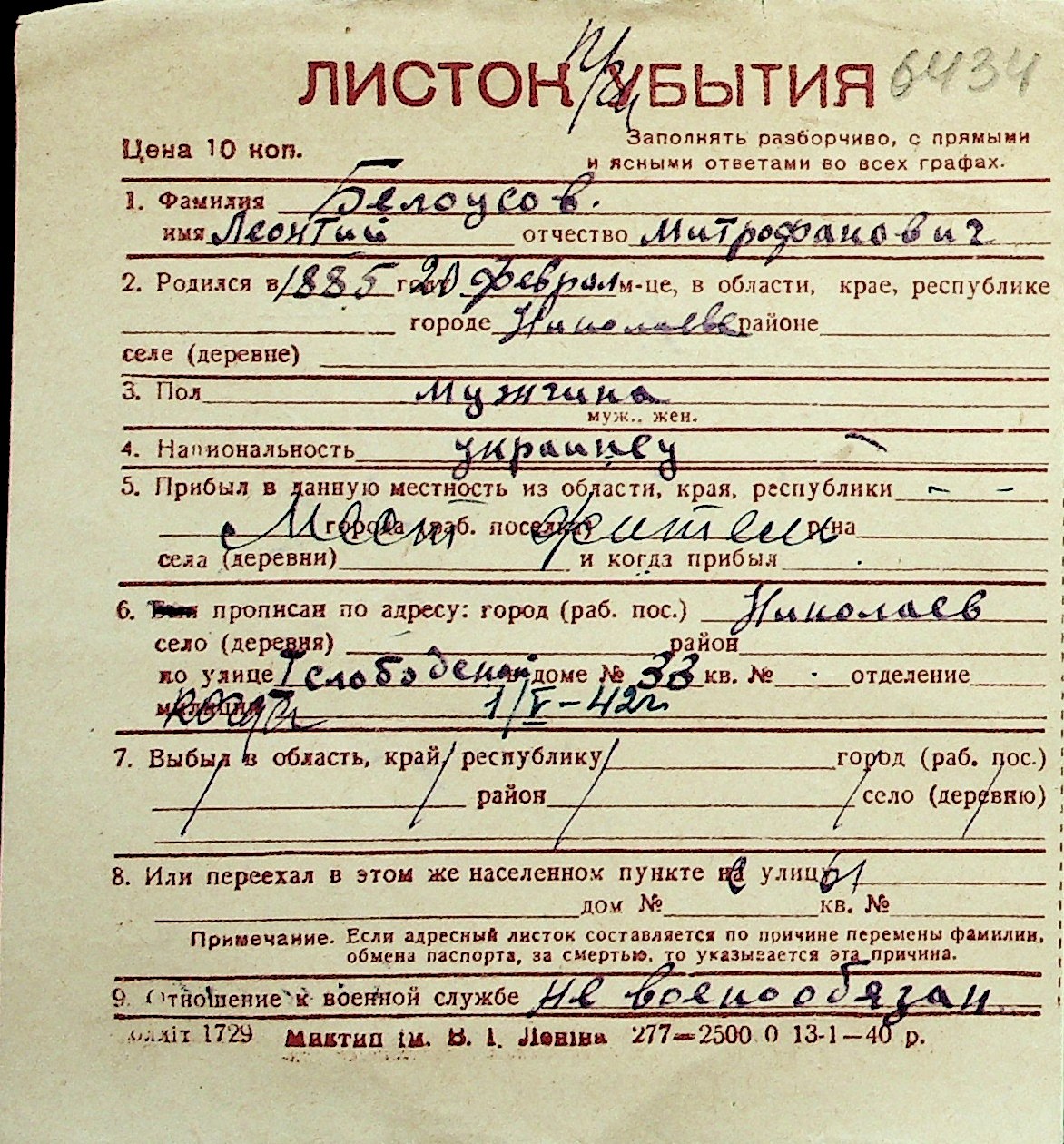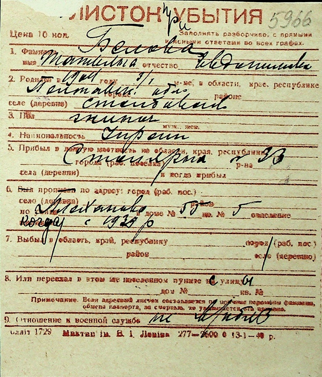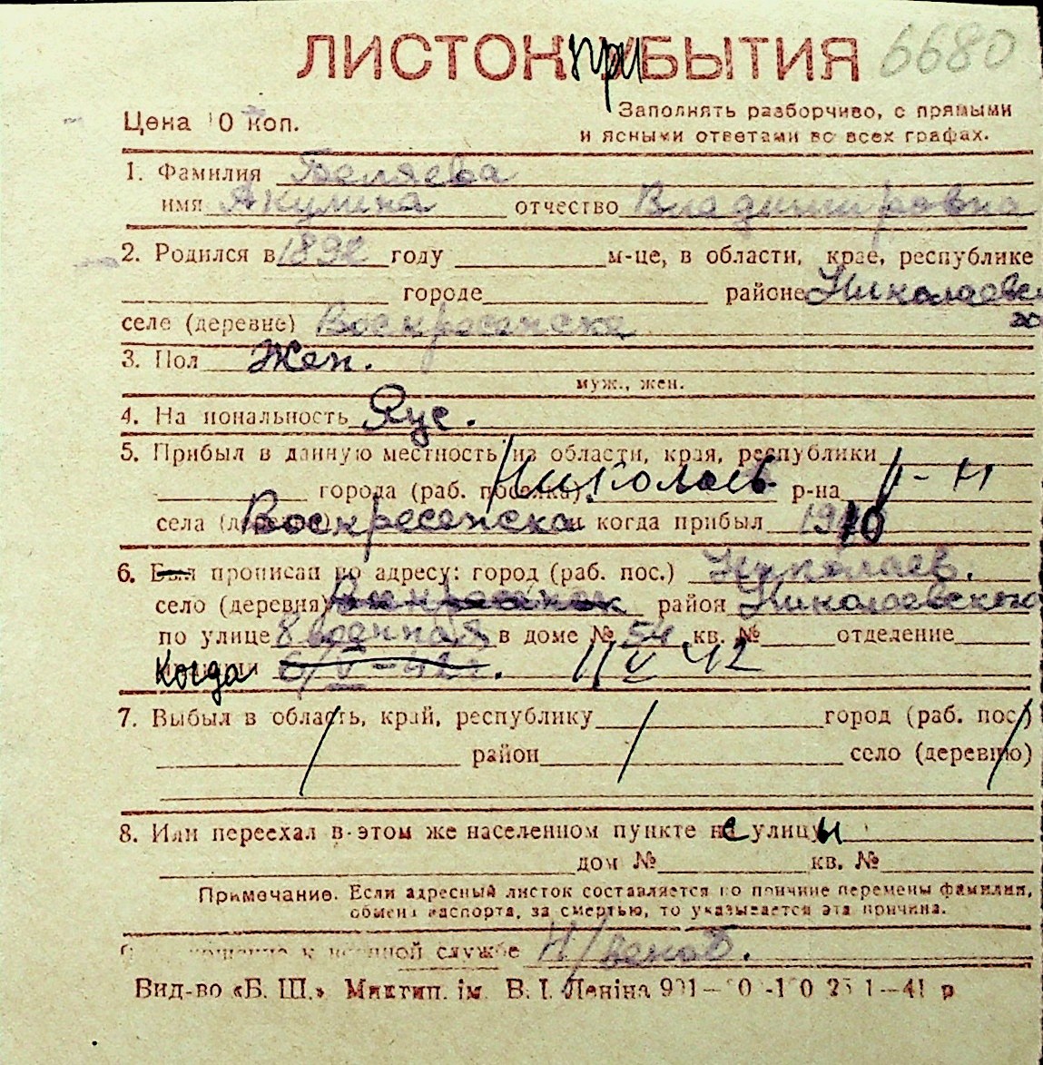 ◦ ◦ Перелік карток на осіб, які мешкали у м. Миколаїв у період окупації 1941–1944 років
