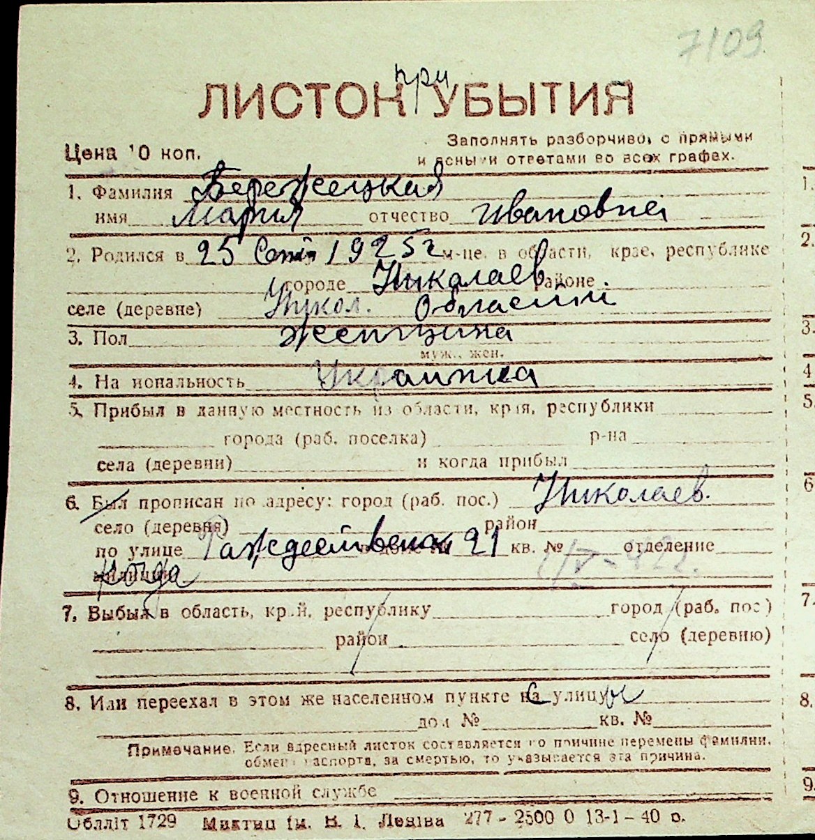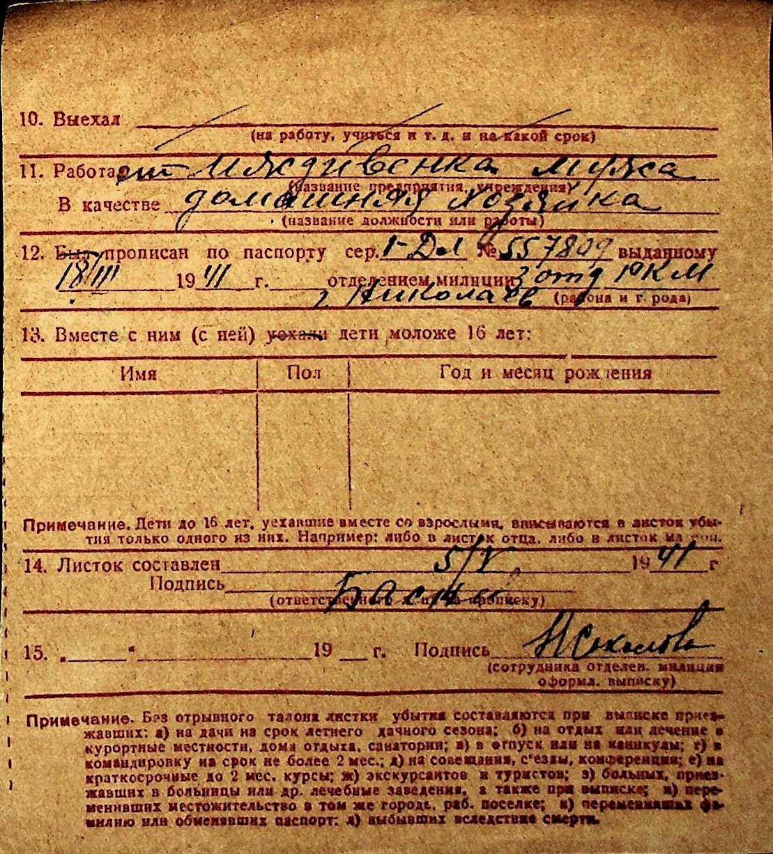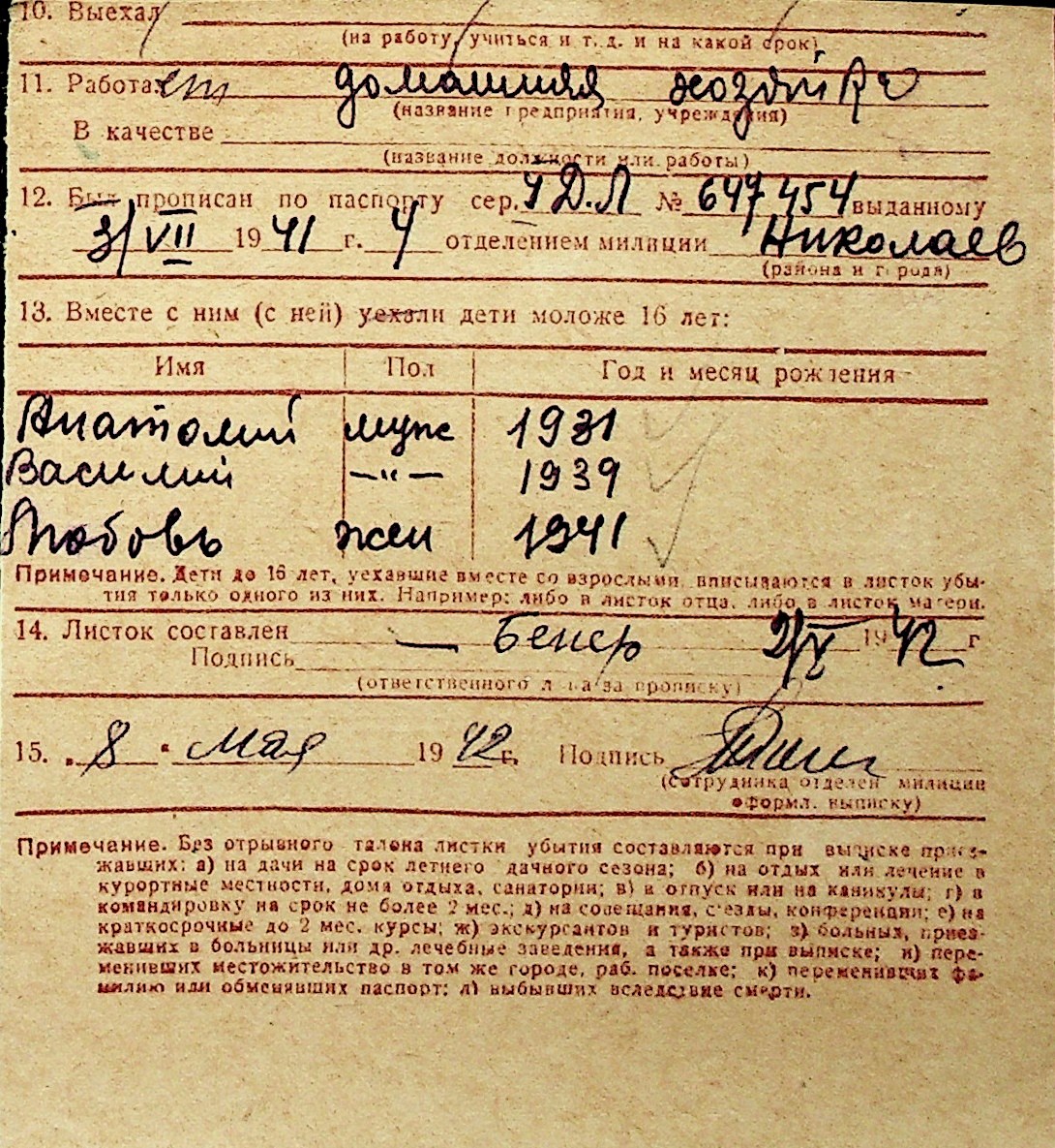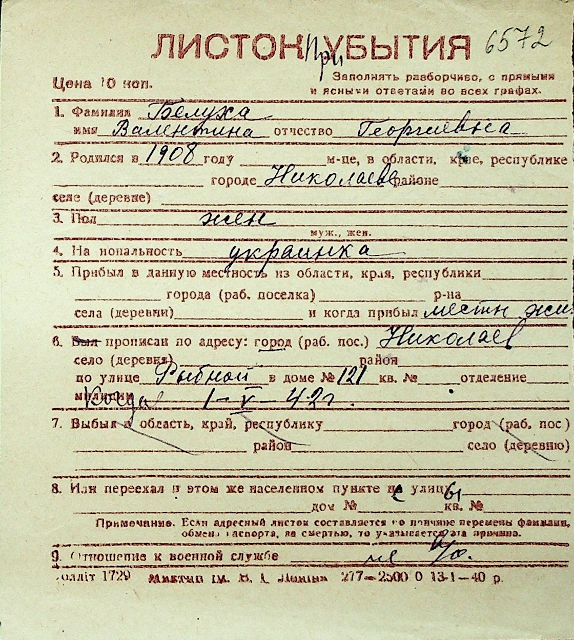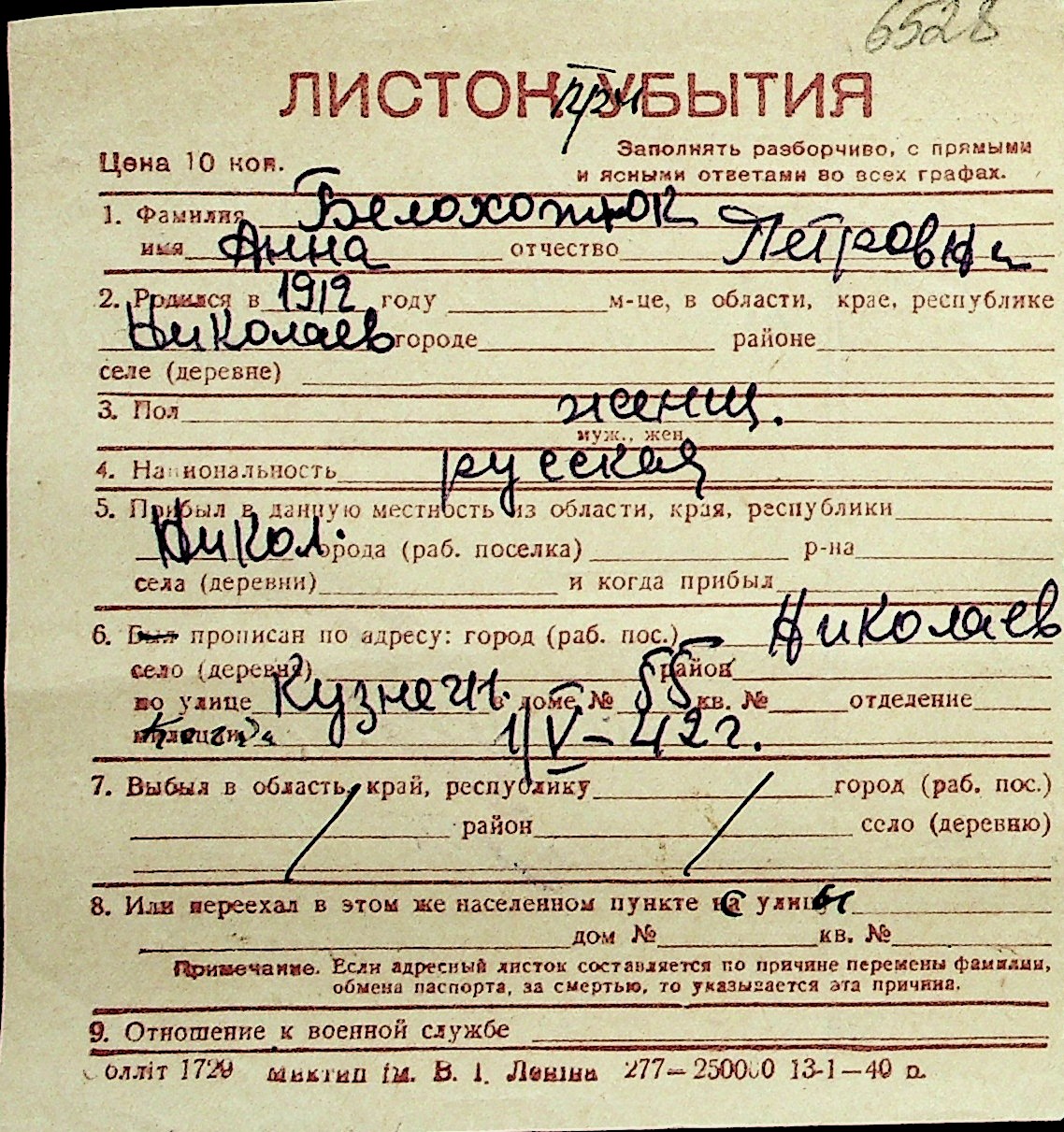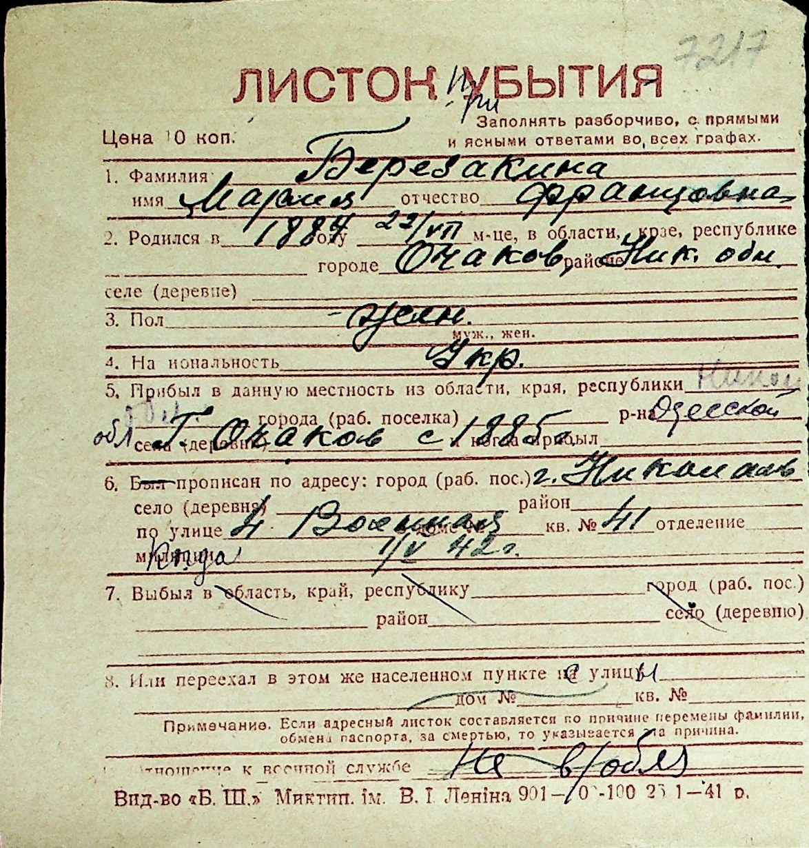 ◦ ◦ Перелік карток на осіб, які мешкали у м. Миколаїв у період окупації 1941–1944 років