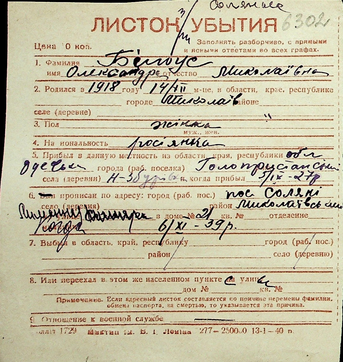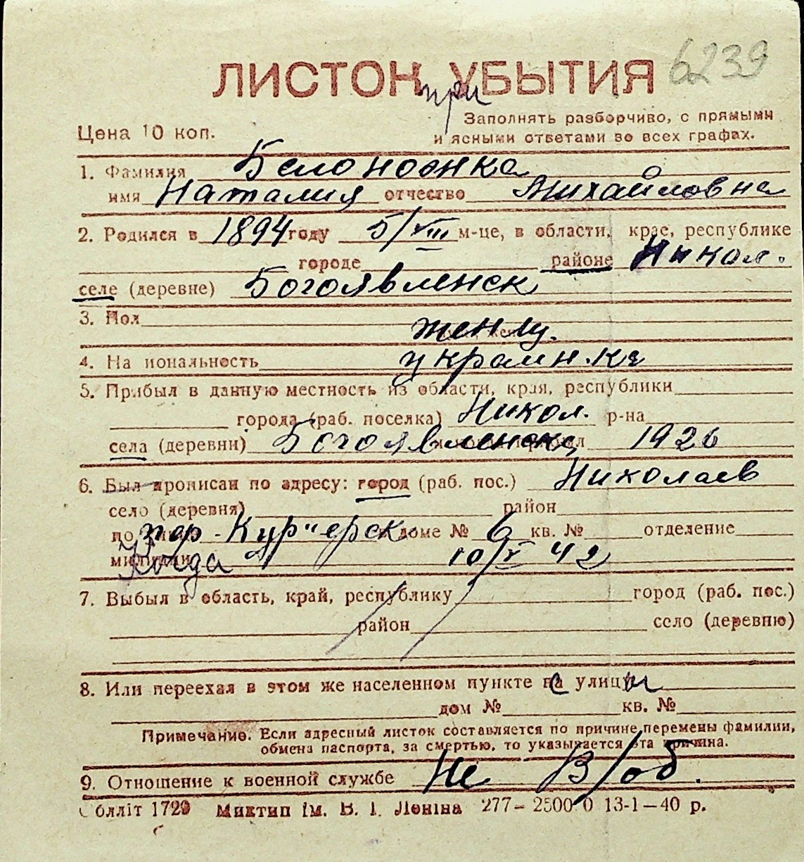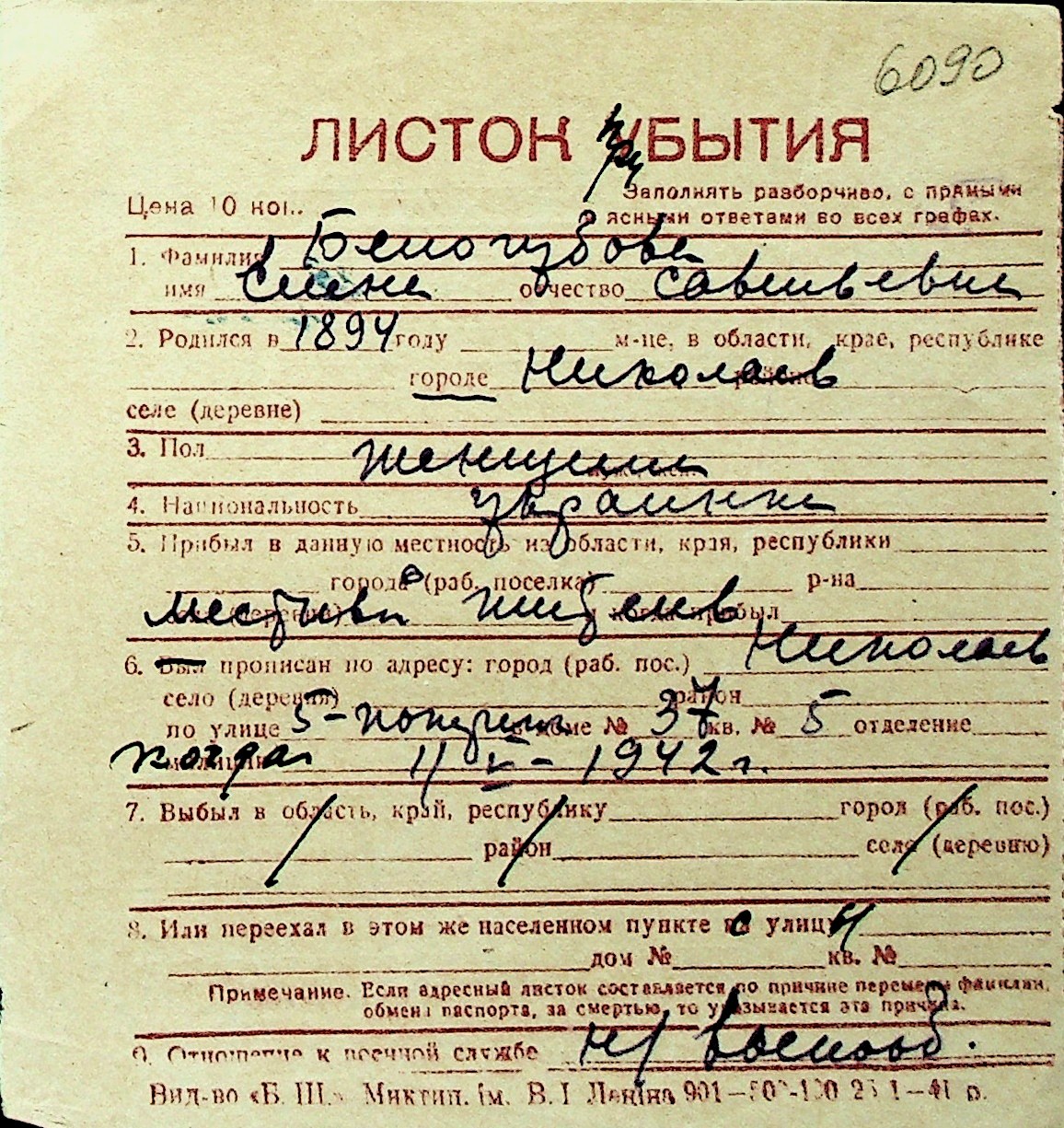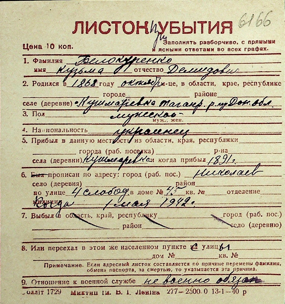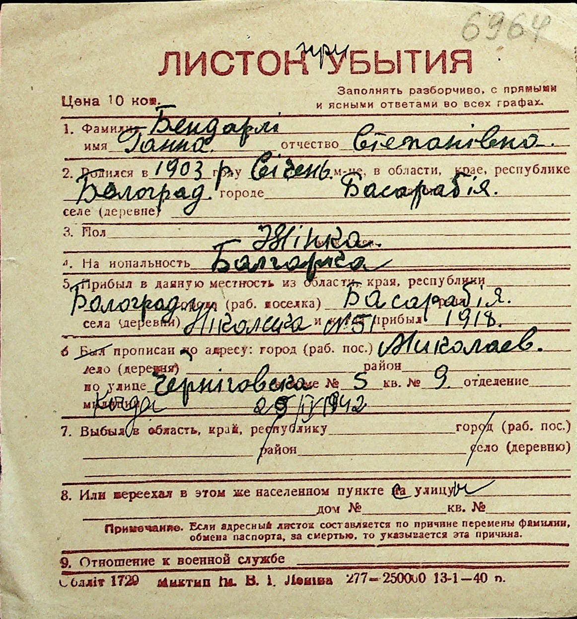 ◦ ◦ Перелік карток на осіб, які мешкали у м. Миколаїв у період окупації 1941–1944 років