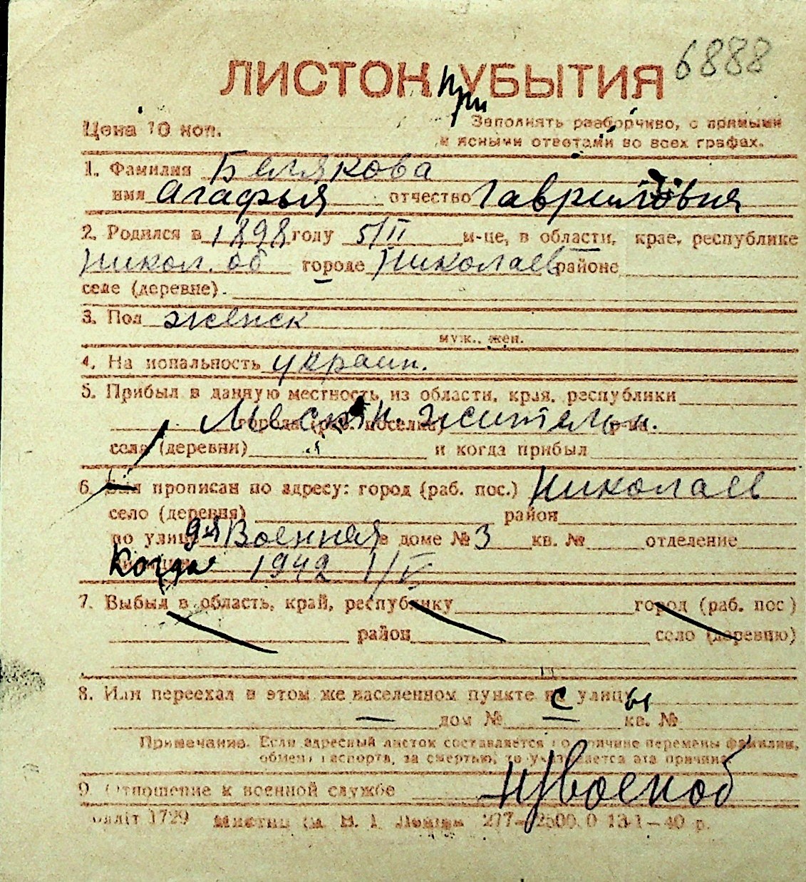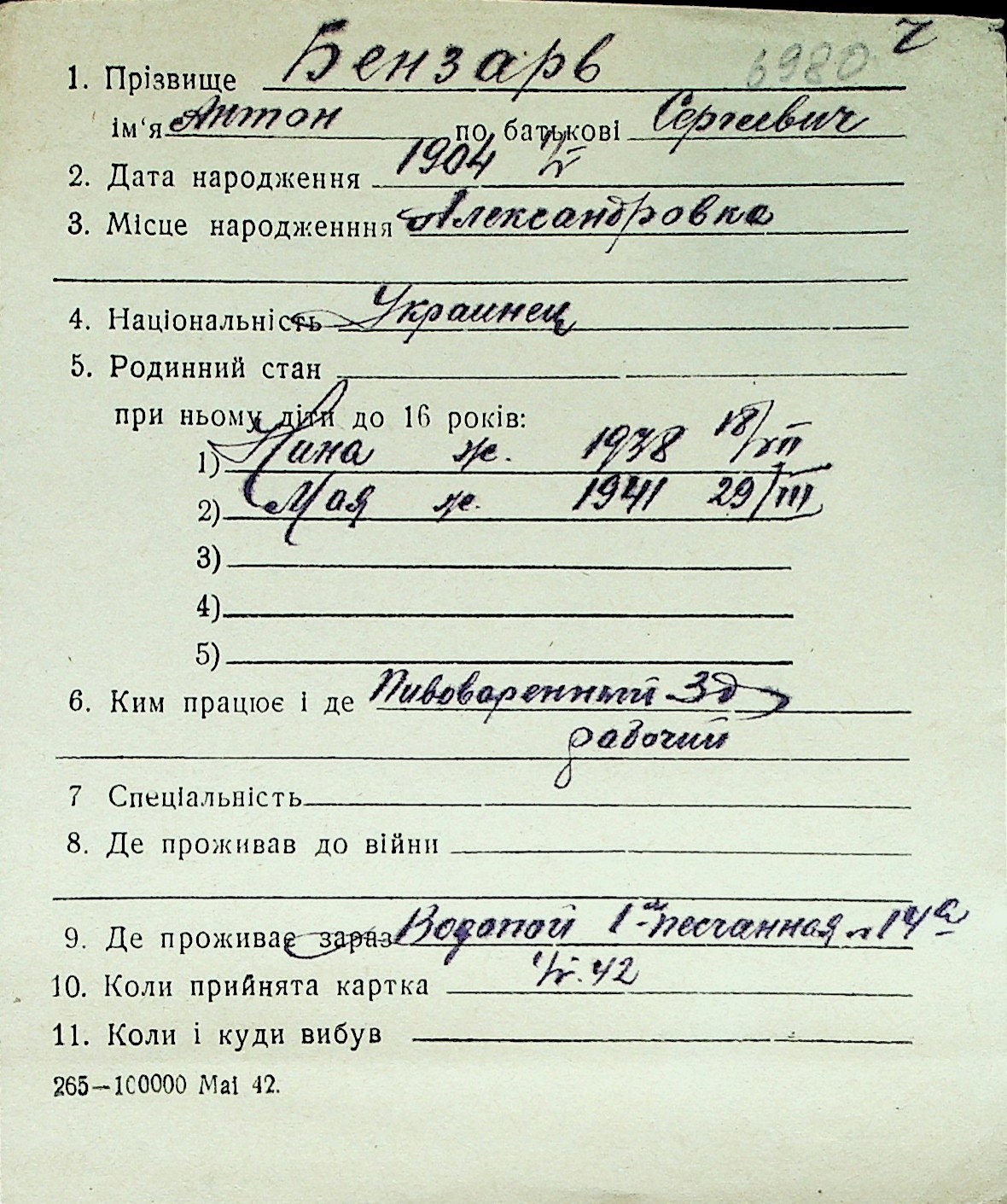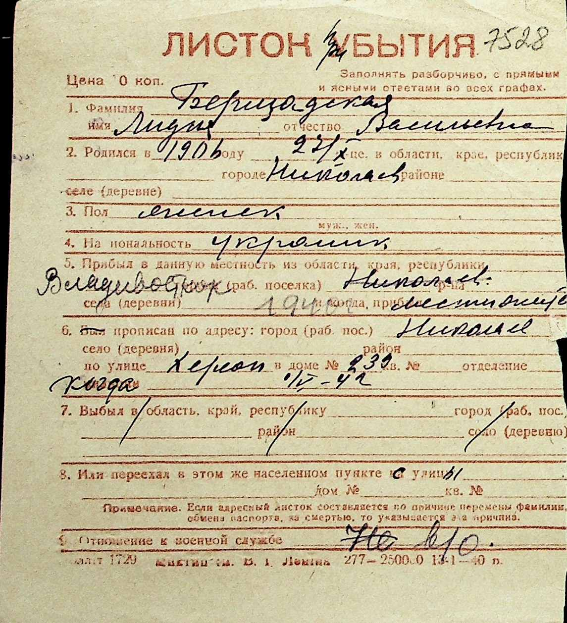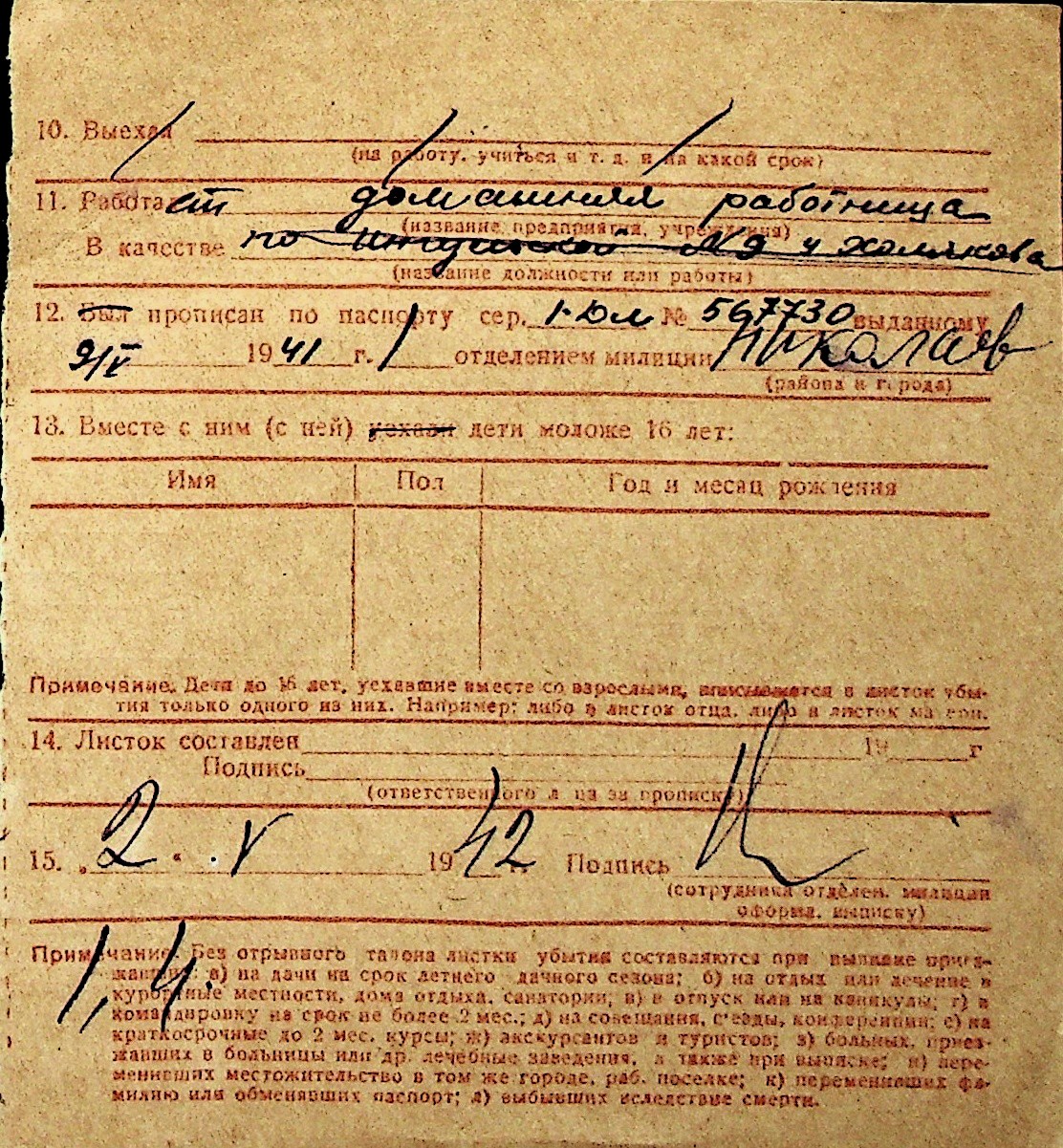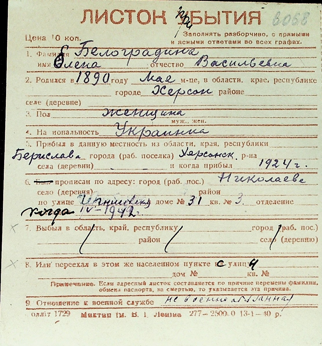 ◦ ◦ Перелік карток на осіб, які мешкали у м. Миколаїв у період окупації 1941–1944 років