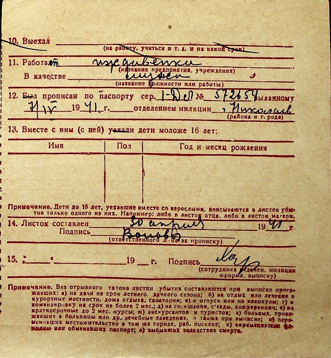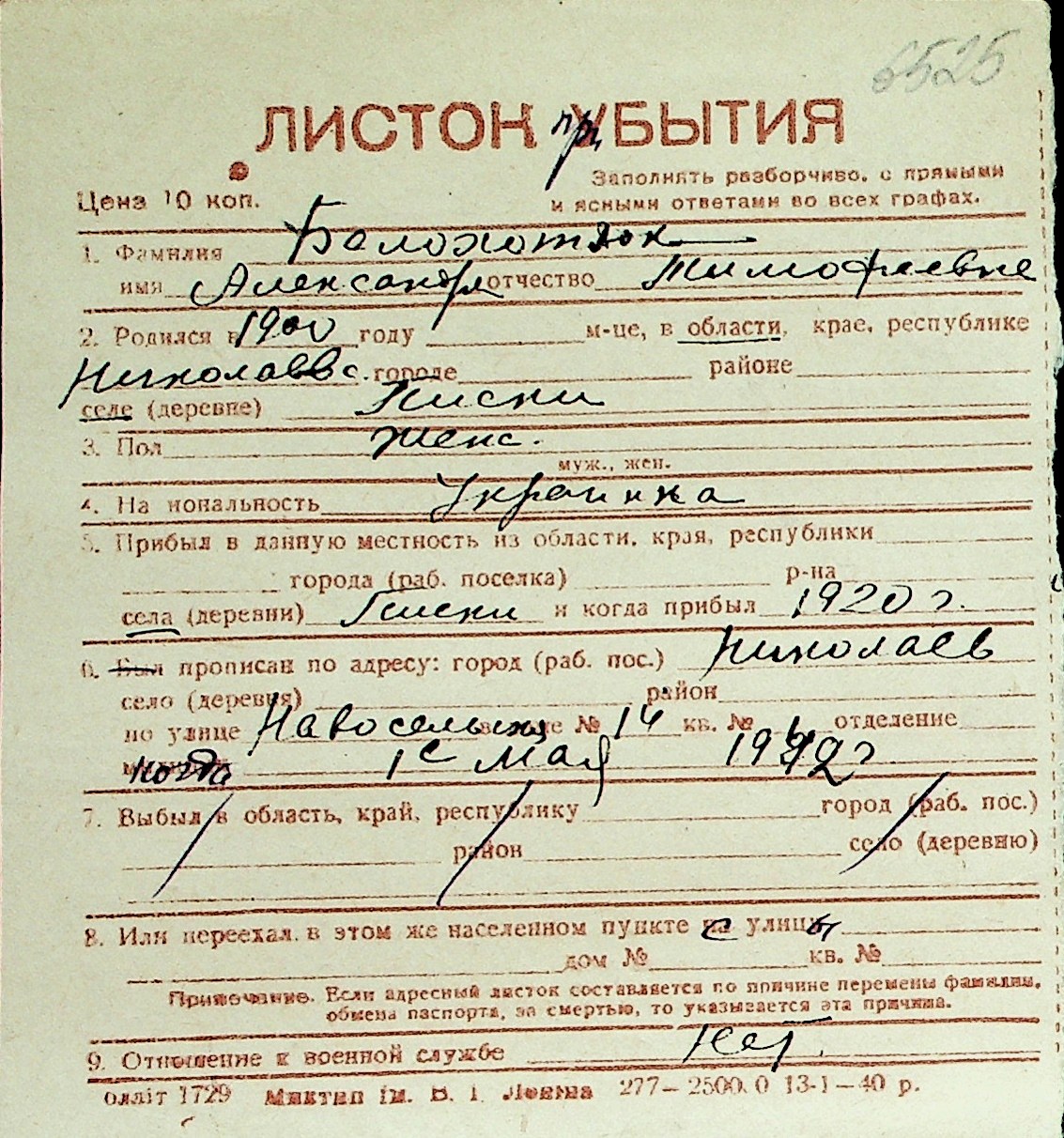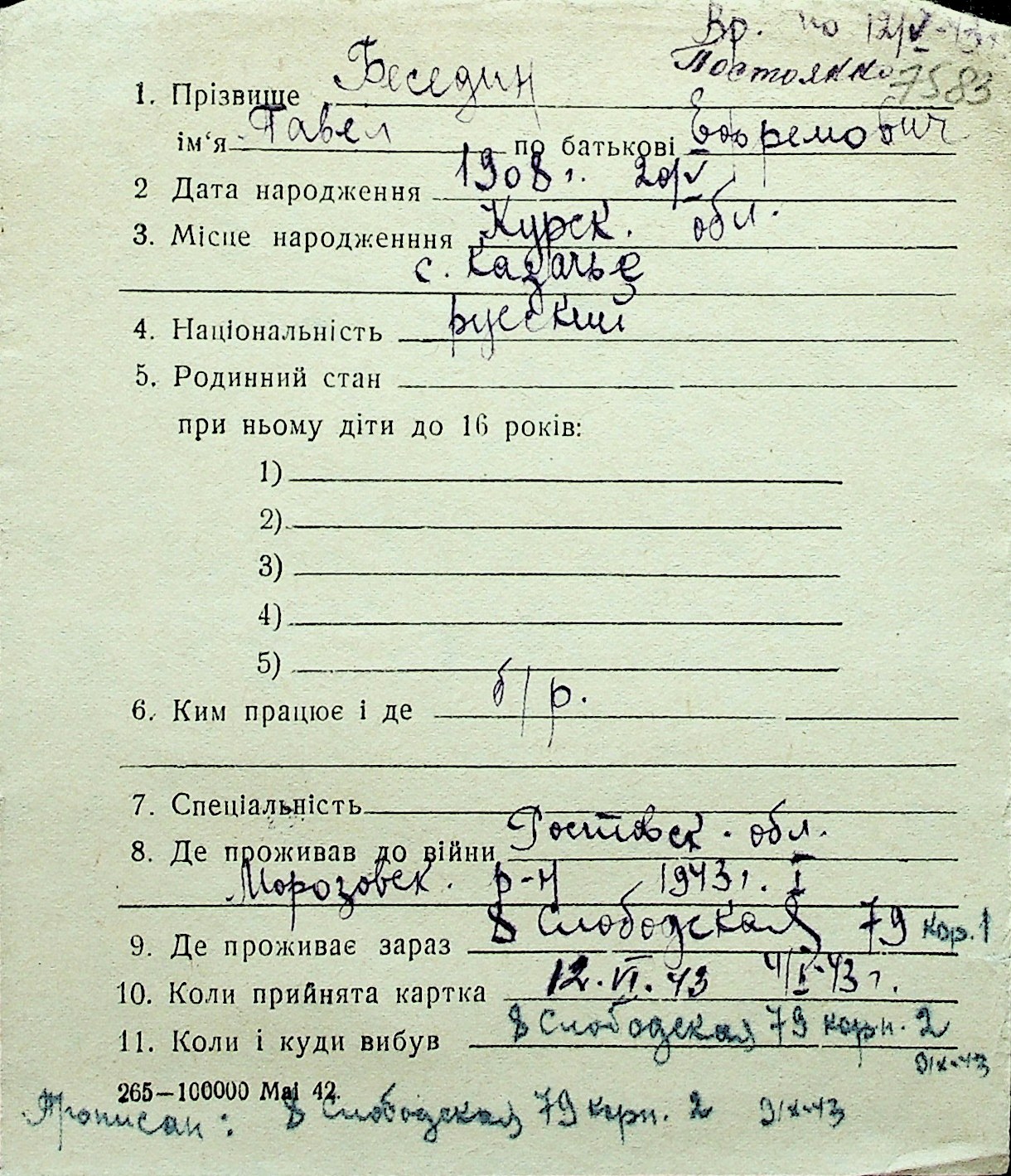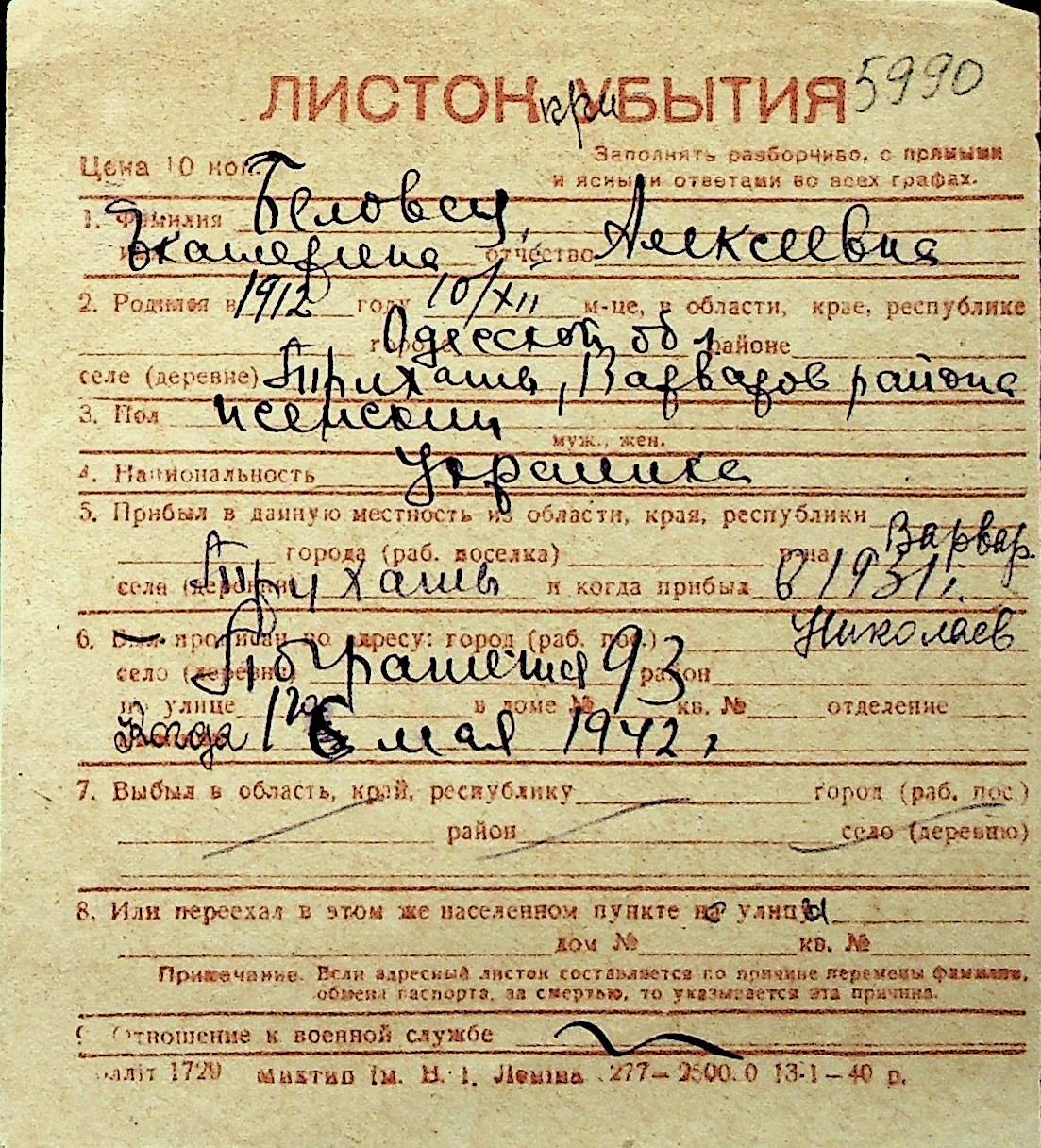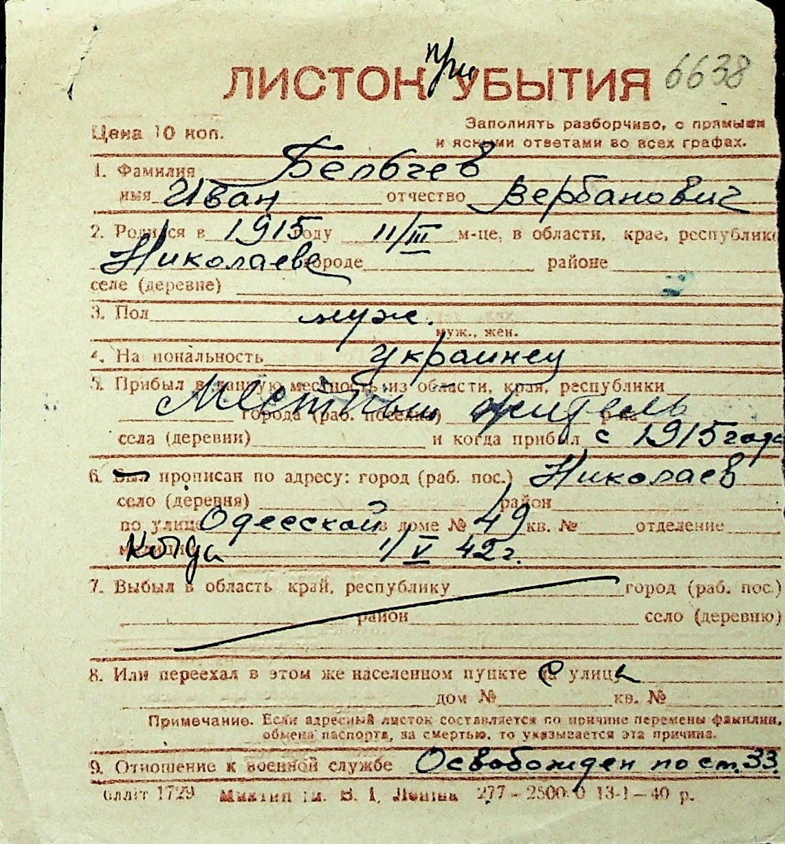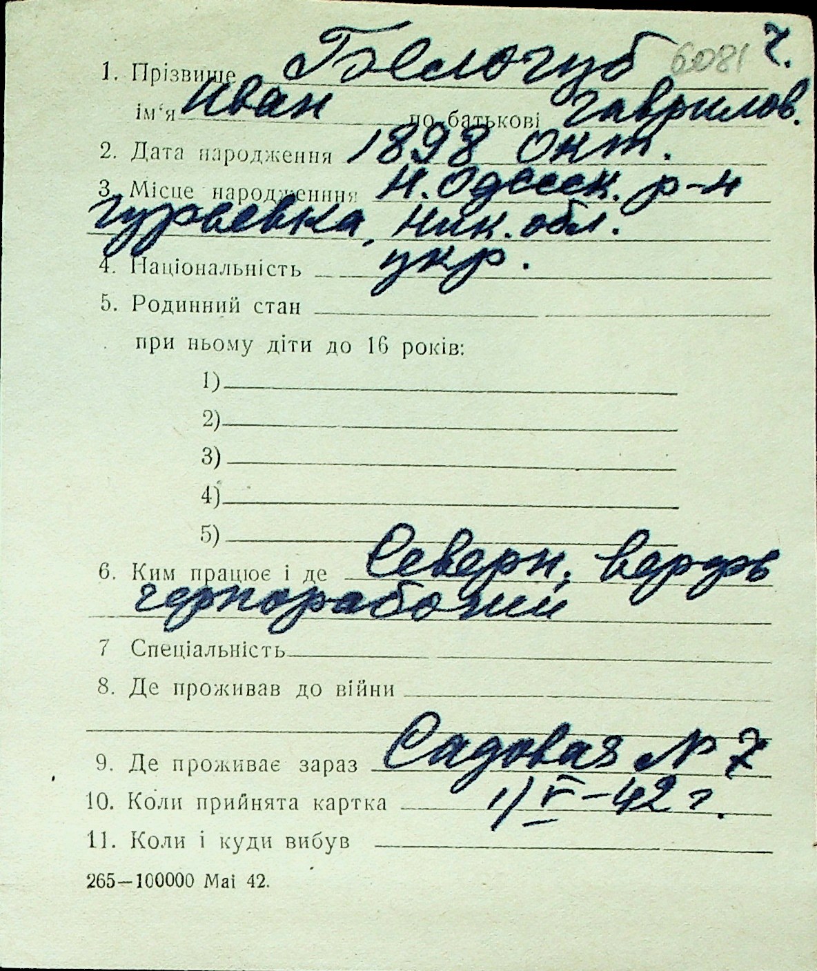 ◦ ◦ Перелік карток на осіб, які мешкали у м. Миколаїв у період окупації 1941–1944 років