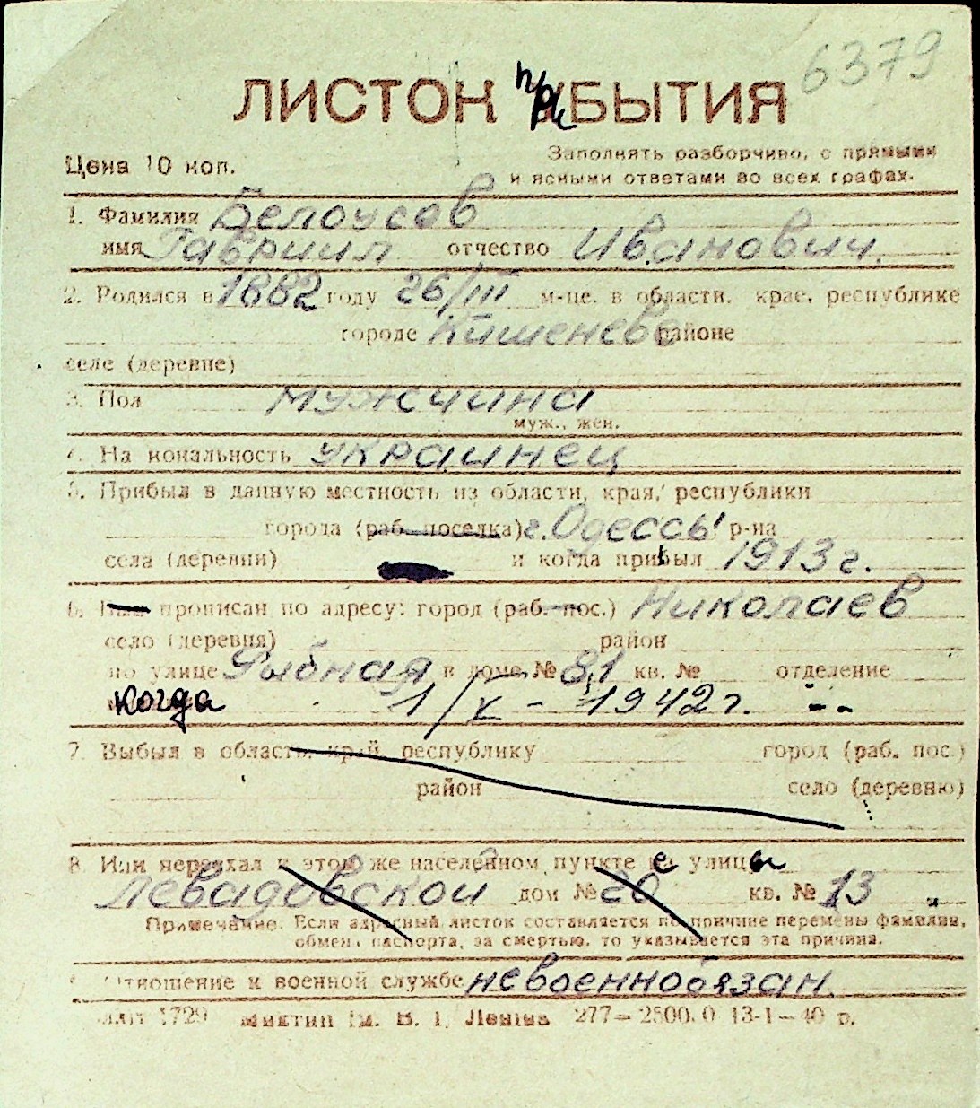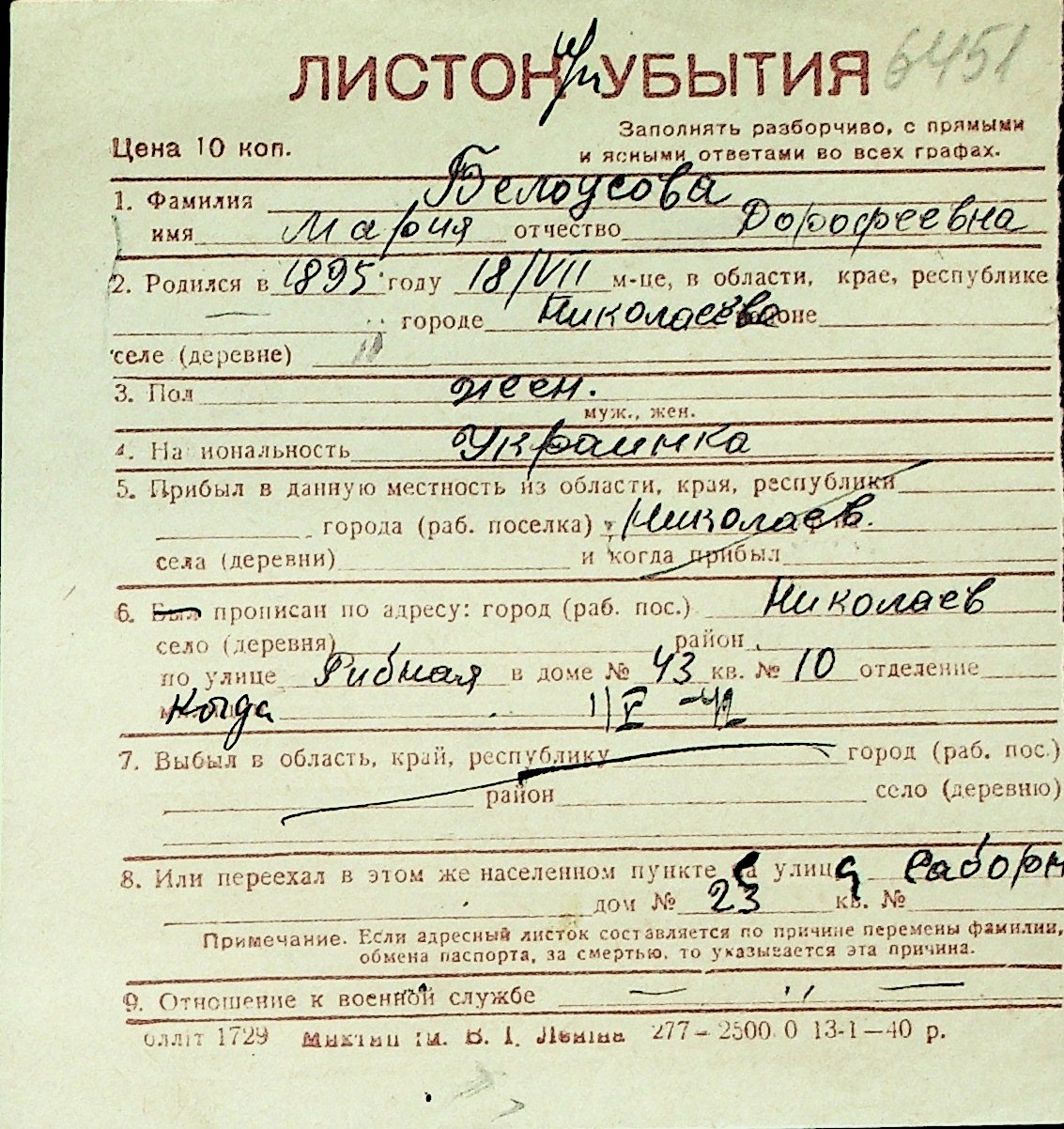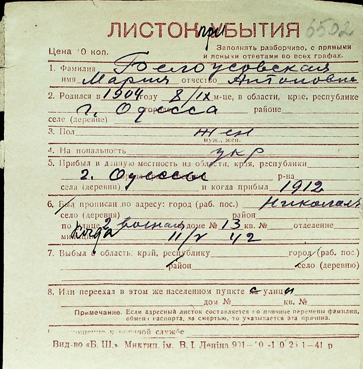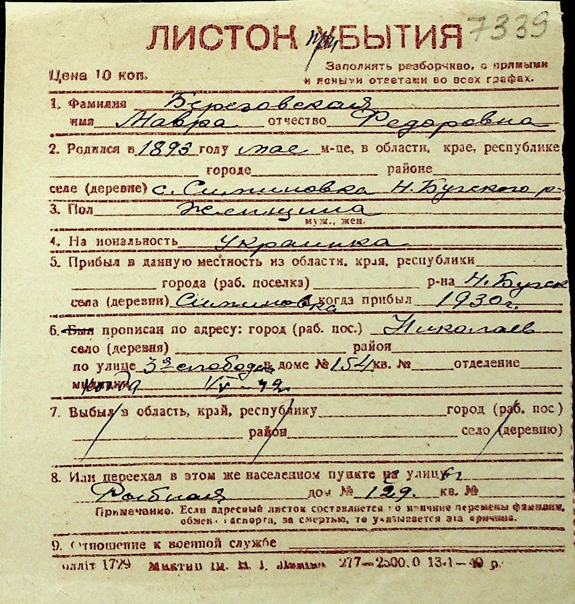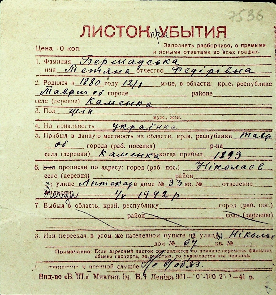 ◦ ◦ Перелік карток на осіб, які мешкали у м. Миколаїв у період окупації 1941–1944 років