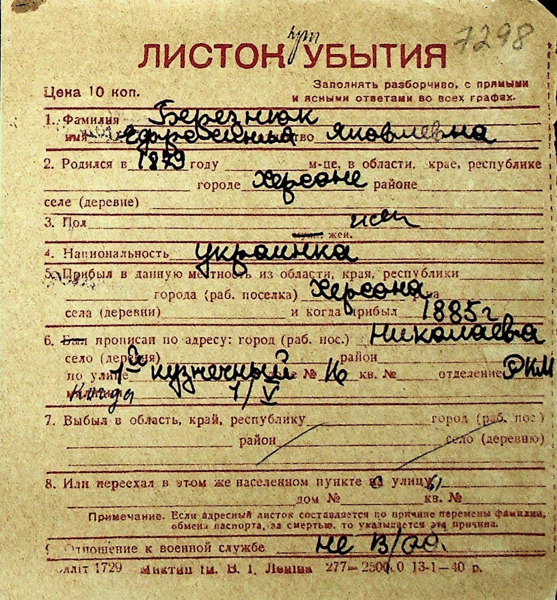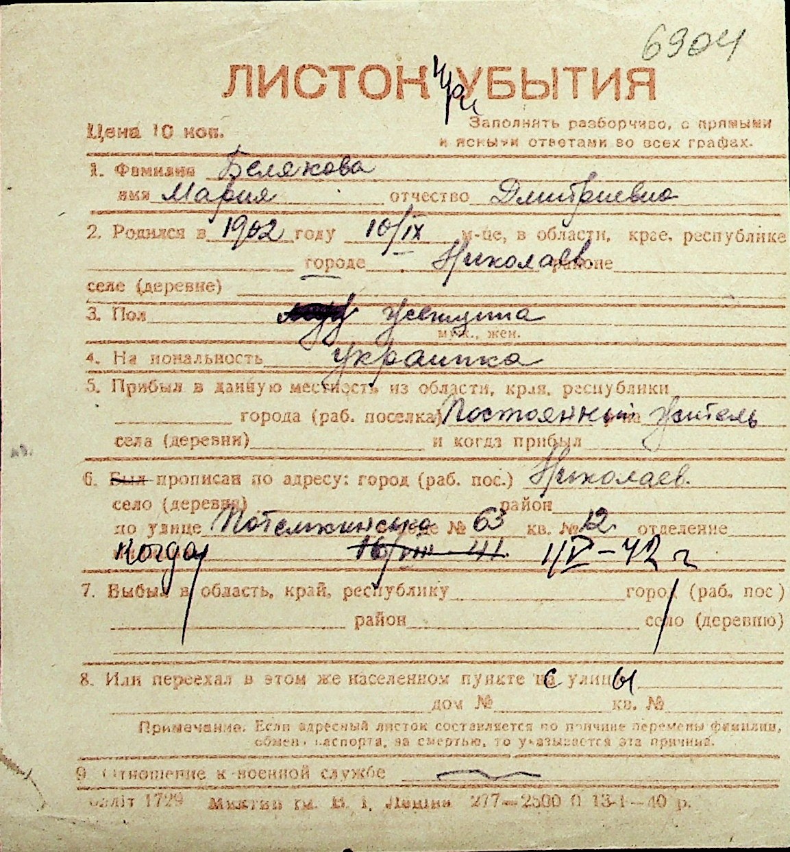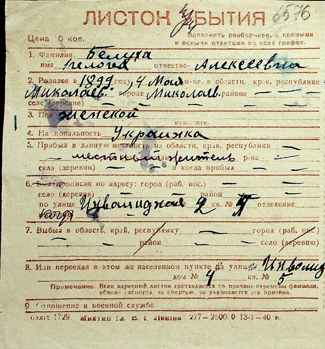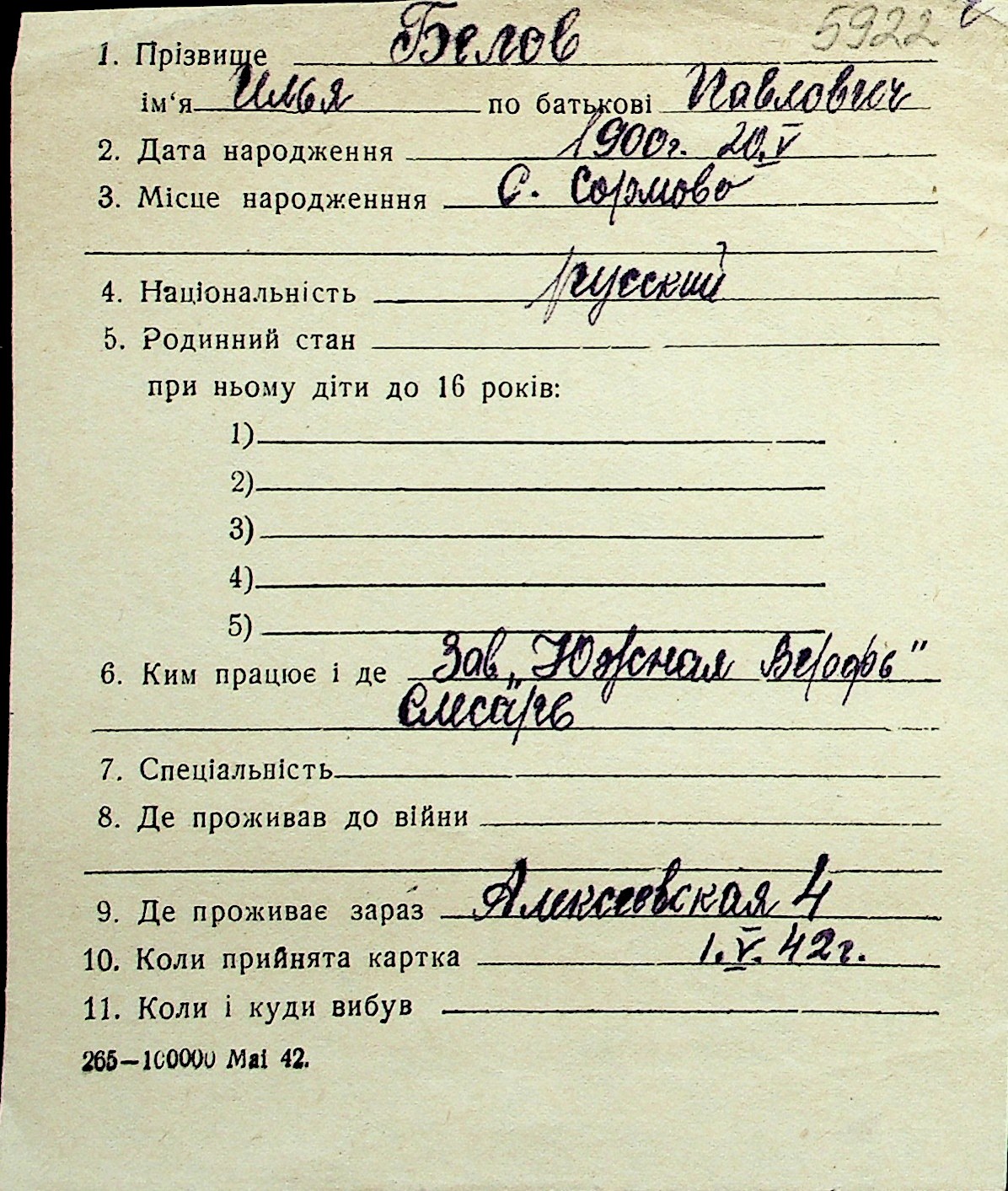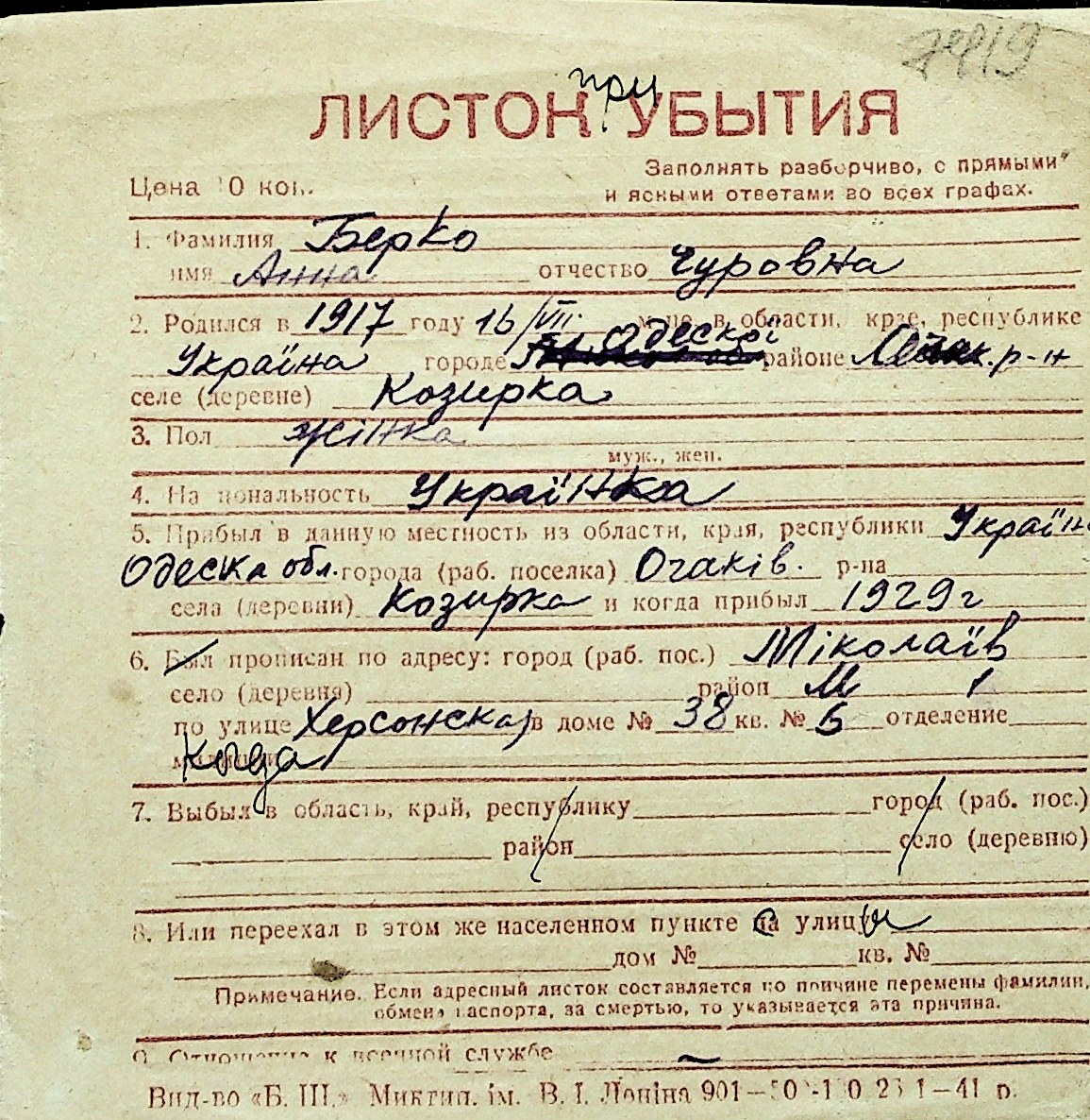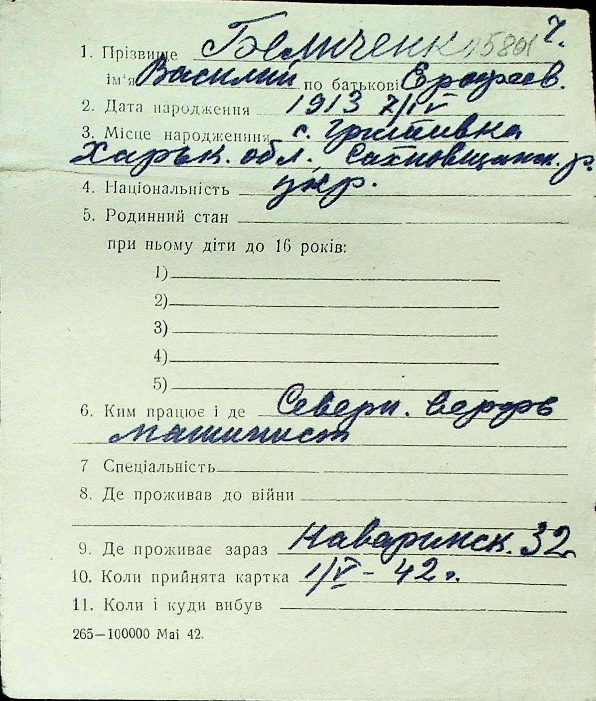 ◦ ◦ Перелік карток на осіб, які мешкали у м. Миколаїв у період окупації 1941–1944 років