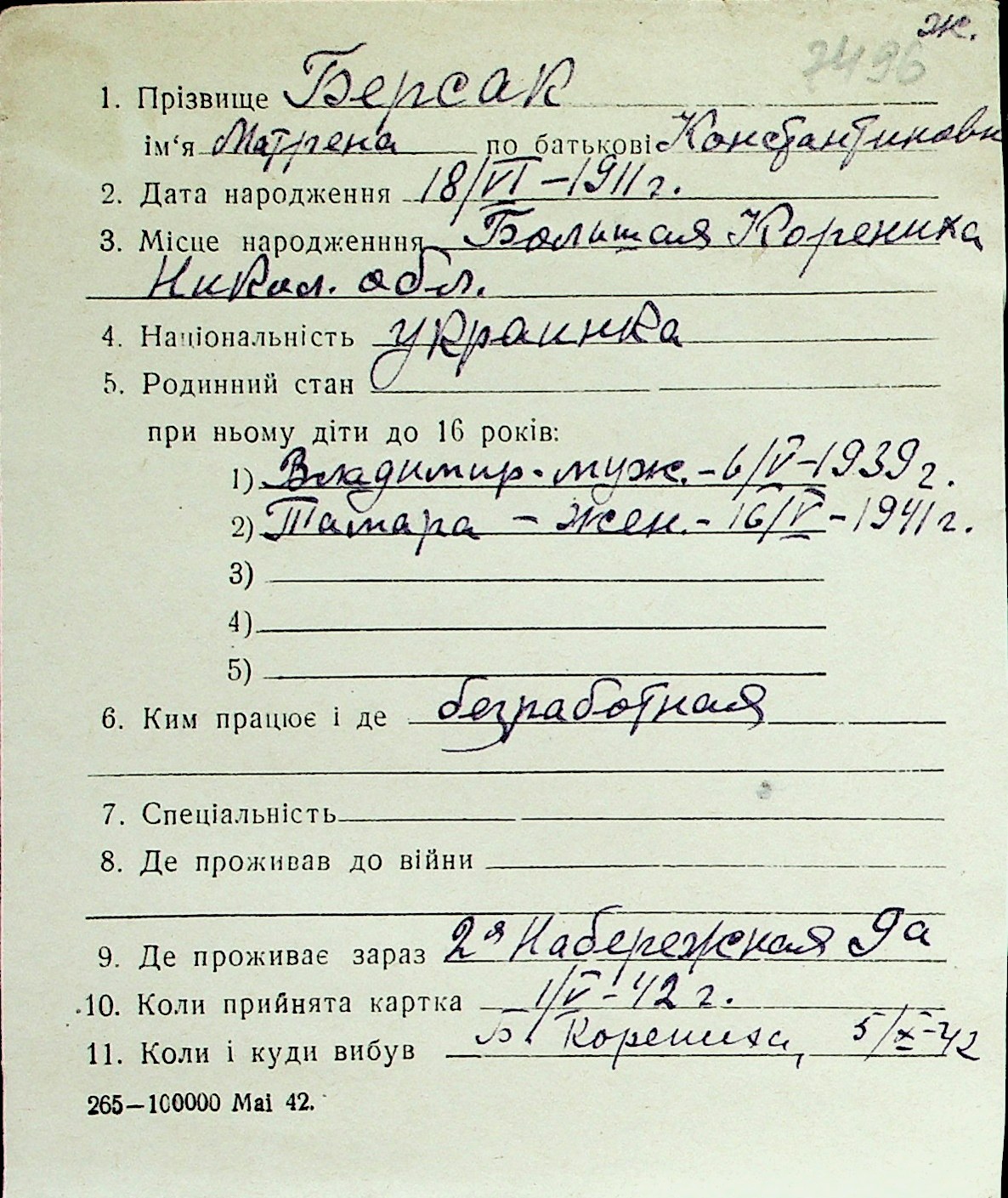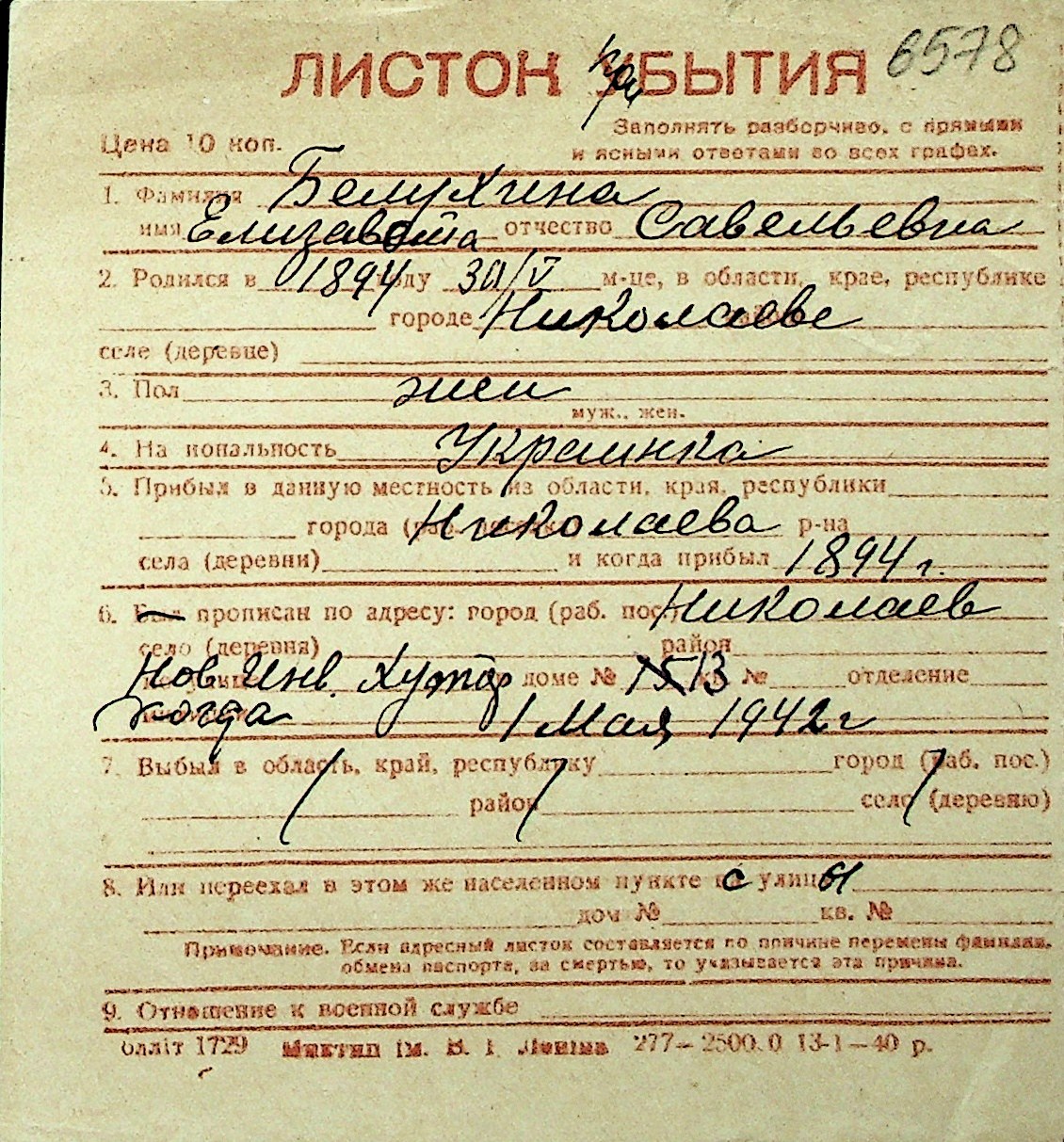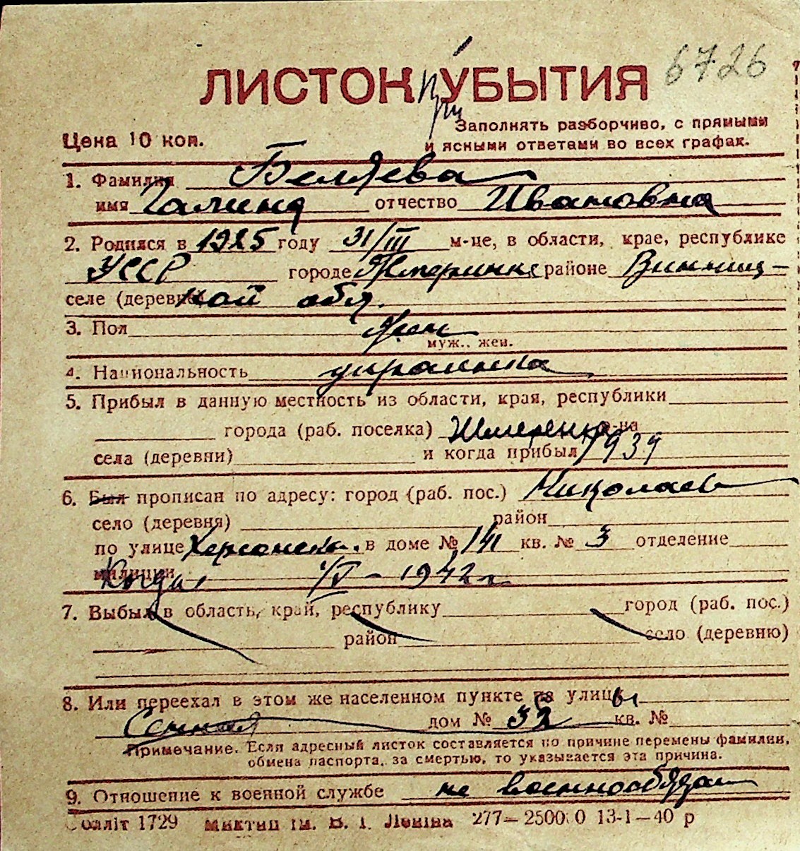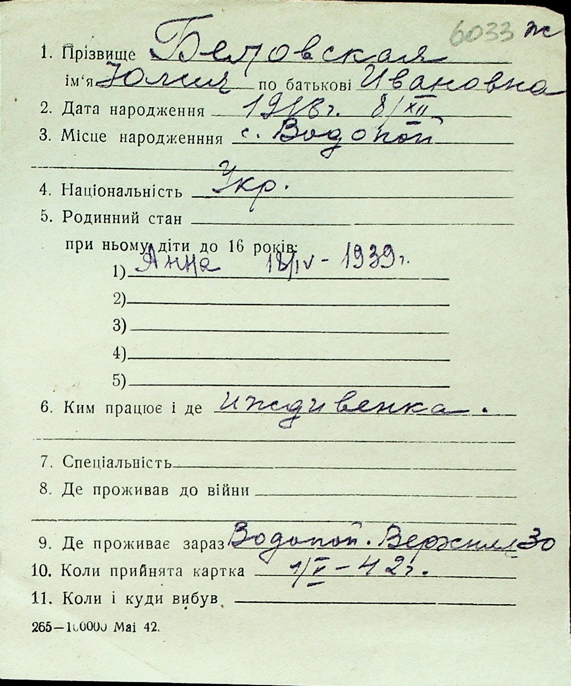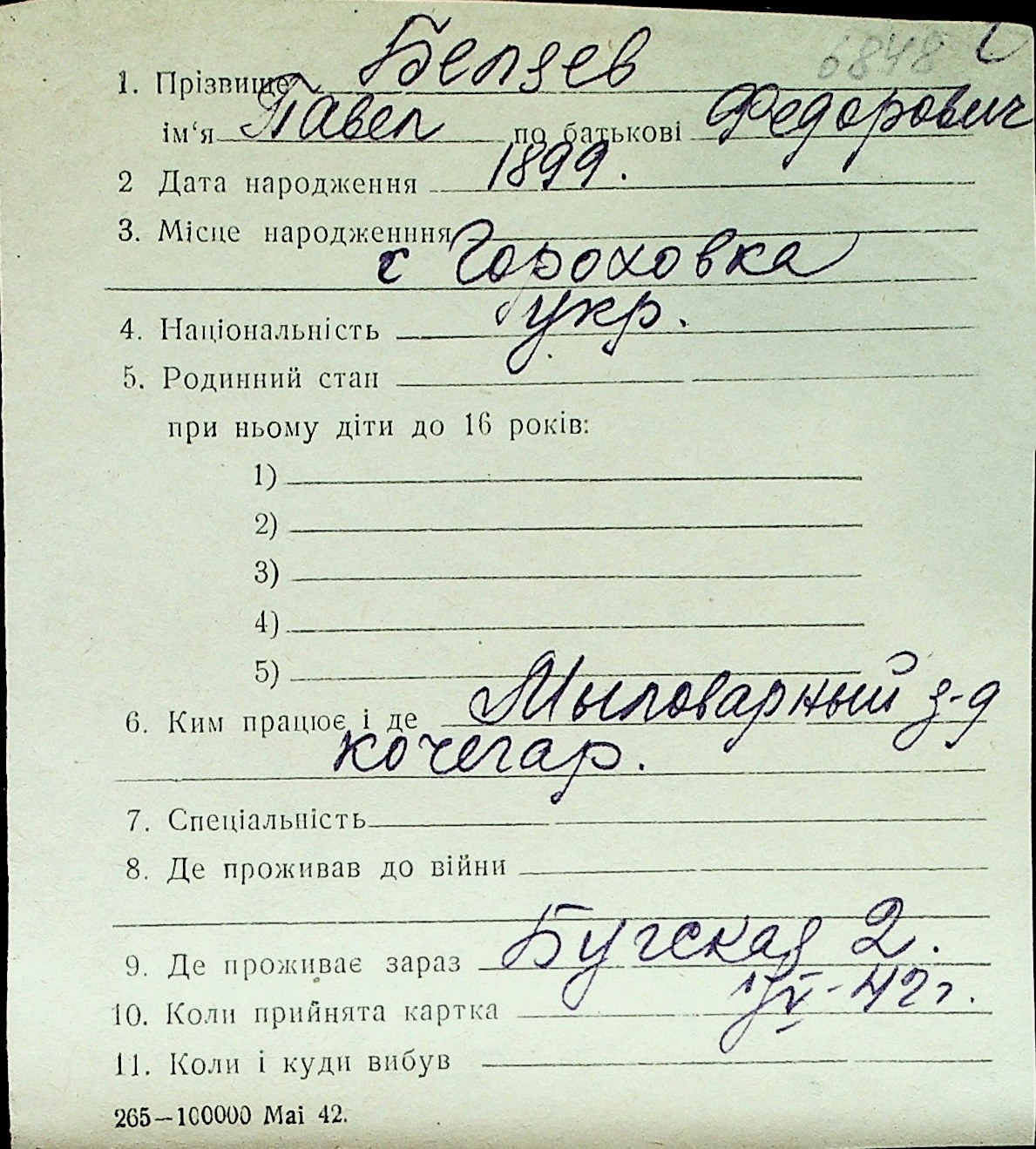 ◦ ◦ Перелік карток на осіб, які мешкали у м. Миколаїв у період окупації 1941–1944 років