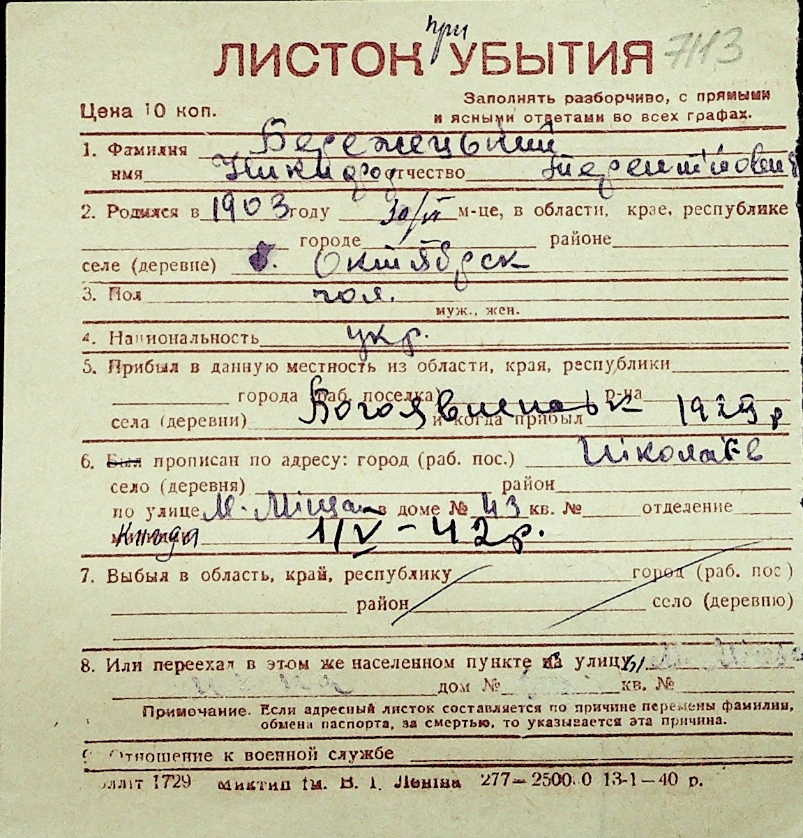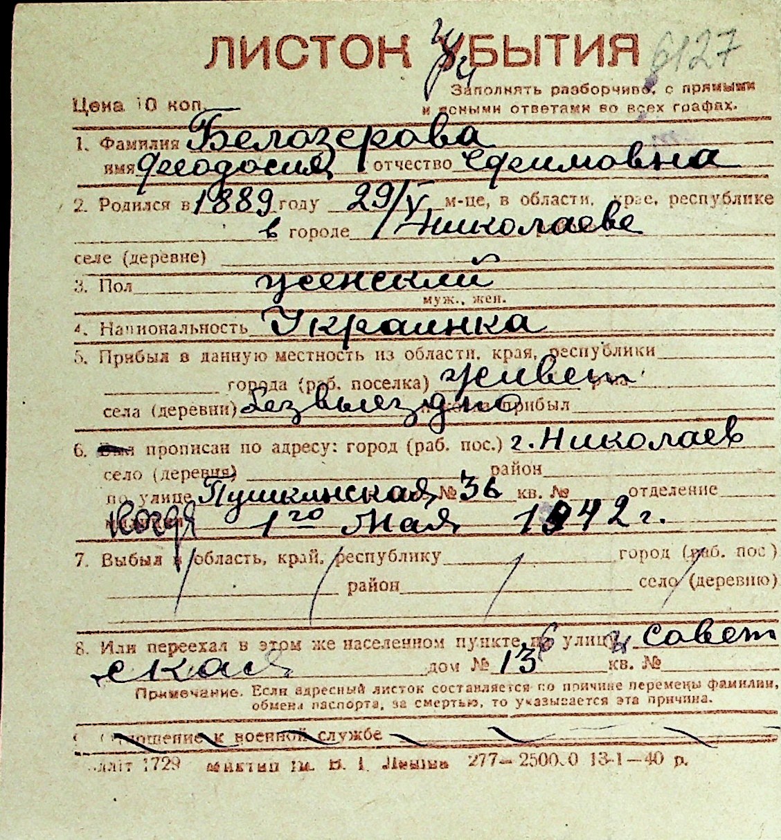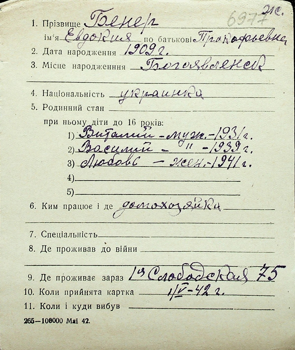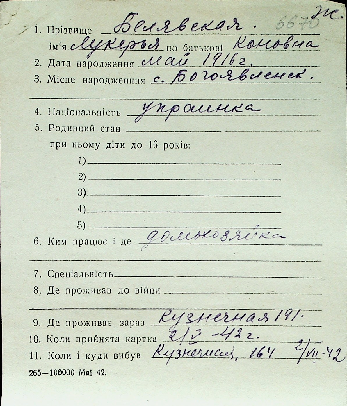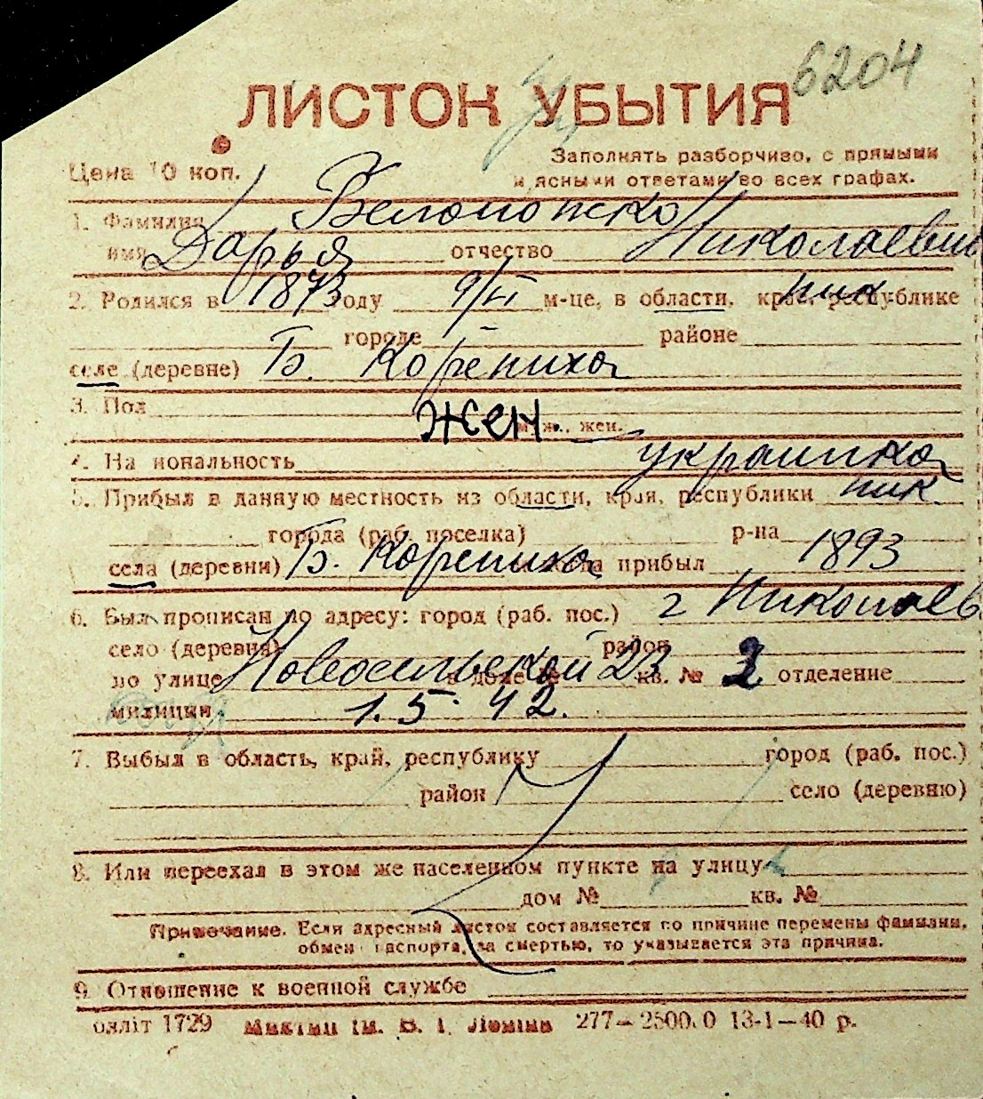 ◦ ◦ Перелік карток на осіб, які мешкали у м. Миколаїв у період окупації 1941–1944 років