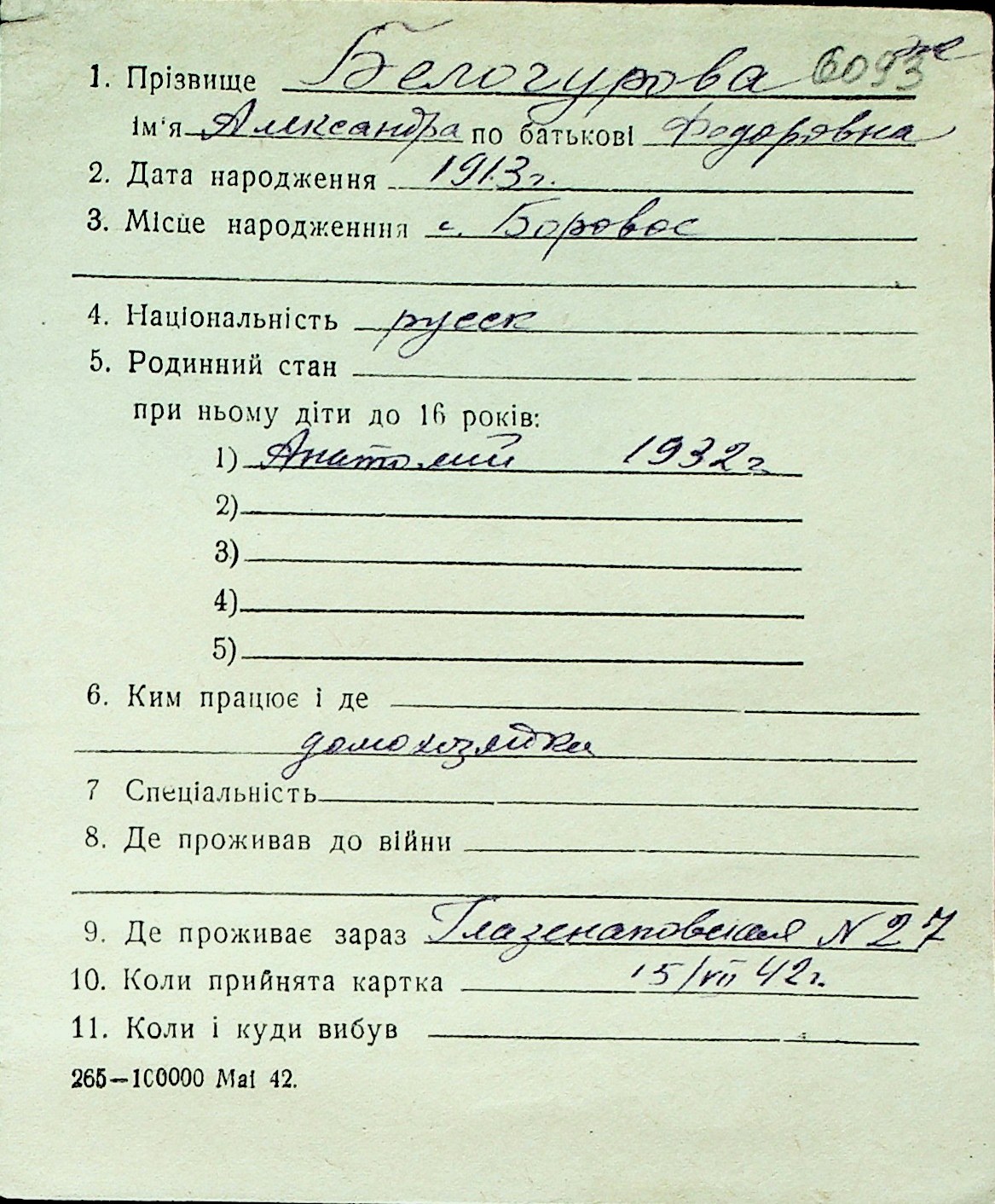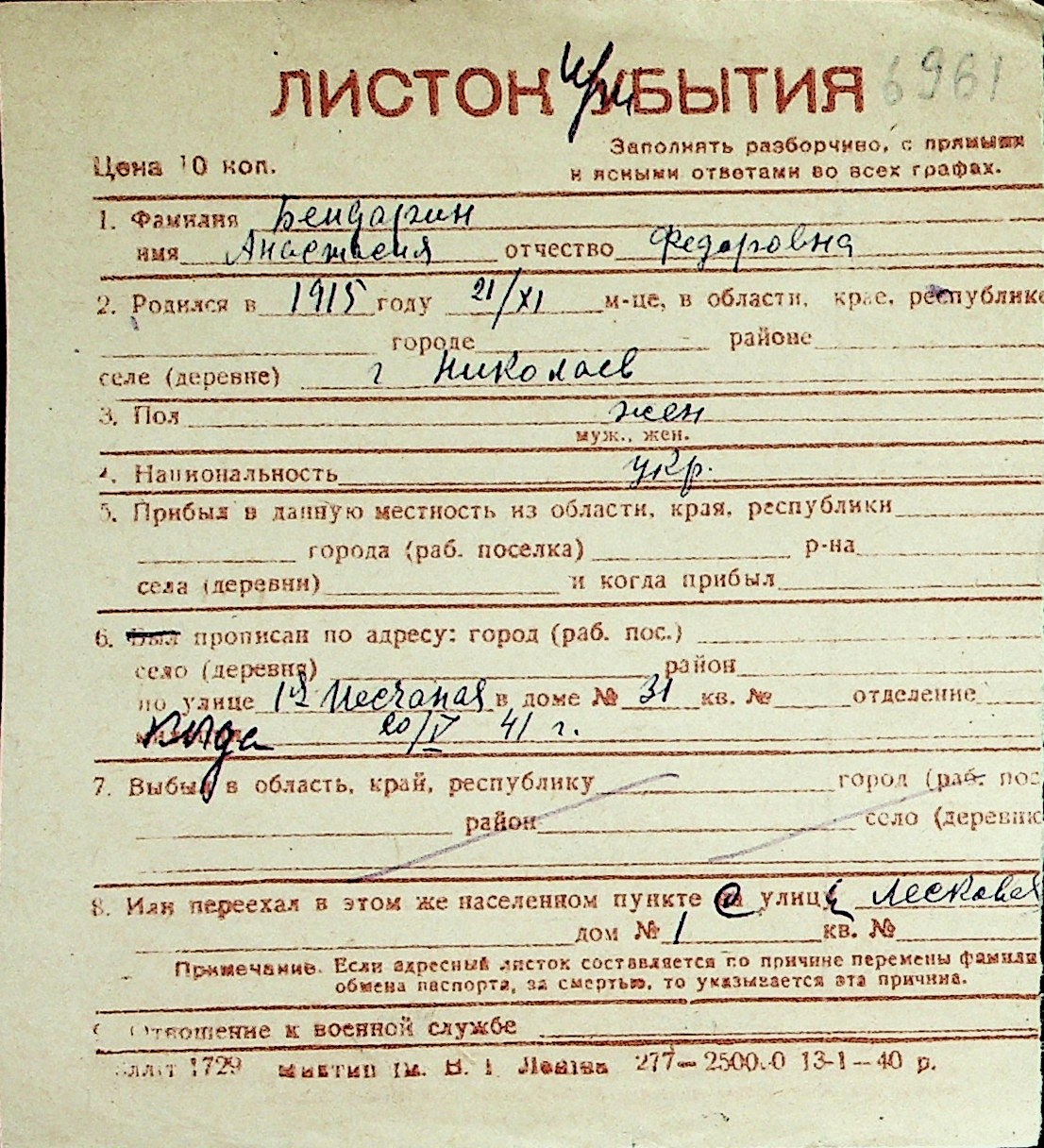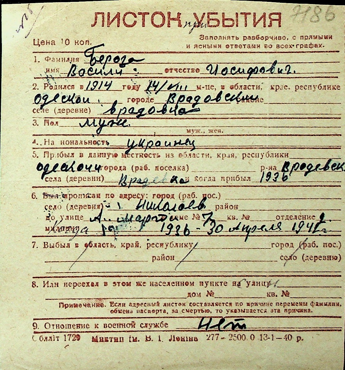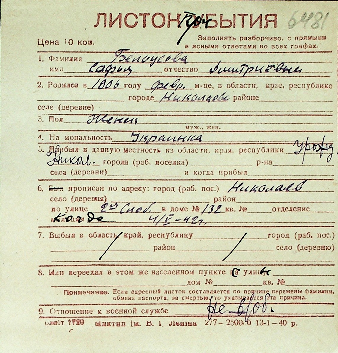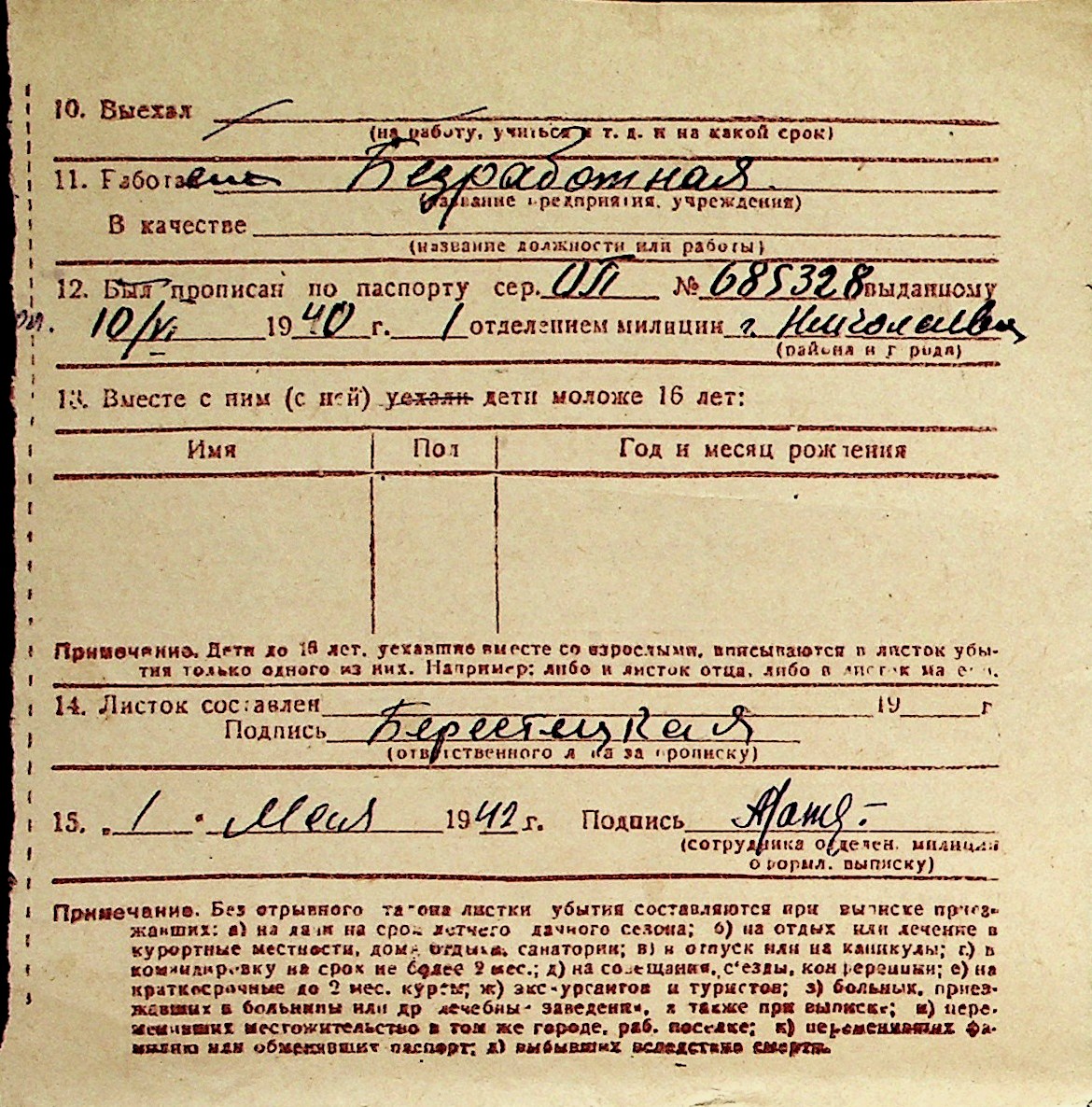 ◦ ◦ Перелік карток на осіб, які мешкали у м. Миколаїв у період окупації 1941–1944 років
