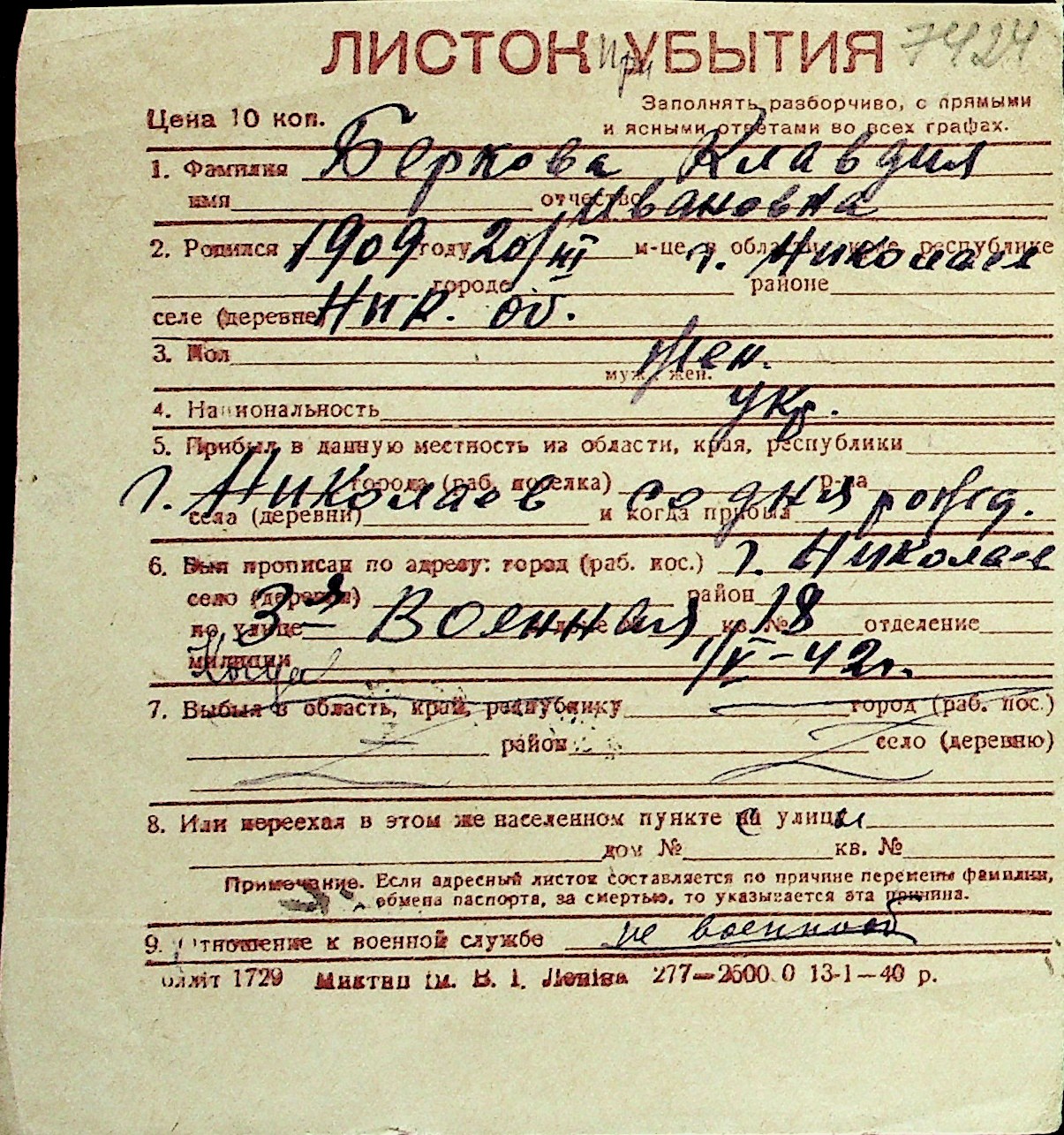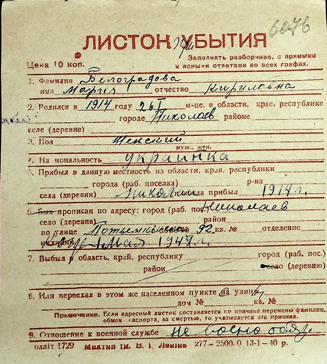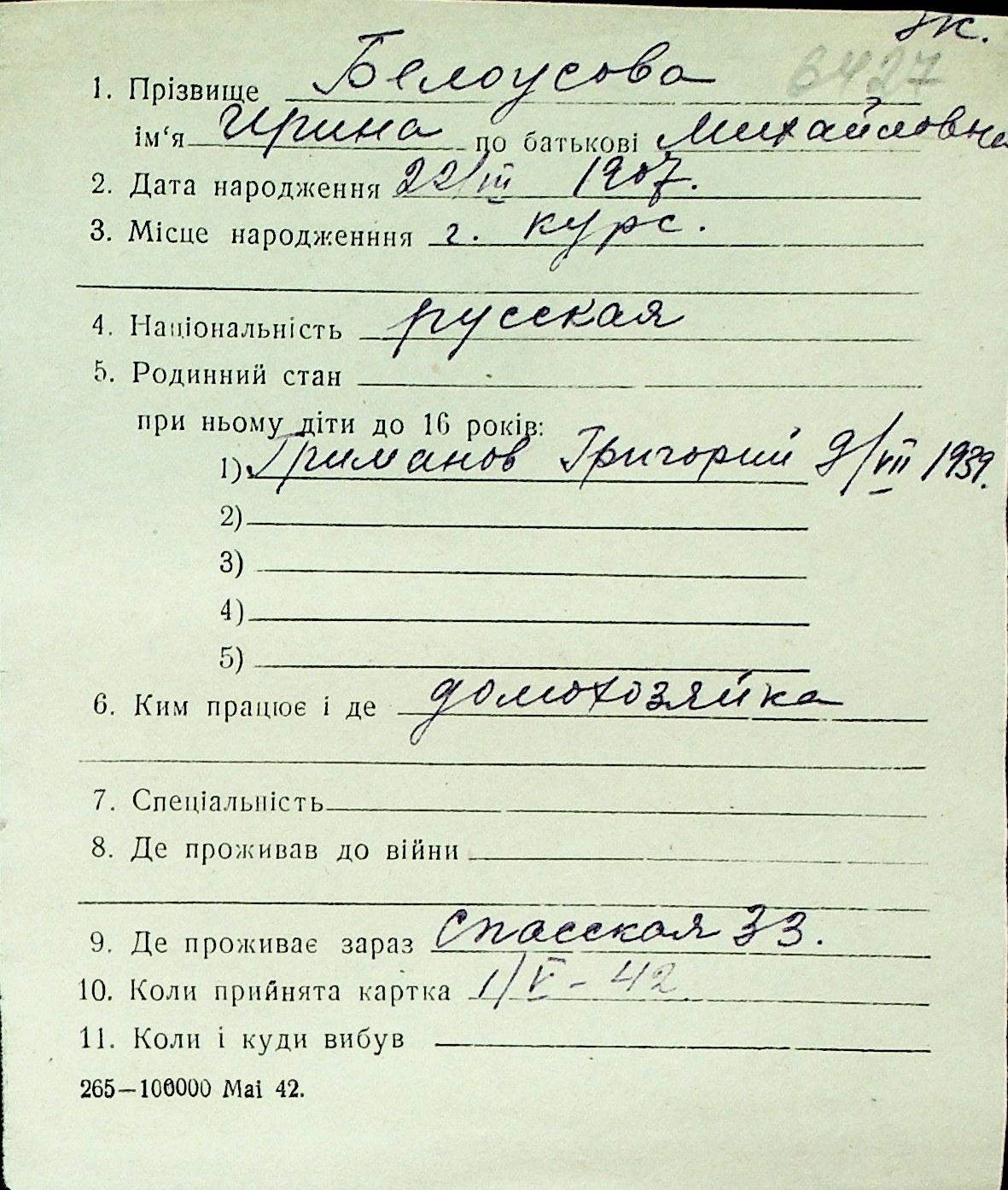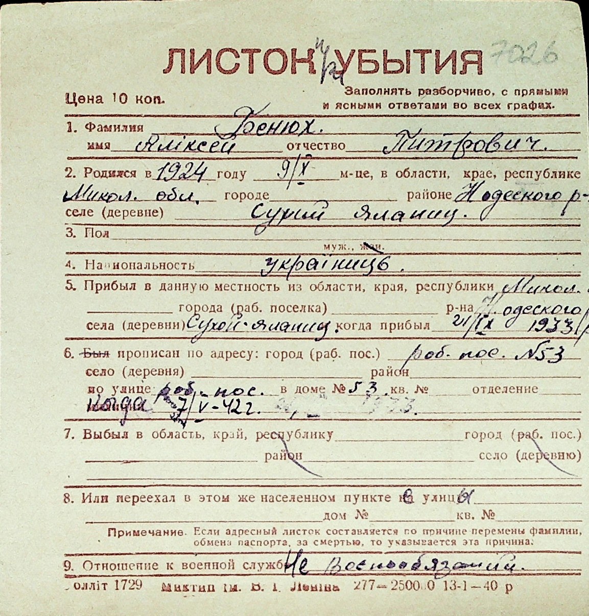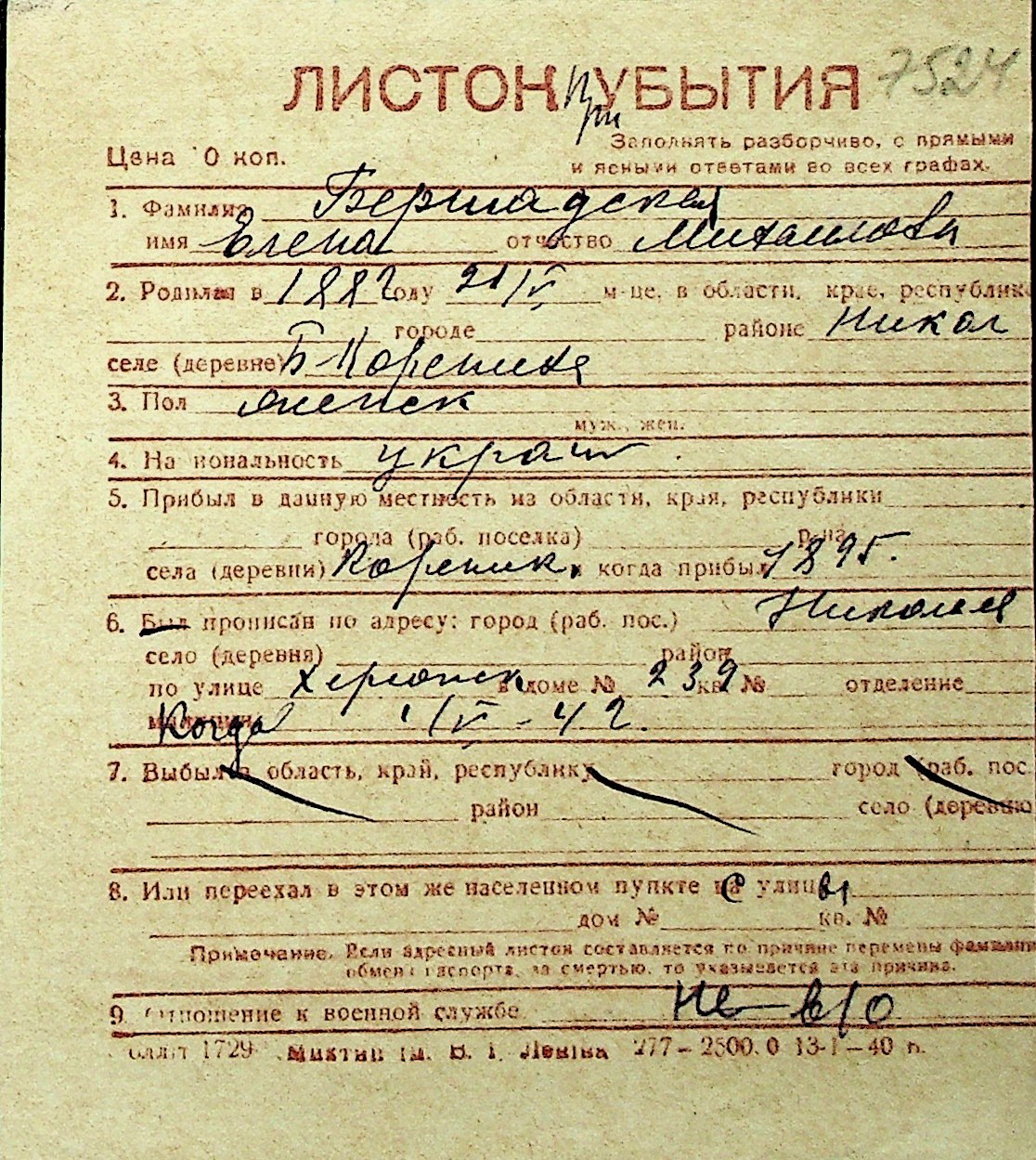 ◦ ◦ Перелік карток на осіб, які мешкали у м. Миколаїв у період окупації 1941–1944 років