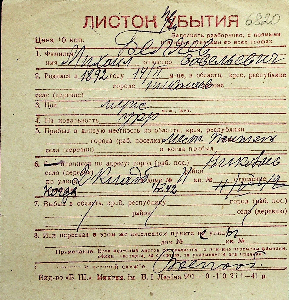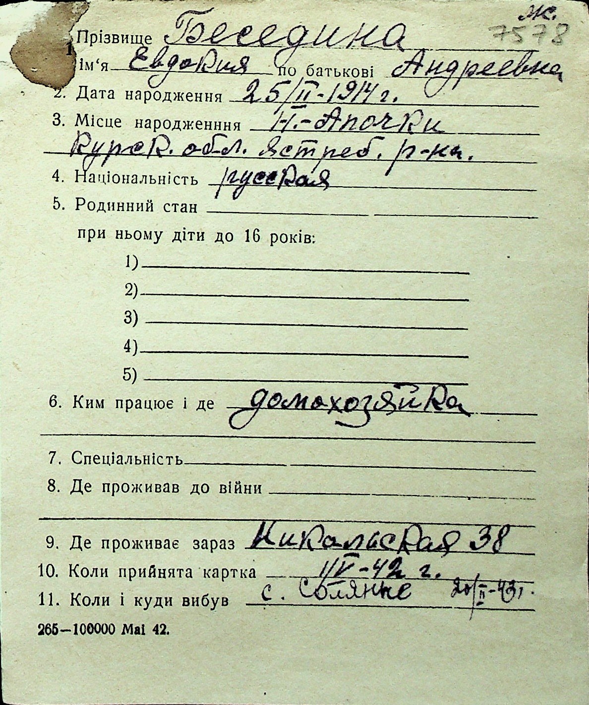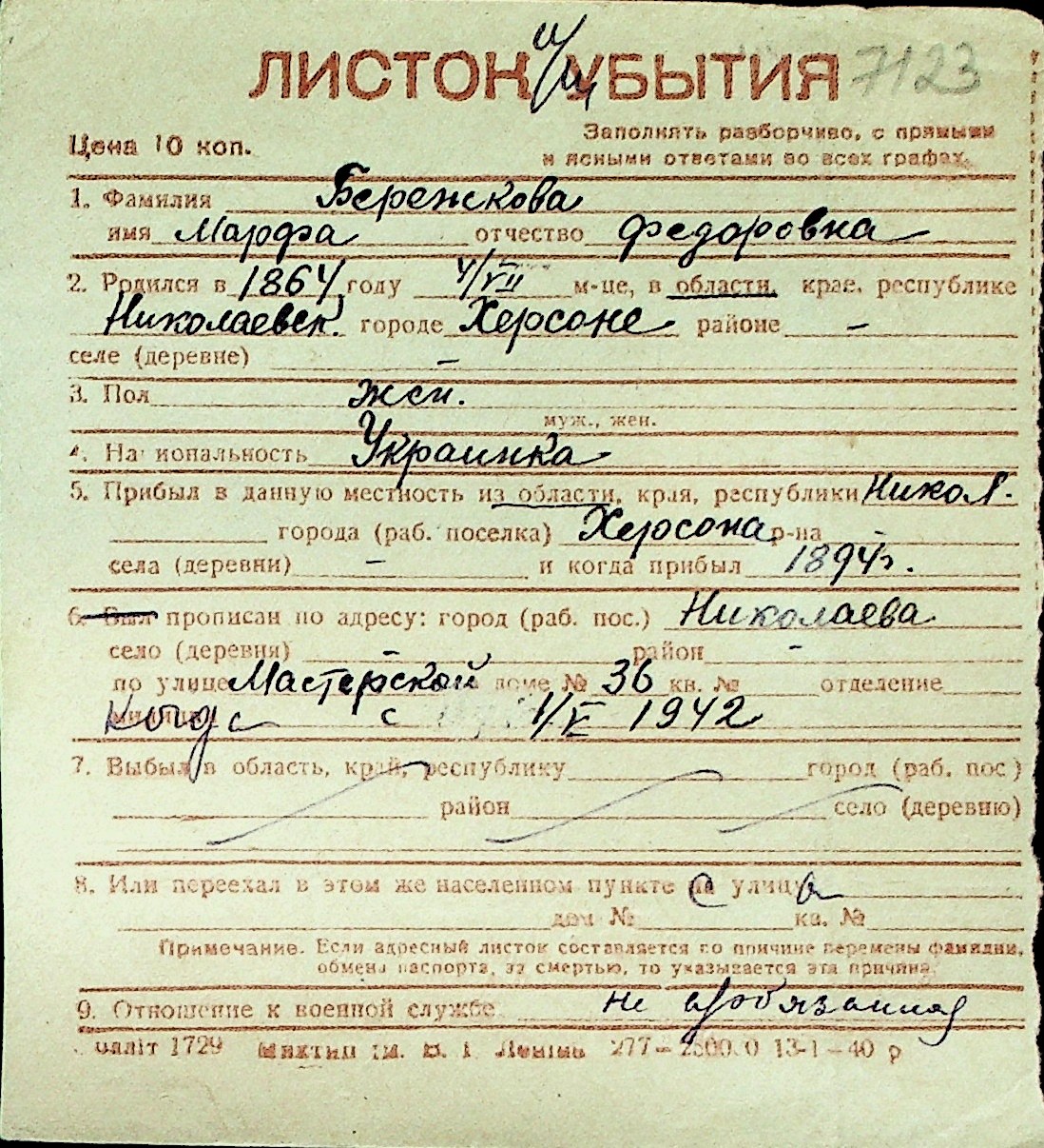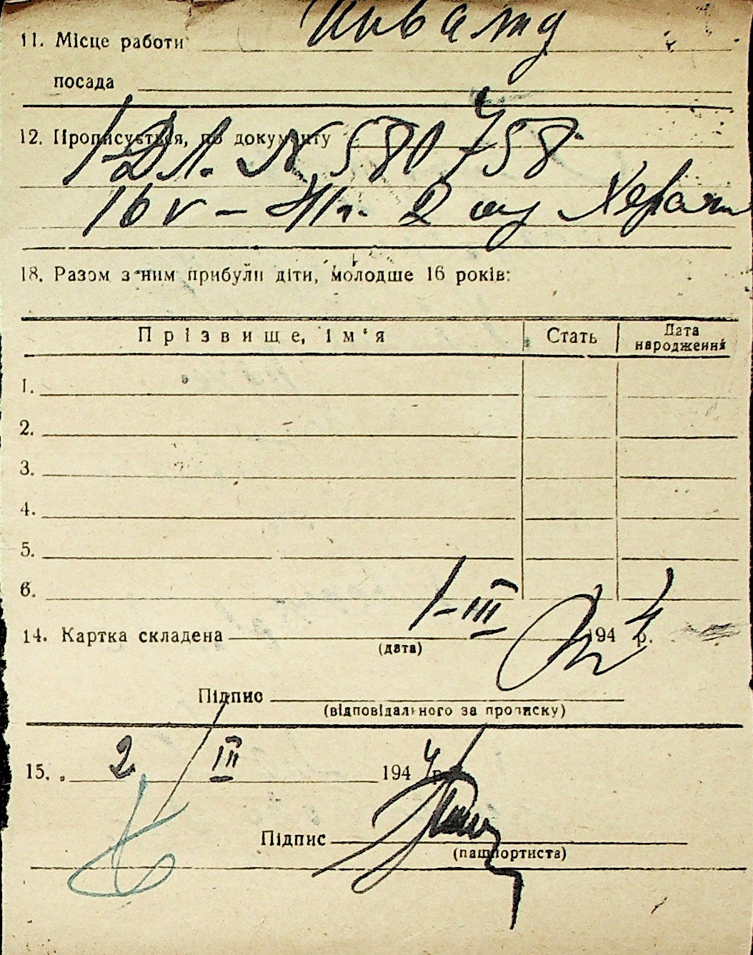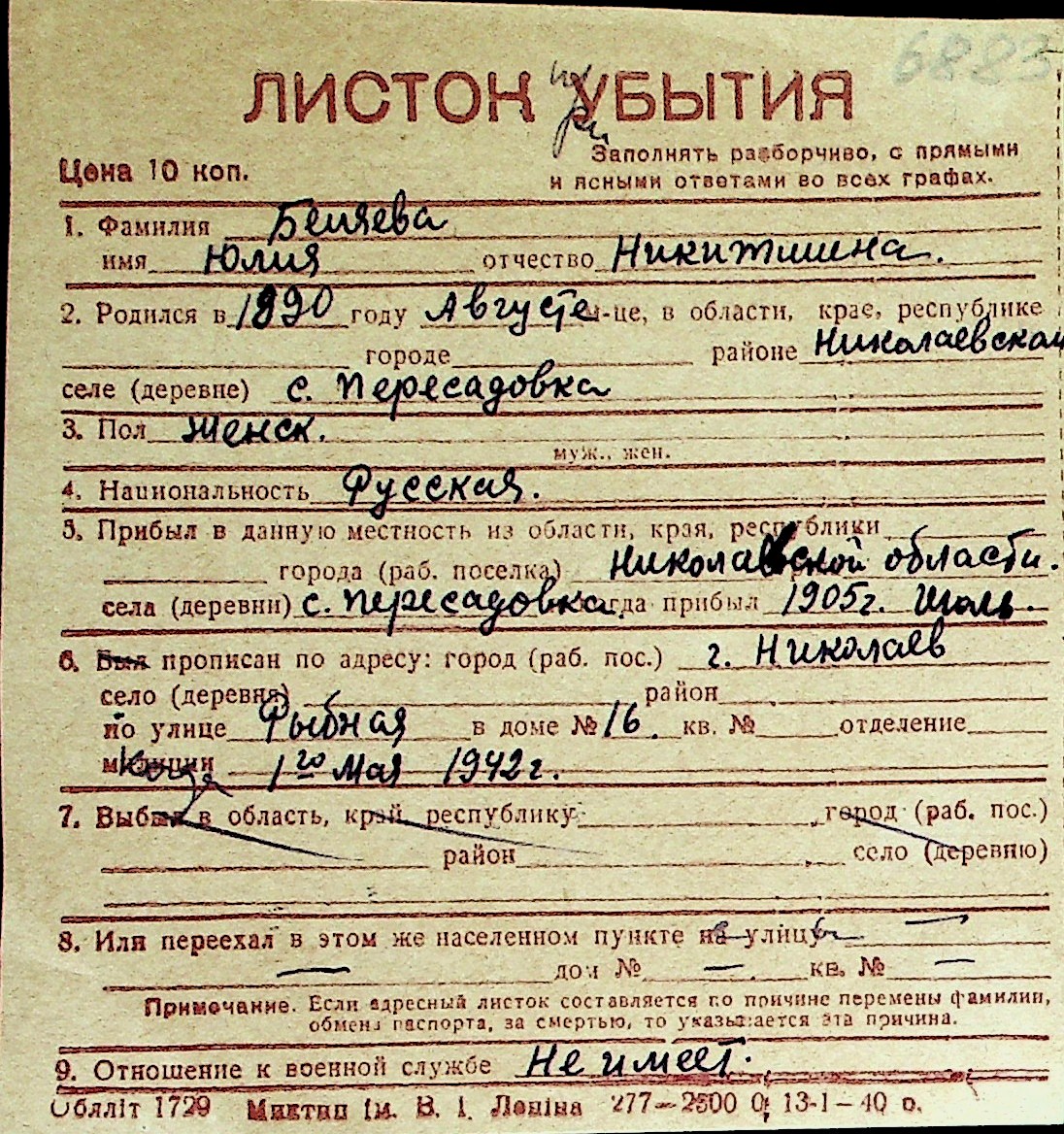 ◦ ◦ Перелік карток на осіб, які мешкали у м. Миколаїв у період окупації 1941–1944 років
