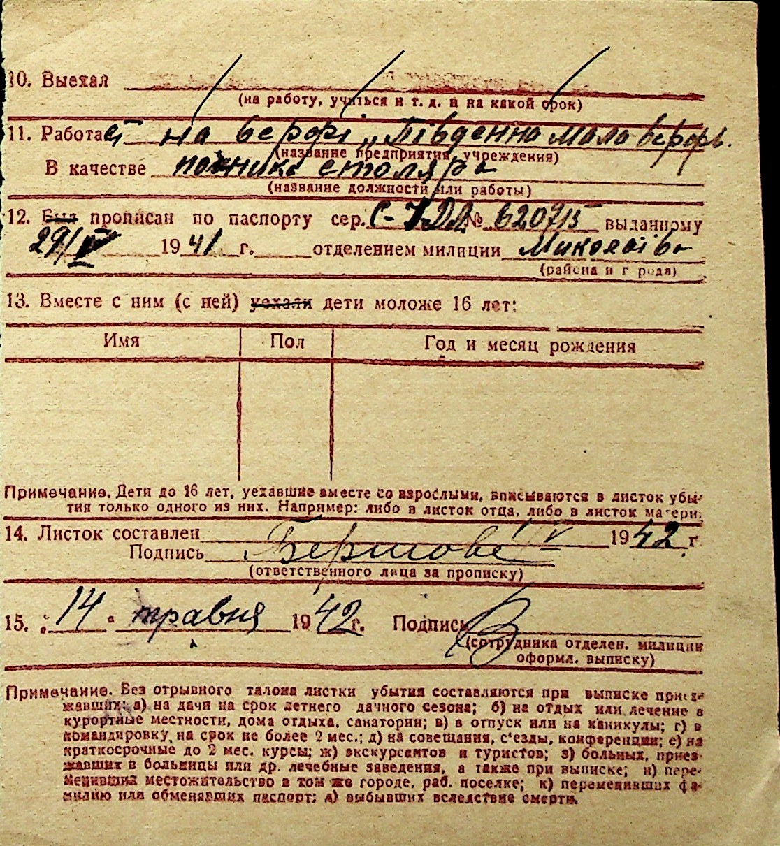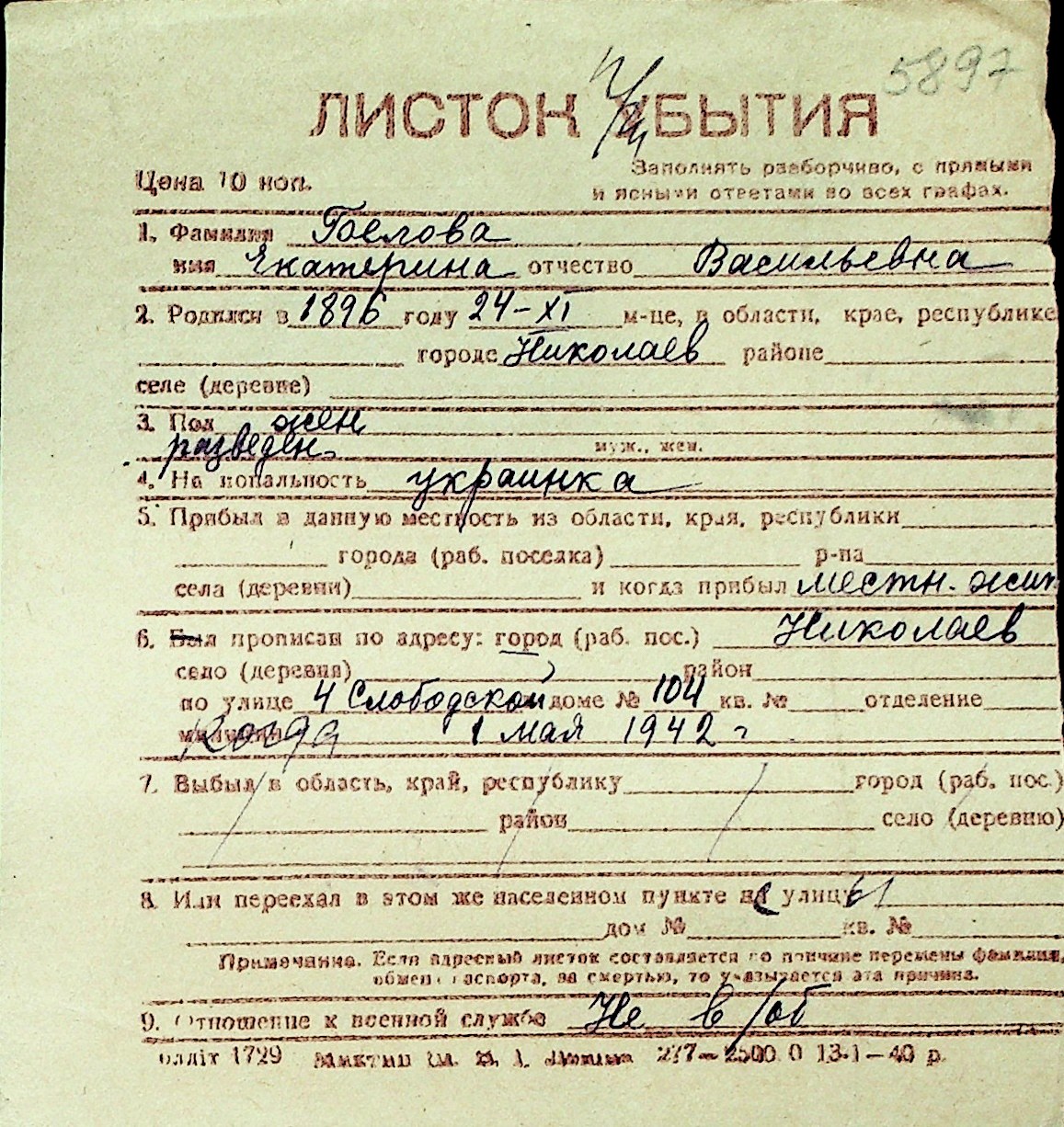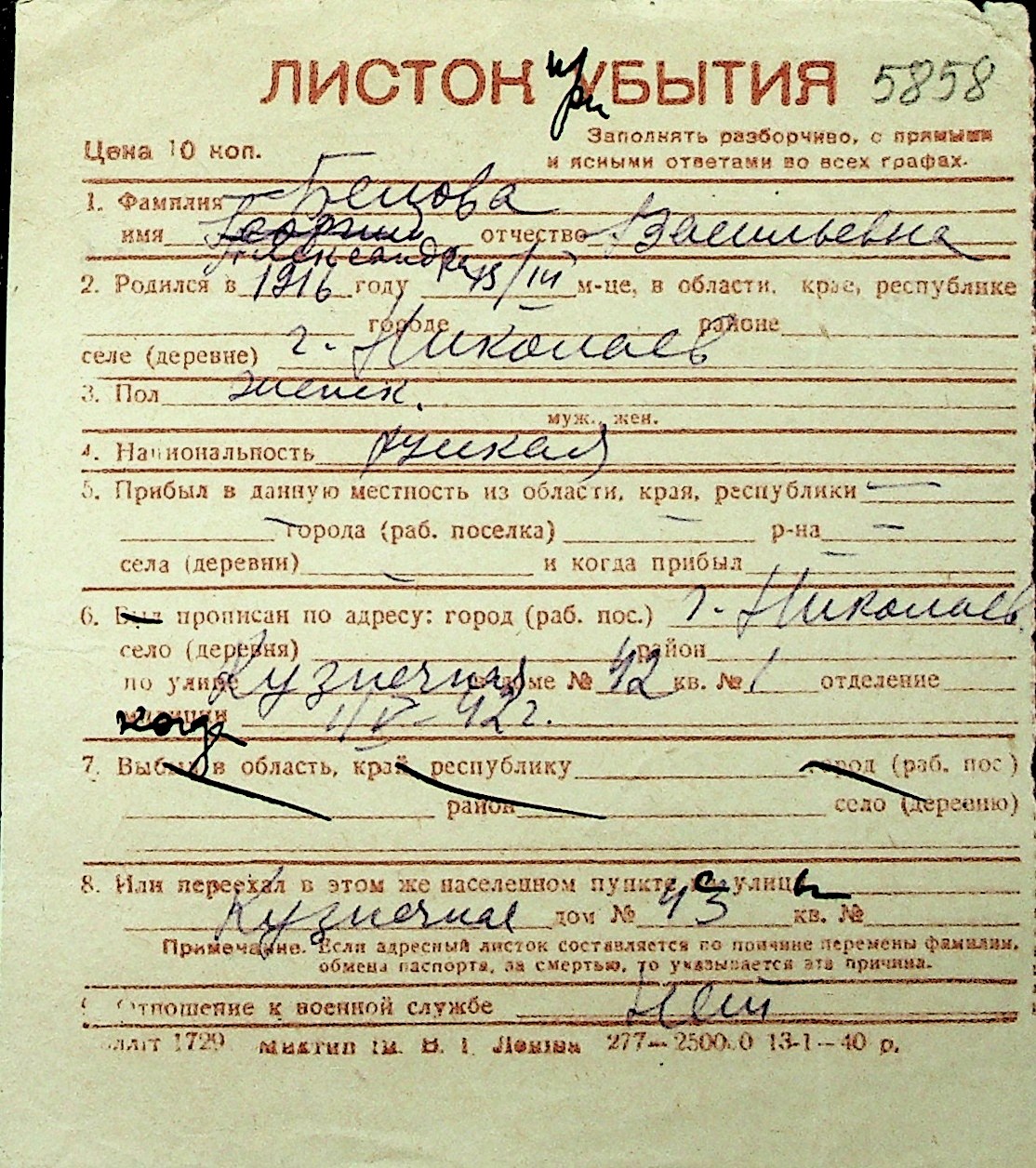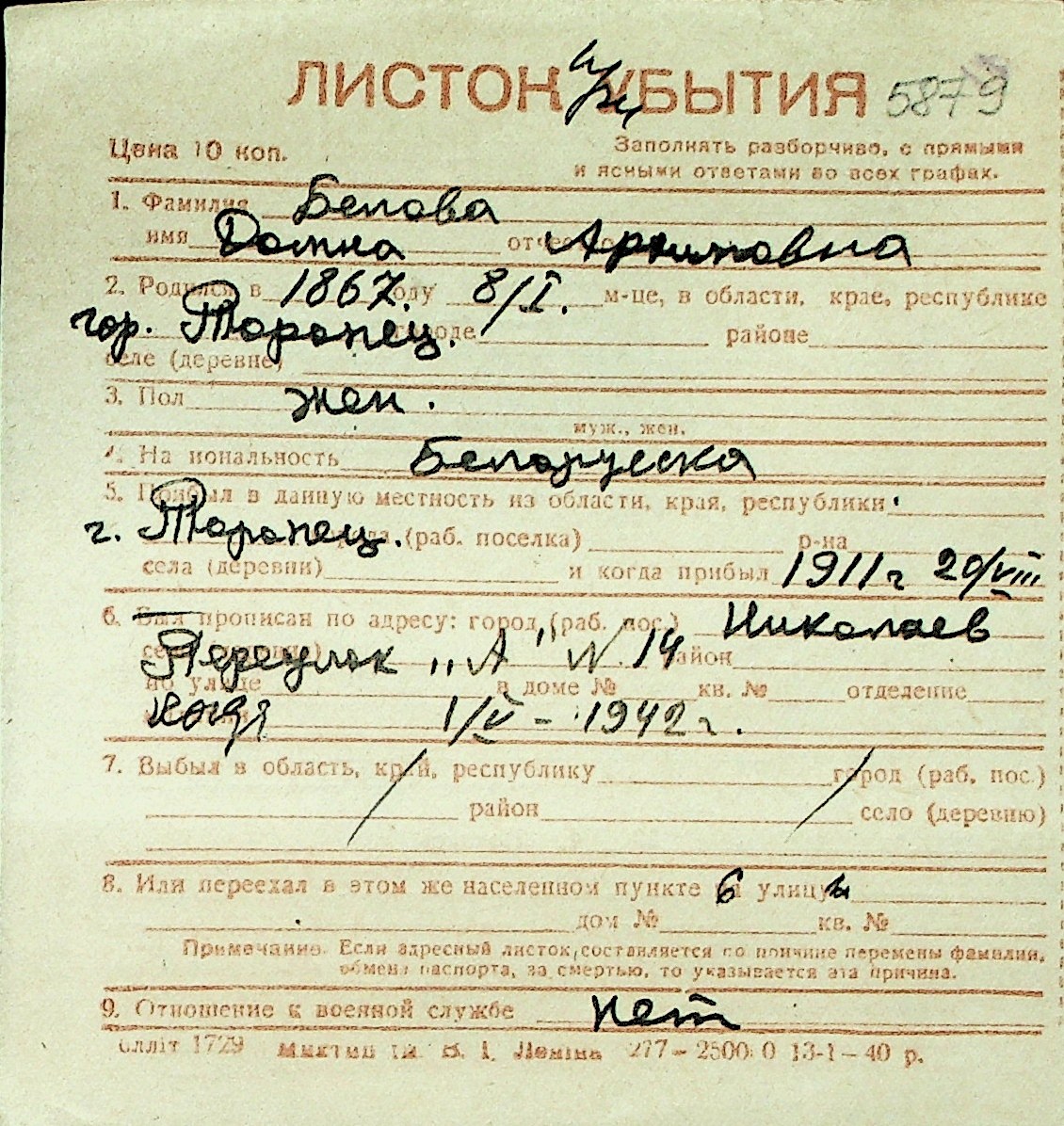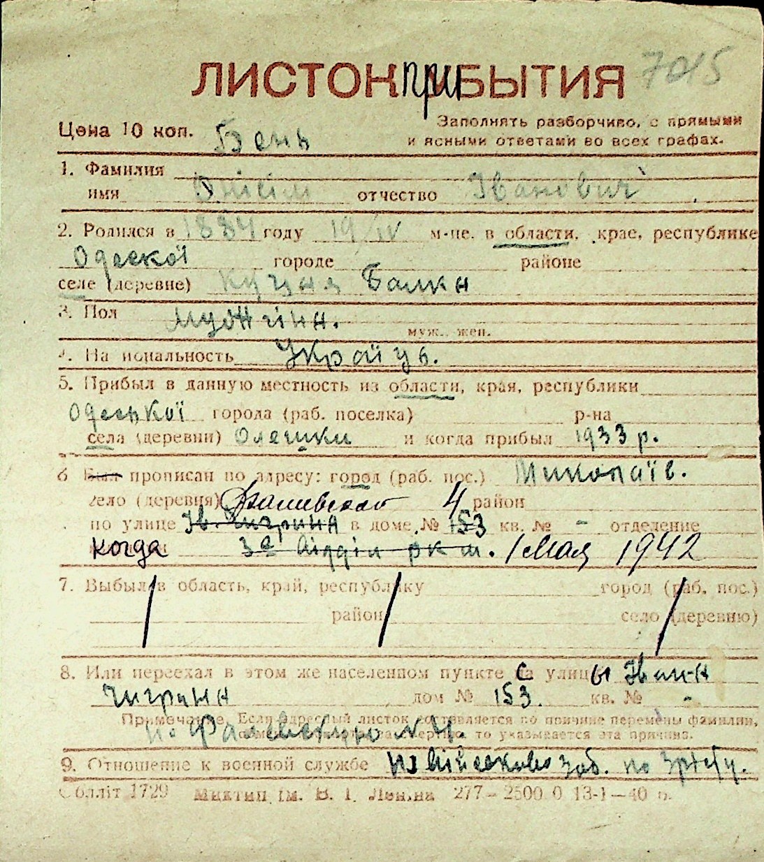 ◦ ◦ Перелік карток на осіб, які мешкали у м. Миколаїв у період окупації 1941–1944 років