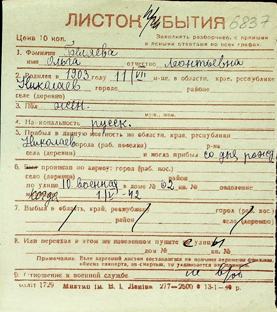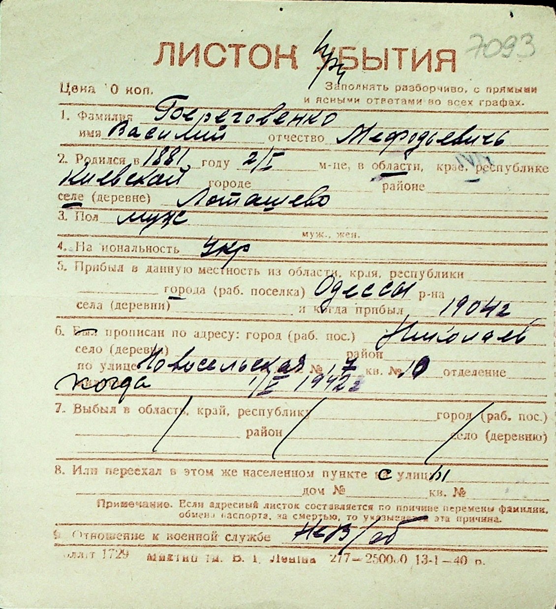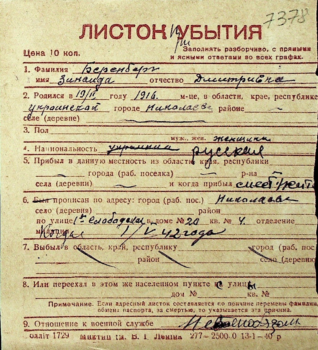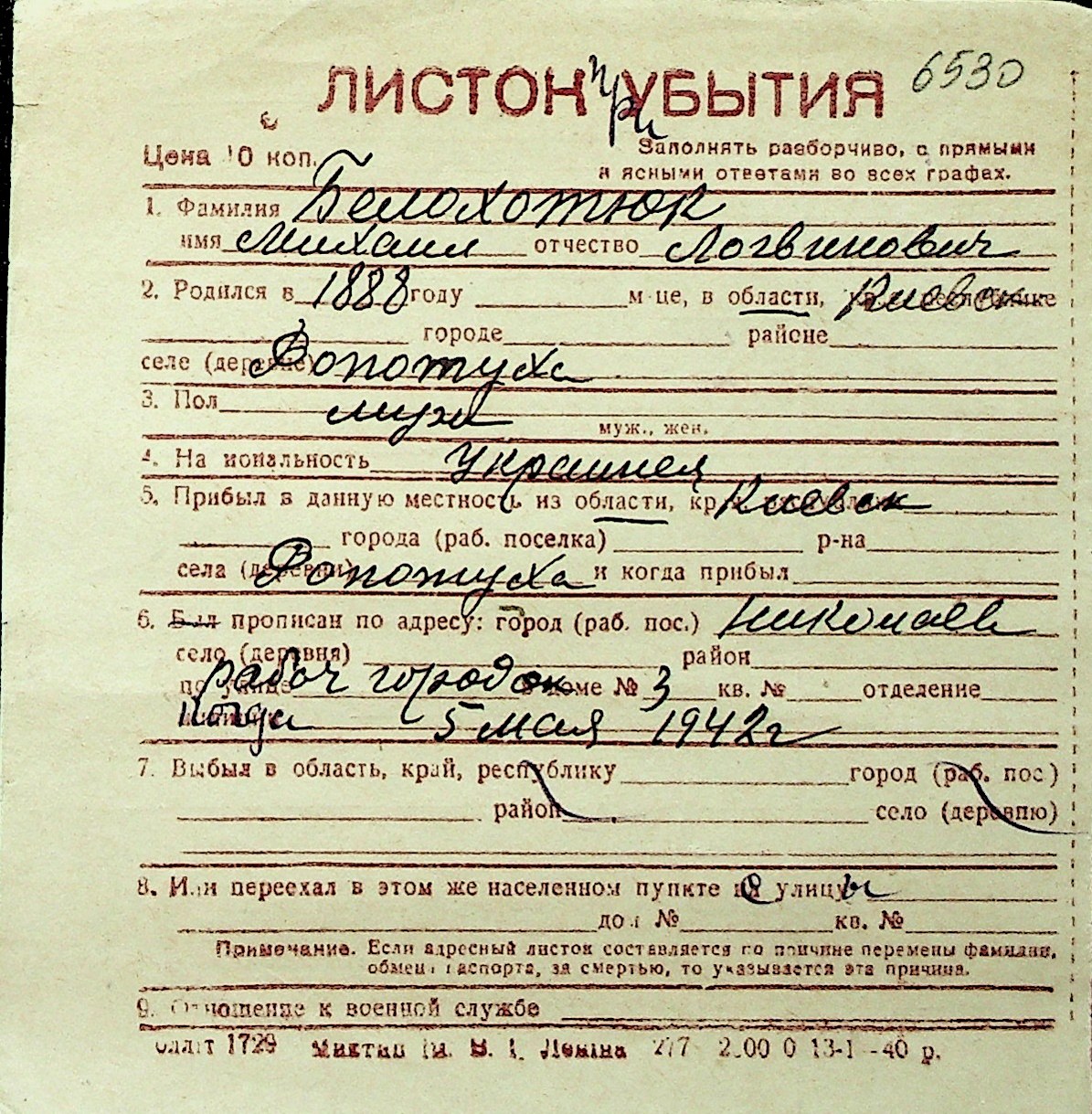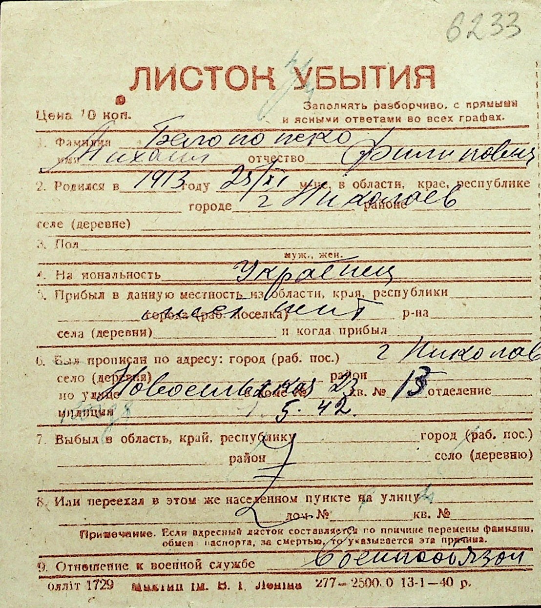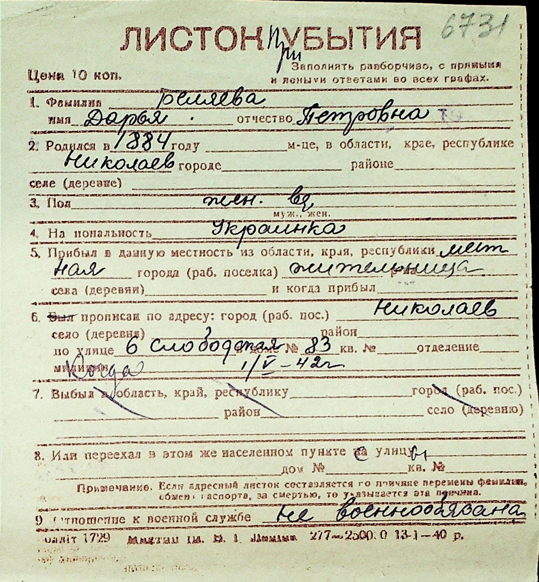 ◦ ◦ Перелік карток на осіб, які мешкали у м. Миколаїв у період окупації 1941–1944 років