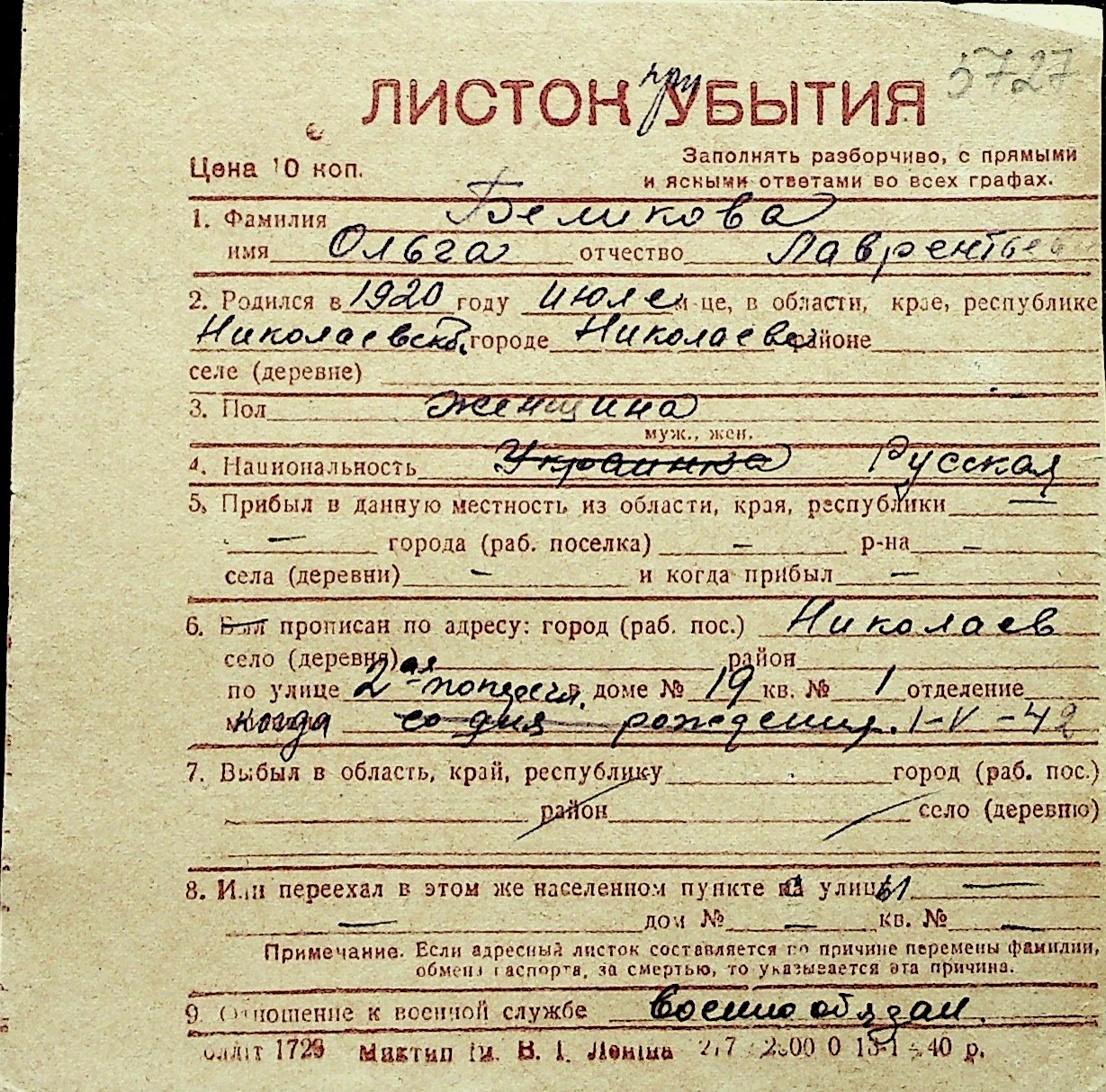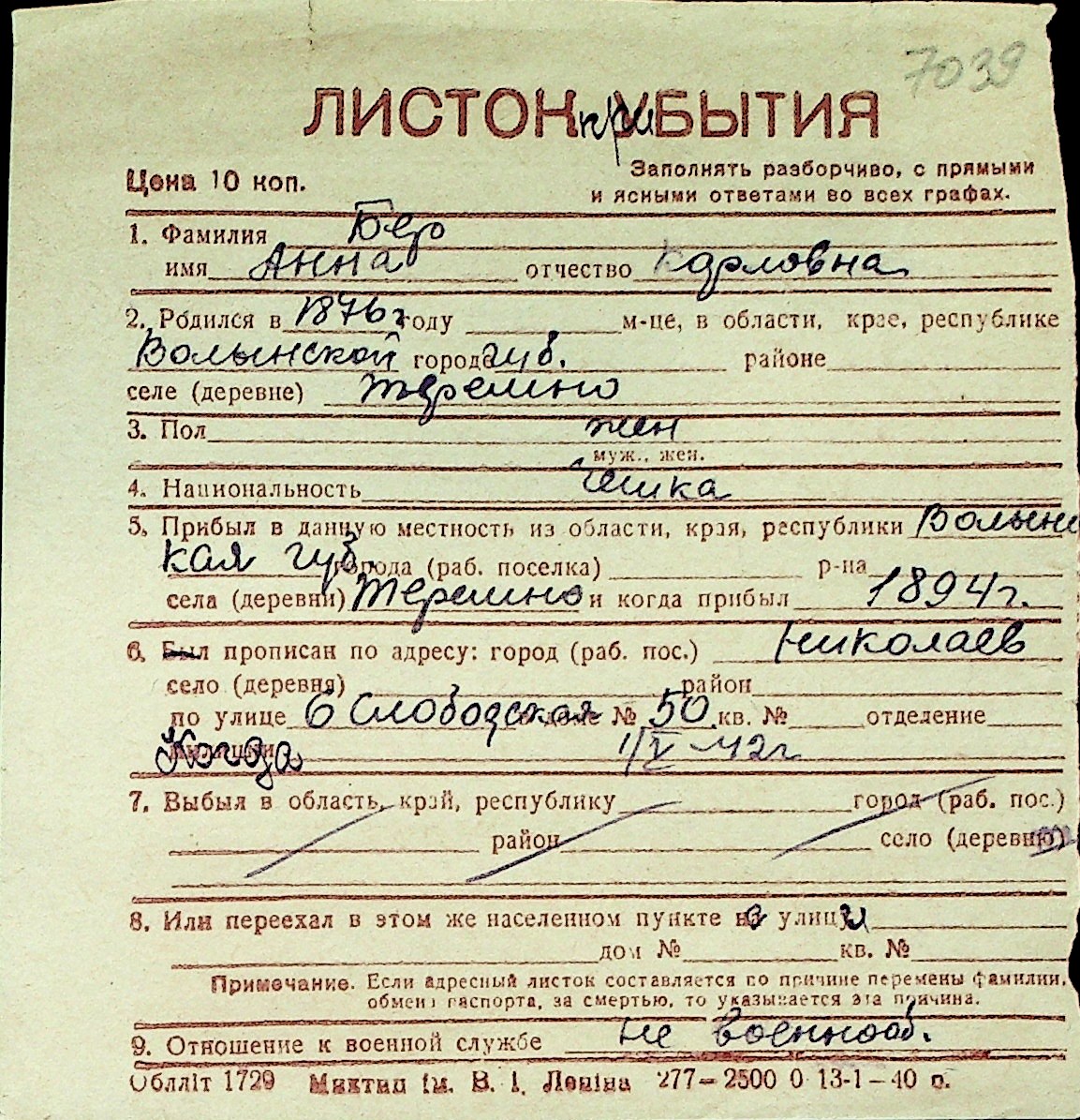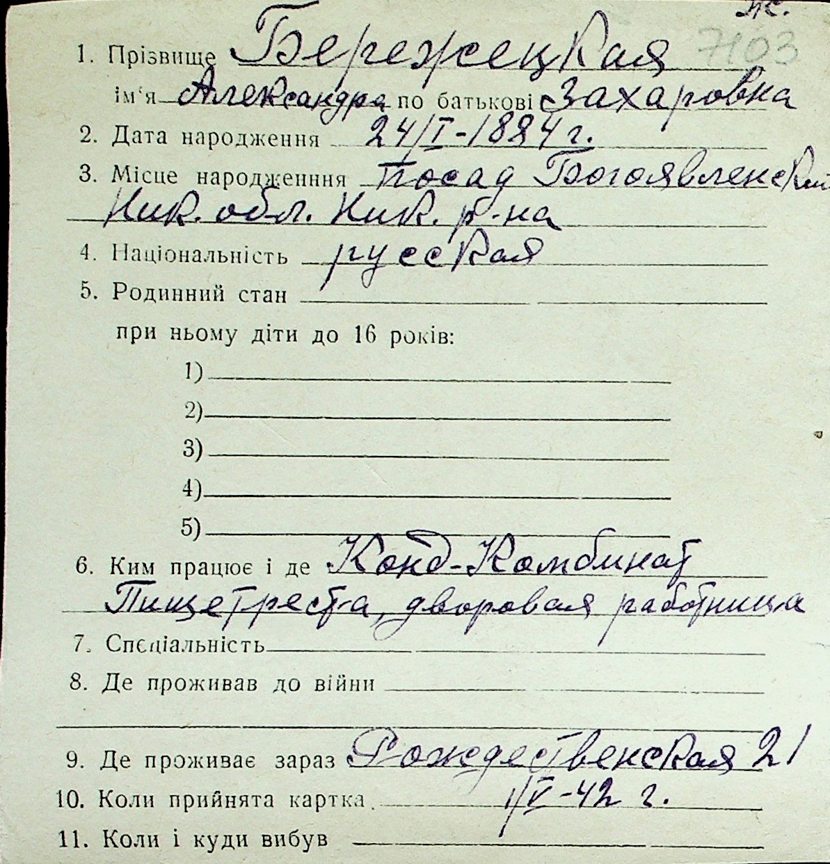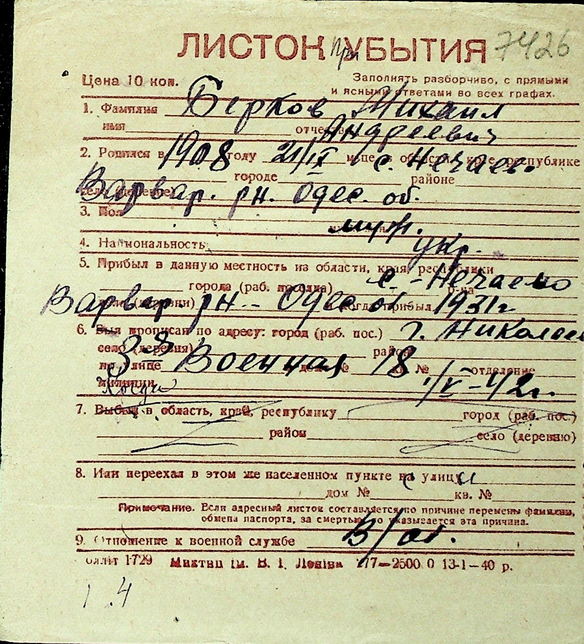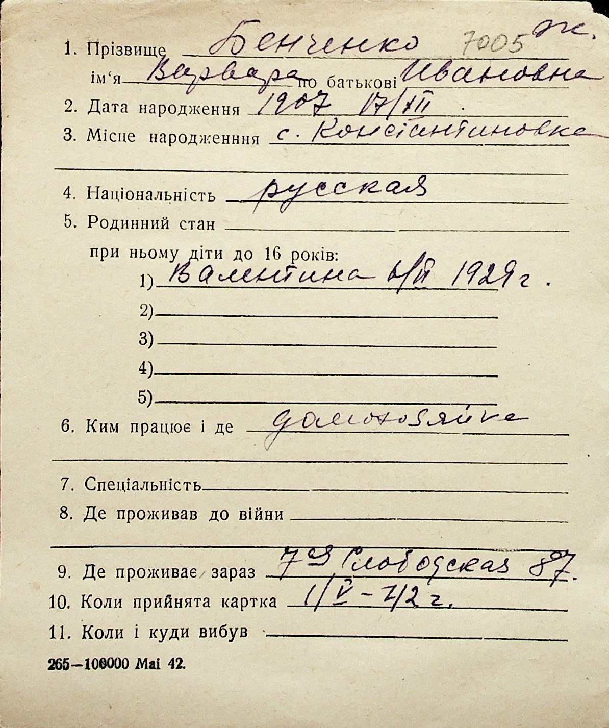 ◦ ◦ Перелік карток на осіб, які мешкали у м. Миколаїв у період окупації 1941–1944 років