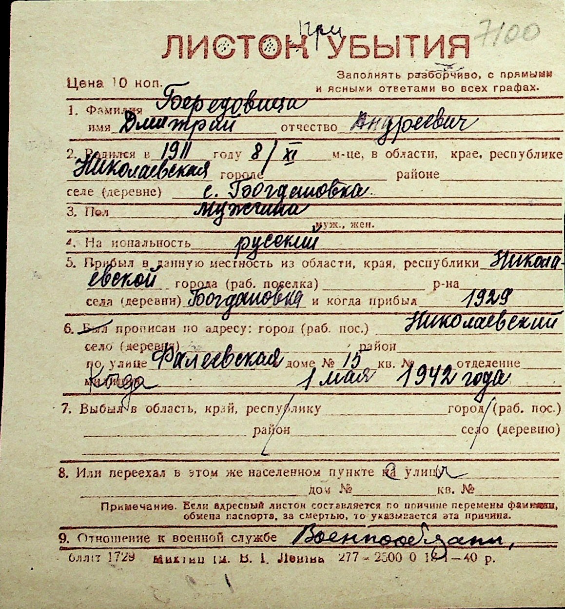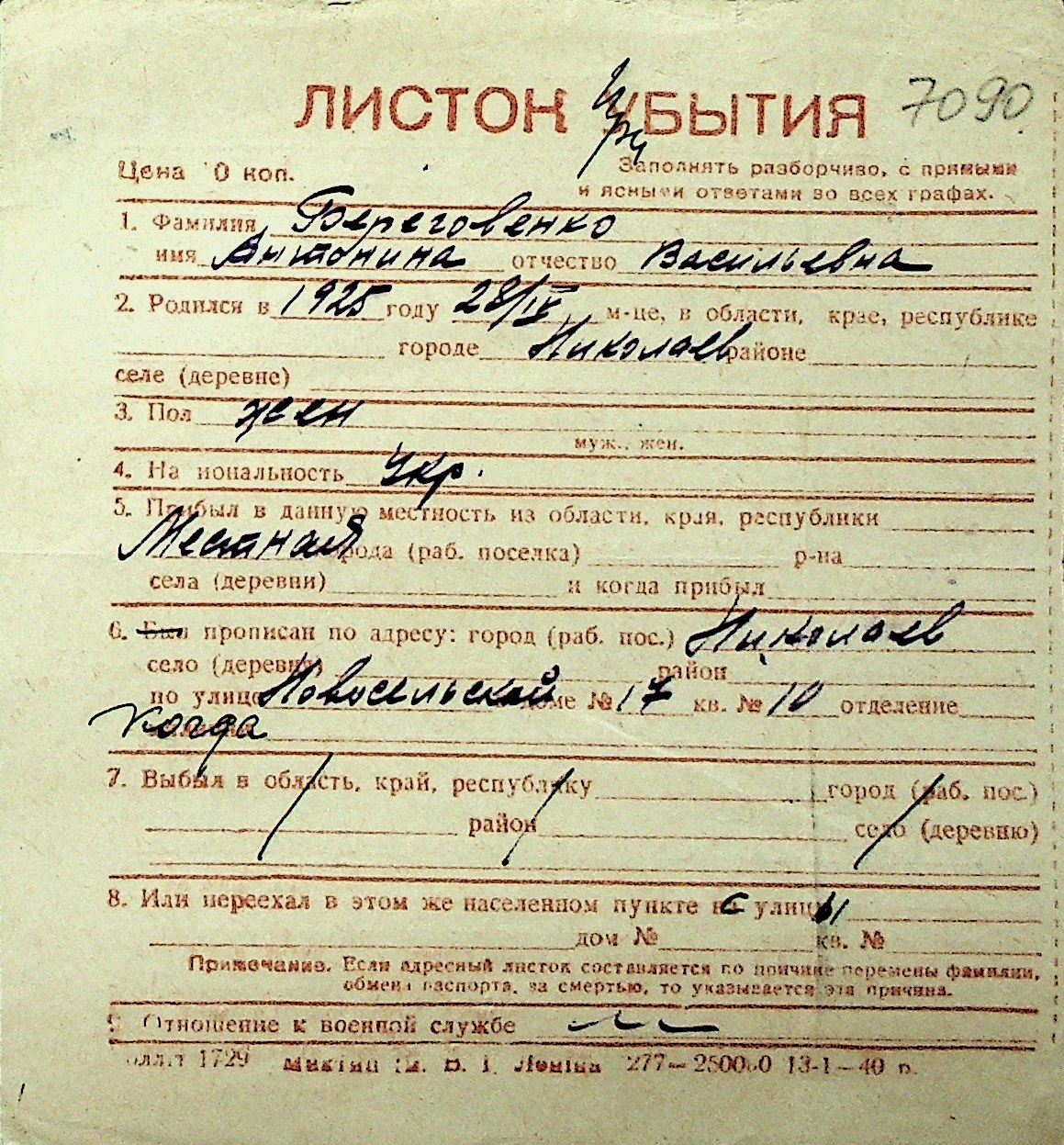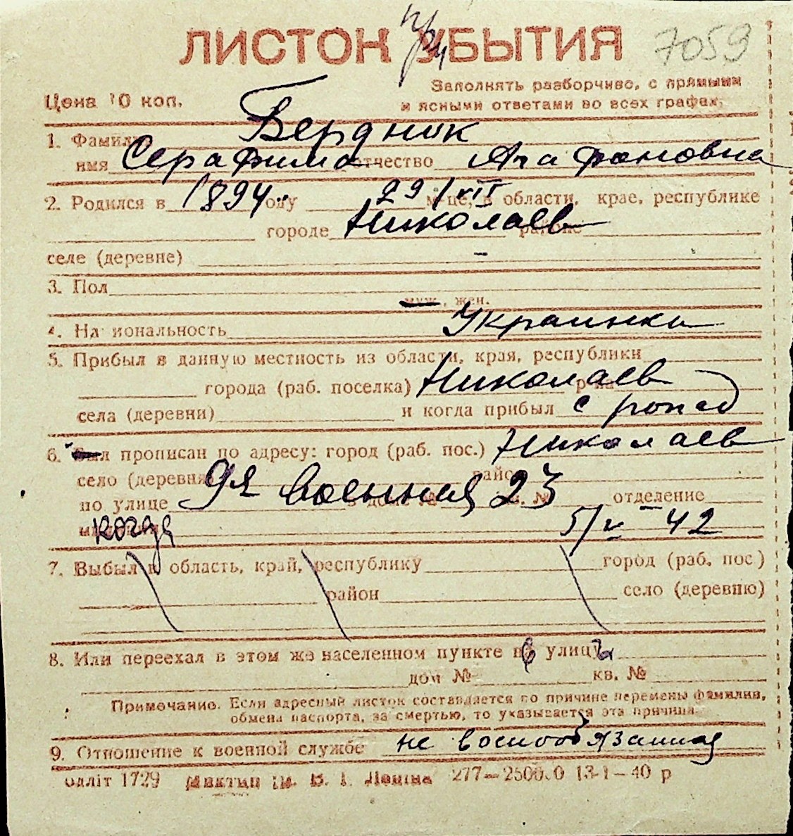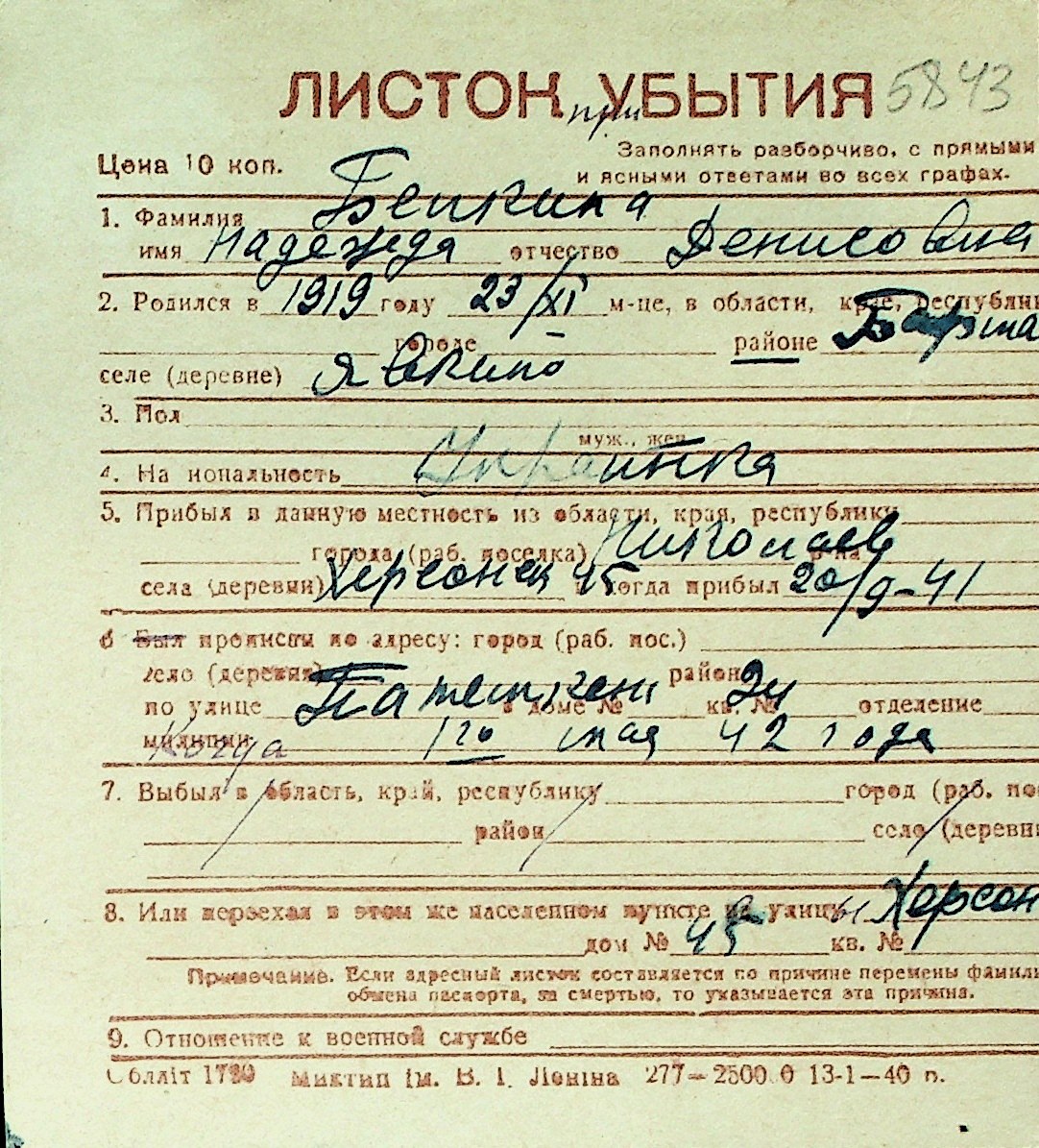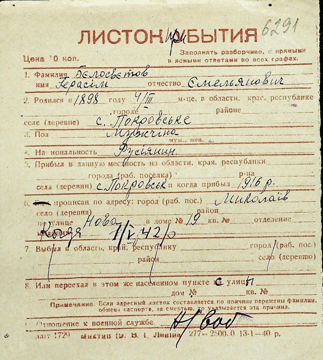 ◦ ◦ Перелік карток на осіб, які мешкали у м. Миколаїв у період окупації 1941–1944 років