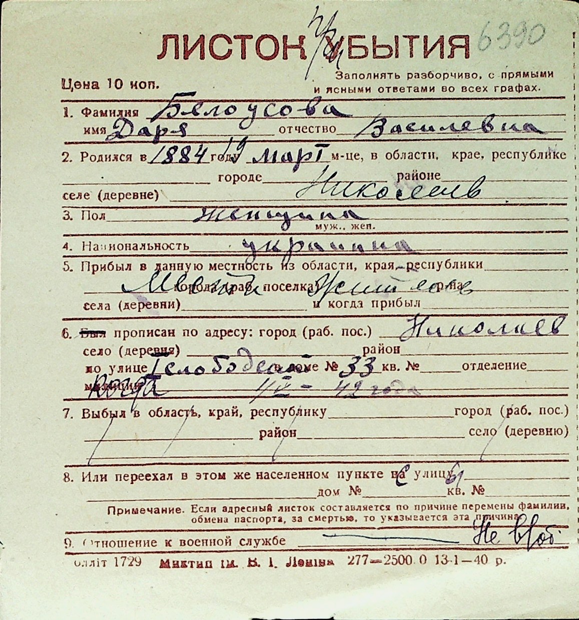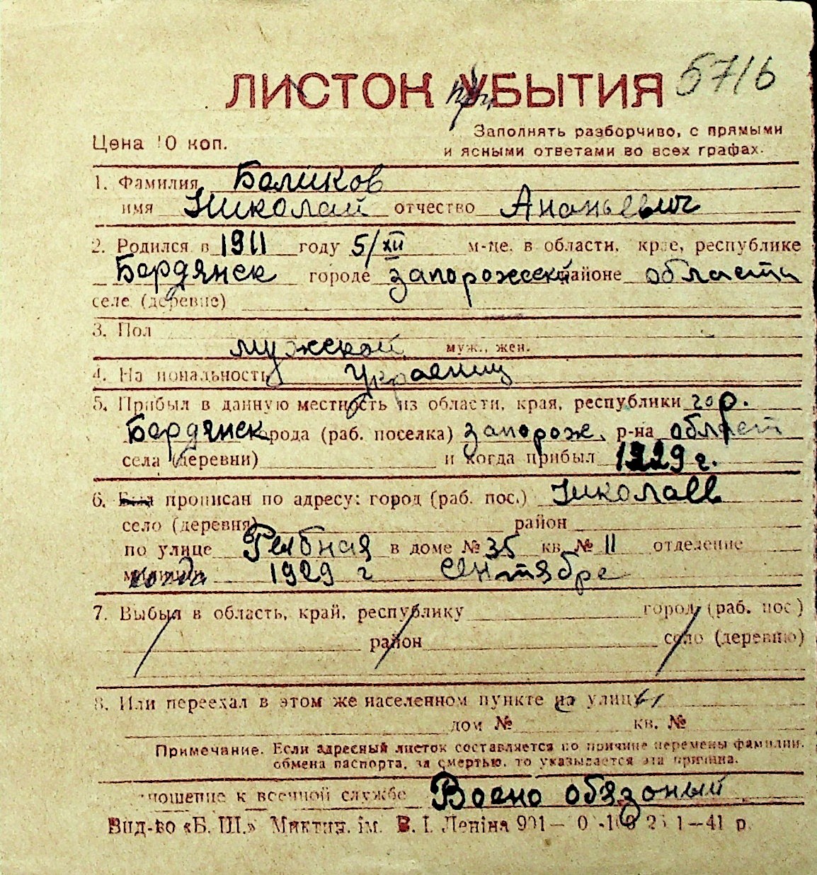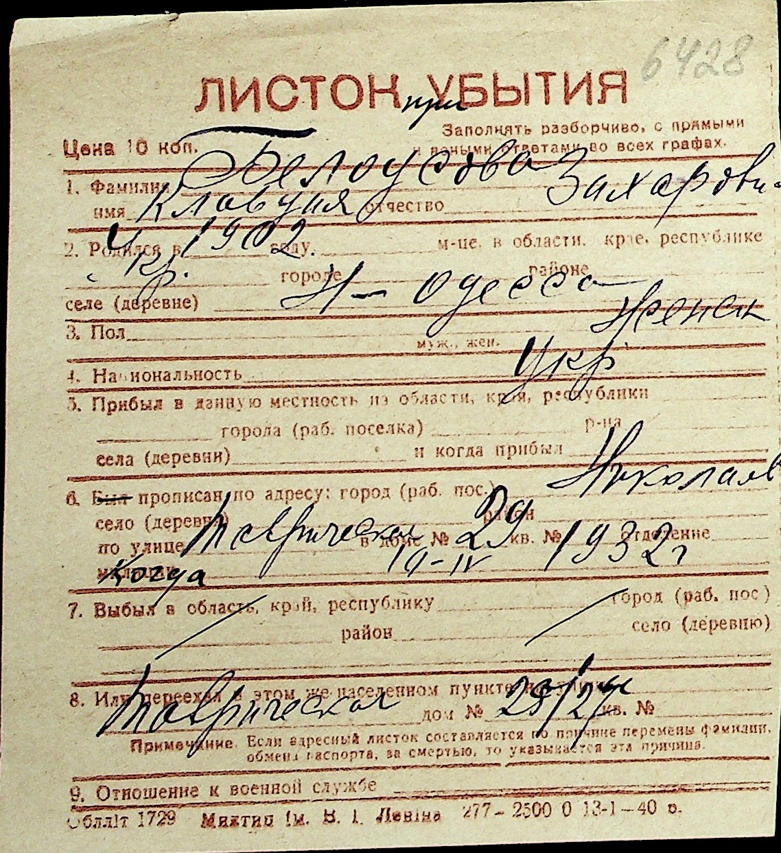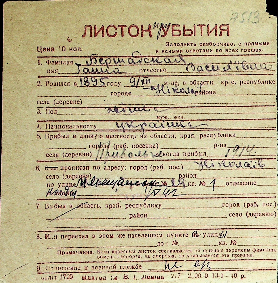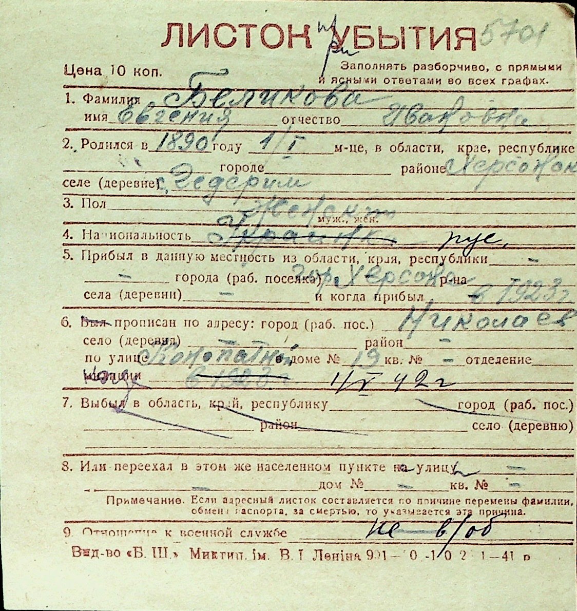 ◦ ◦ Перелік карток на осіб, які мешкали у м. Миколаїв у період окупації 1941–1944 років