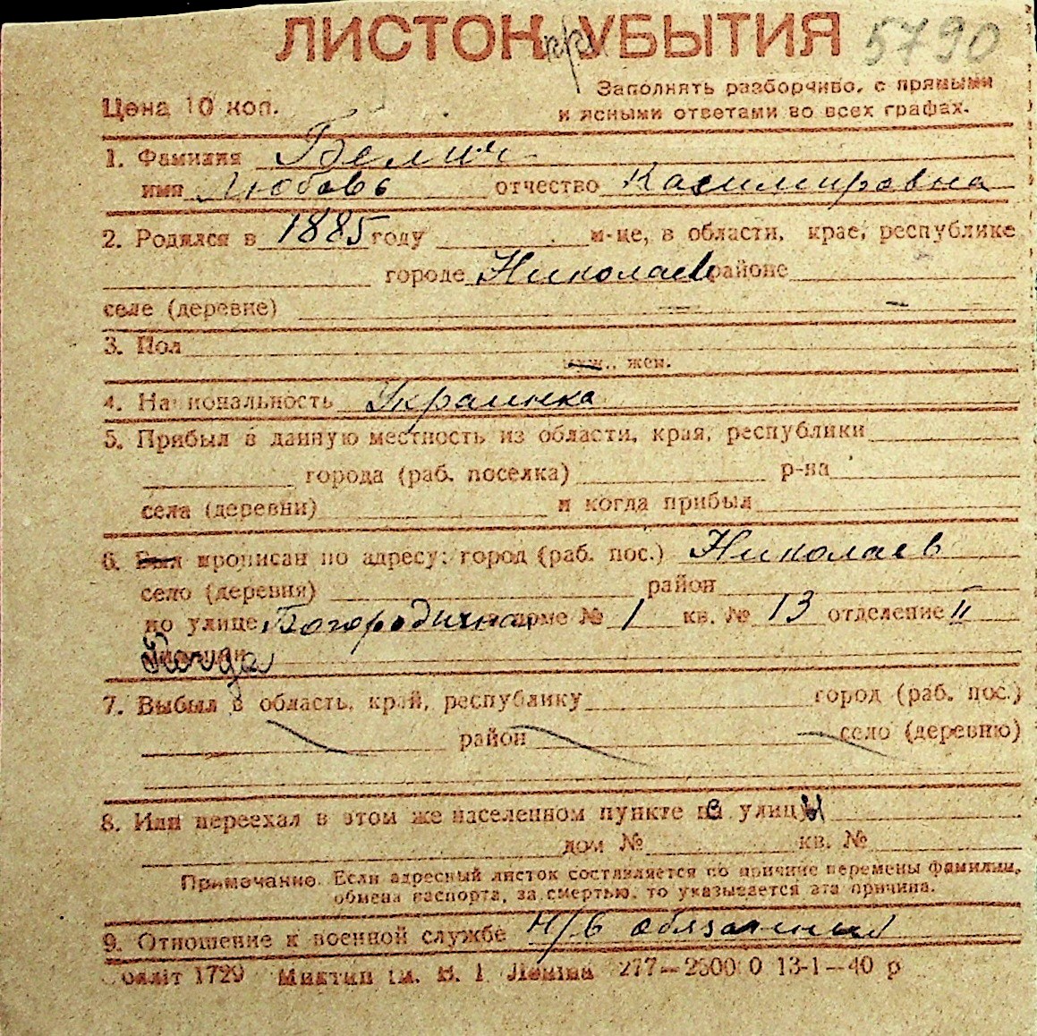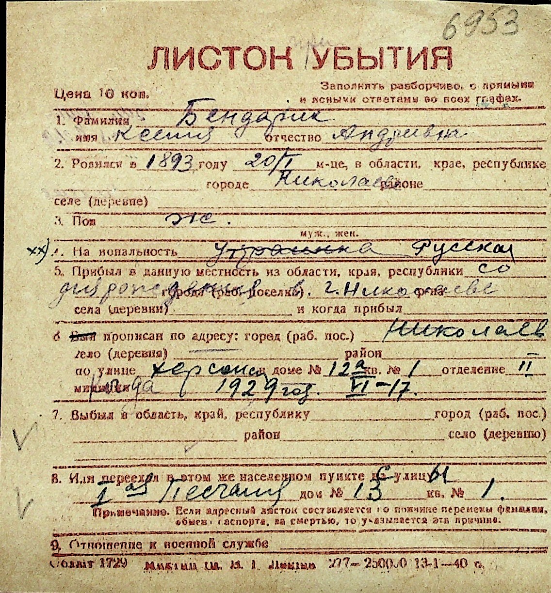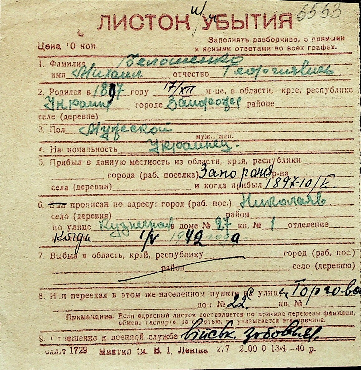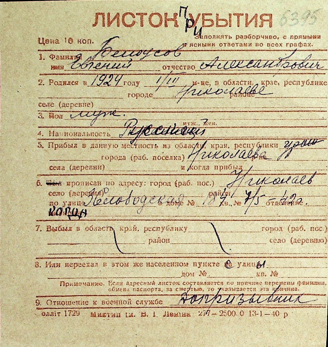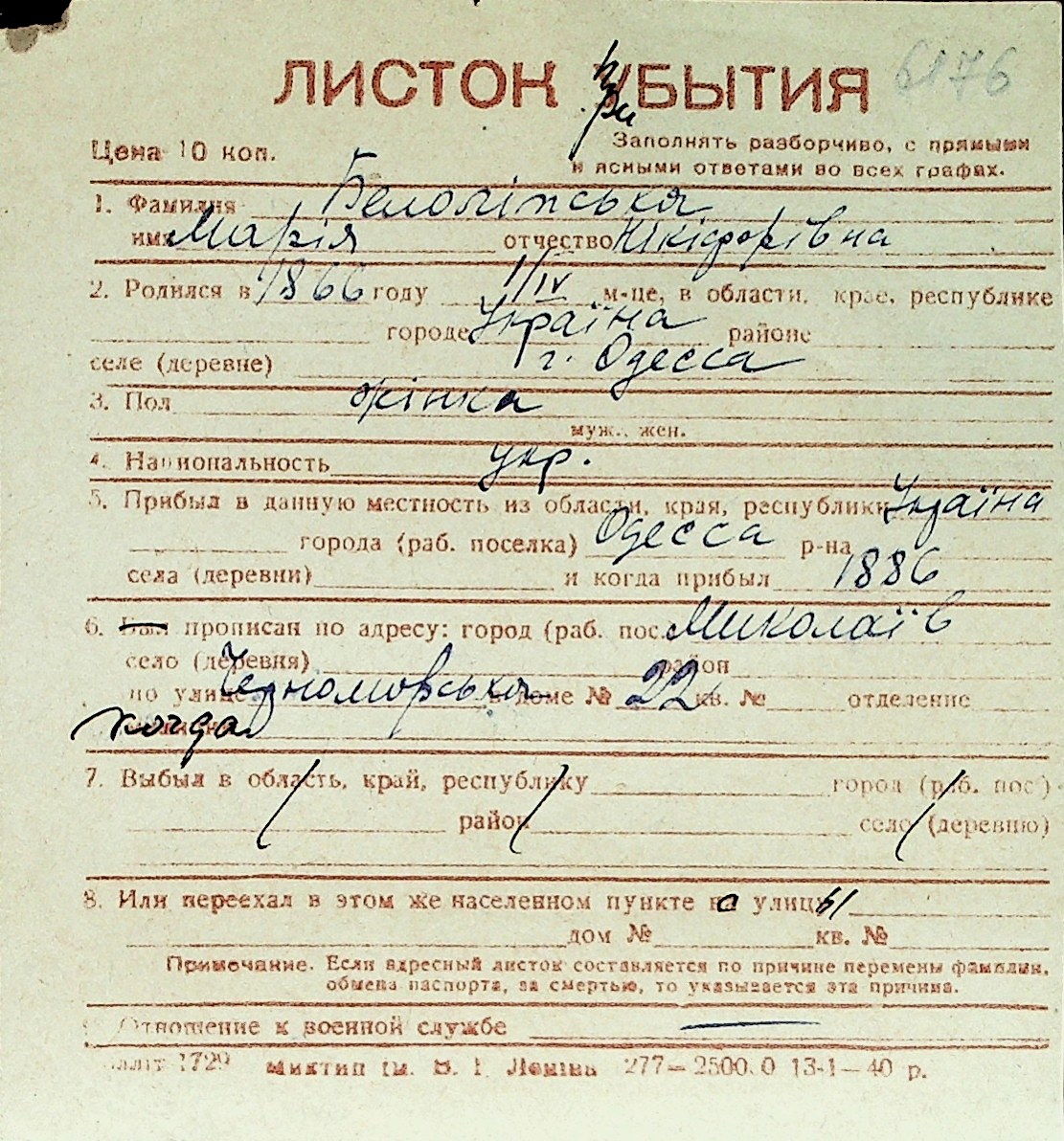 ◦ ◦ Перелік карток на осіб, які мешкали у м. Миколаїв у період окупації 1941–1944 років