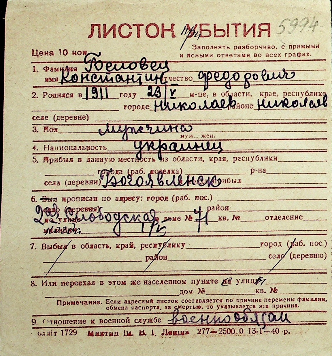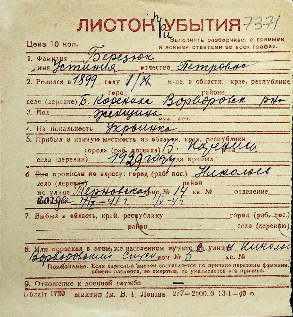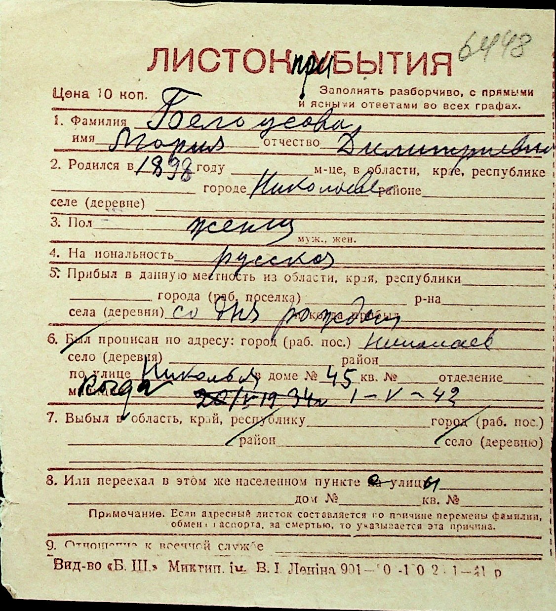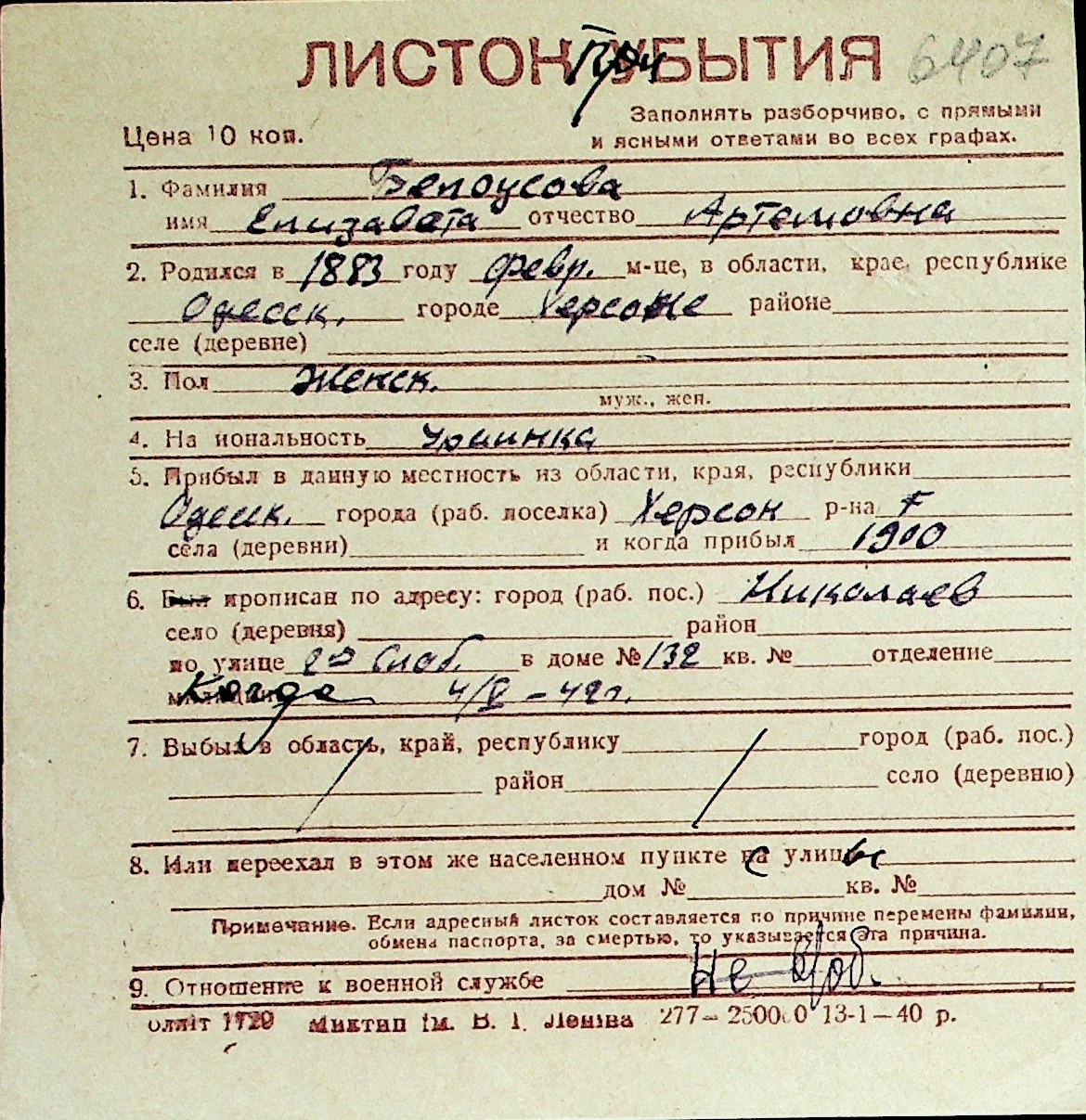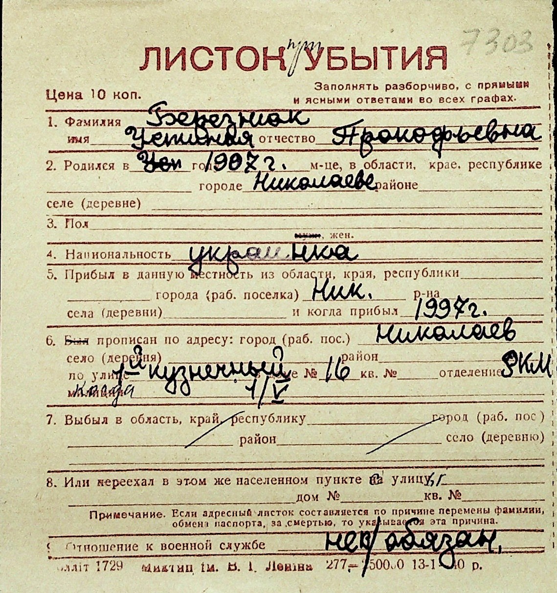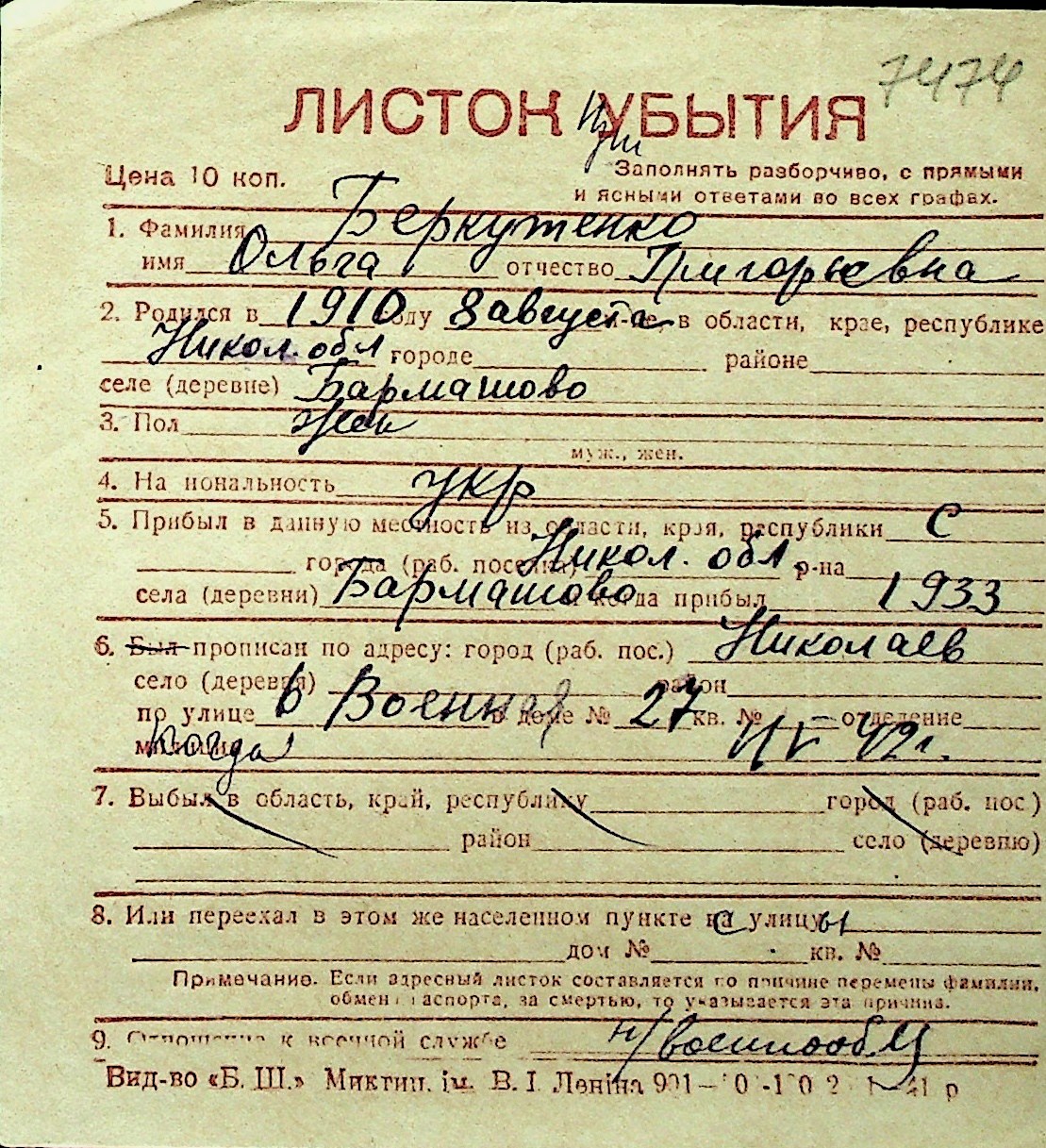 ◦ ◦ Перелік карток на осіб, які мешкали у м. Миколаїв у період окупації 1941–1944 років