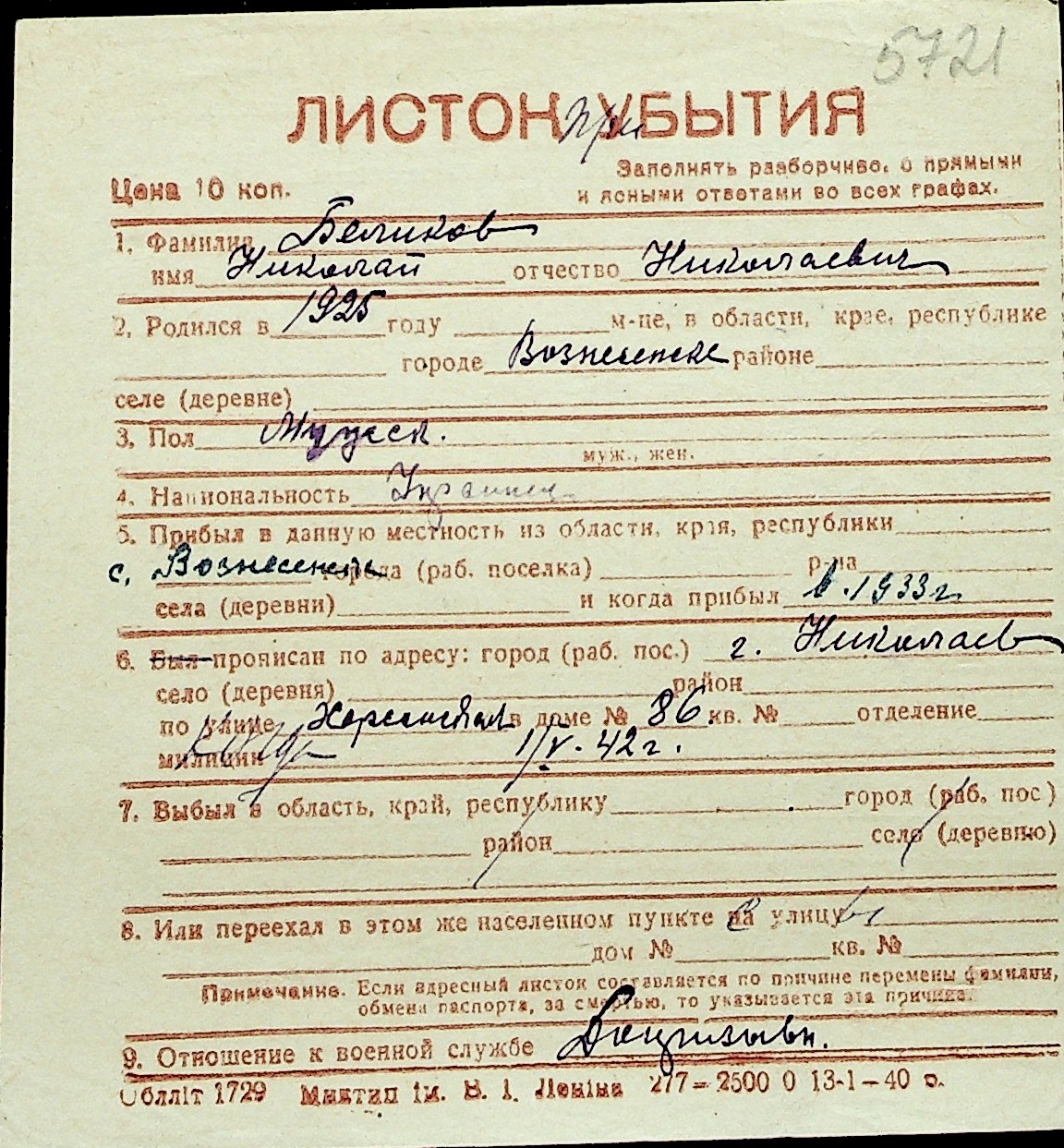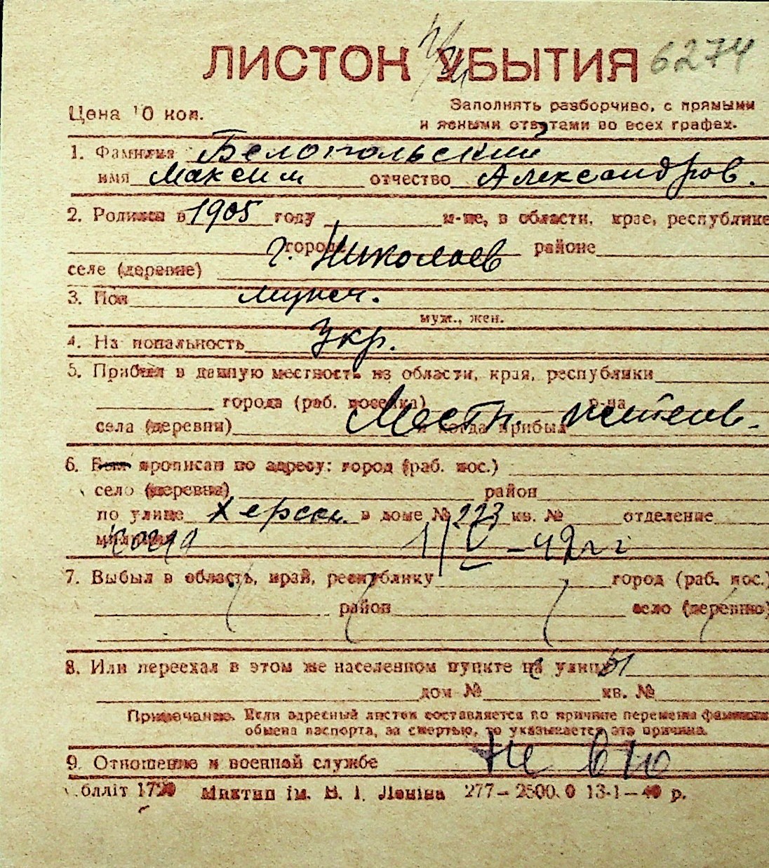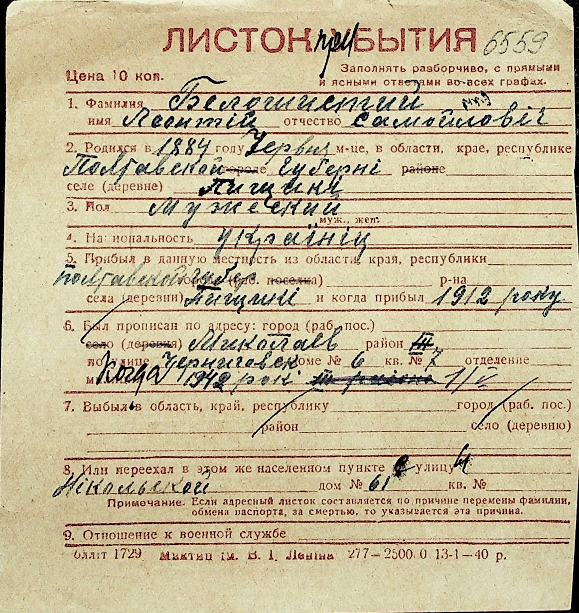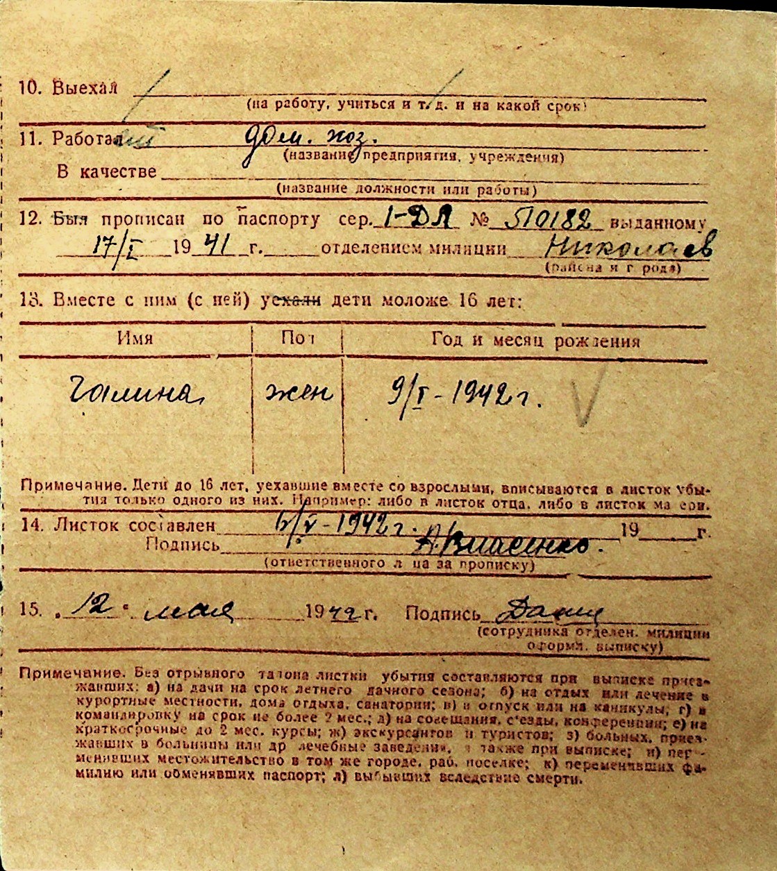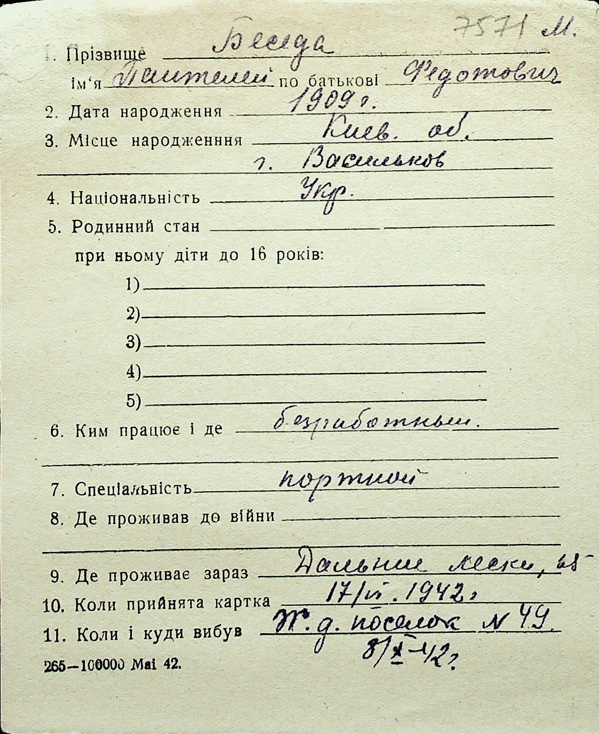 ◦ ◦ Перелік карток на осіб, які мешкали у м. Миколаїв у період окупації 1941–1944 років