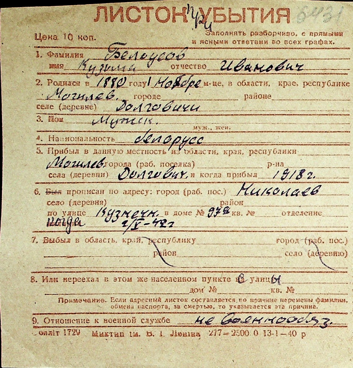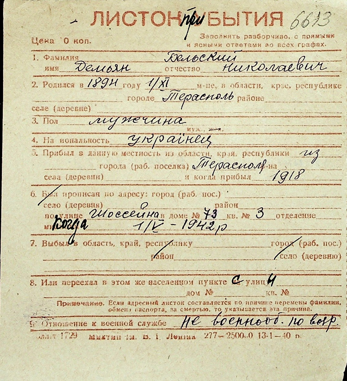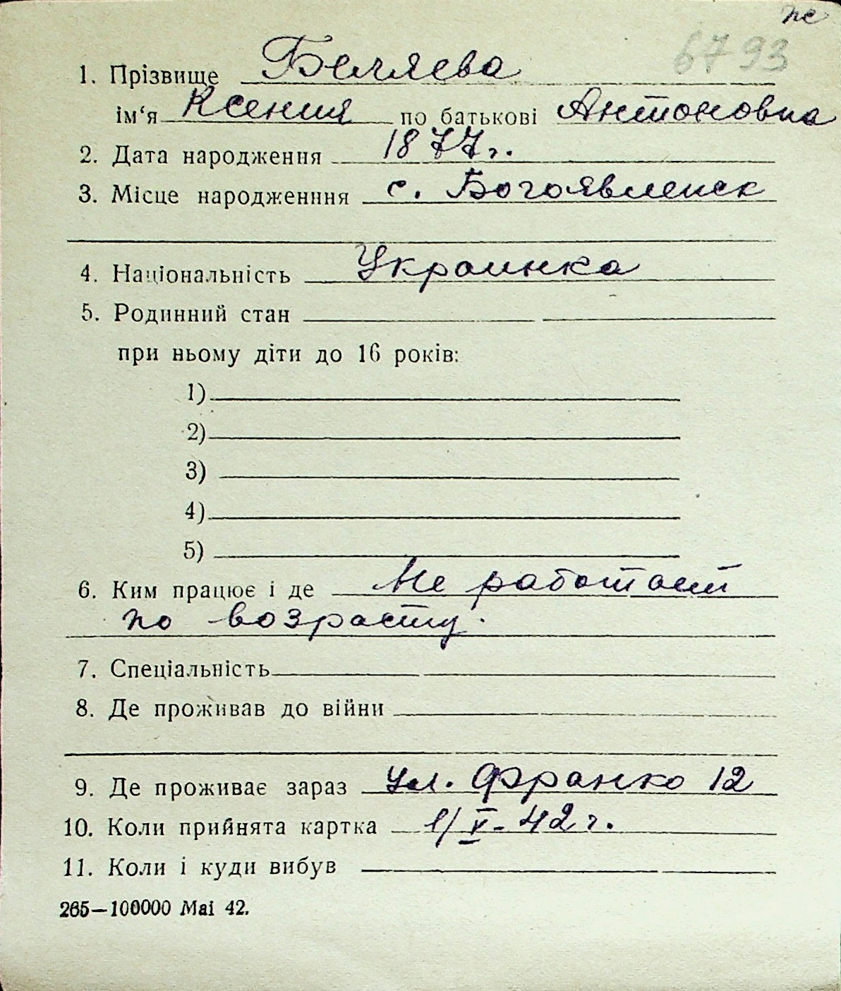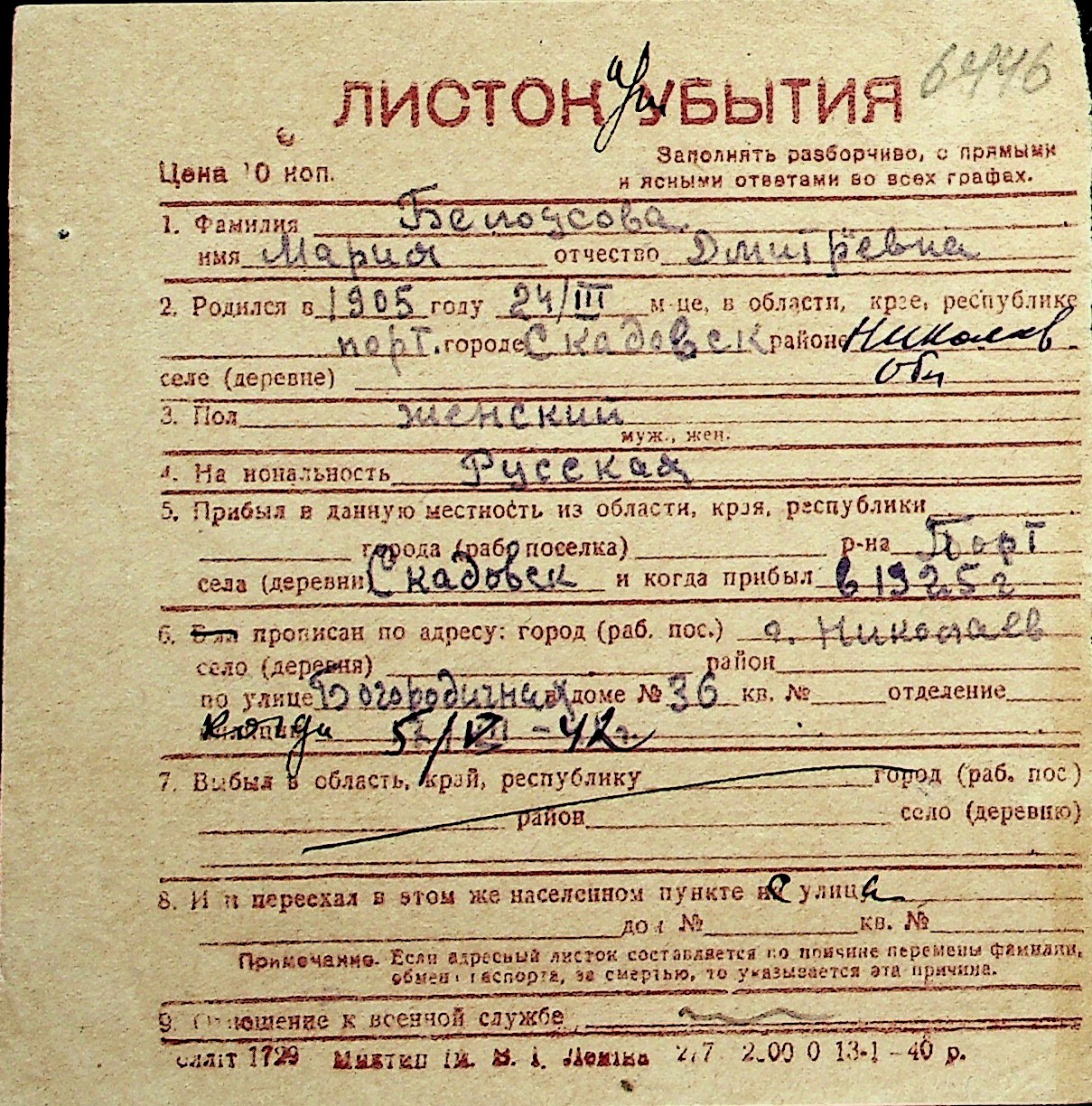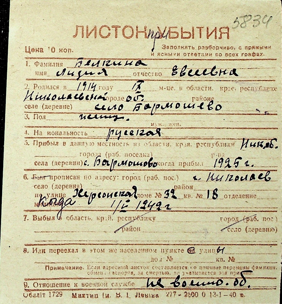 ◦ ◦ Перелік карток на осіб, які мешкали у м. Миколаїв у період окупації 1941–1944 років
