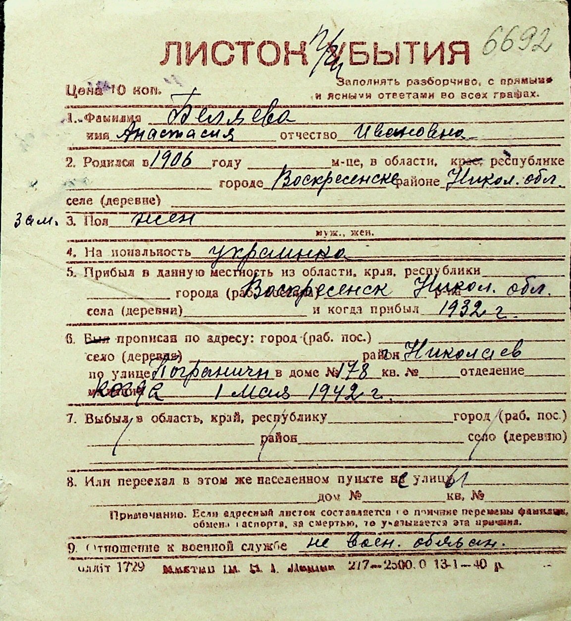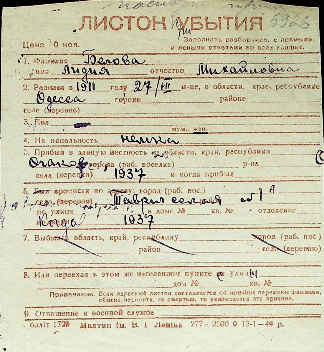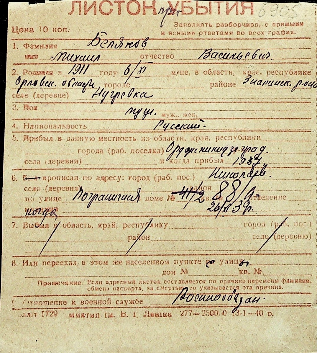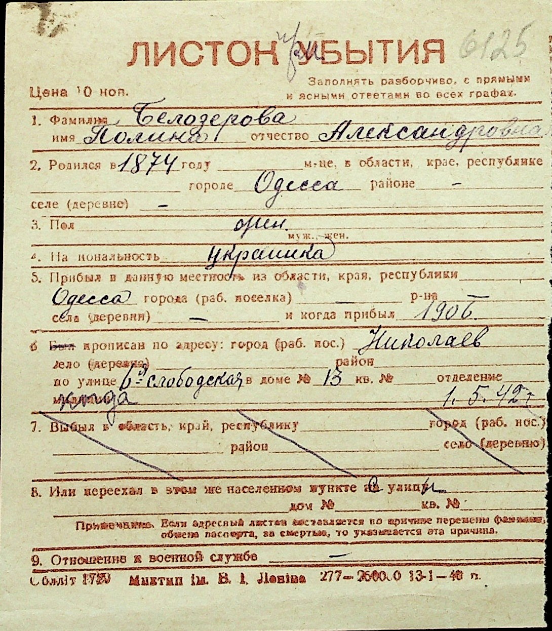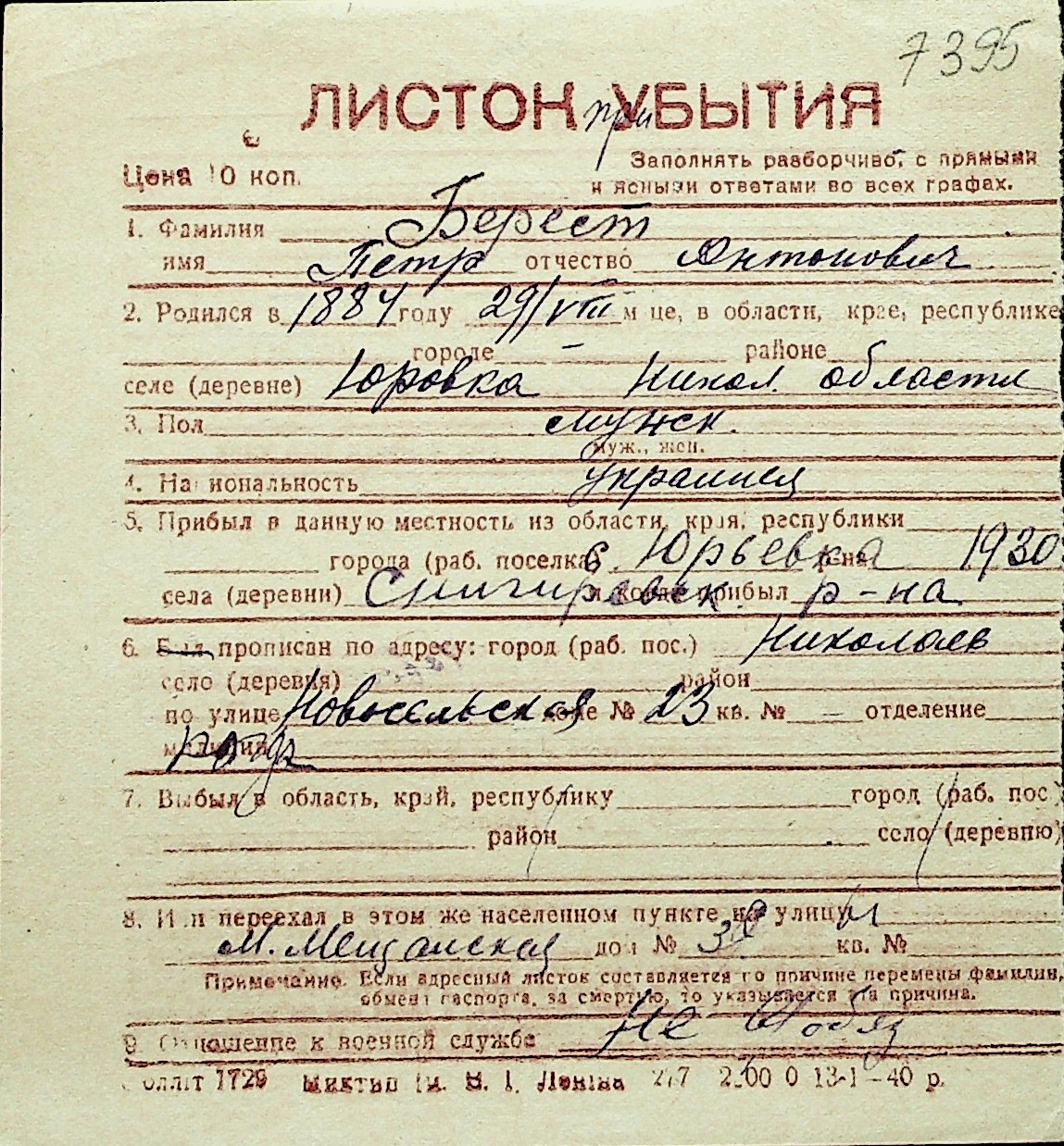 ◦ ◦ Перелік карток на осіб, які мешкали у м. Миколаїв у період окупації 1941–1944 років