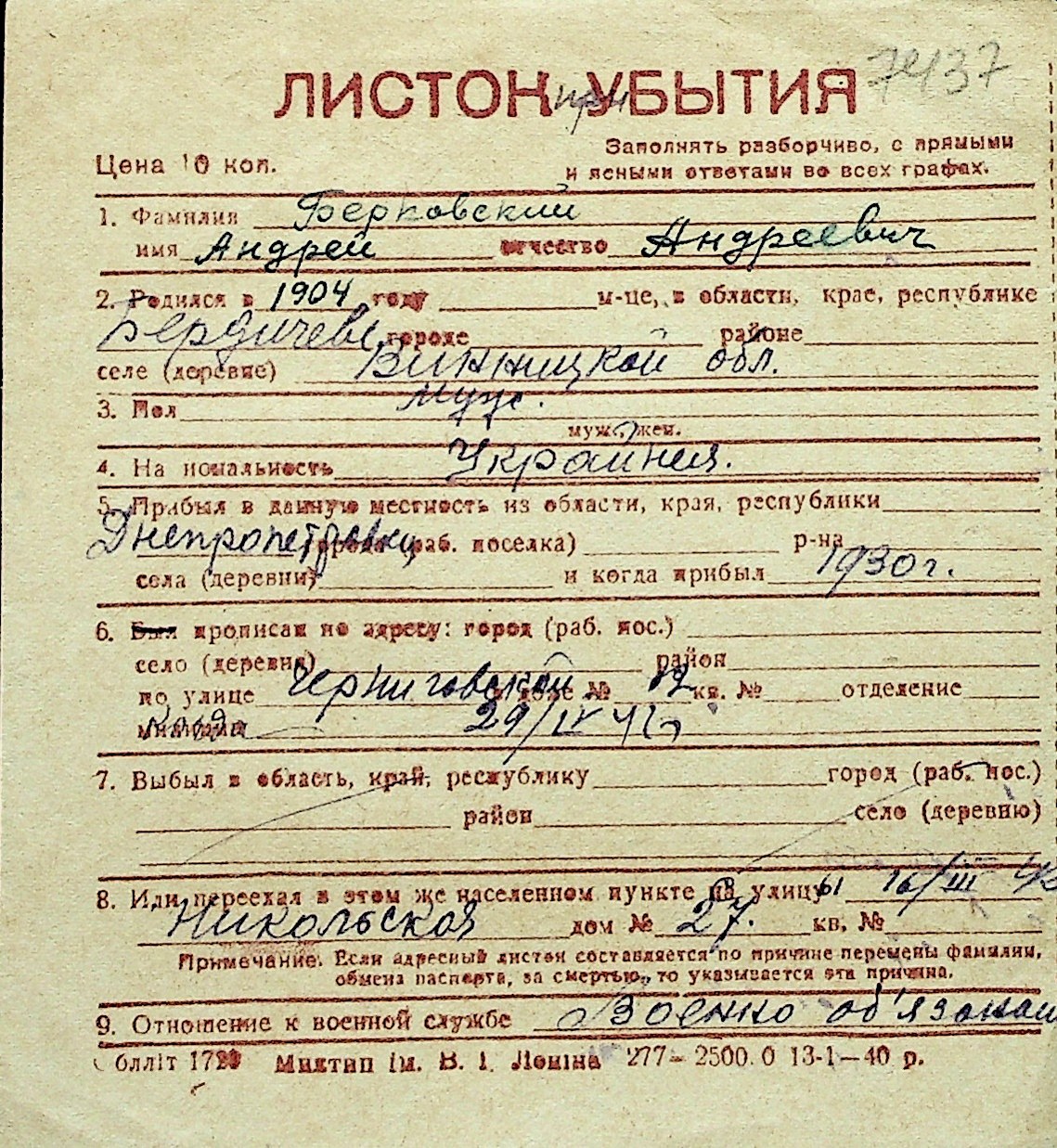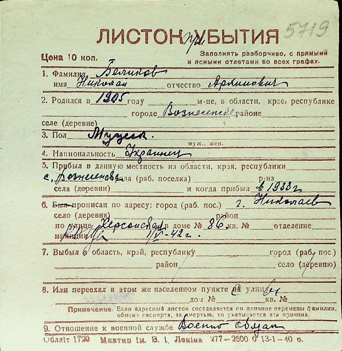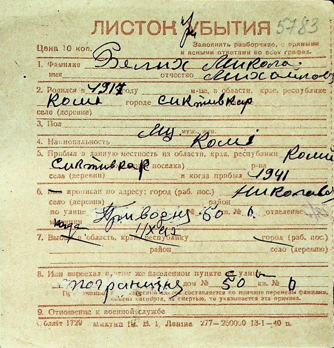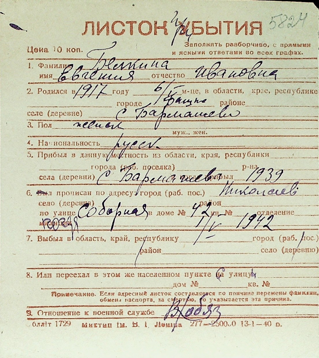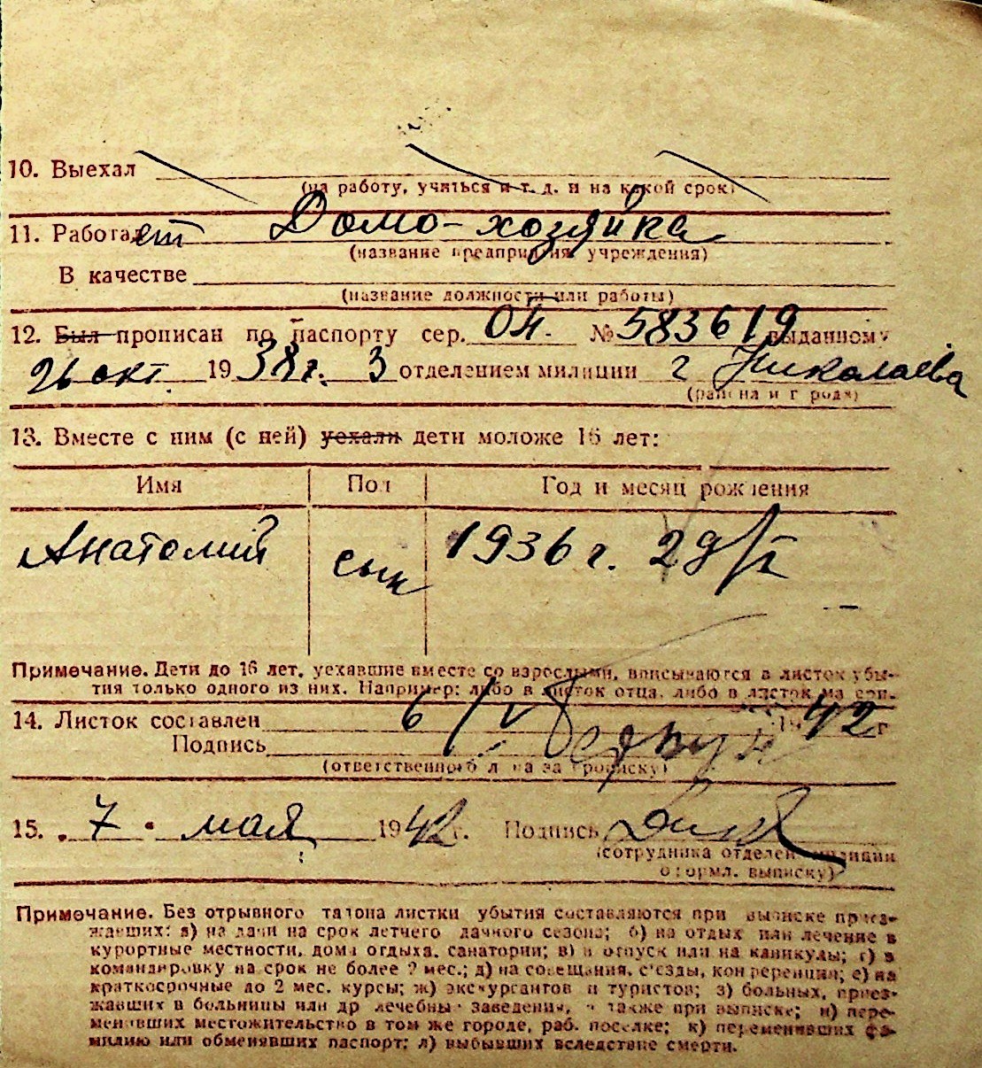 ◦ ◦ Перелік карток на осіб, які мешкали у м. Миколаїв у період окупації 1941–1944 років