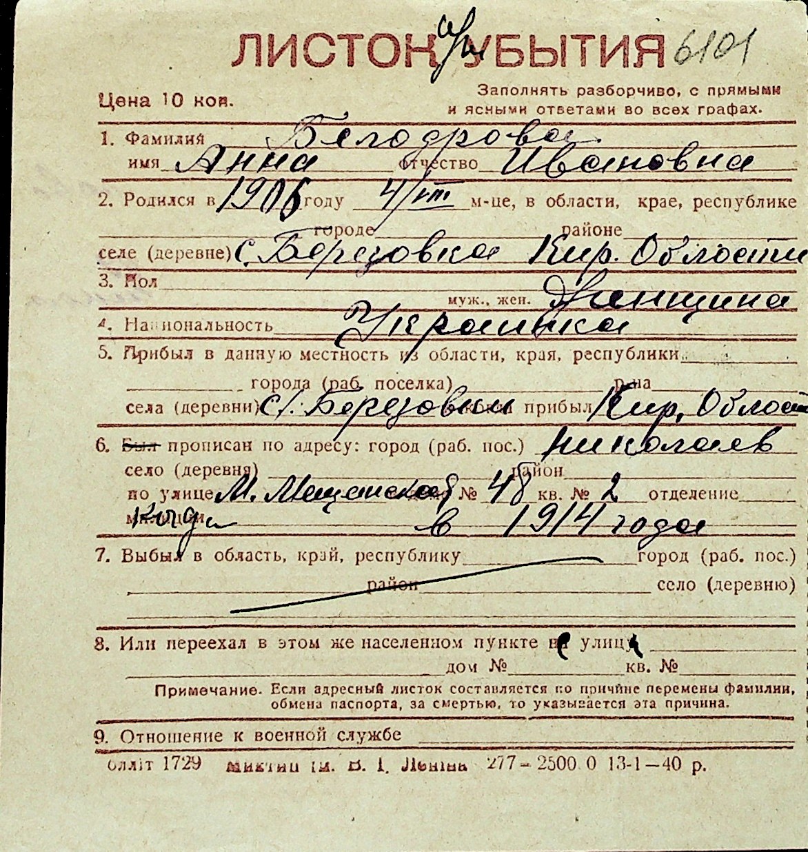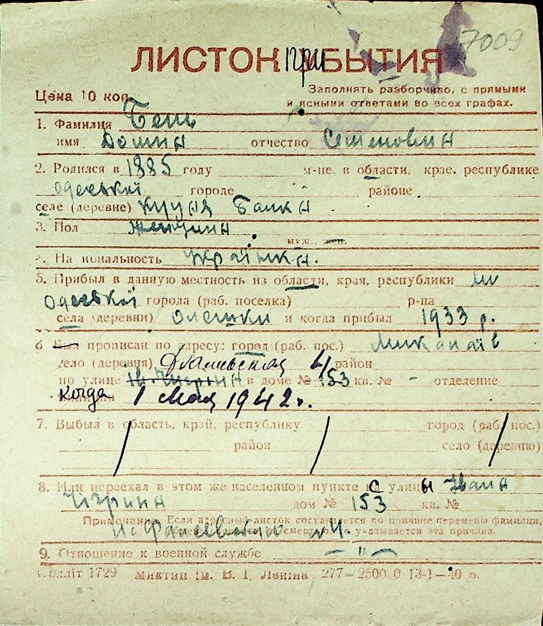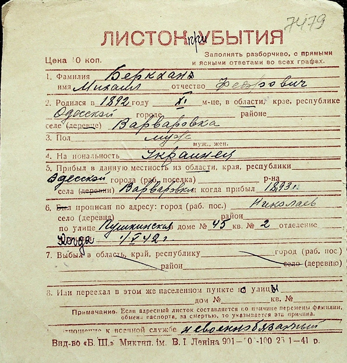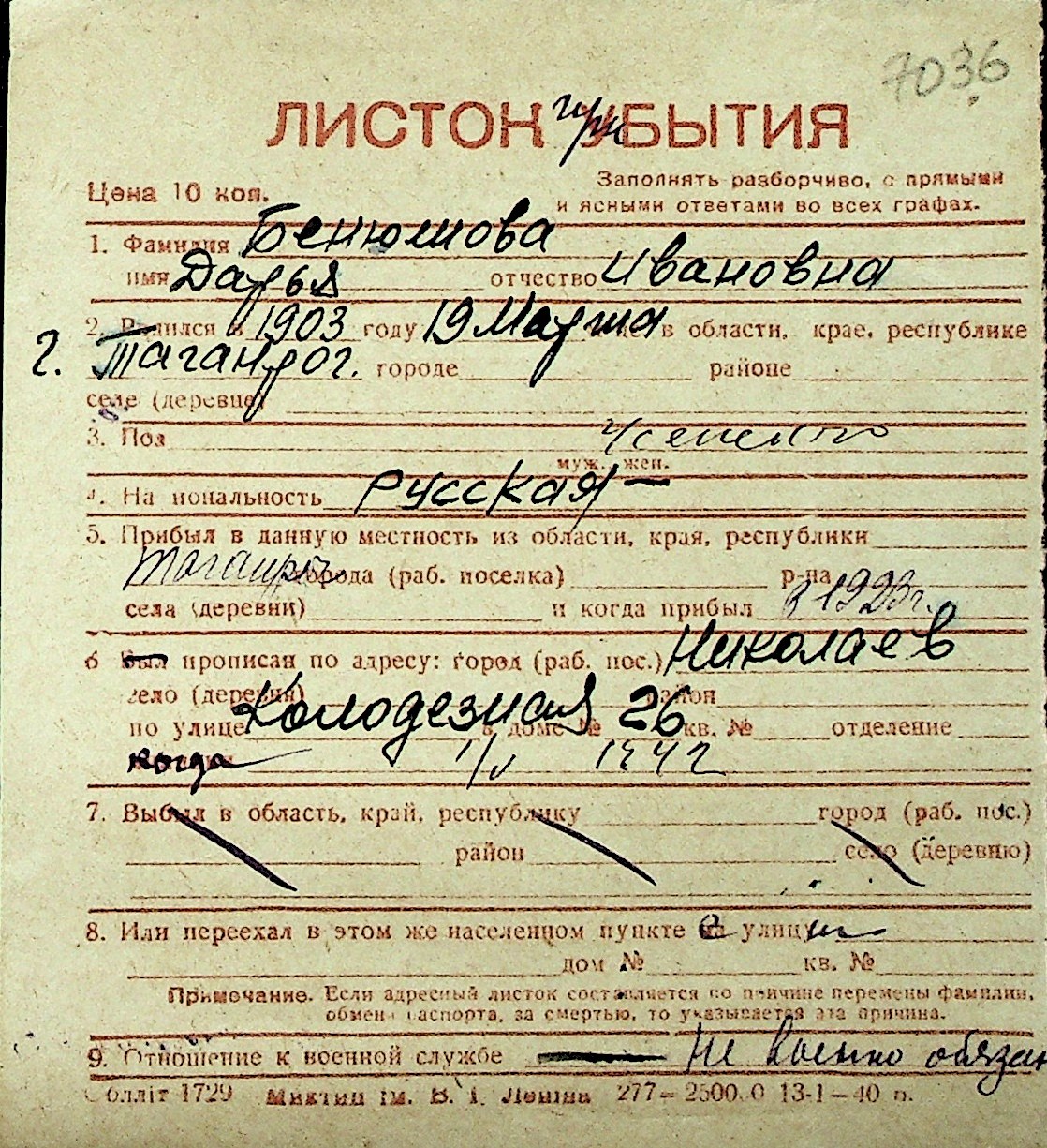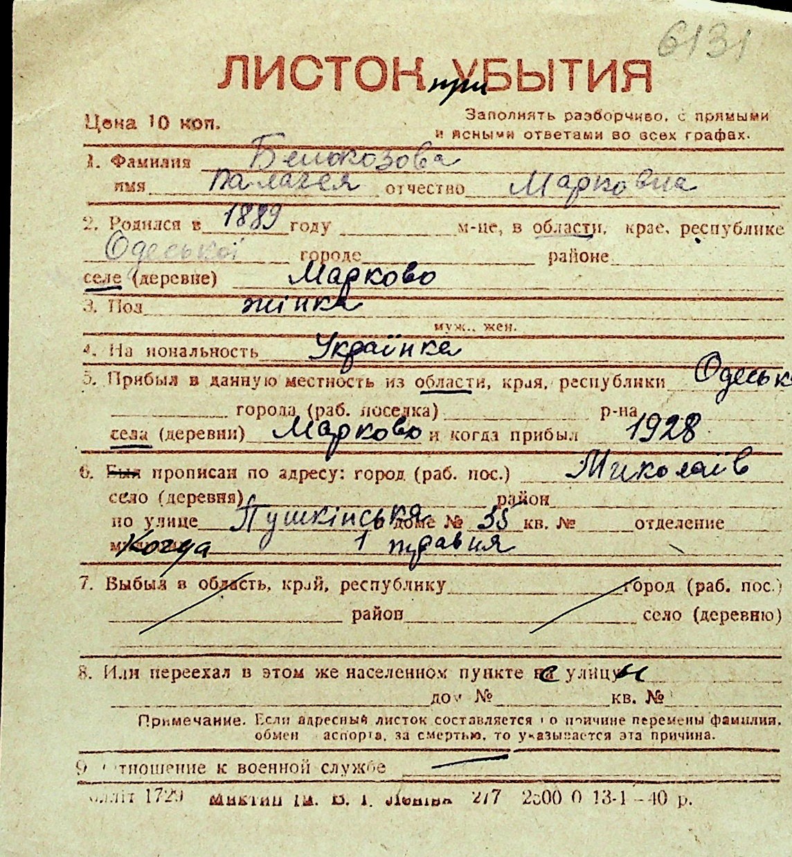 ◦ ◦ Перелік карток на осіб, які мешкали у м. Миколаїв у період окупації 1941–1944 років