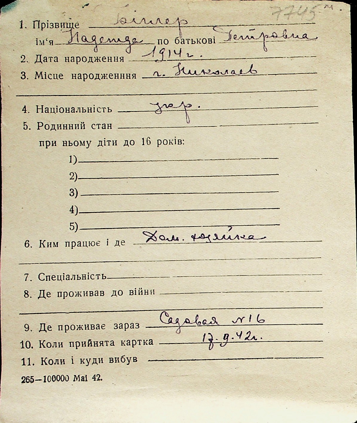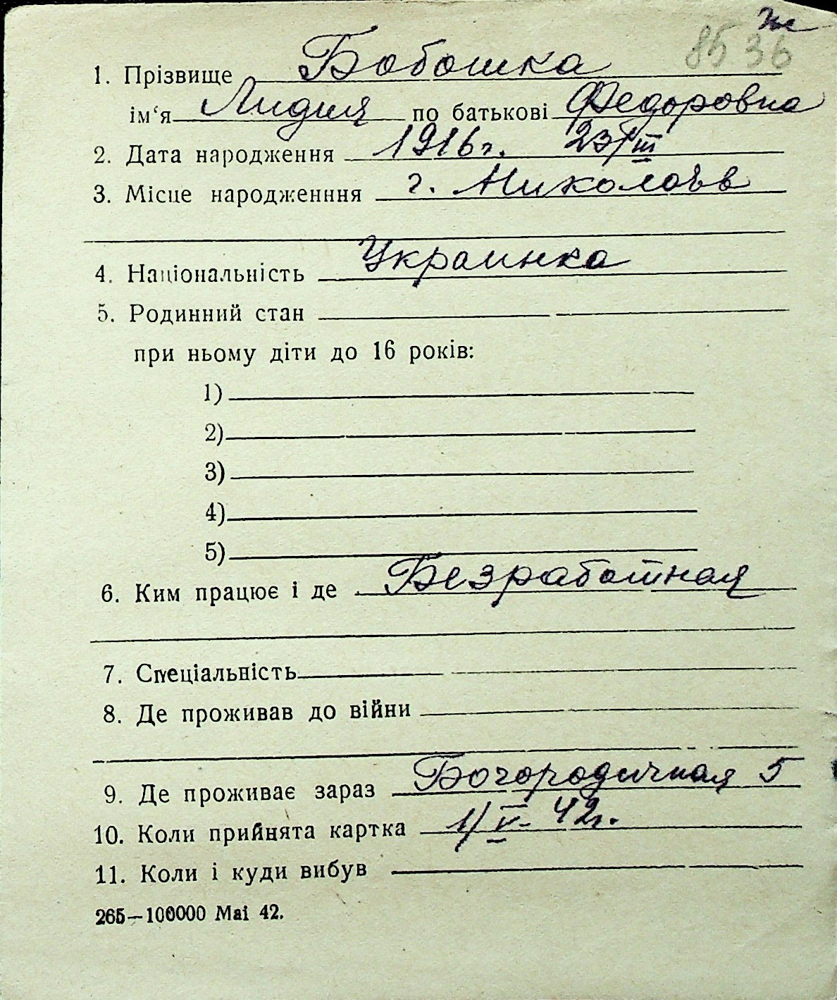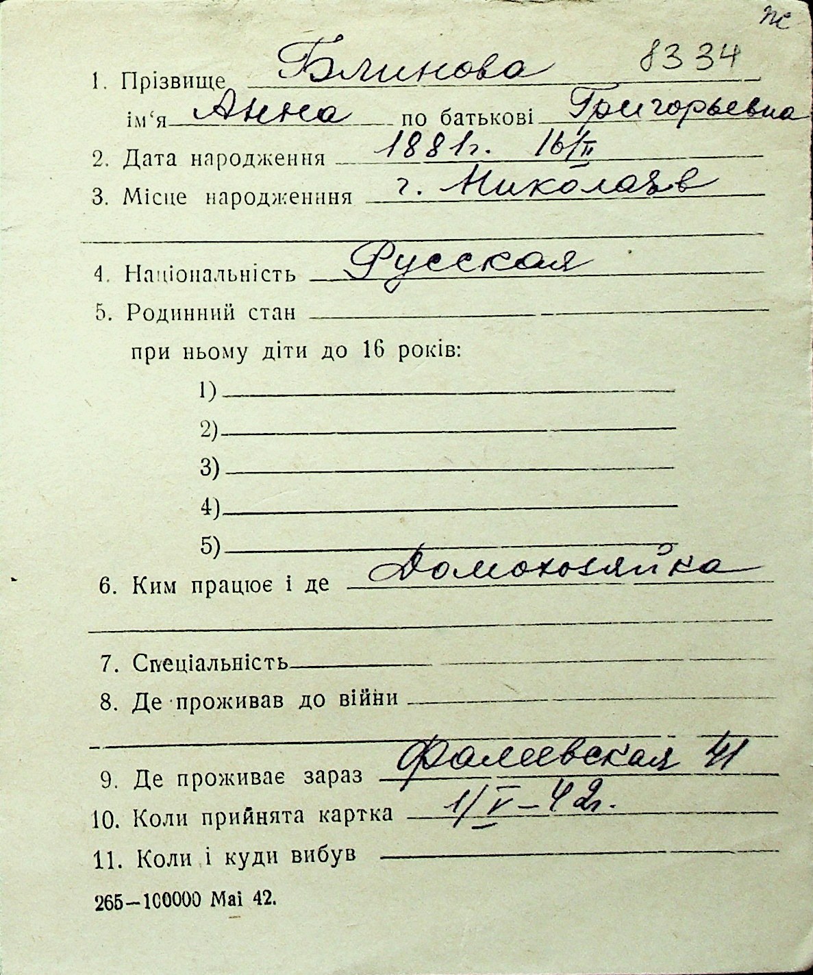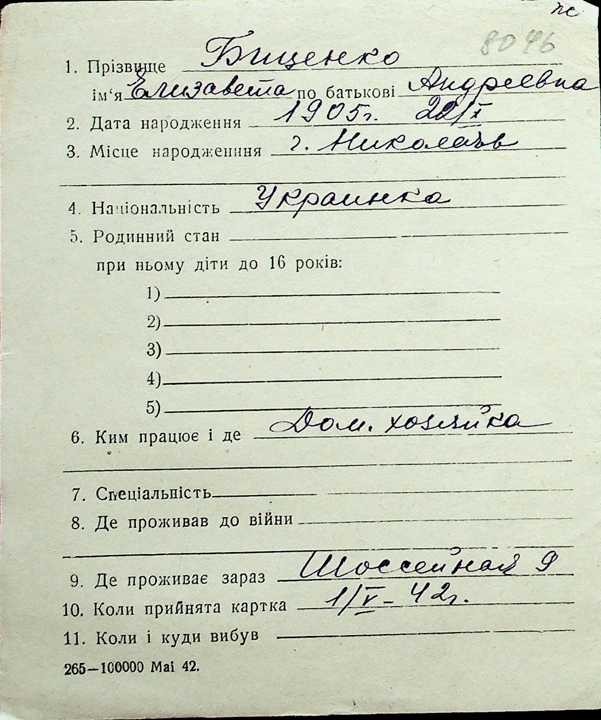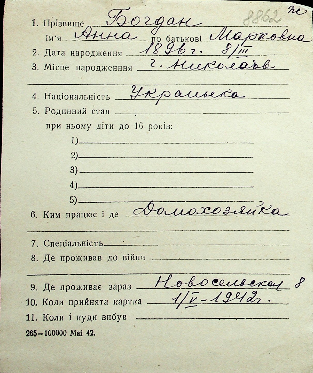 ◦ ◦ Перелік карток на осіб, які мешкали у м. Миколаїв у період окупації 1941–1944 років