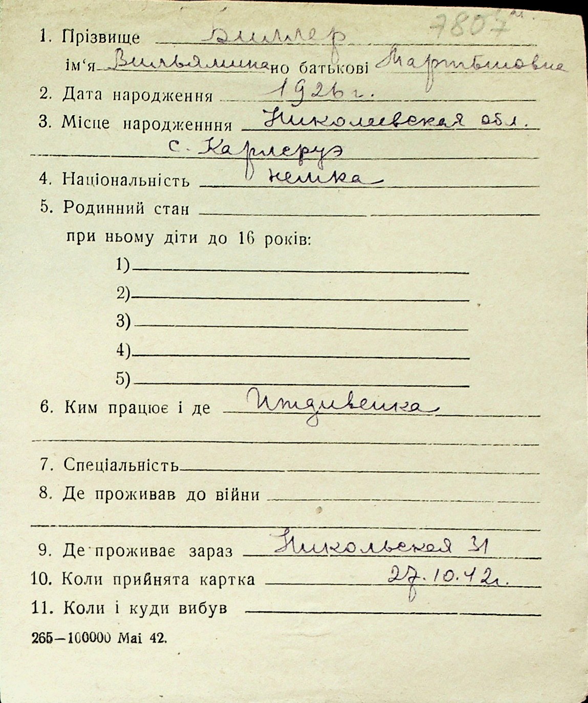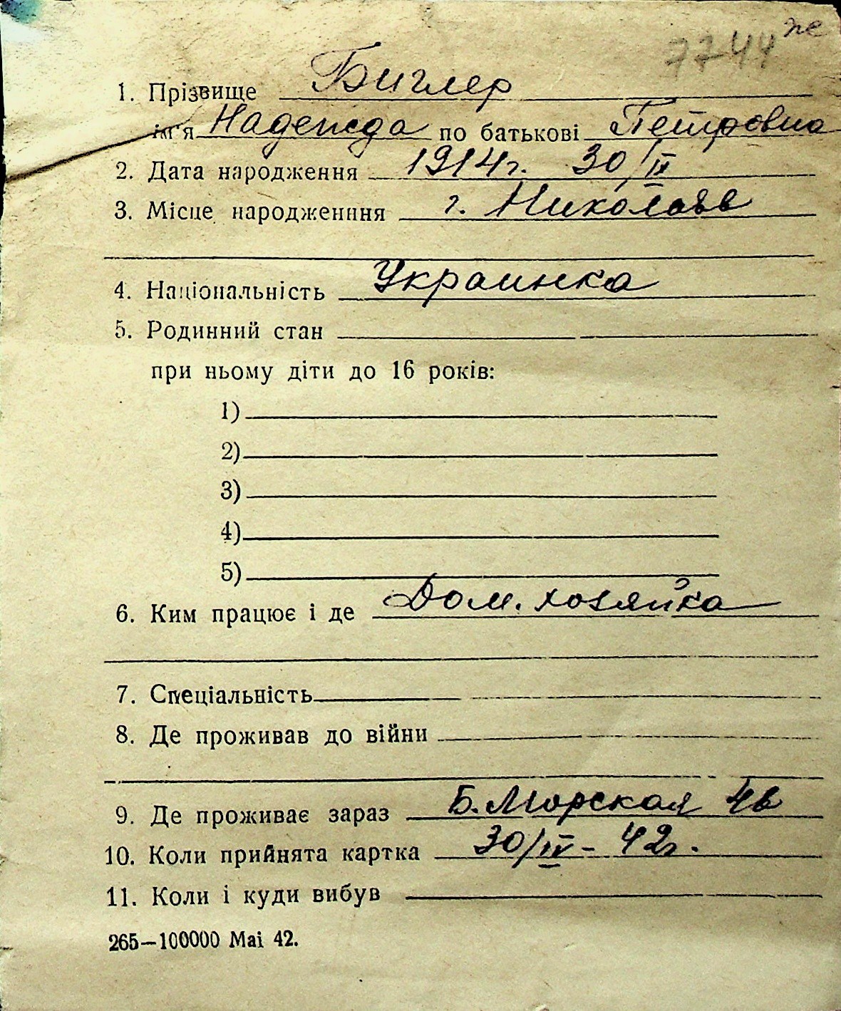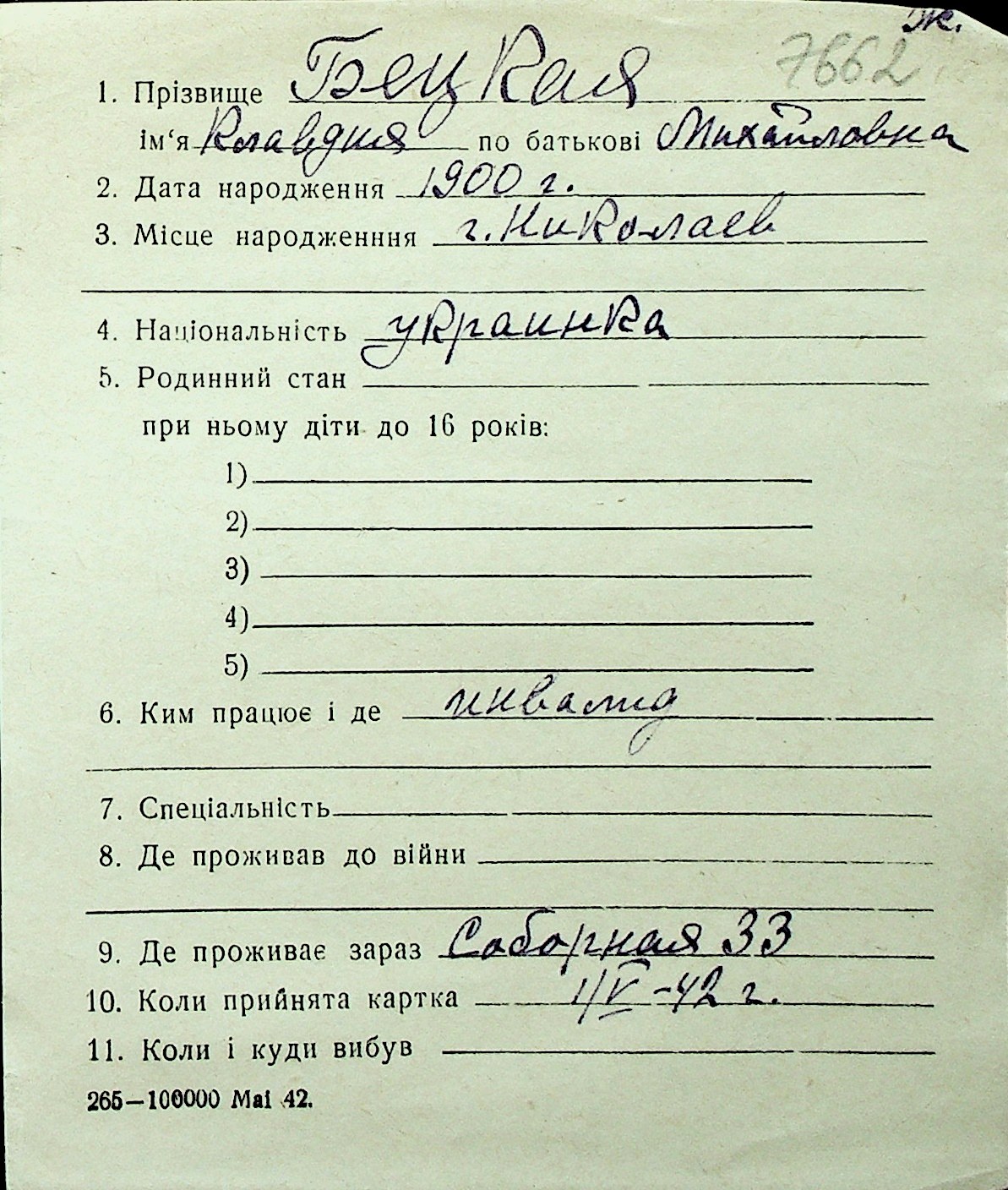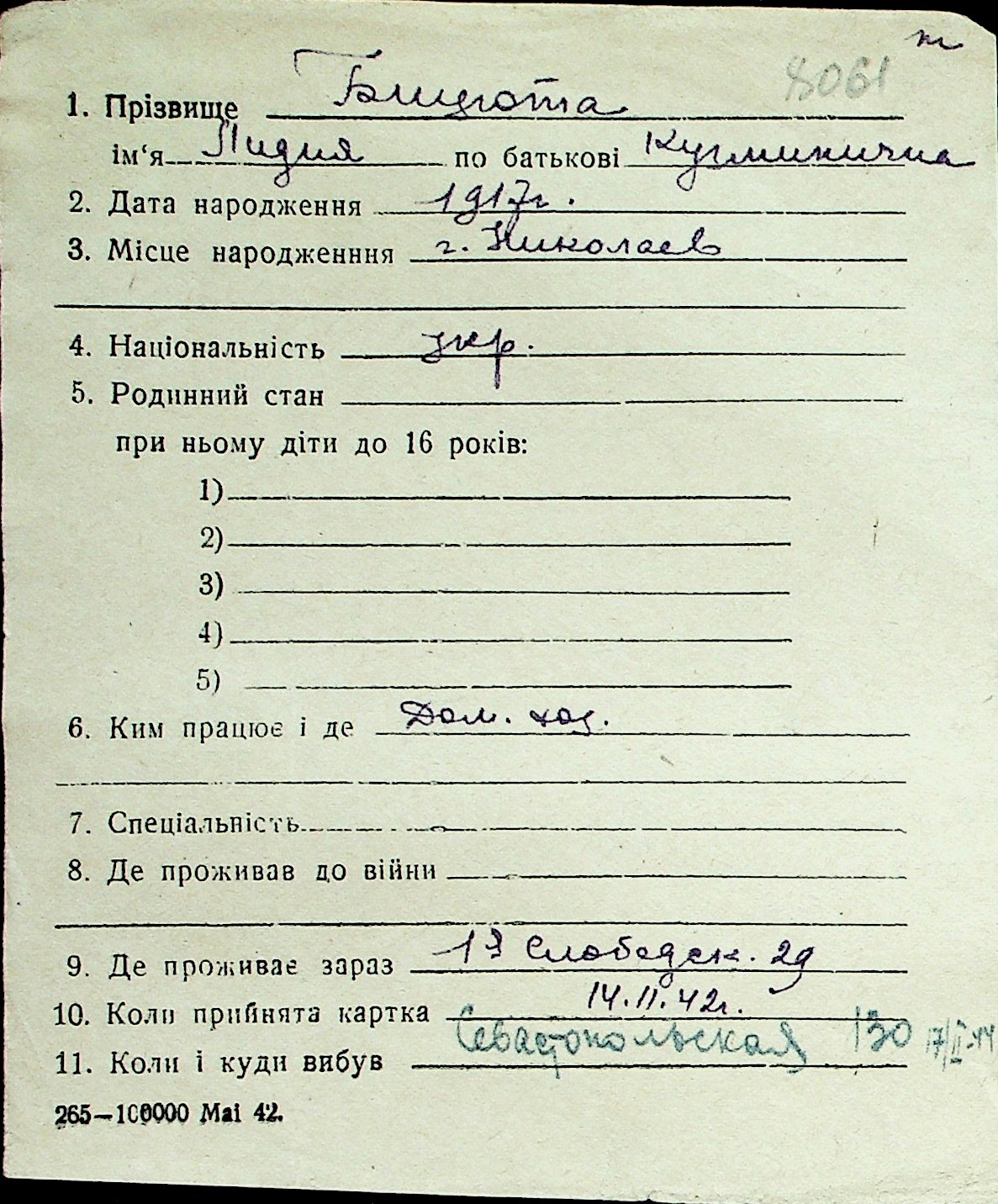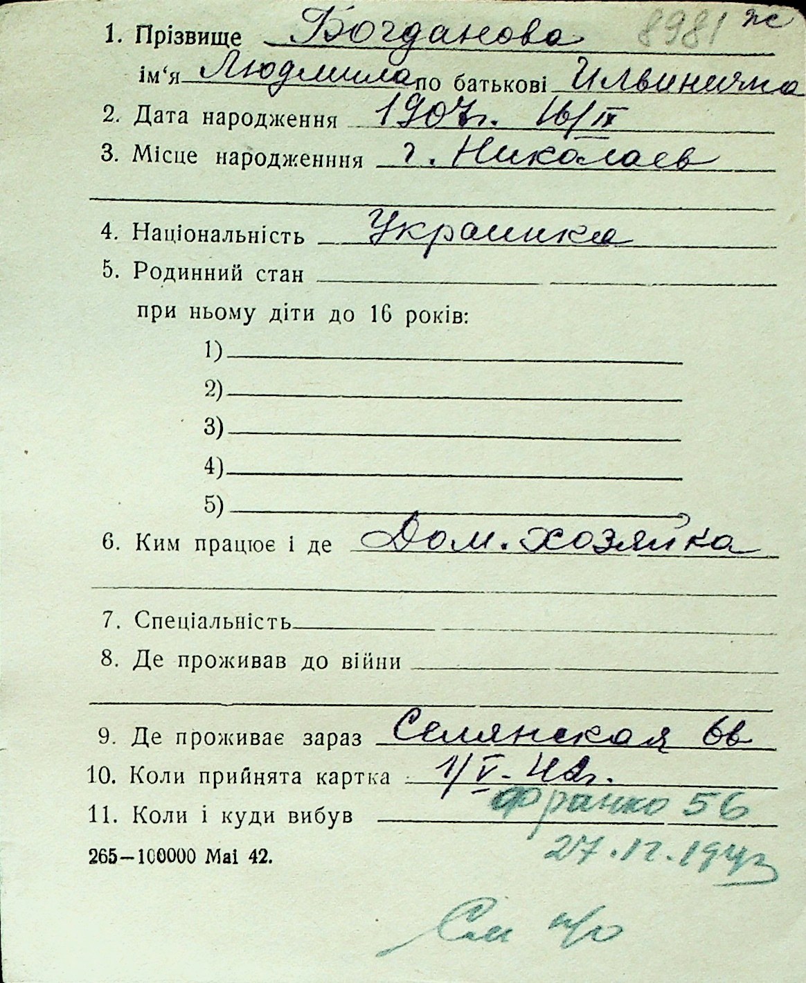 ◦ ◦ Перелік карток на осіб, які мешкали у м. Миколаїв у період окупації 1941–1944 років