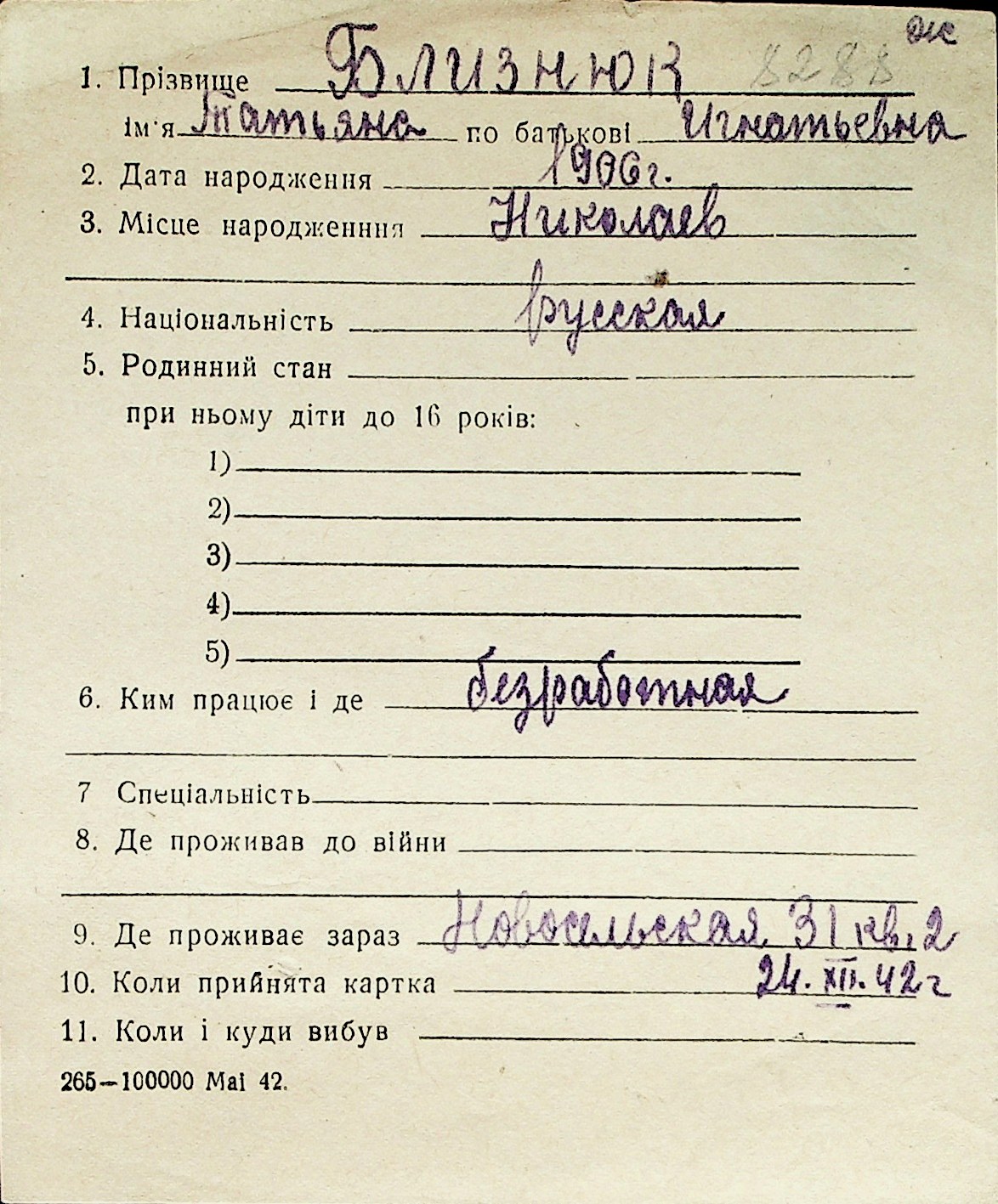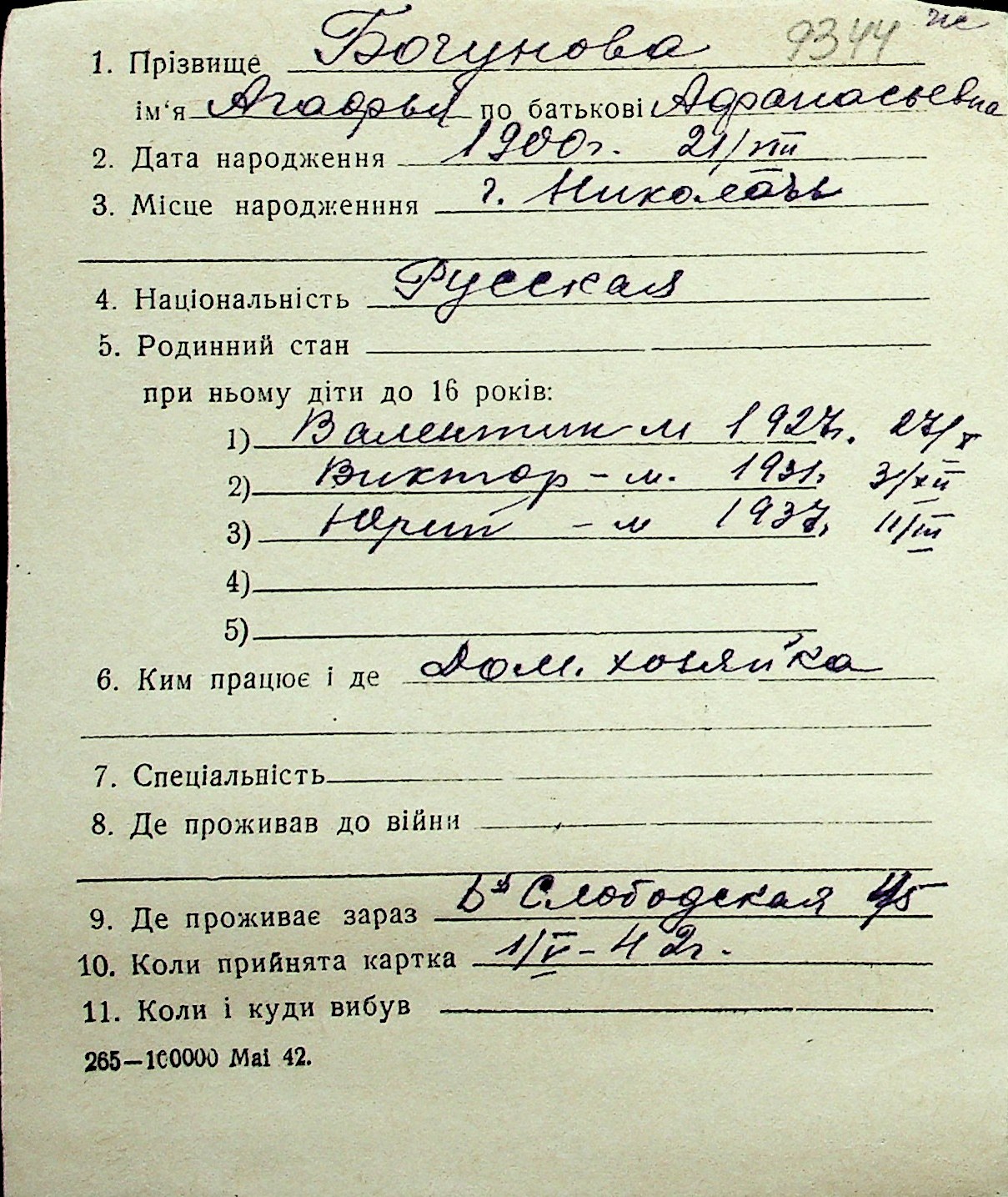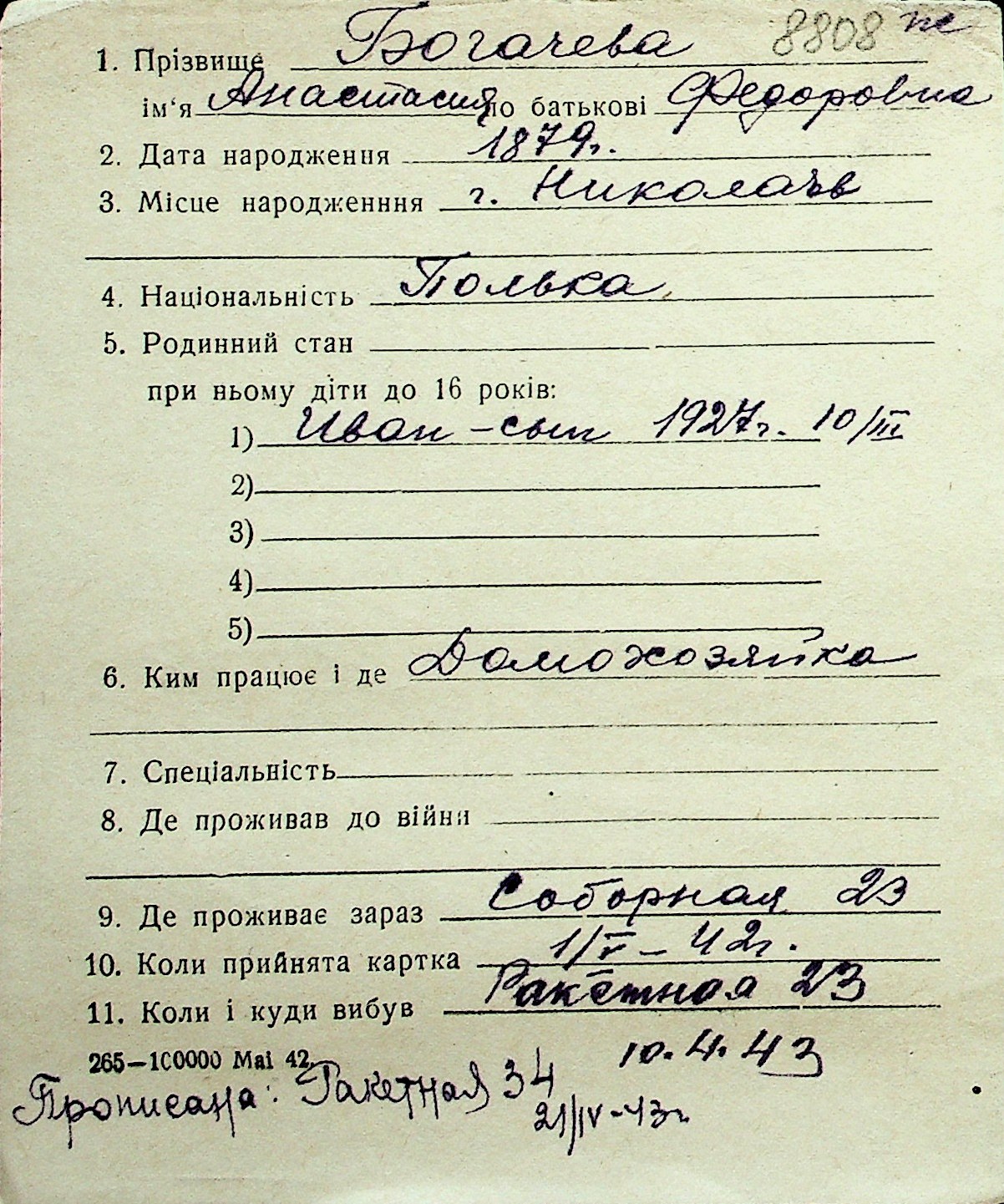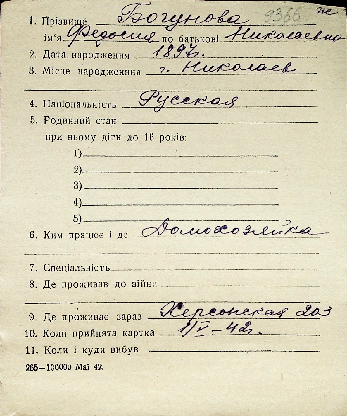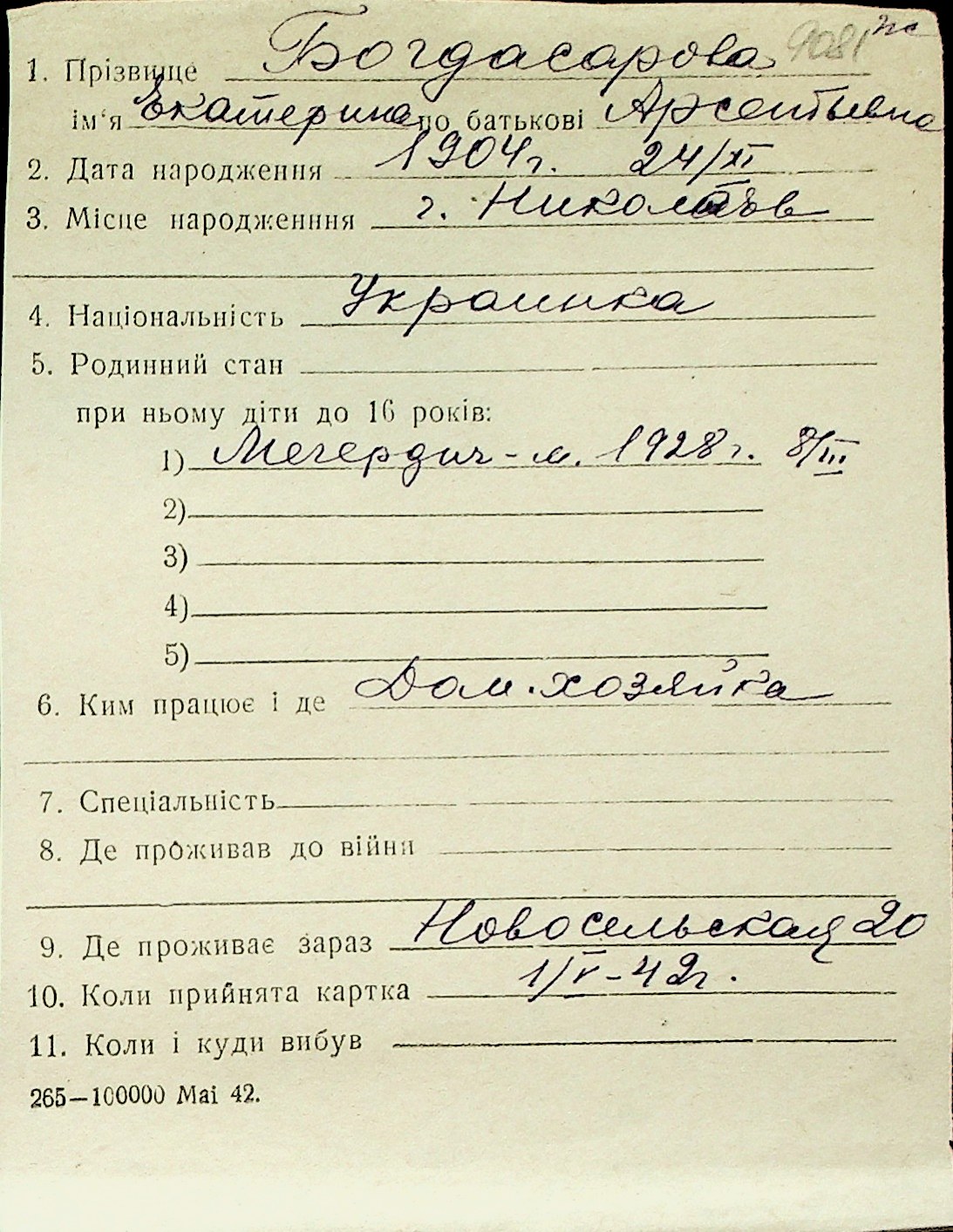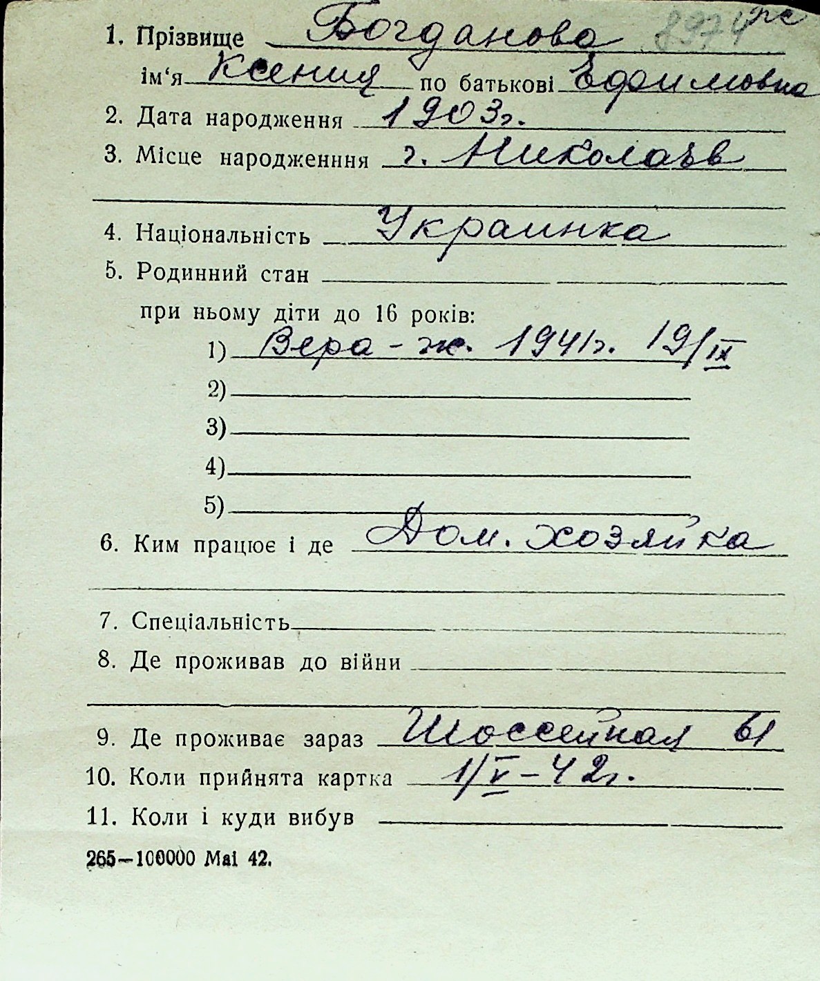 ◦ ◦ Перелік карток на осіб, які мешкали у м. Миколаїв у період окупації 1941–1944 років