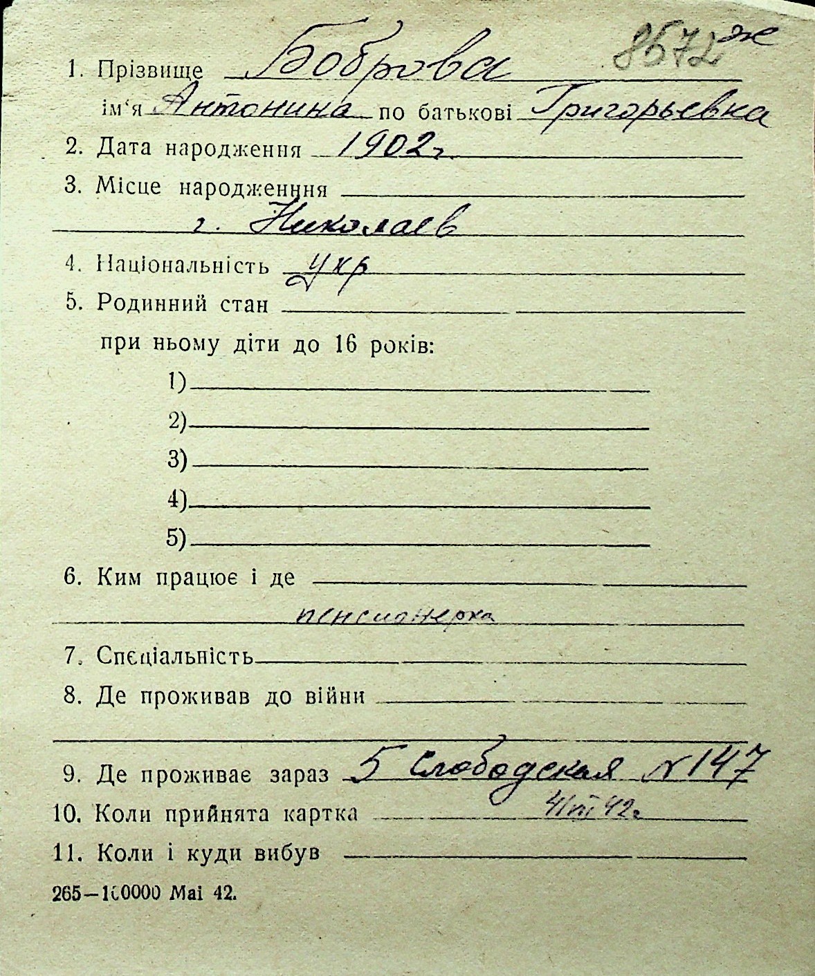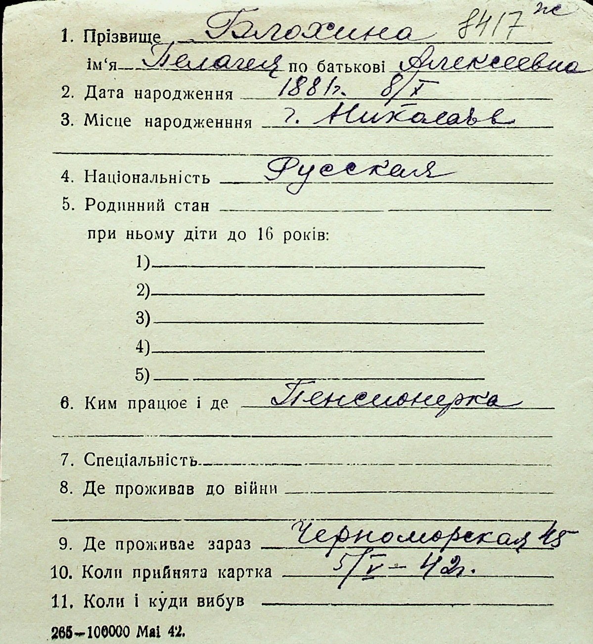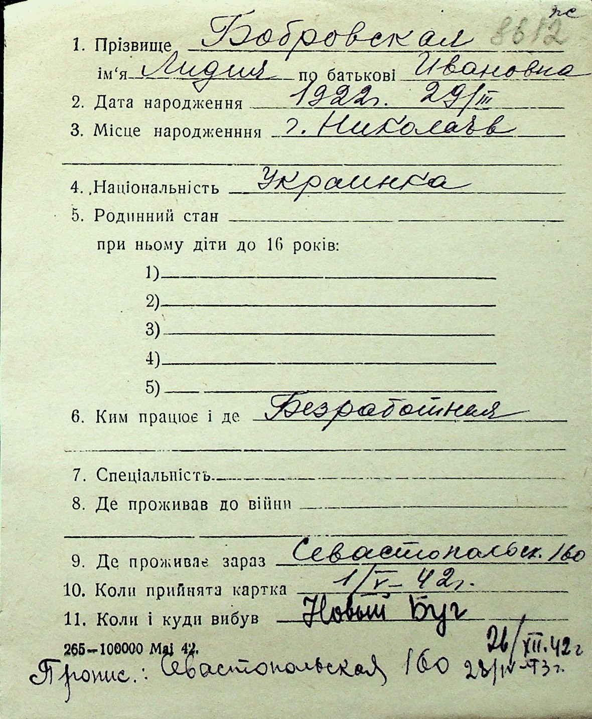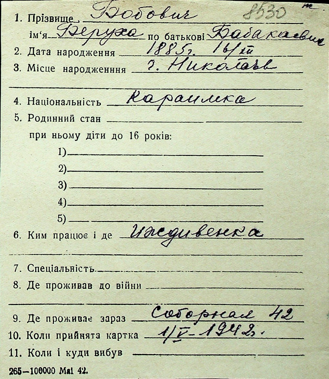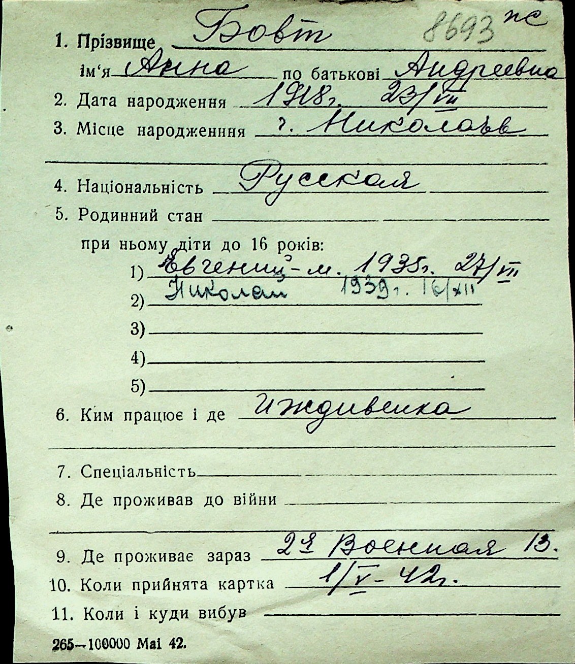 ◦ ◦ Перелік карток на осіб, які мешкали у м. Миколаїв у період окупації 1941–1944 років