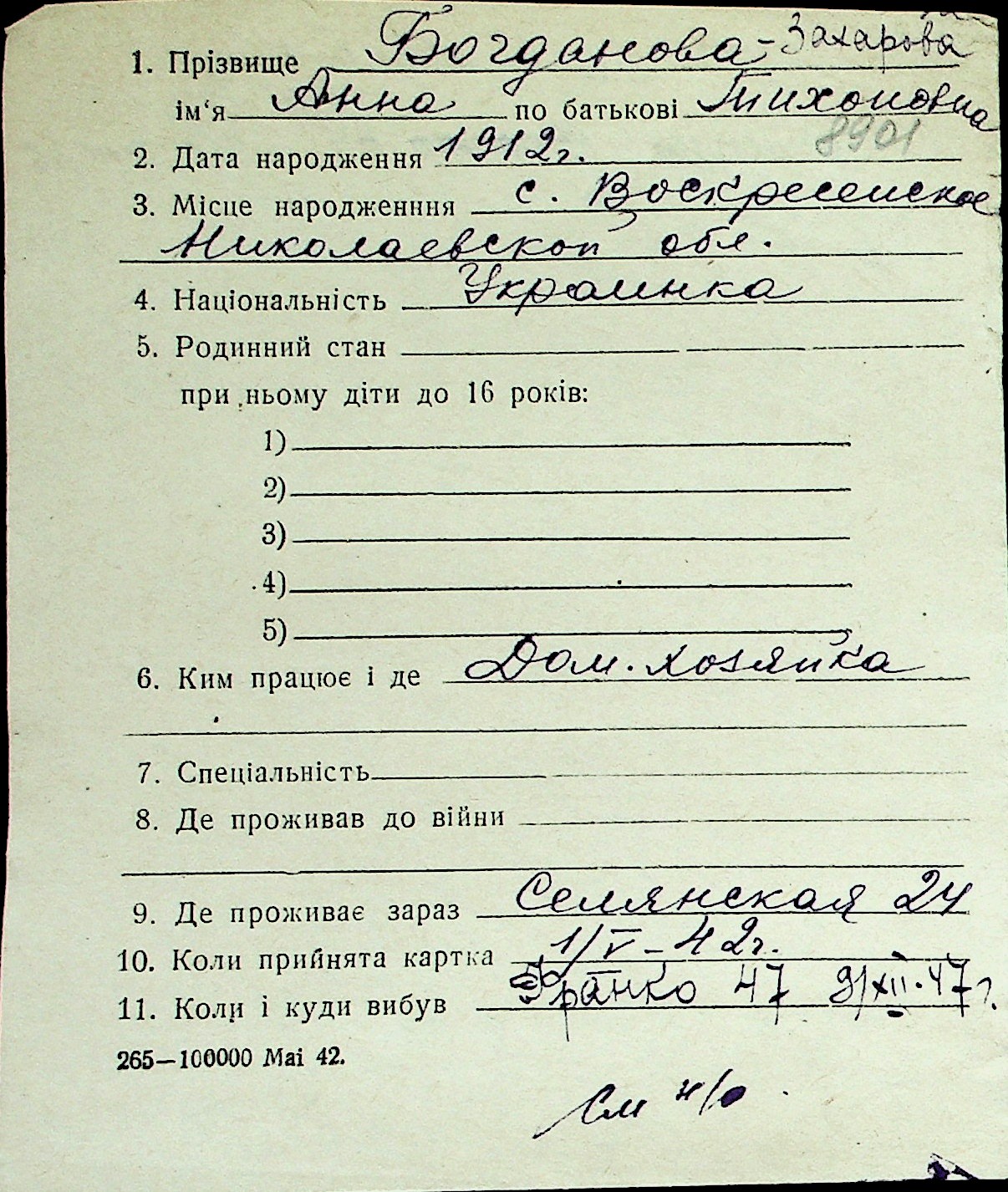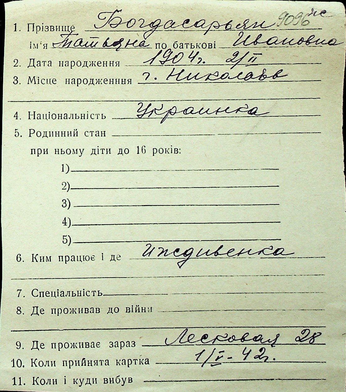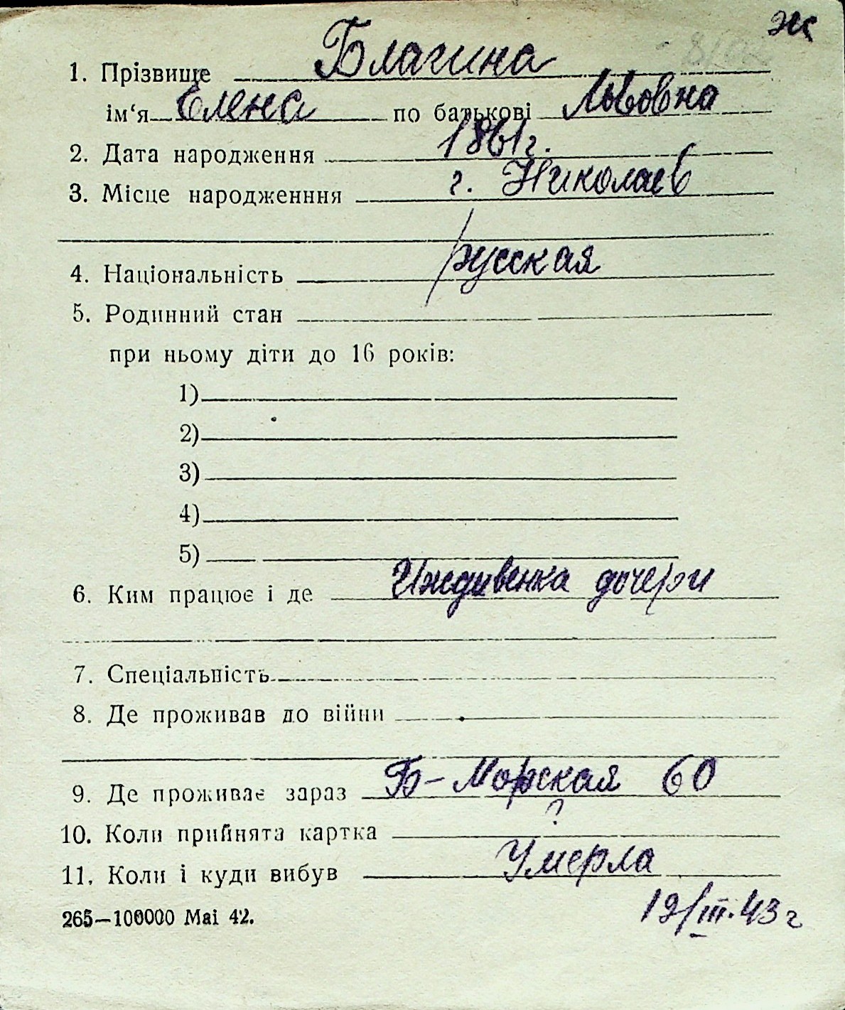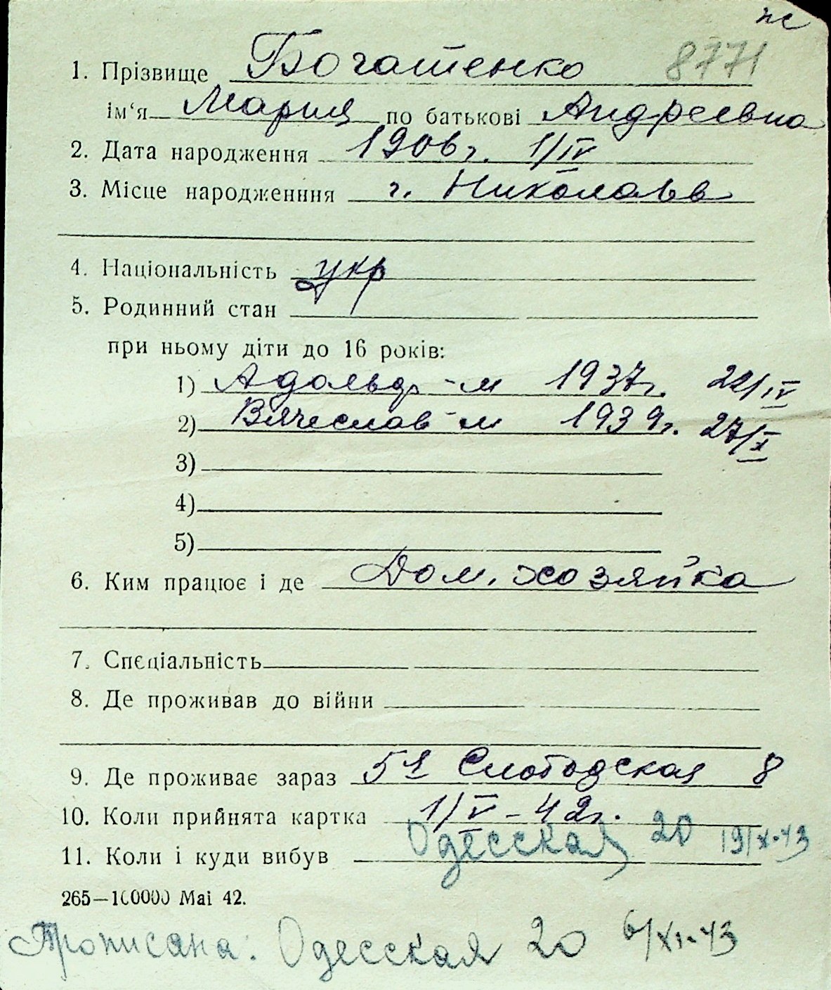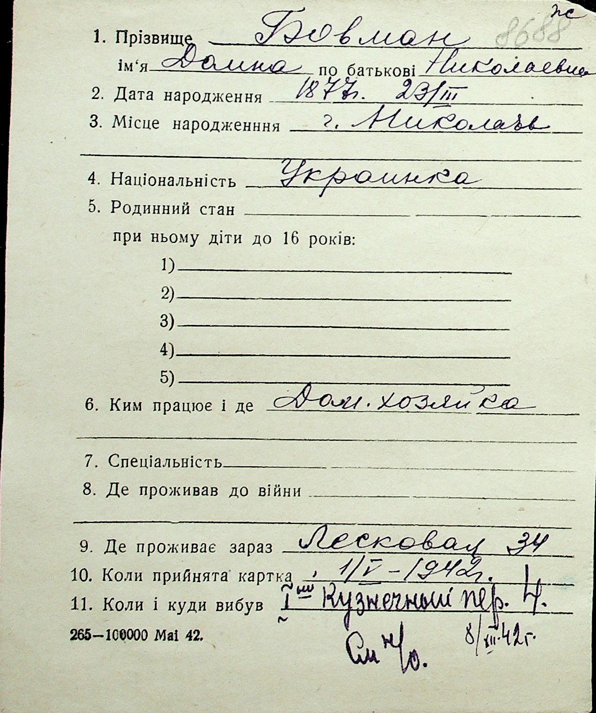◦ ◦ Перелік карток на осіб, які мешкали у м. Миколаїв у період окупації 1941–1944 років