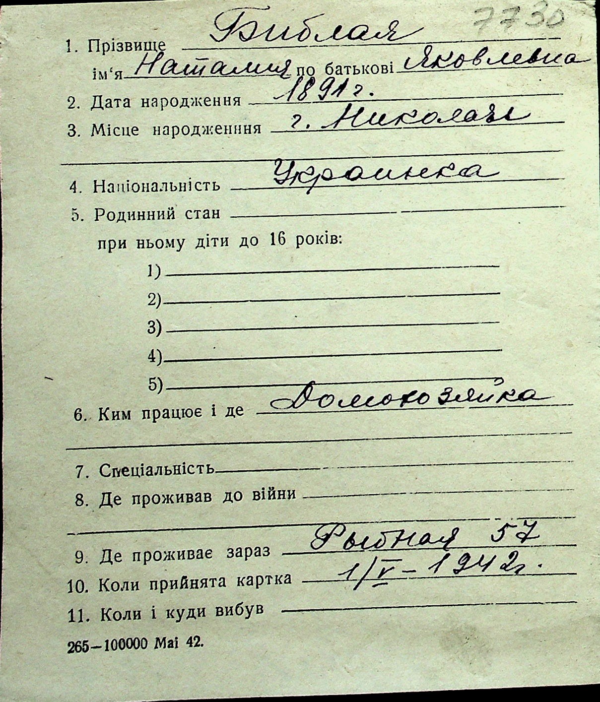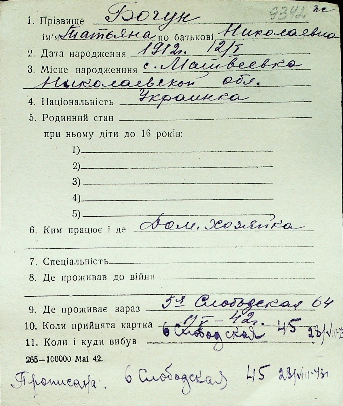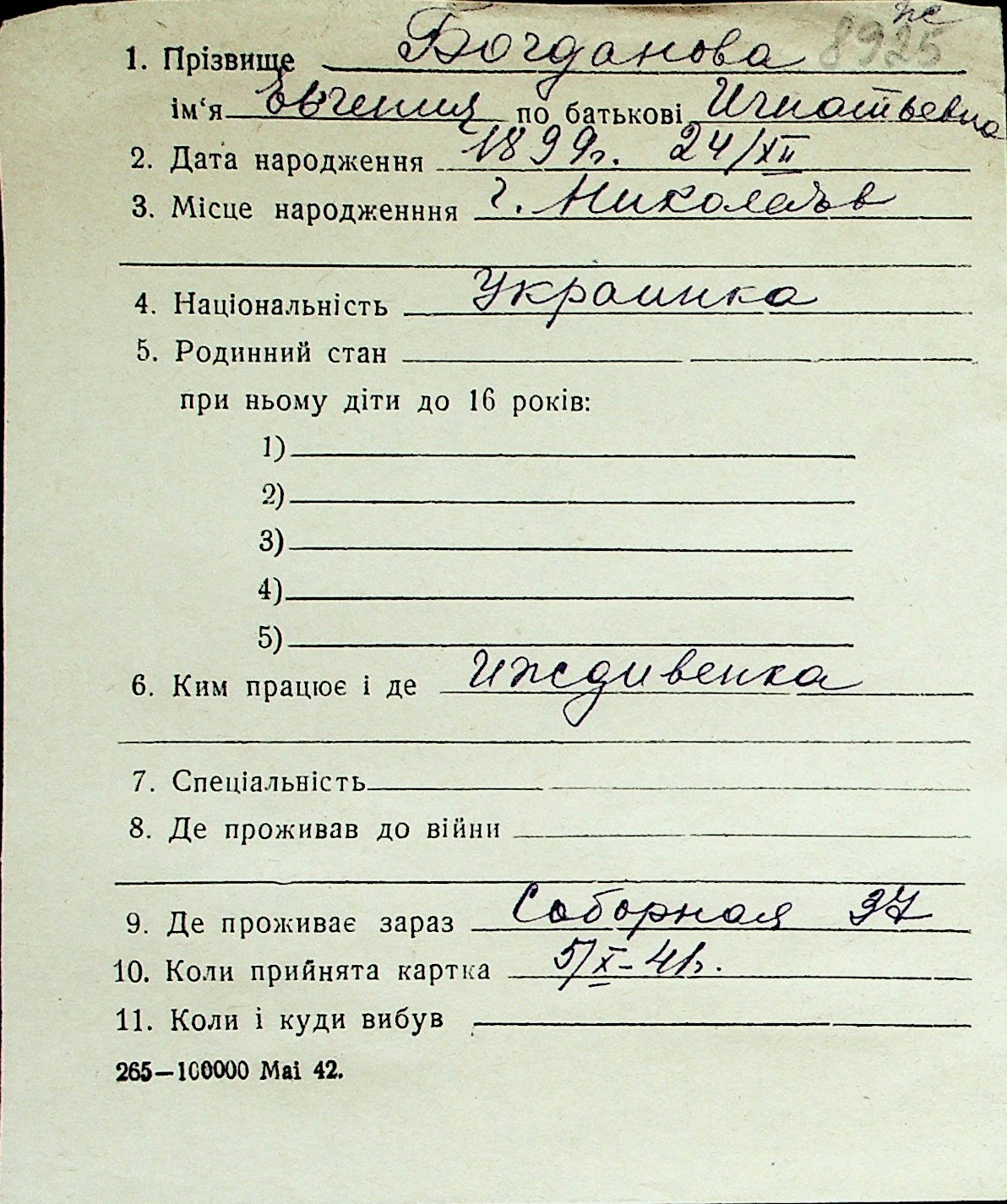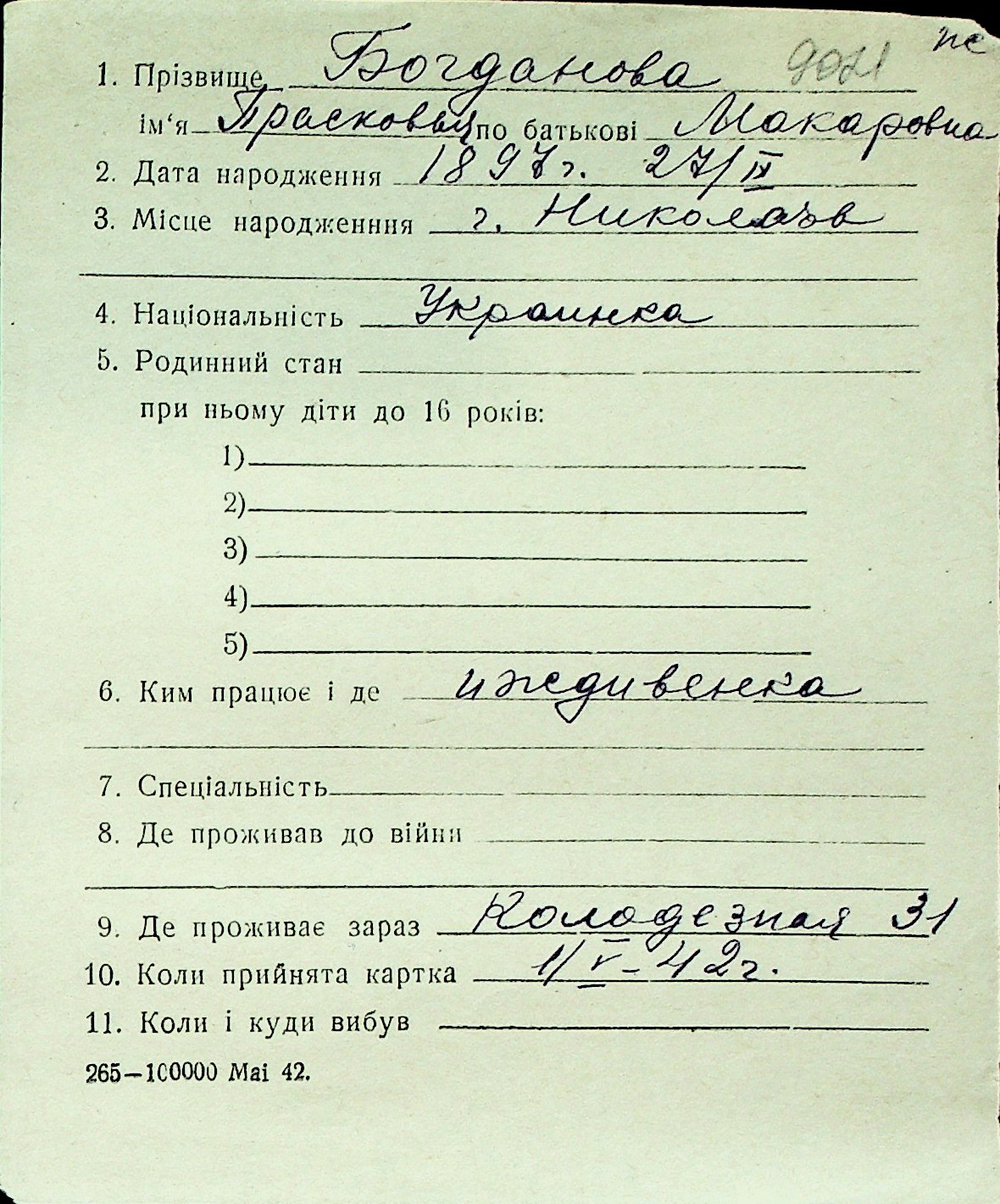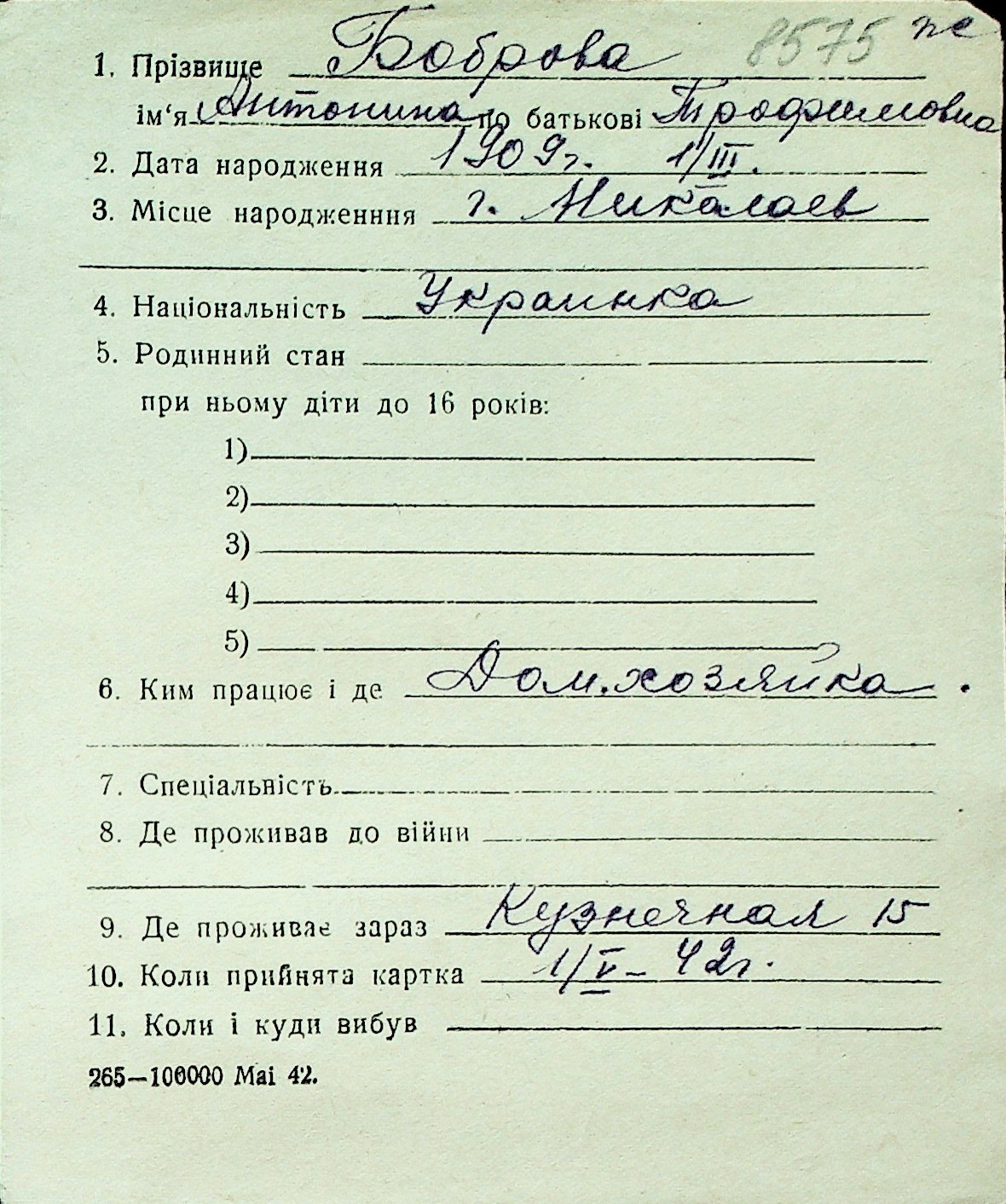 ◦ ◦ Перелік карток на осіб, які мешкали у м. Миколаїв у період окупації 1941–1944 років