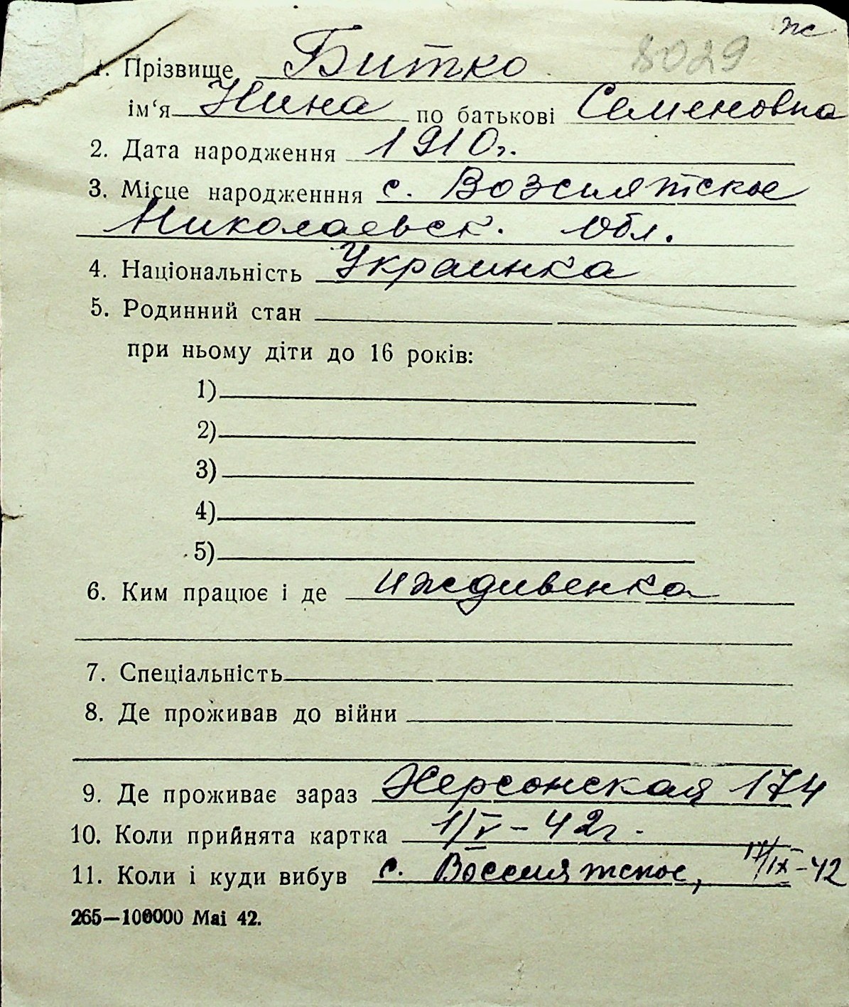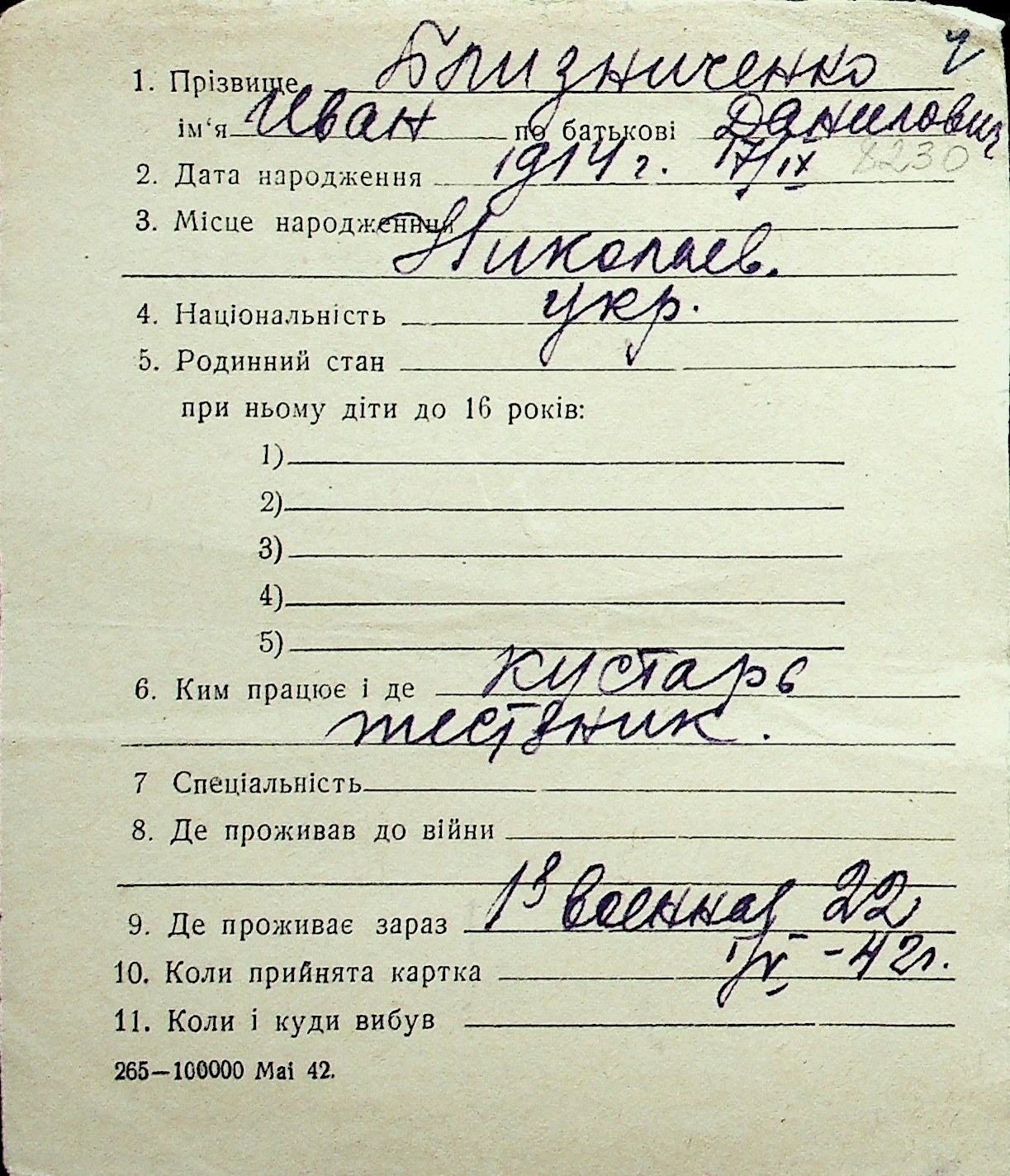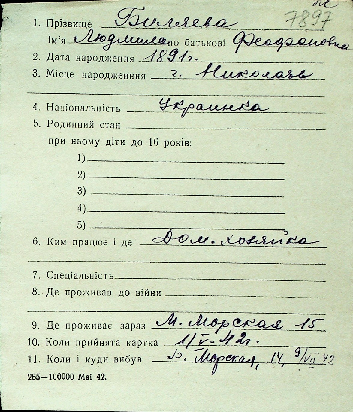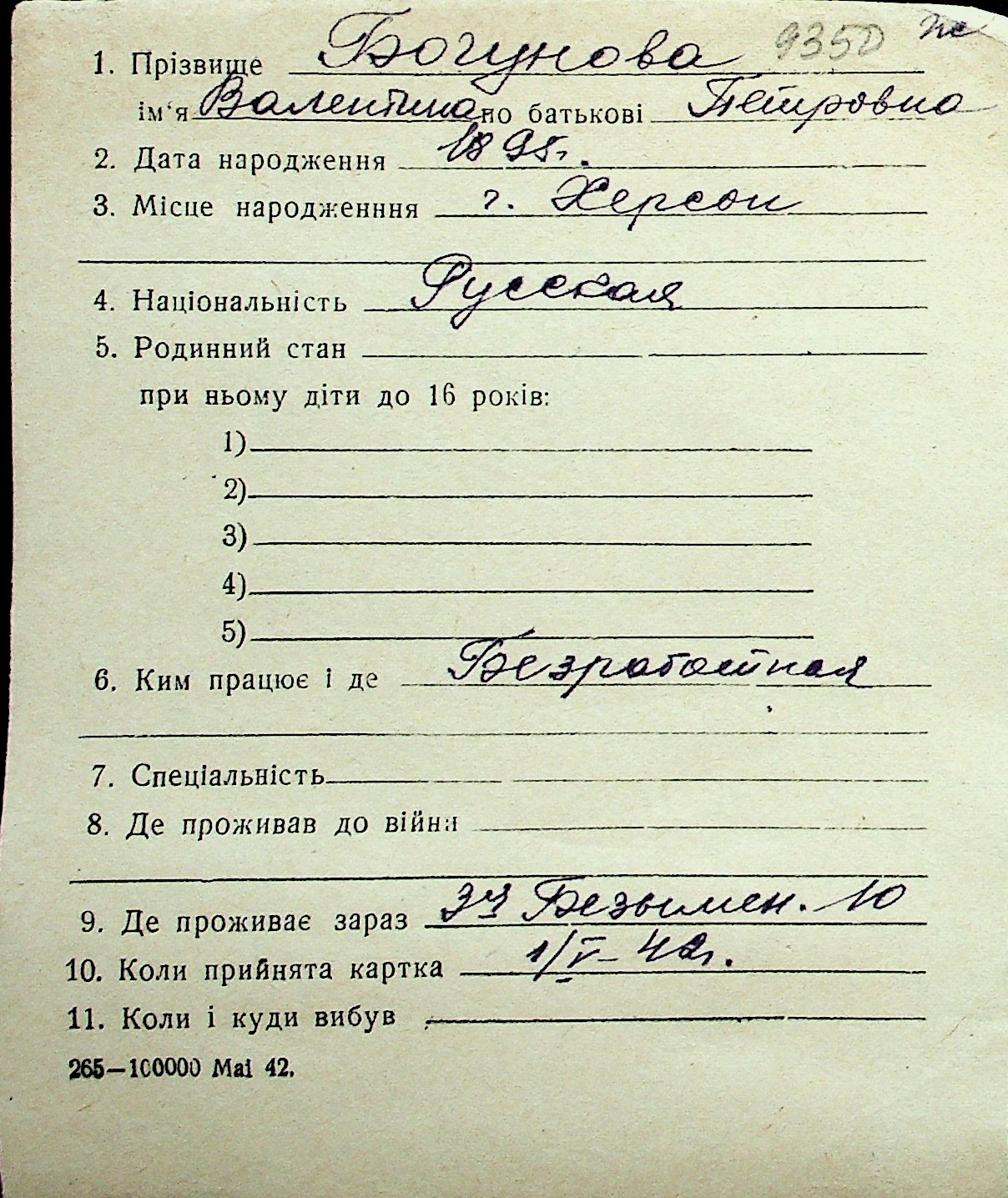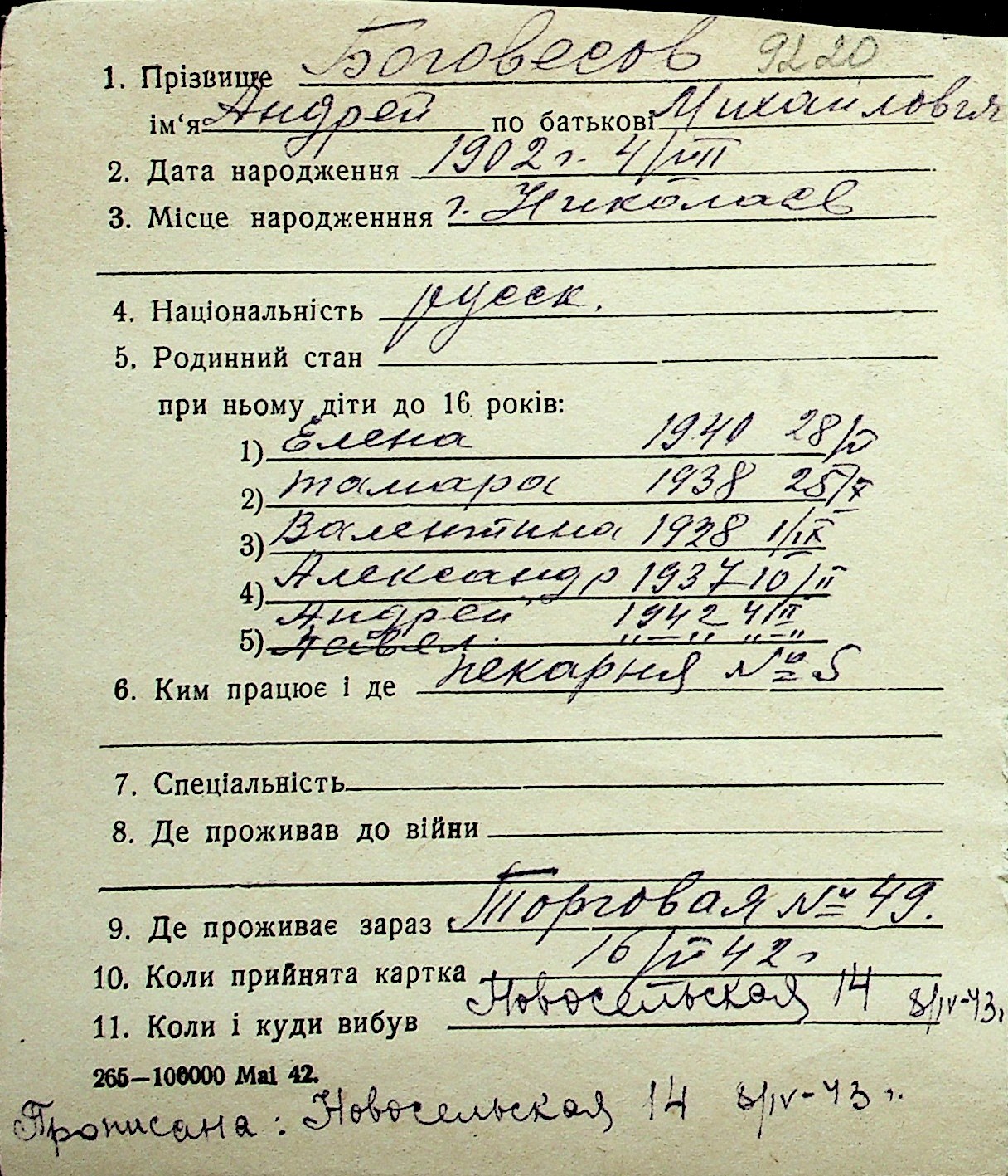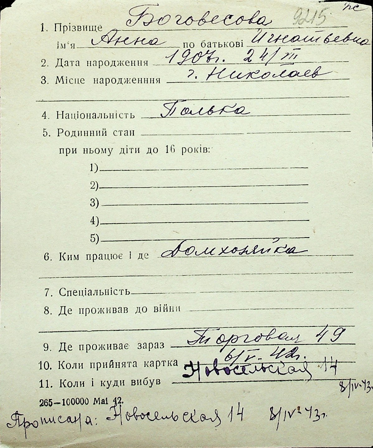 ◦ ◦ Перелік карток на осіб, які мешкали у м. Миколаїв у період окупації 1941–1944 років