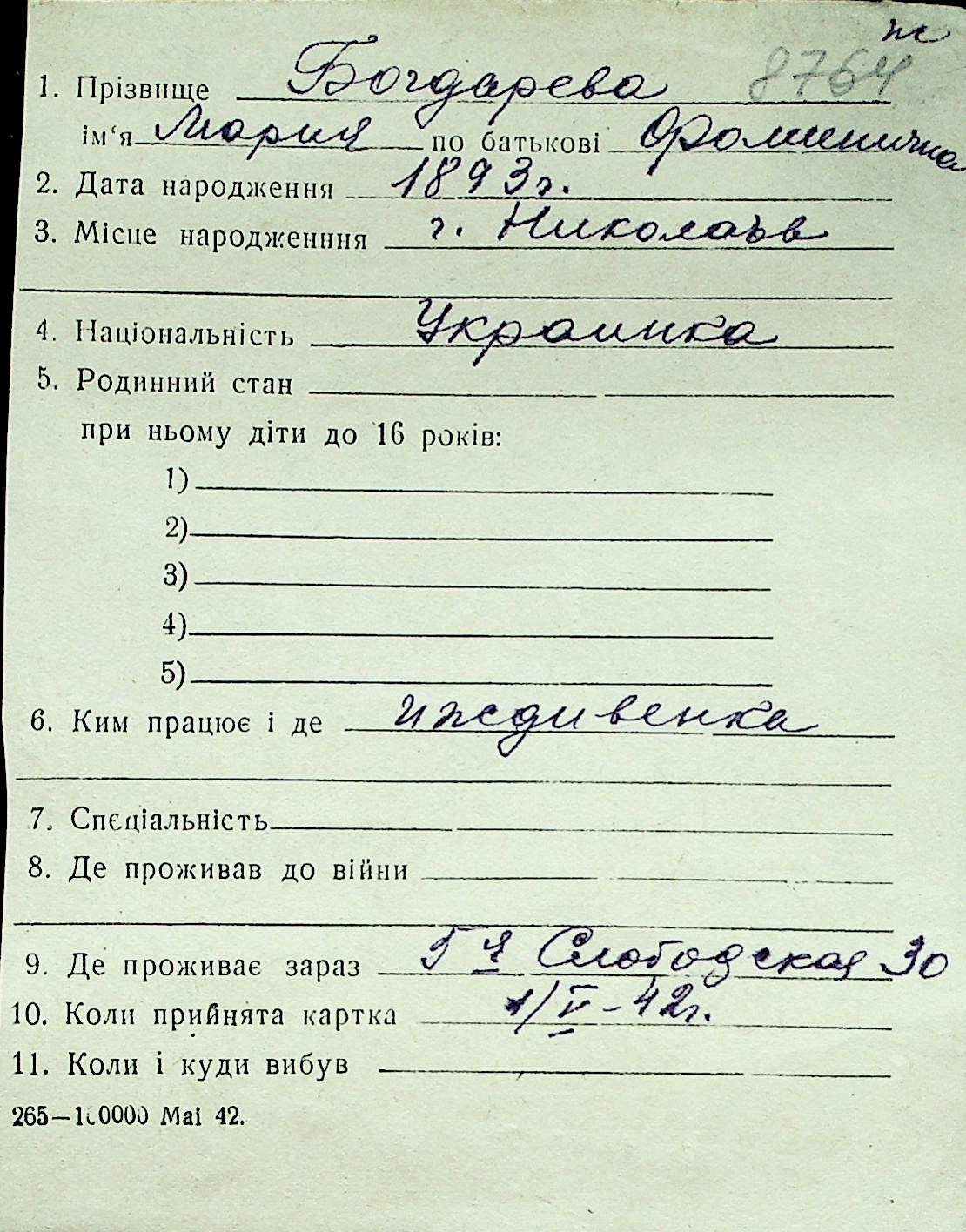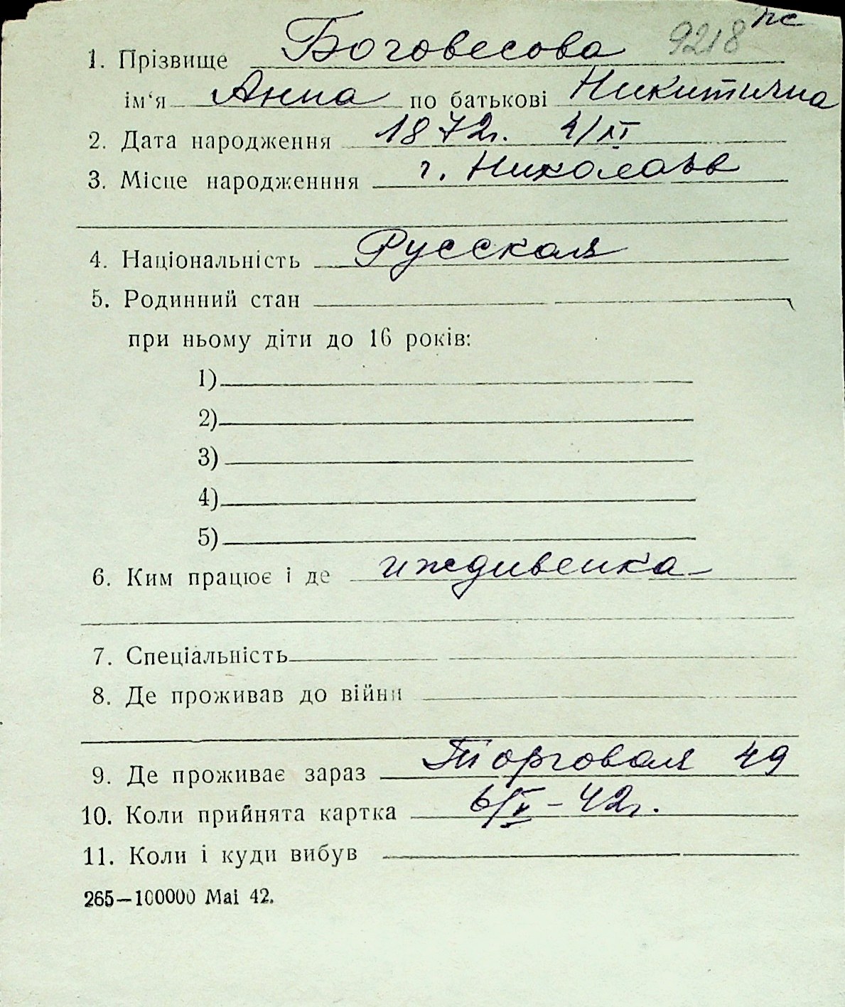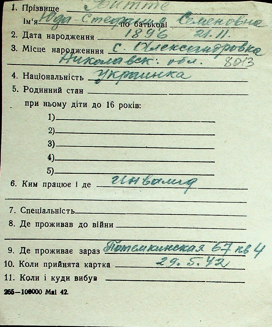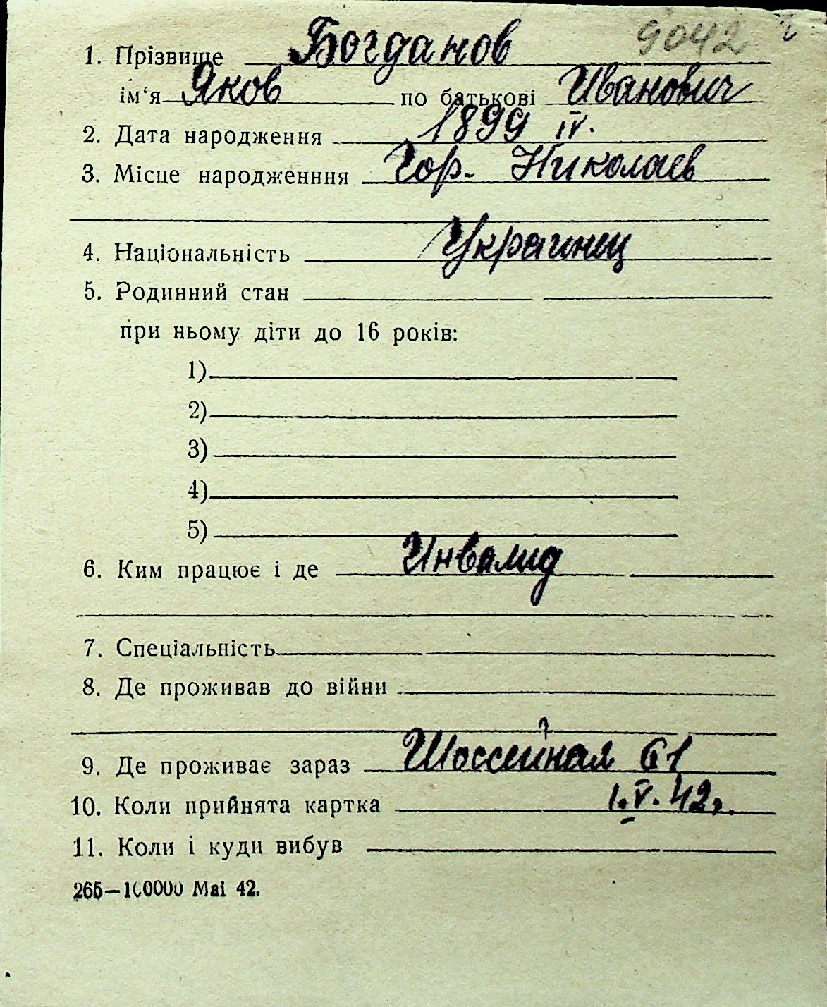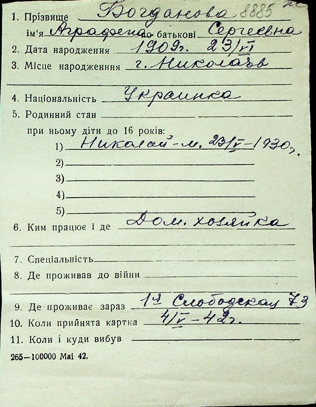 ◦ ◦ Перелік карток на осіб, які мешкали у м. Миколаїв у період окупації 1941–1944 років