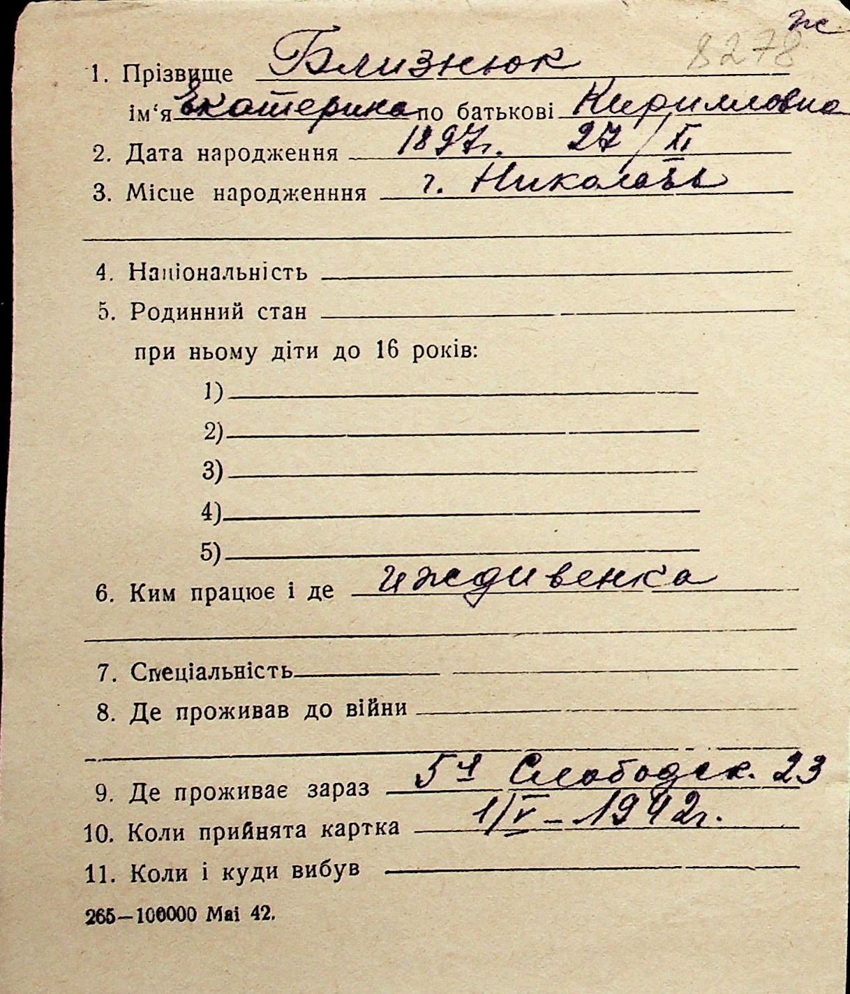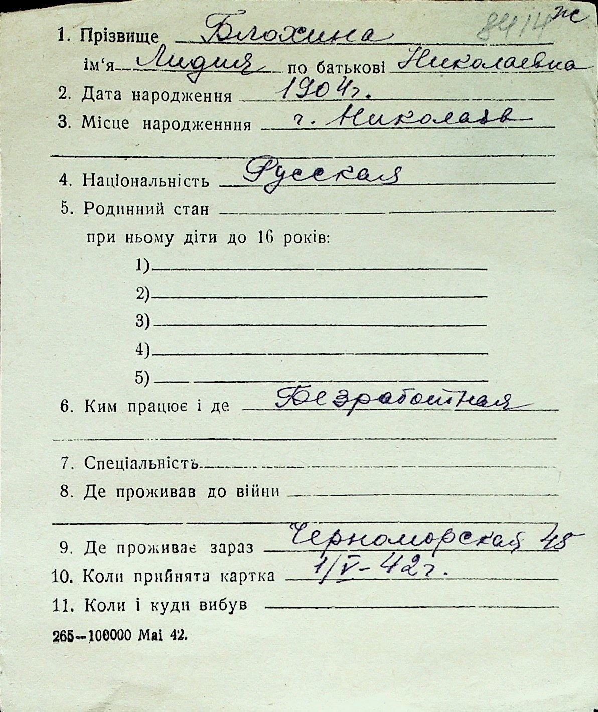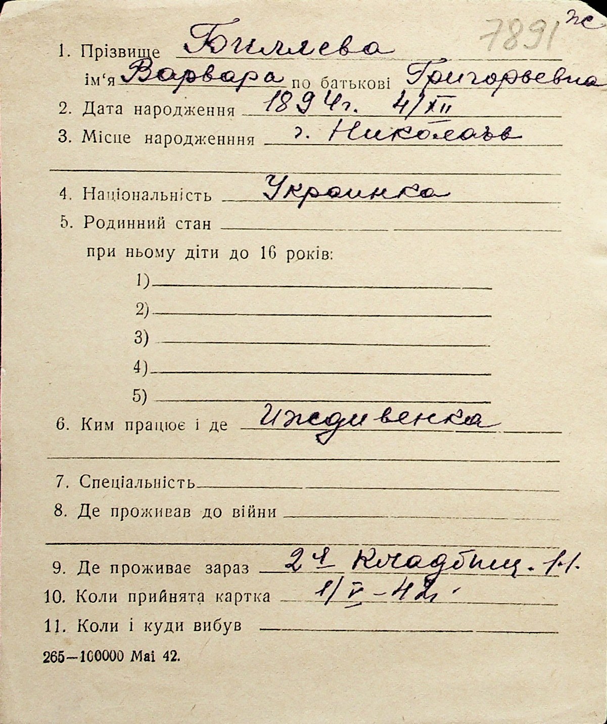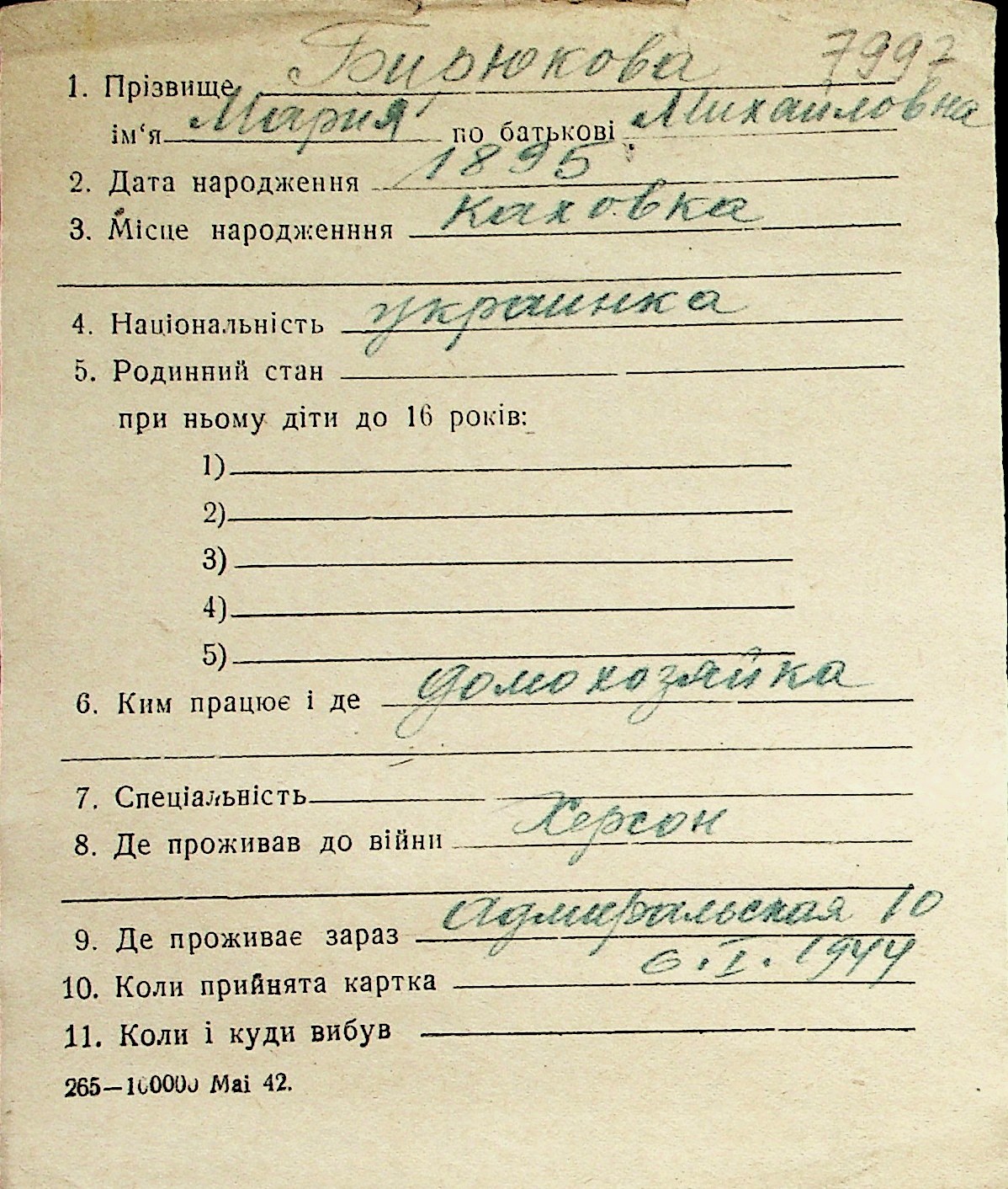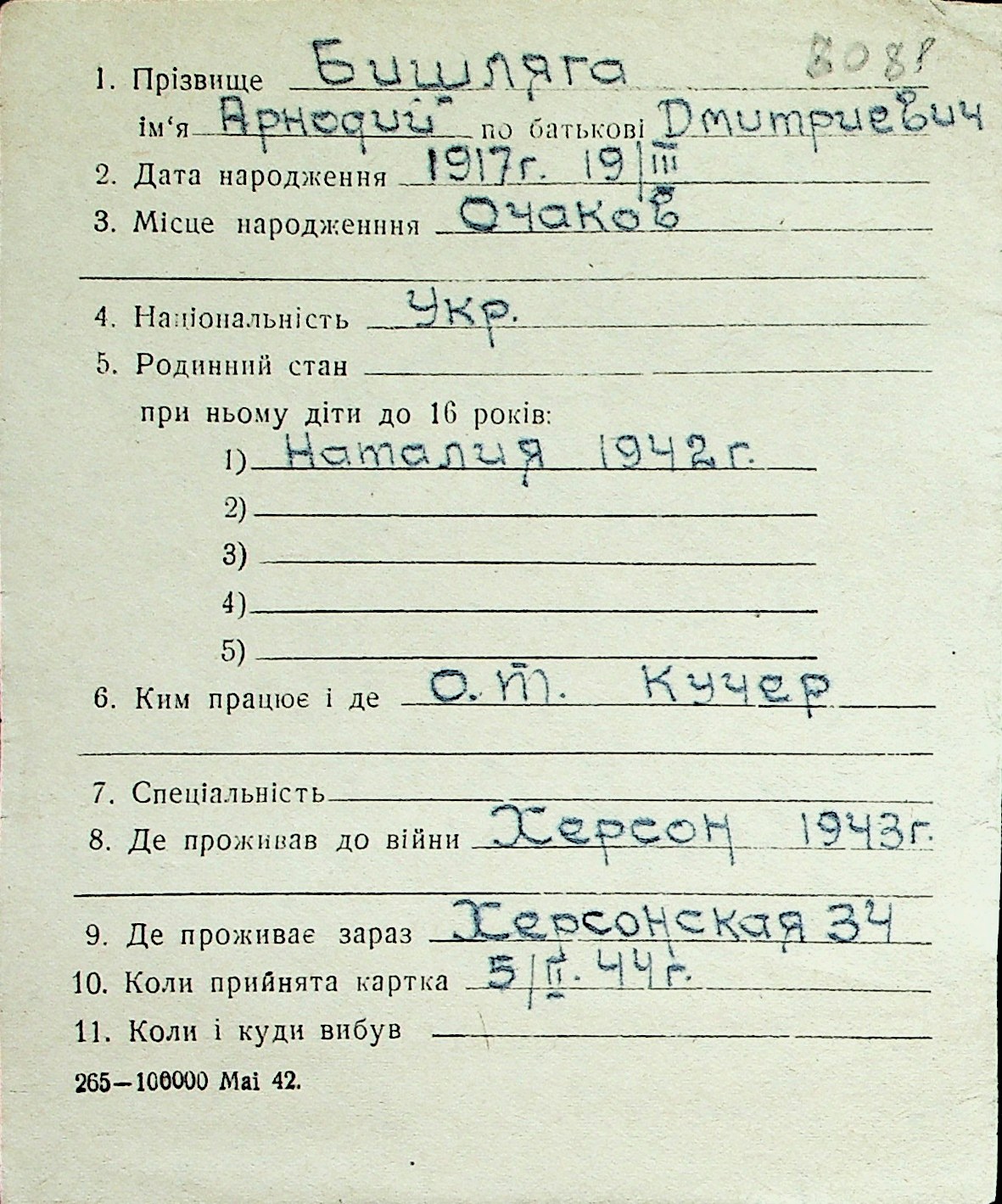 ◦ ◦ Перелік карток на осіб, які мешкали у м. Миколаїв у період окупації 1941–1944 років