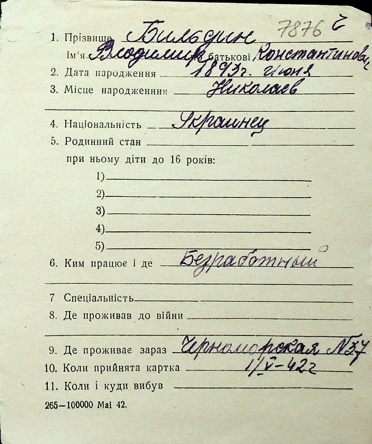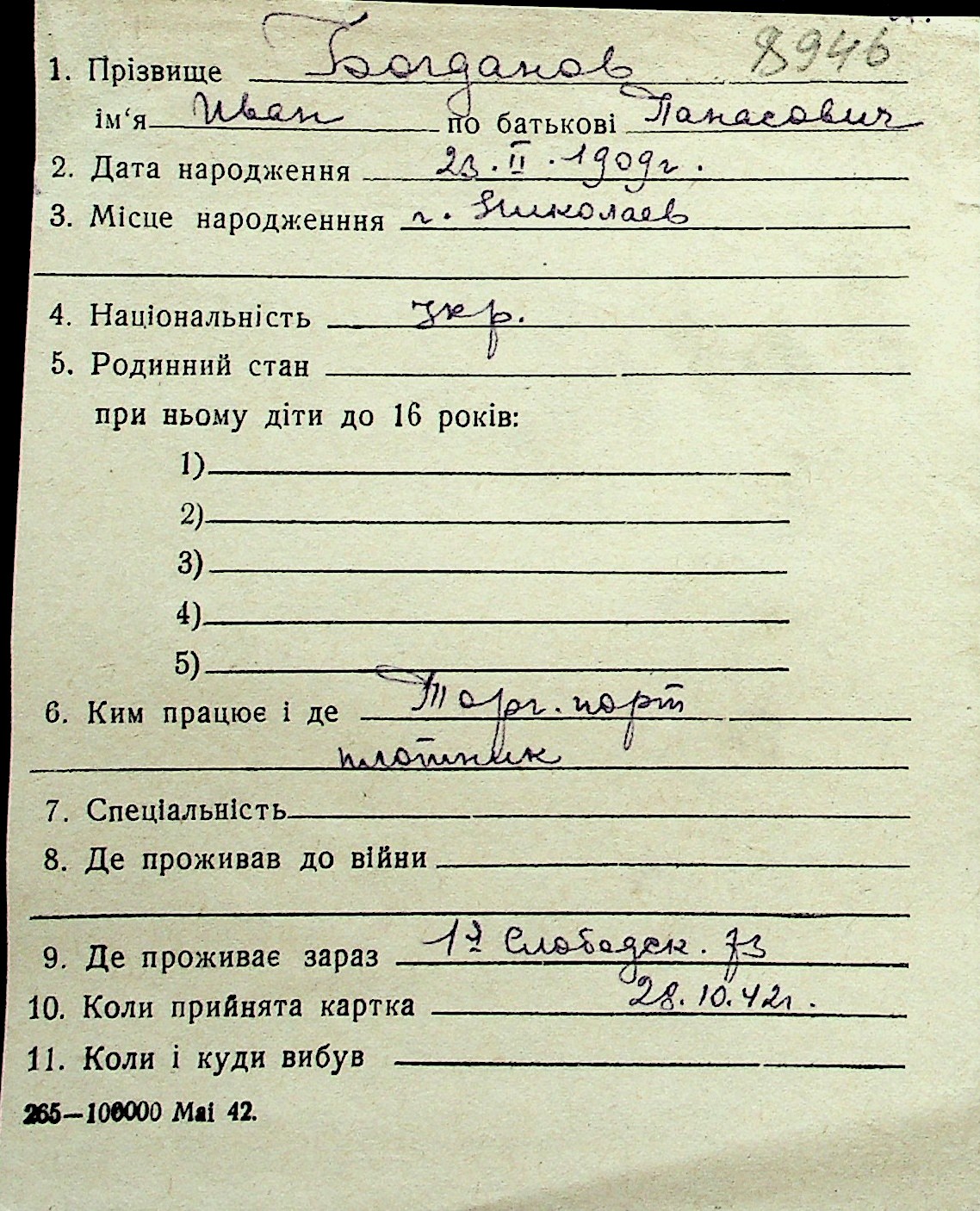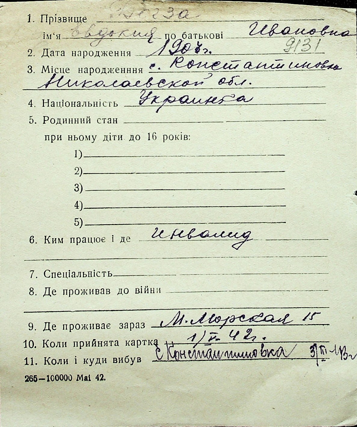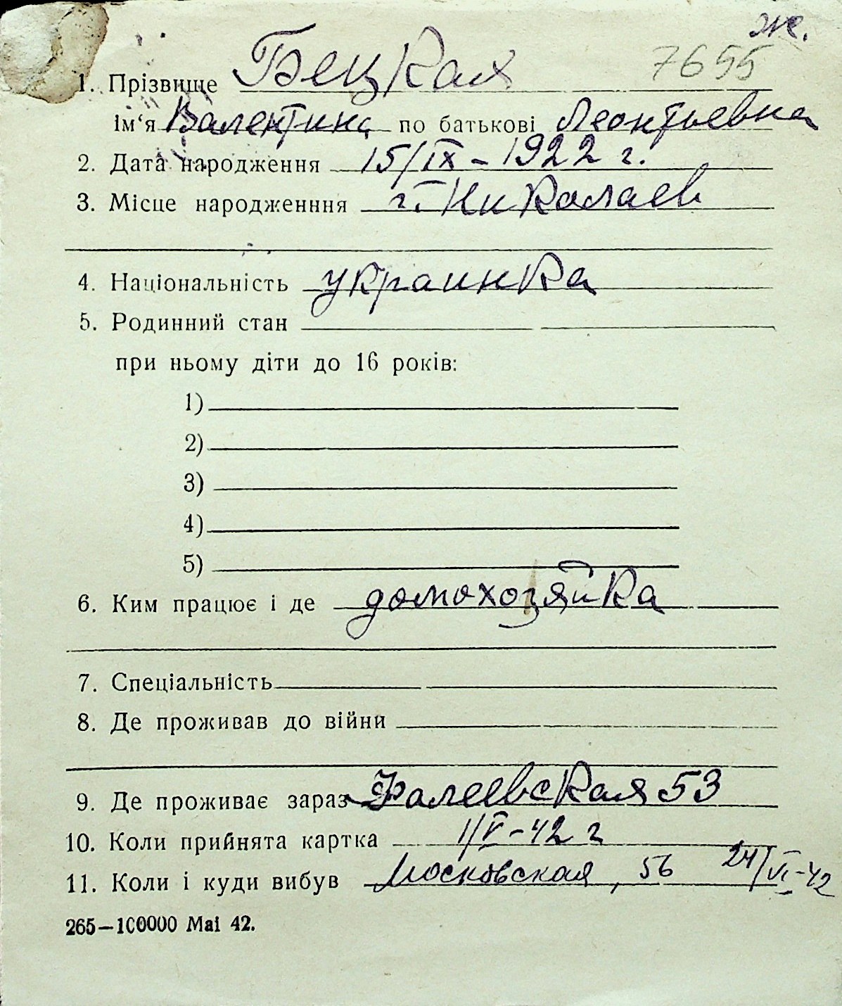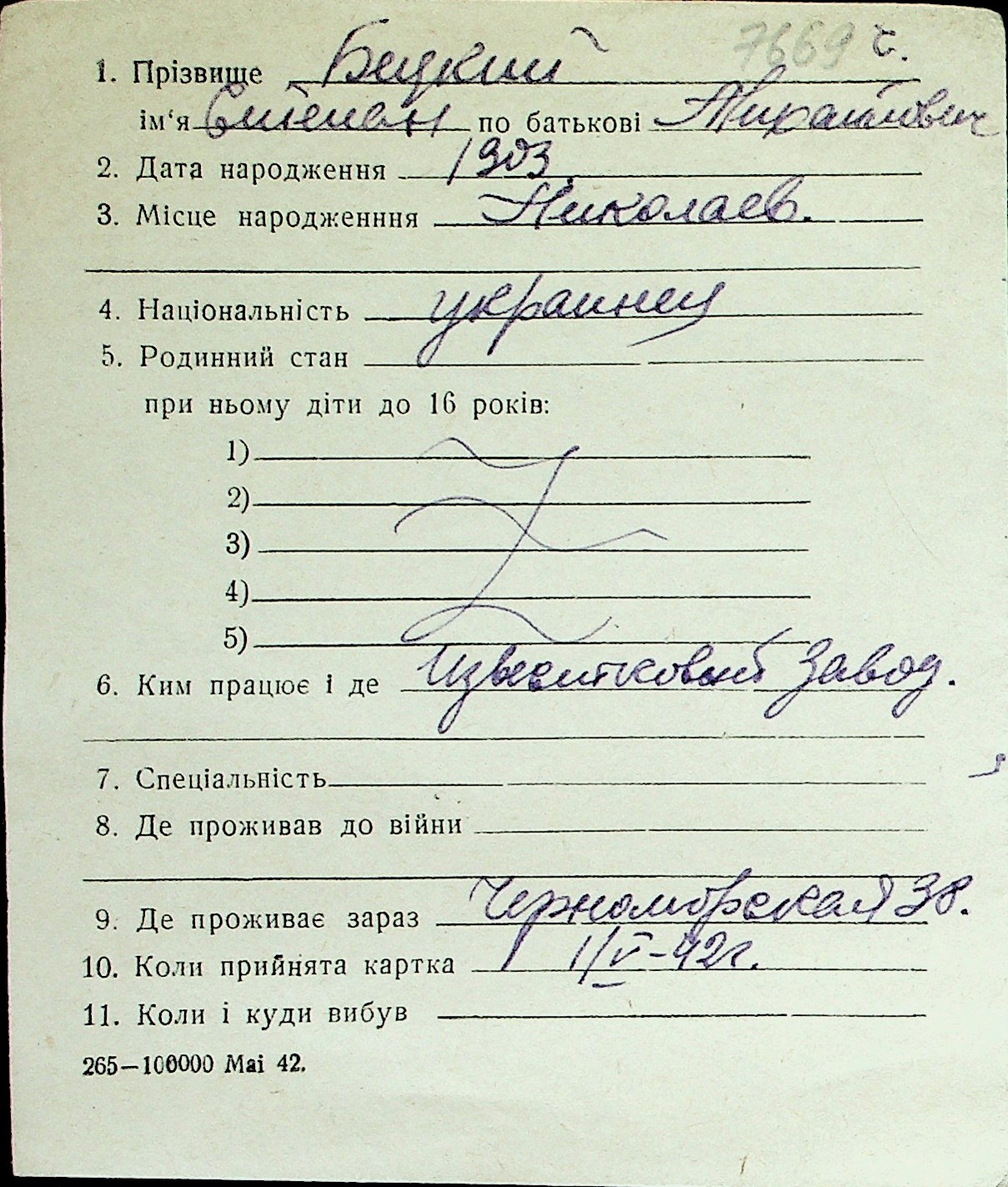 ◦ ◦ Перелік карток на осіб, які мешкали у м. Миколаїв у період окупації 1941–1944 років
