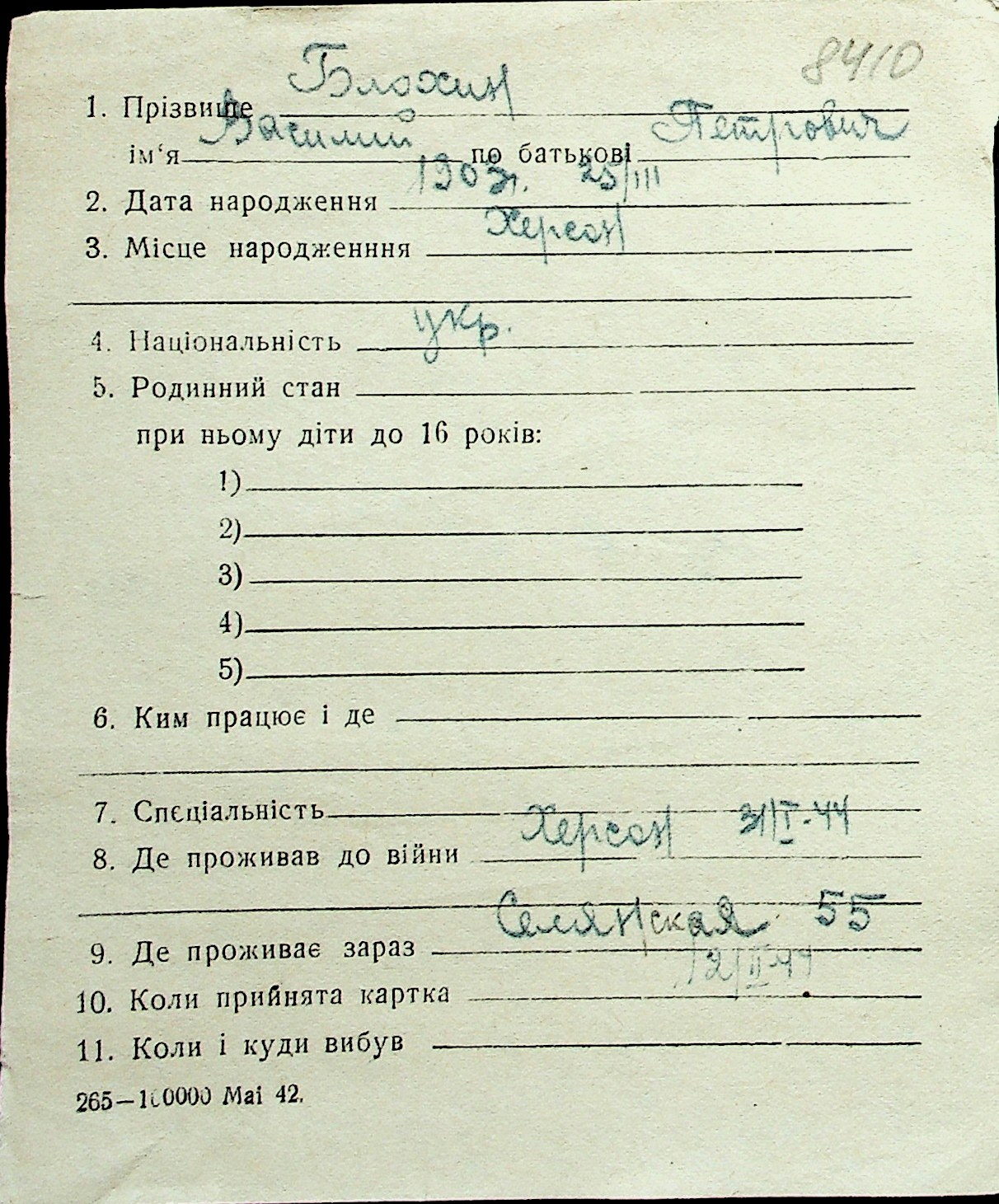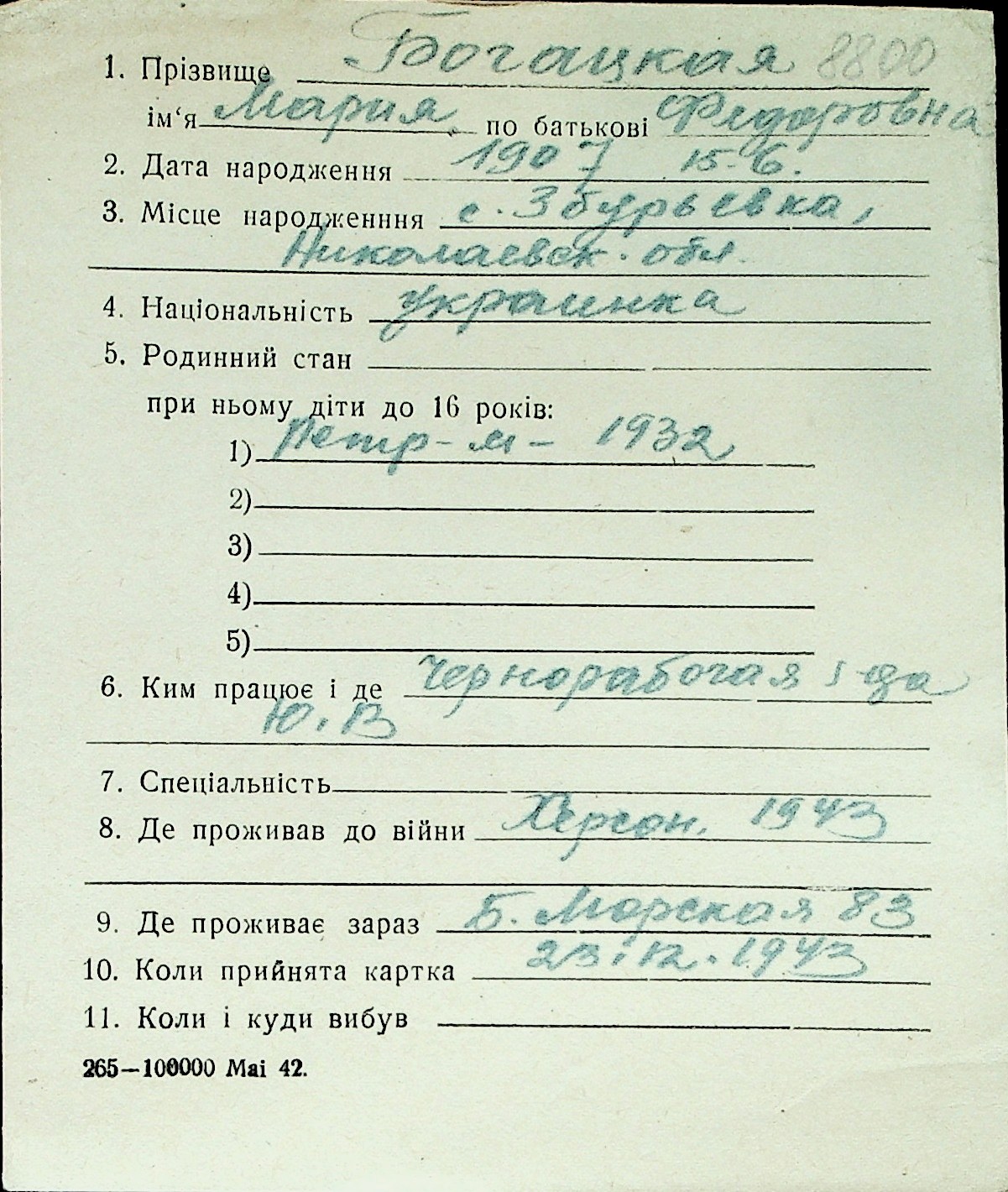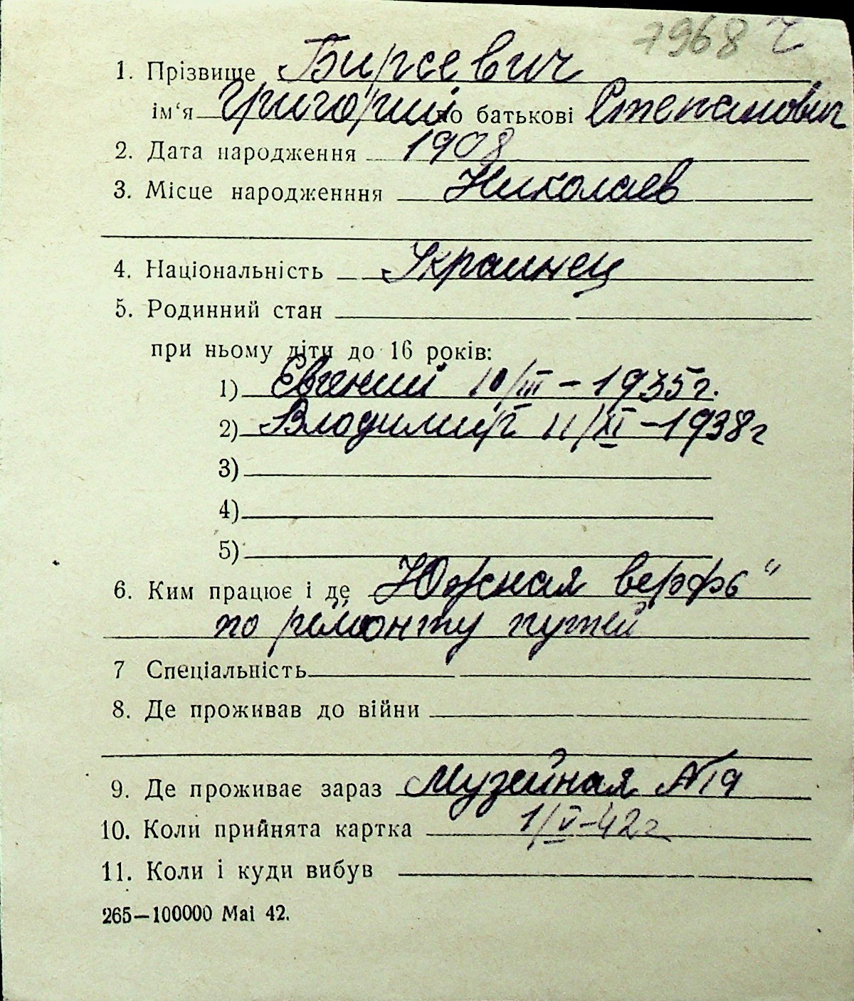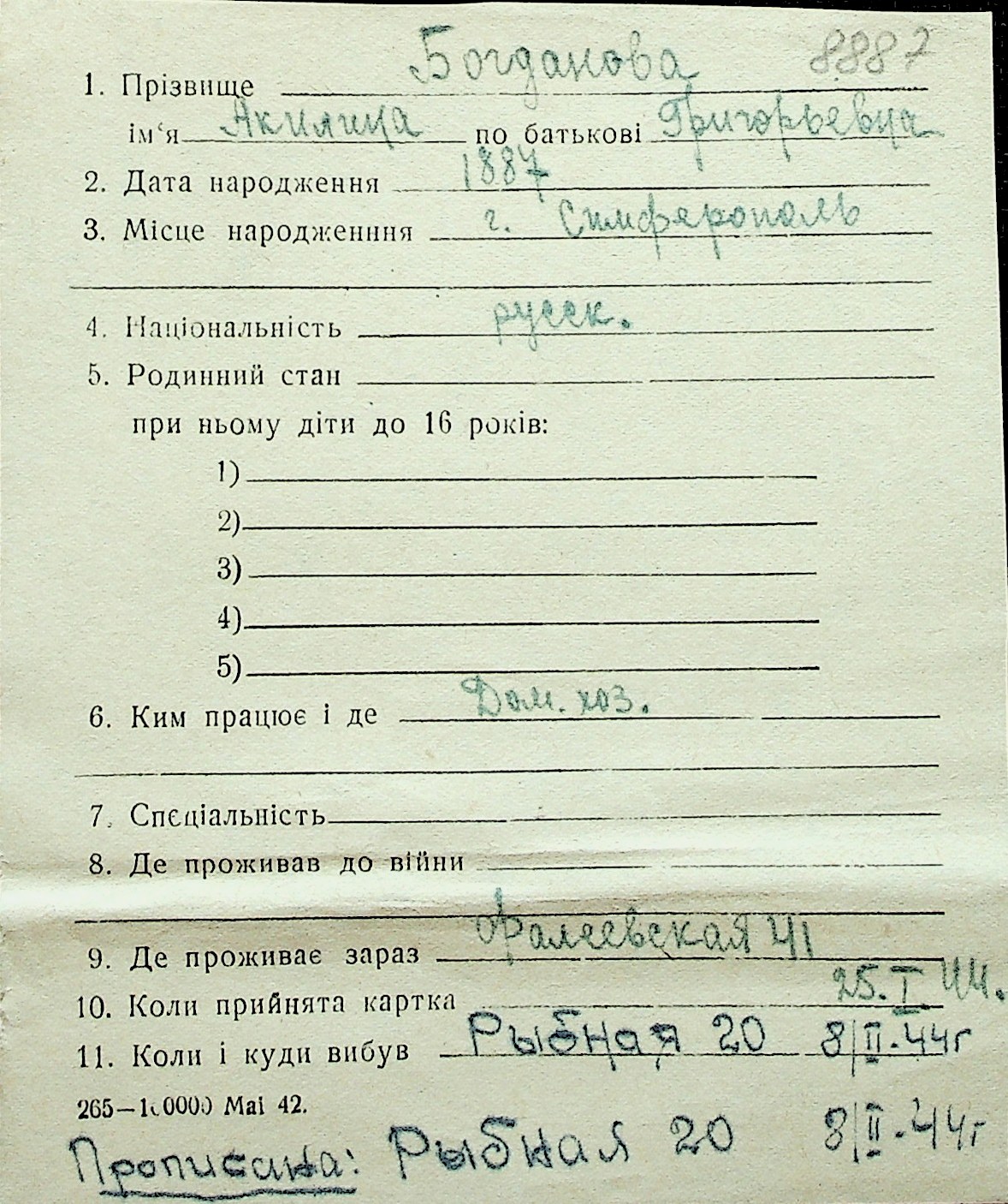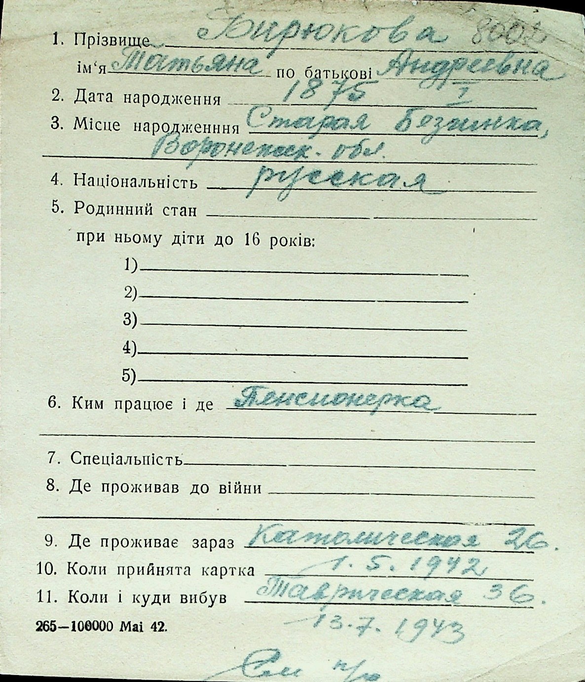 ◦ ◦ Перелік карток на осіб, які мешкали у м. Миколаїв у період окупації 1941–1944 років