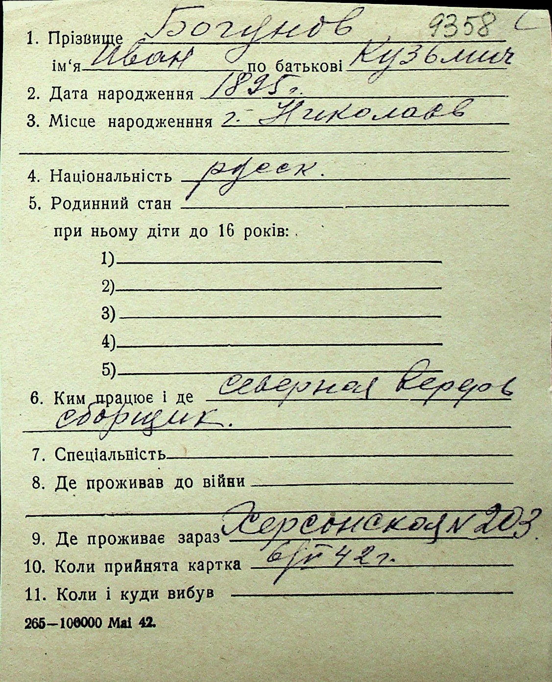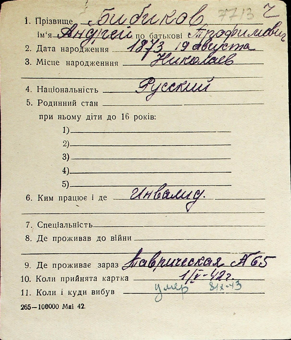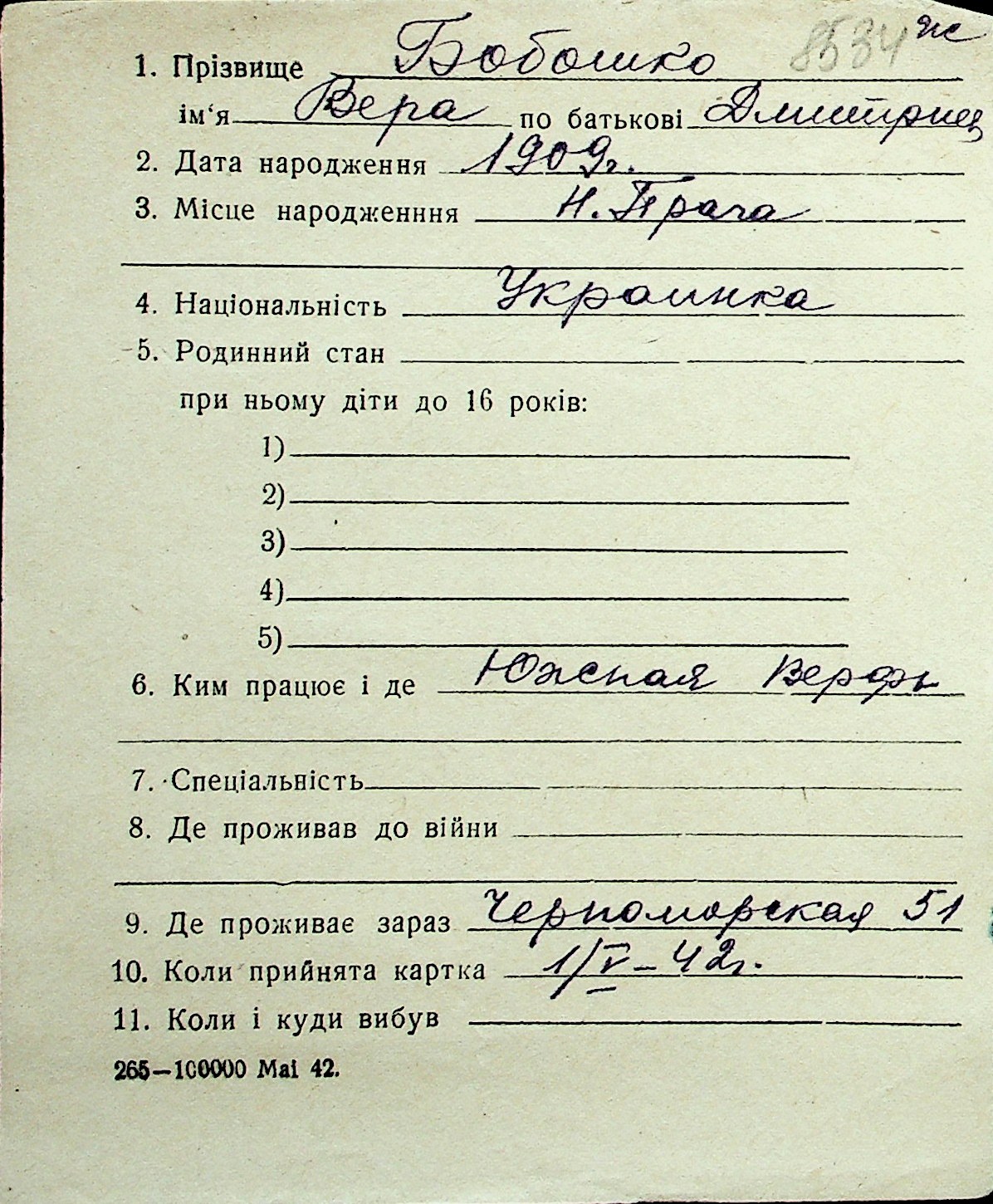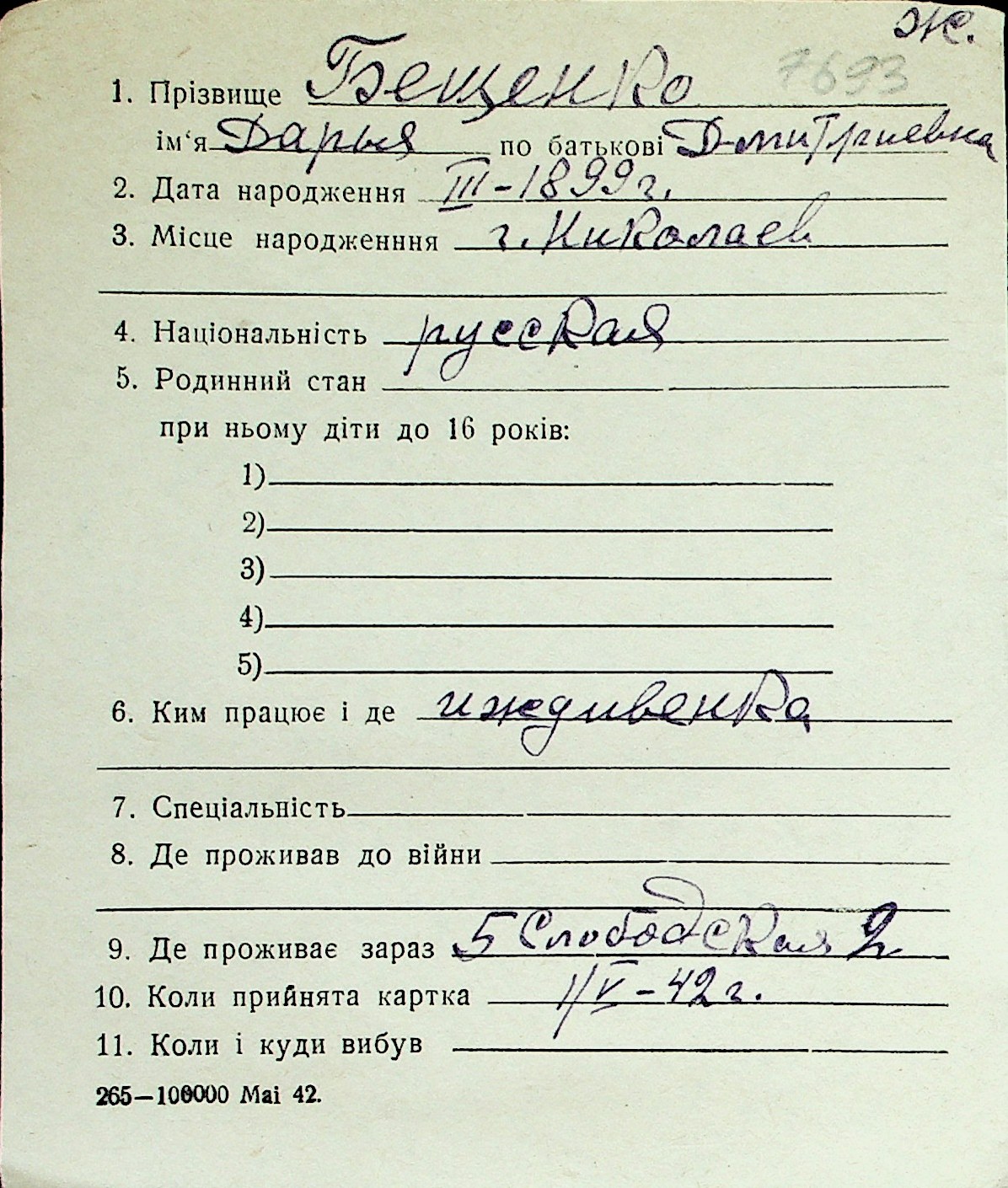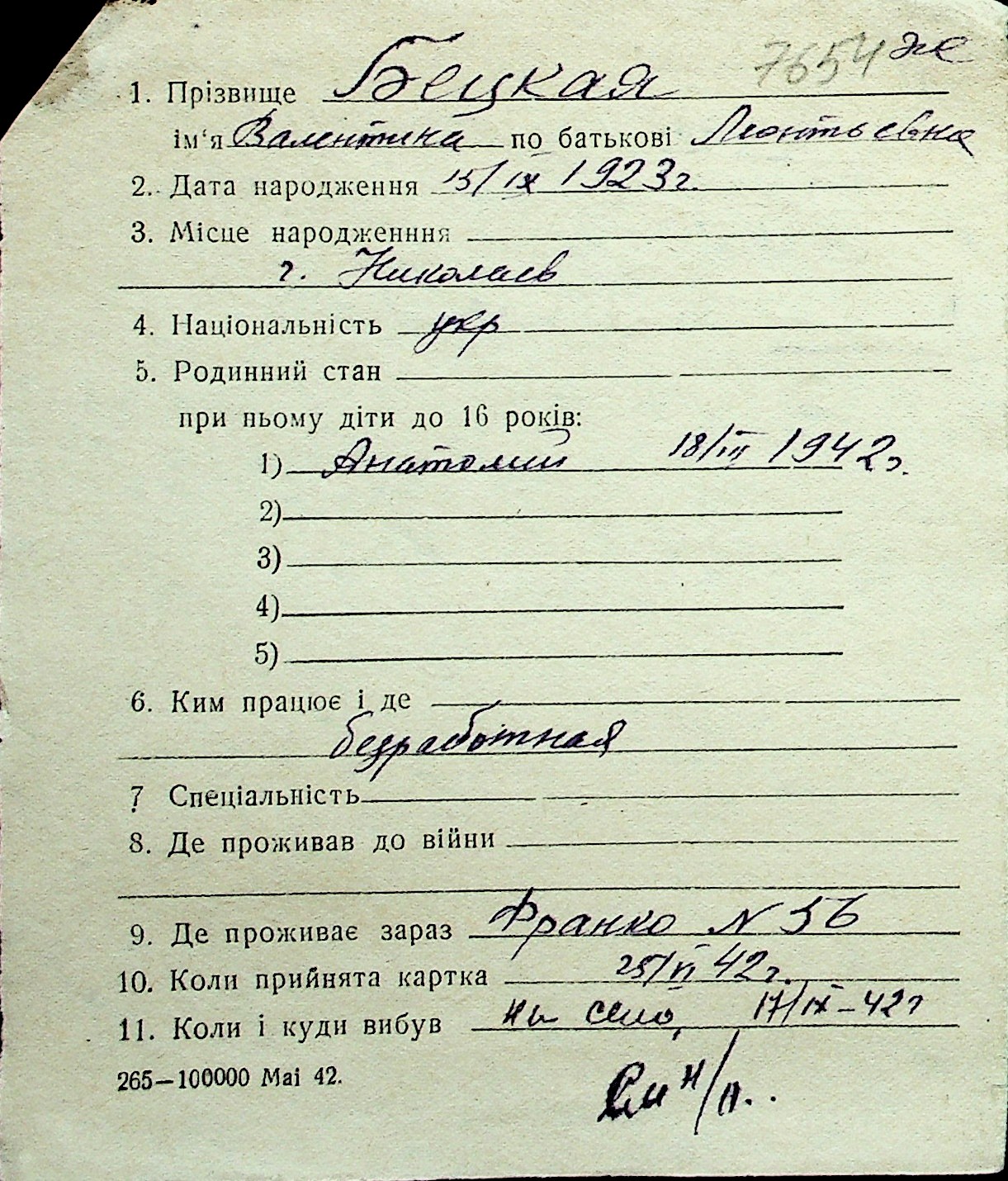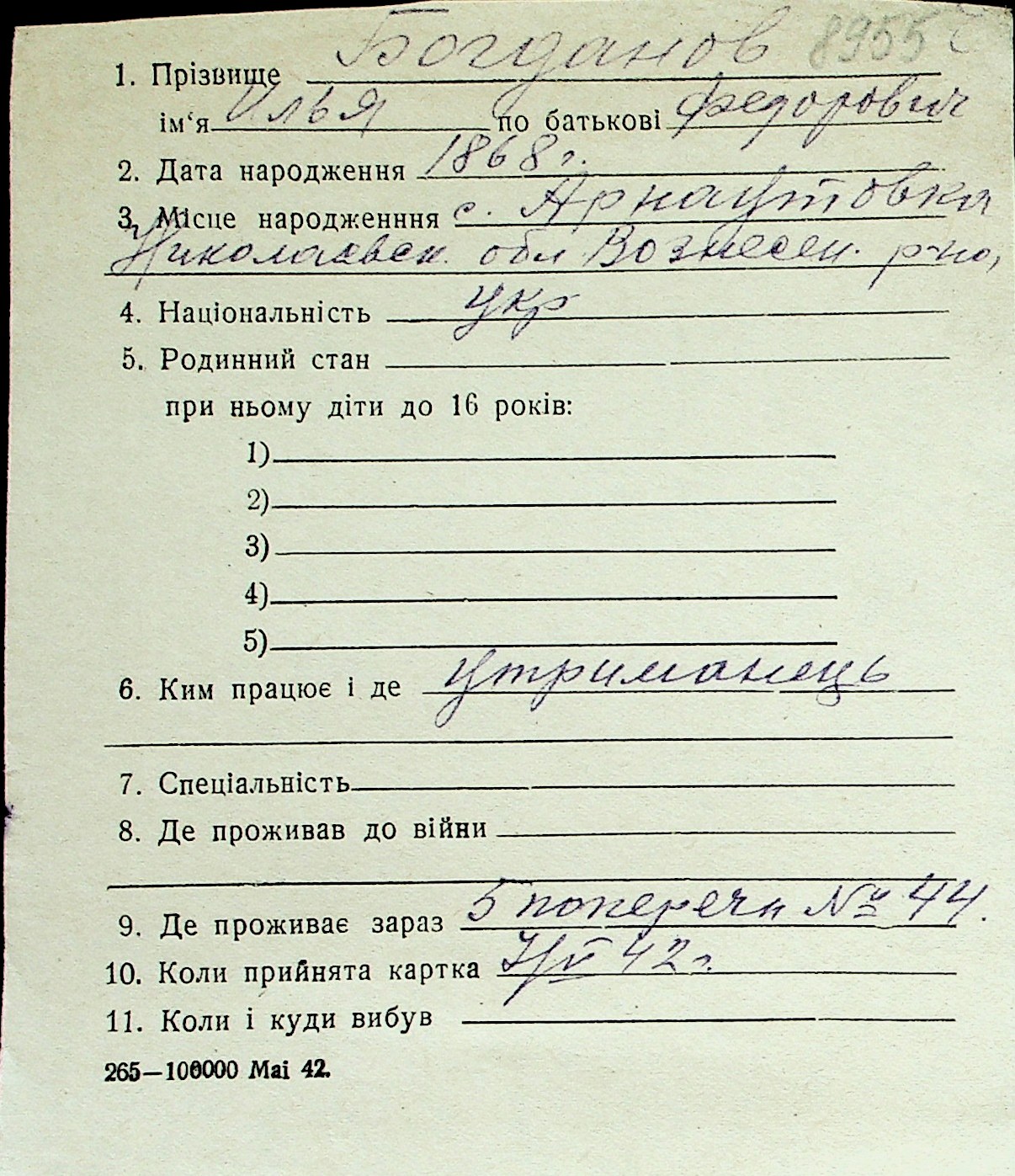 ◦ ◦ Перелік карток на осіб, які мешкали у м. Миколаїв у період окупації 1941–1944 років