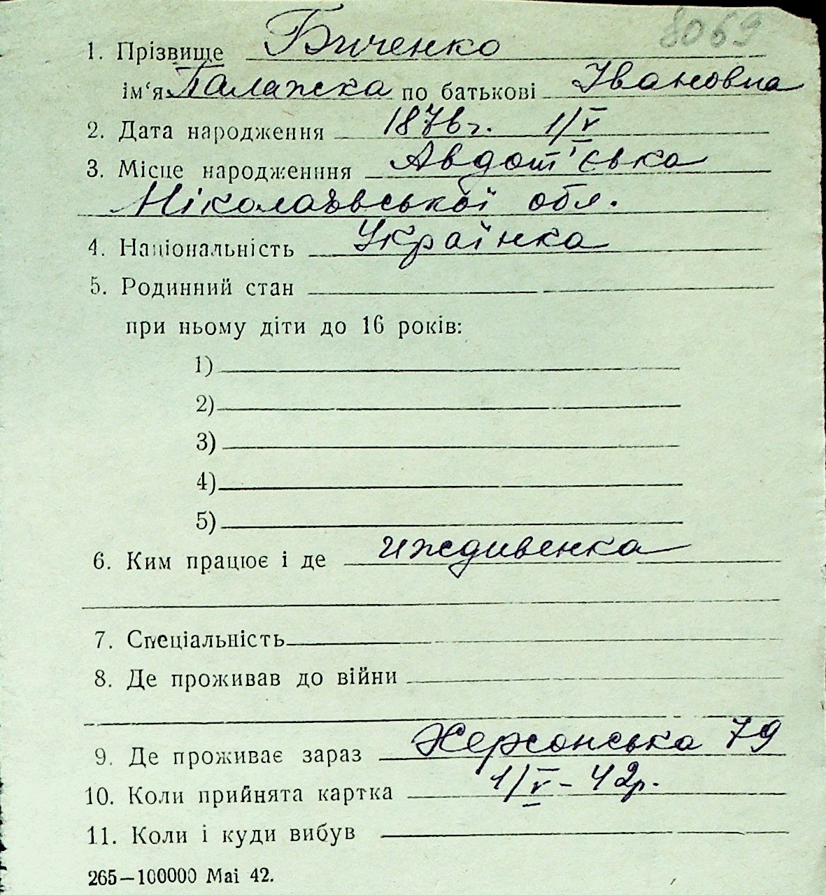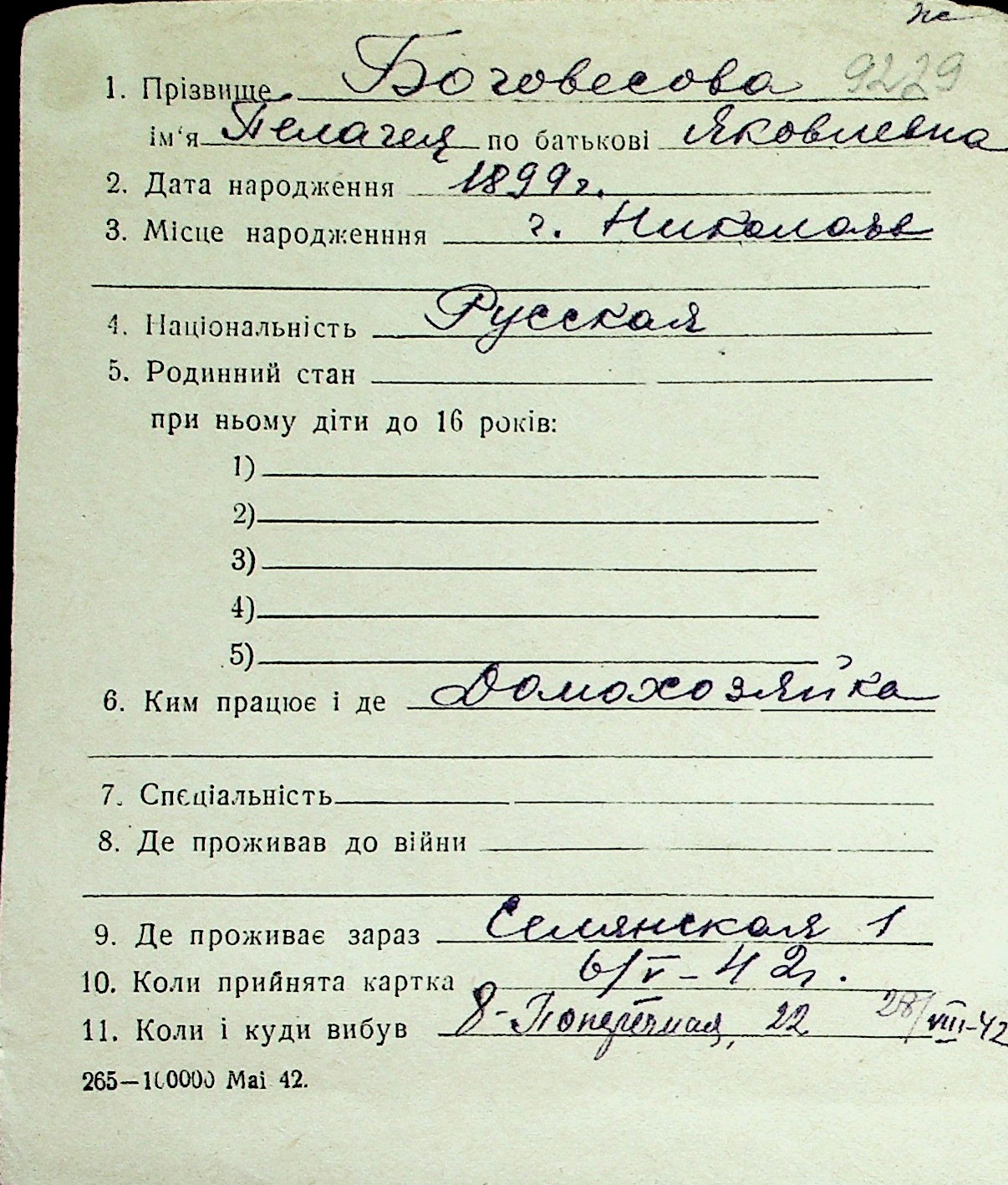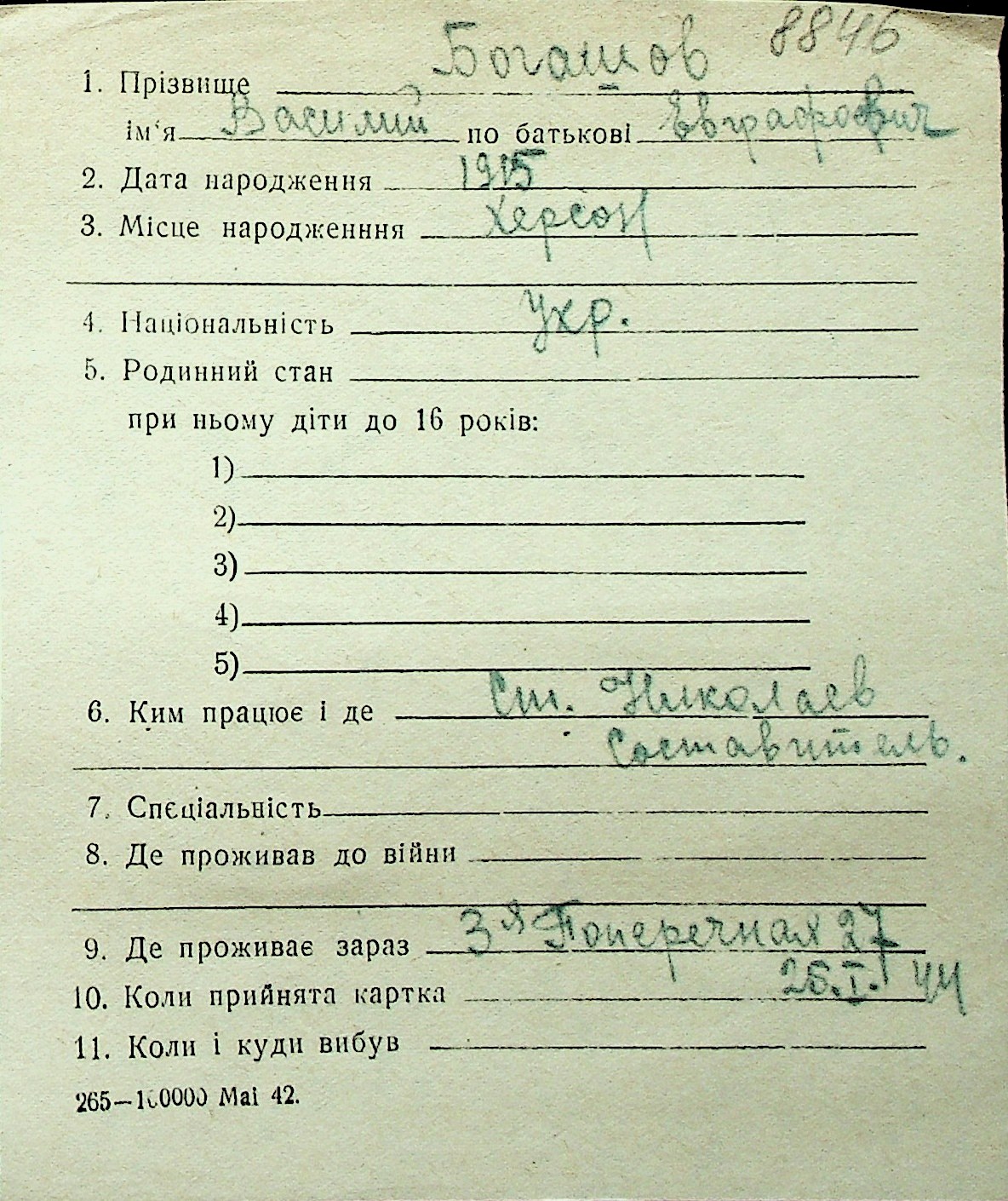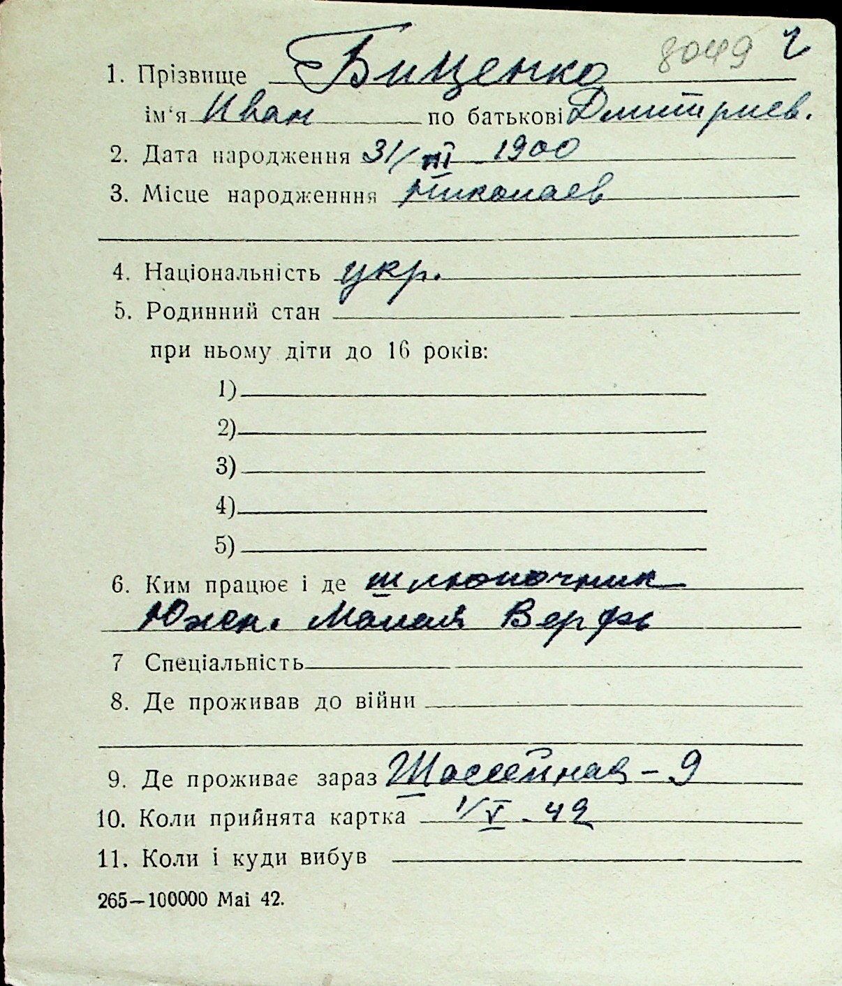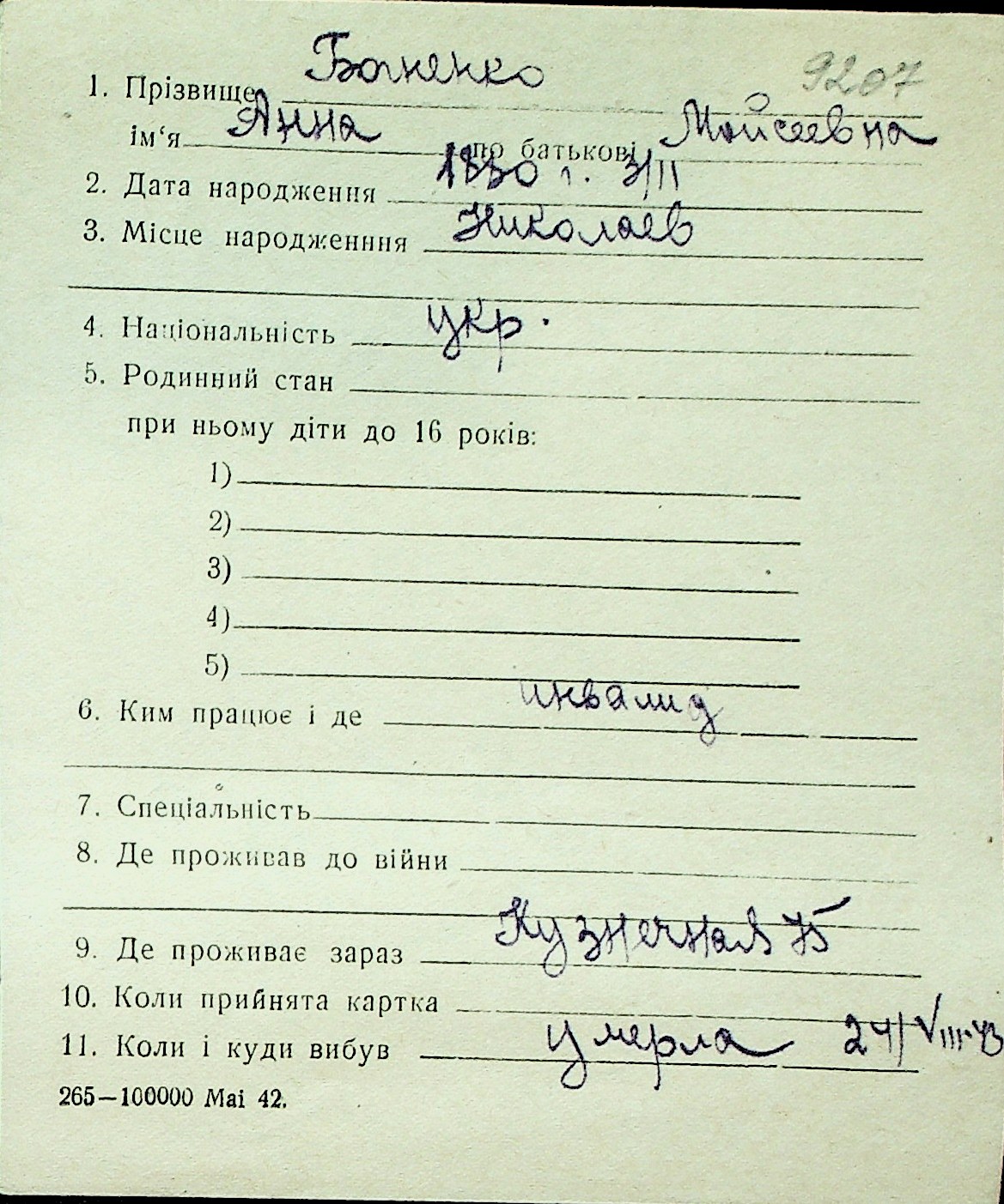 ◦ ◦ Перелік карток на осіб, які мешкали у м. Миколаїв у період окупації 1941–1944 років