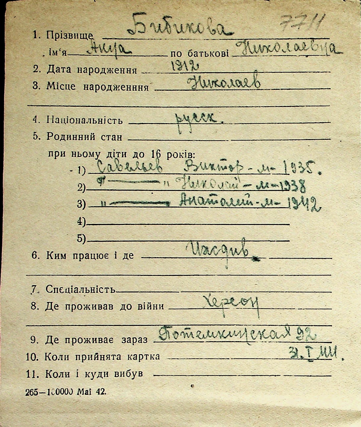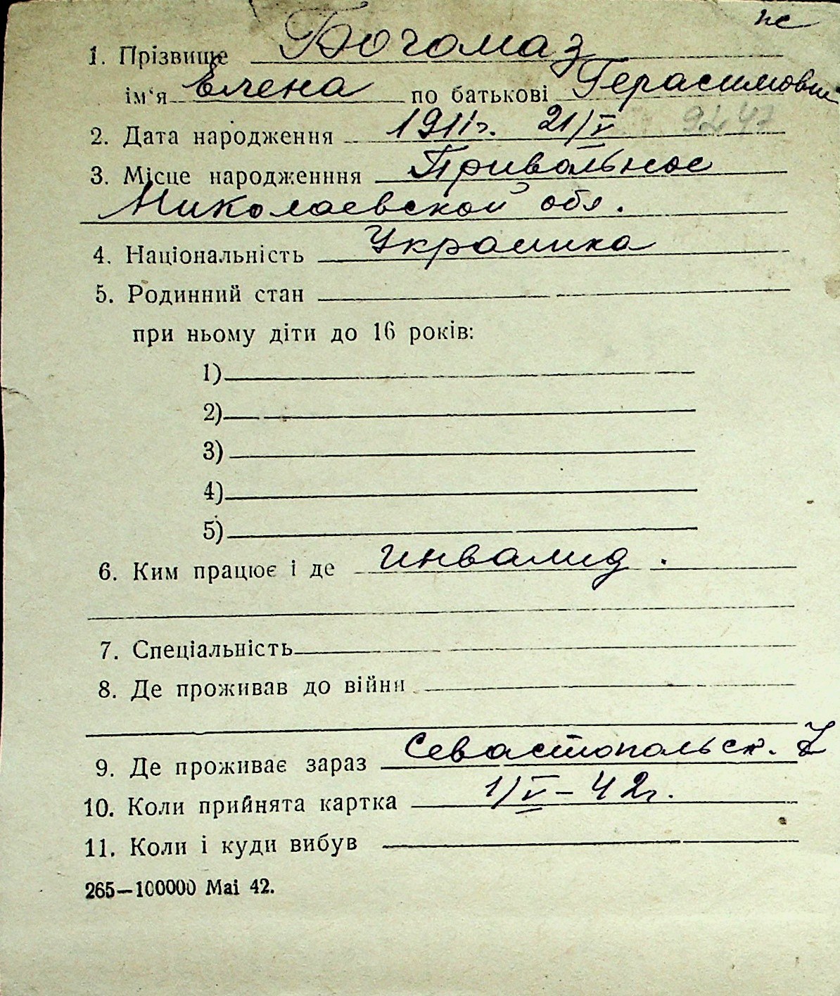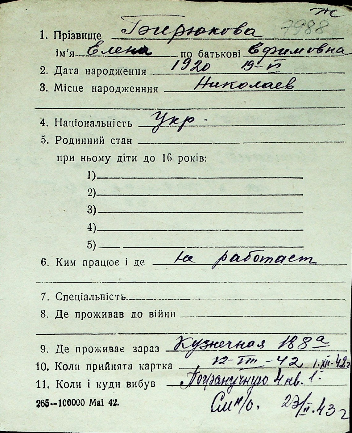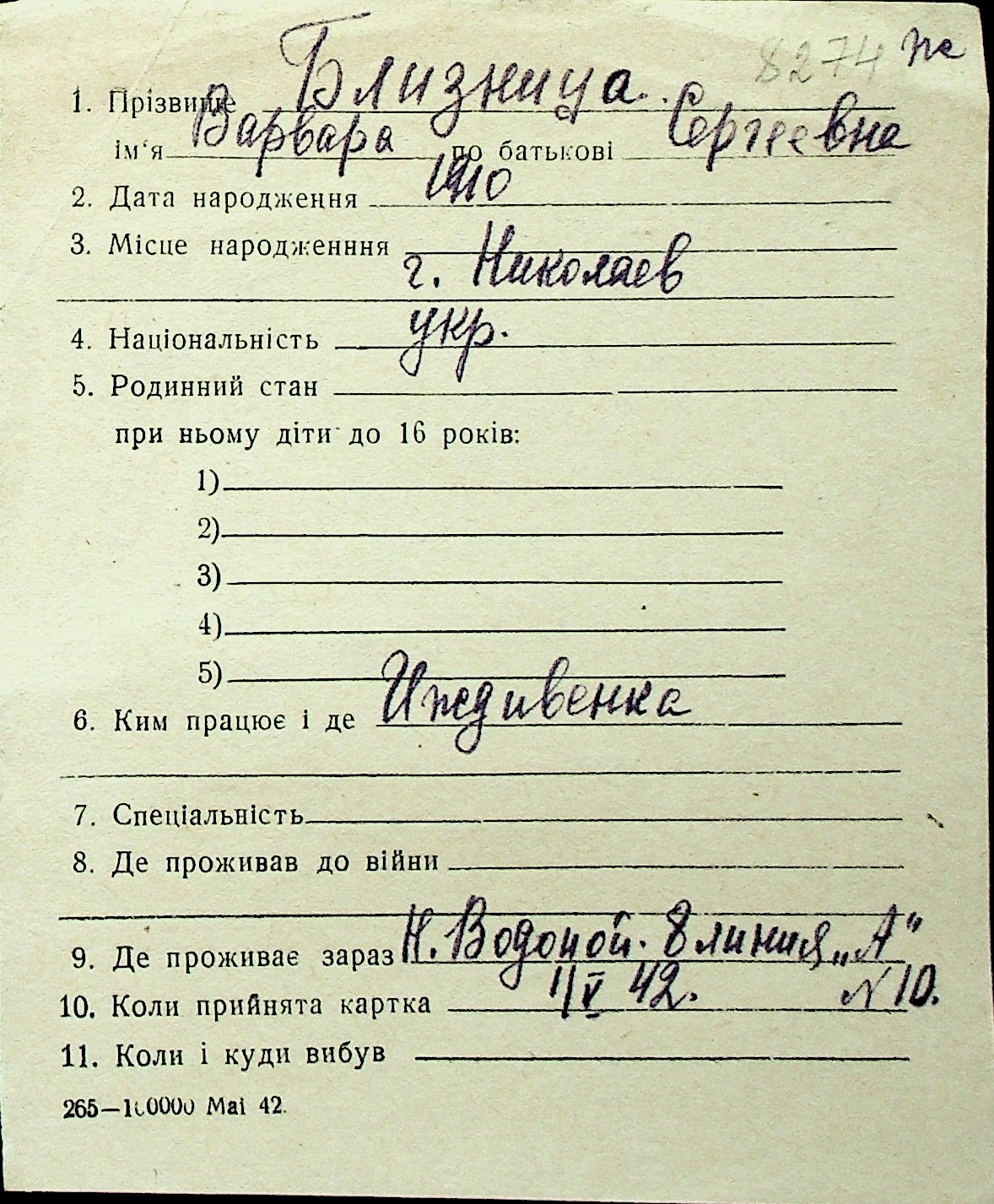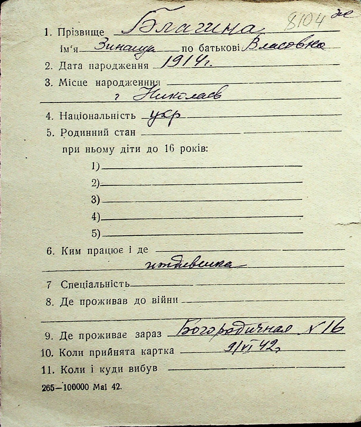 ◦ ◦ Перелік карток на осіб, які мешкали у м. Миколаїв у період окупації 1941–1944 років