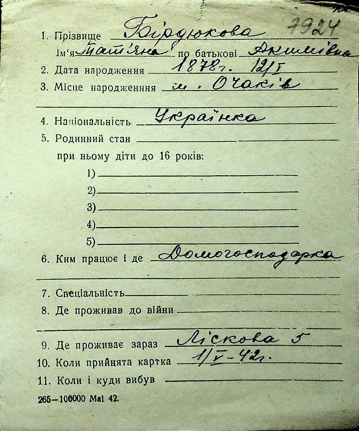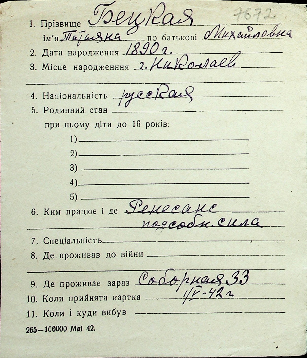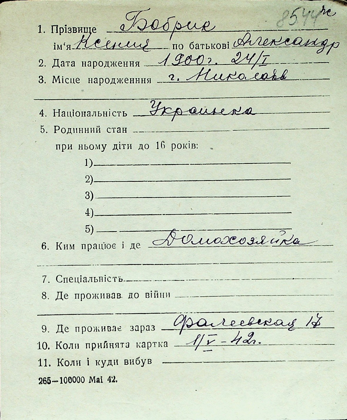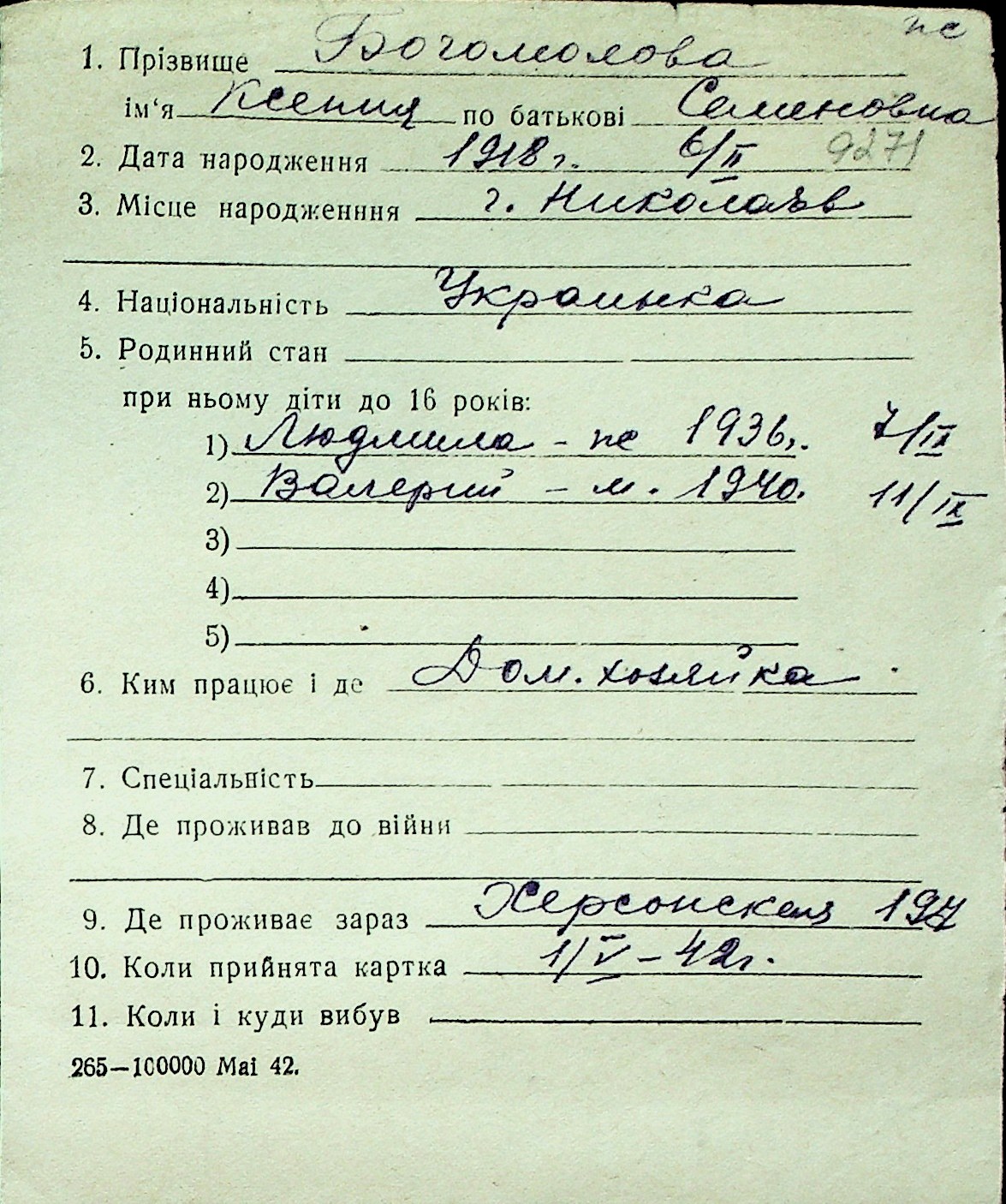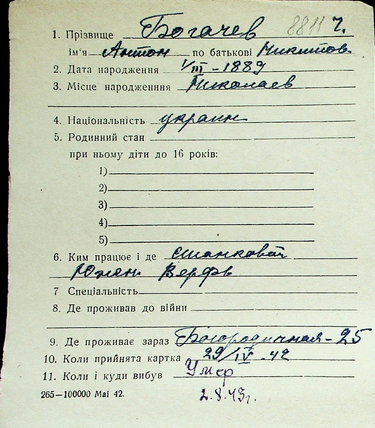 ◦ ◦ Перелік карток на осіб, які мешкали у м. Миколаїв у період окупації 1941–1944 років