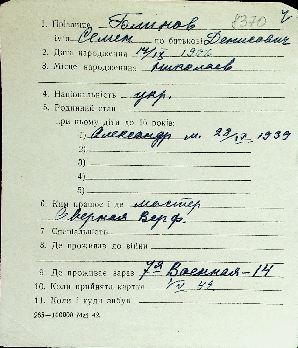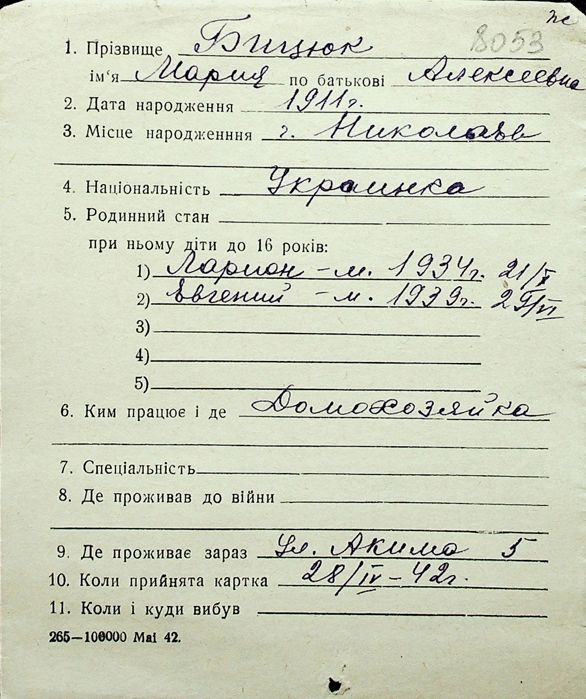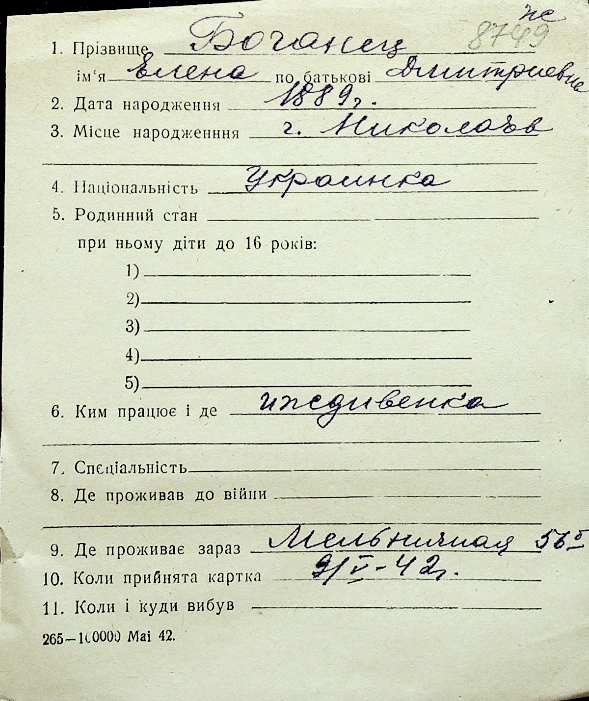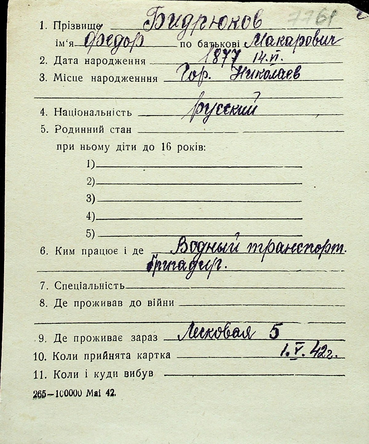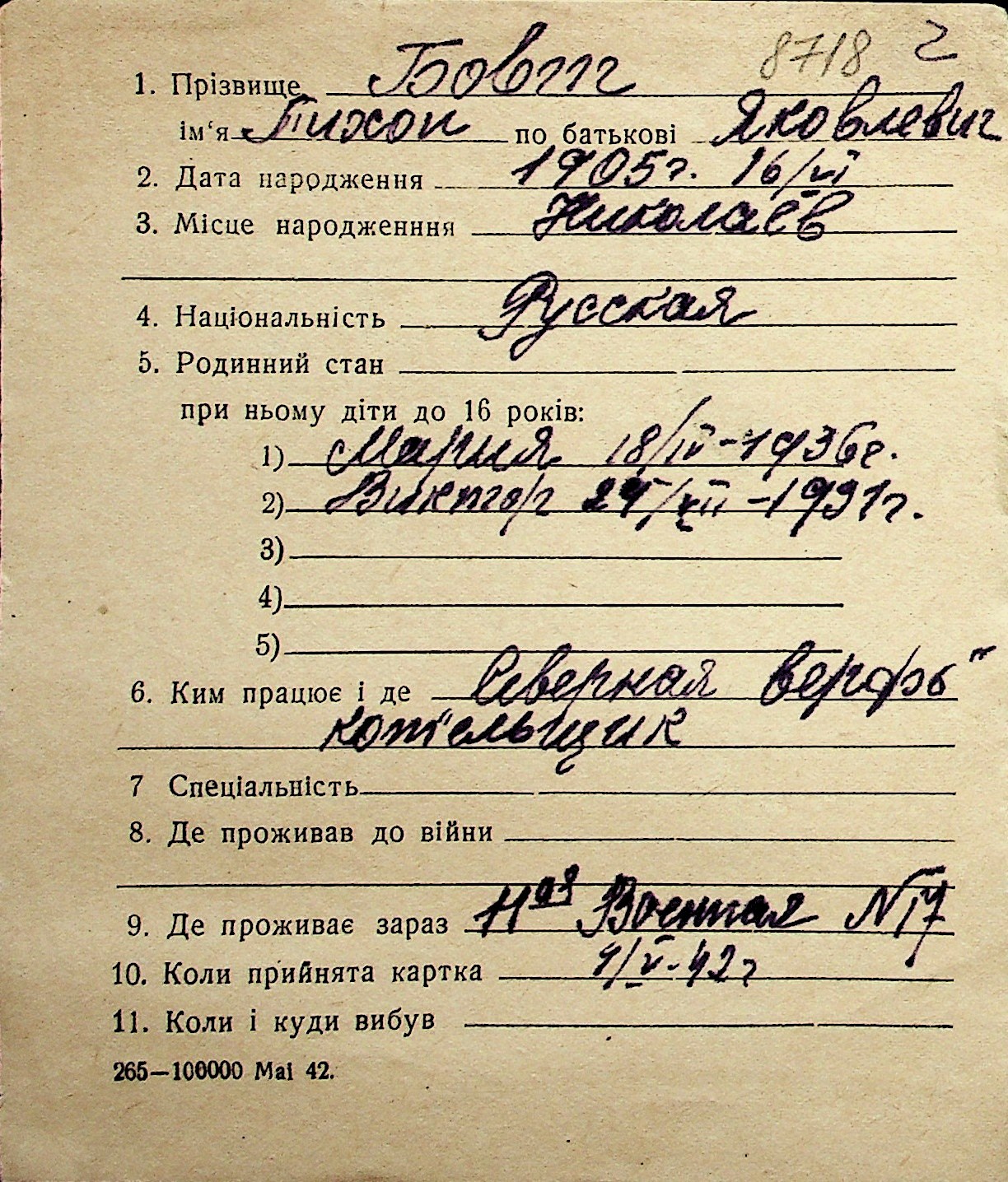 ◦ ◦ Перелік карток на осіб, які мешкали у м. Миколаїв у період окупації 1941–1944 років