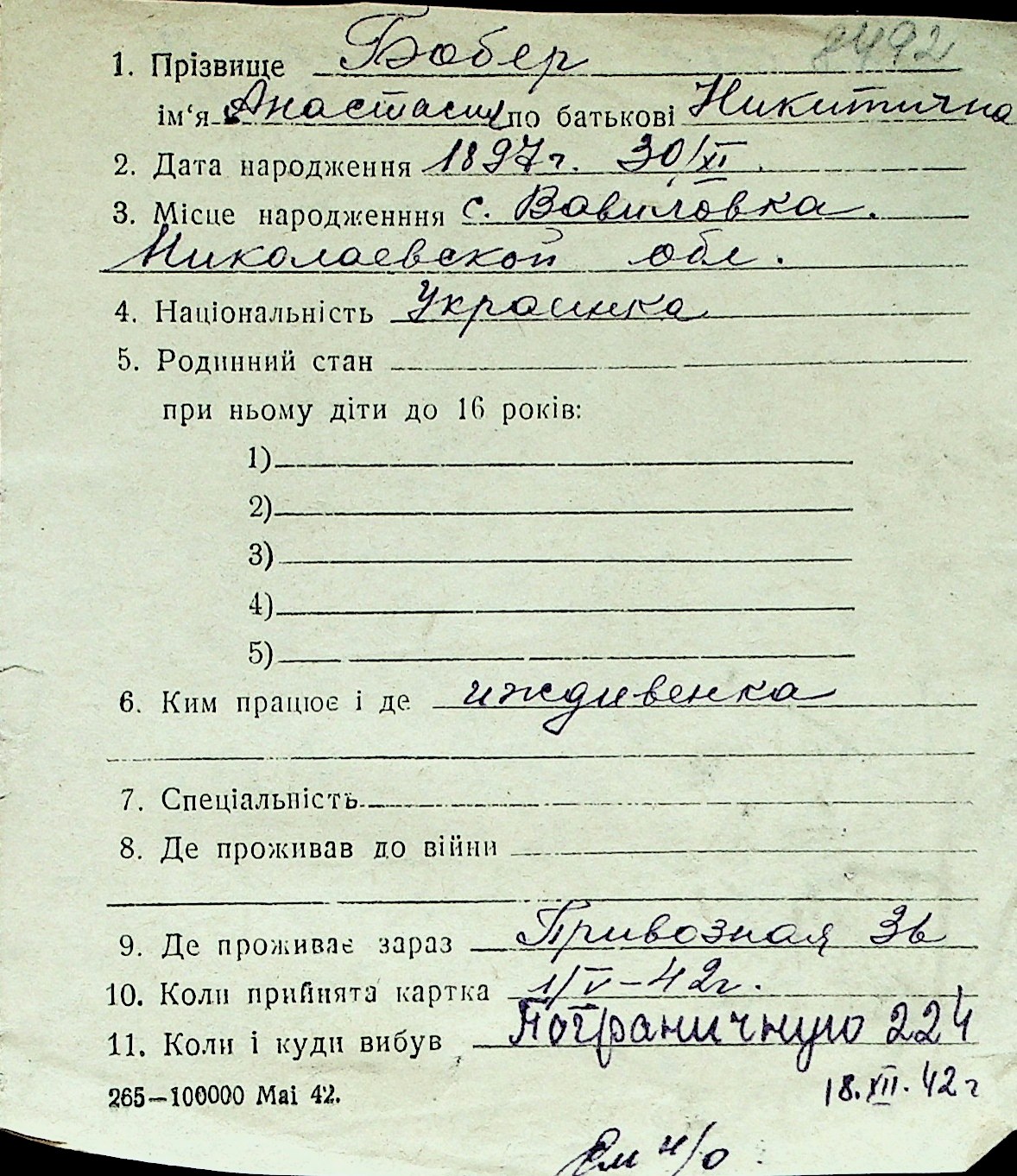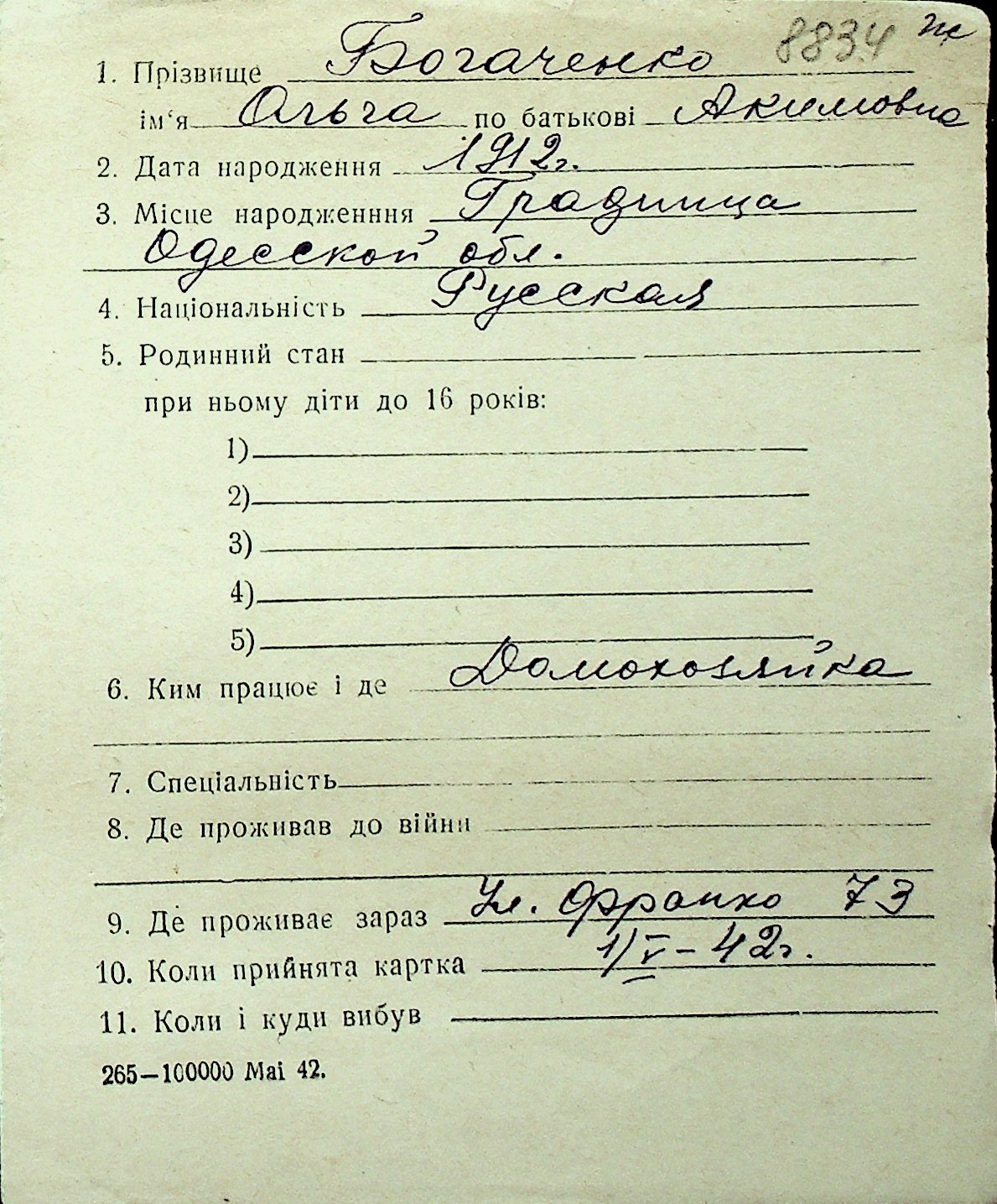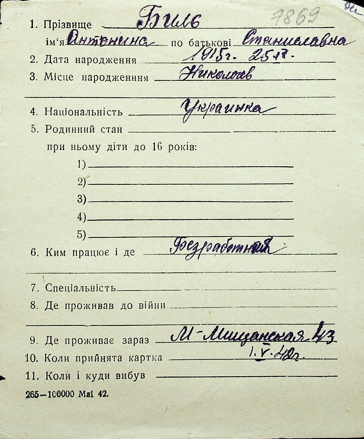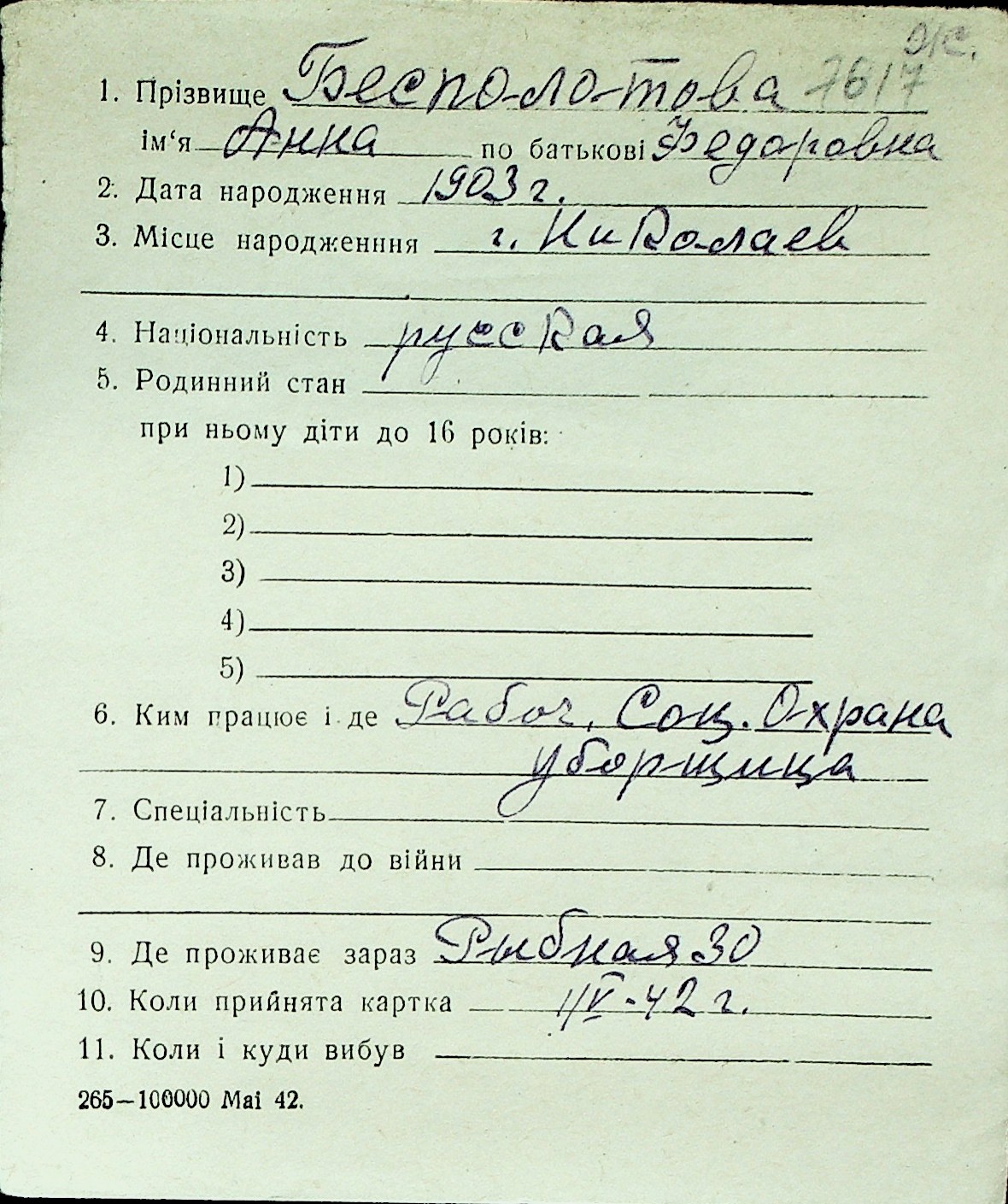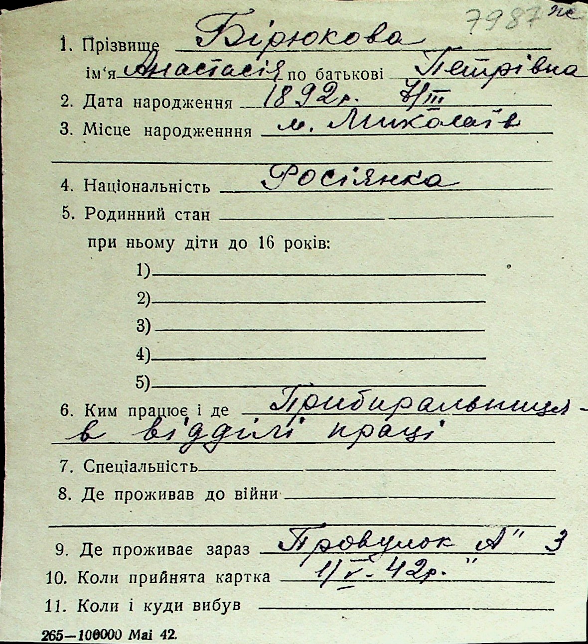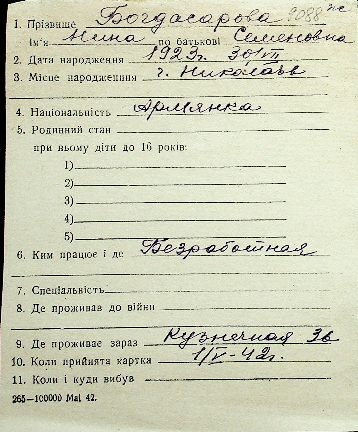 ◦ ◦ Перелік карток на осіб, які мешкали у м. Миколаїв у період окупації 1941–1944 років