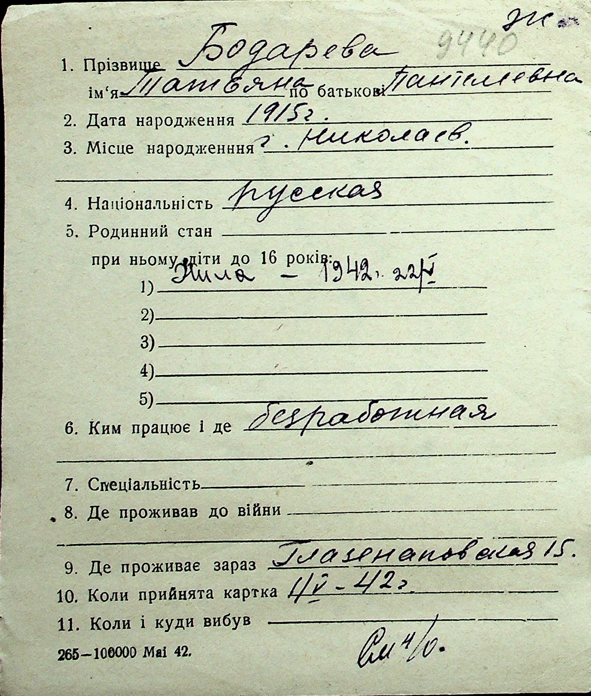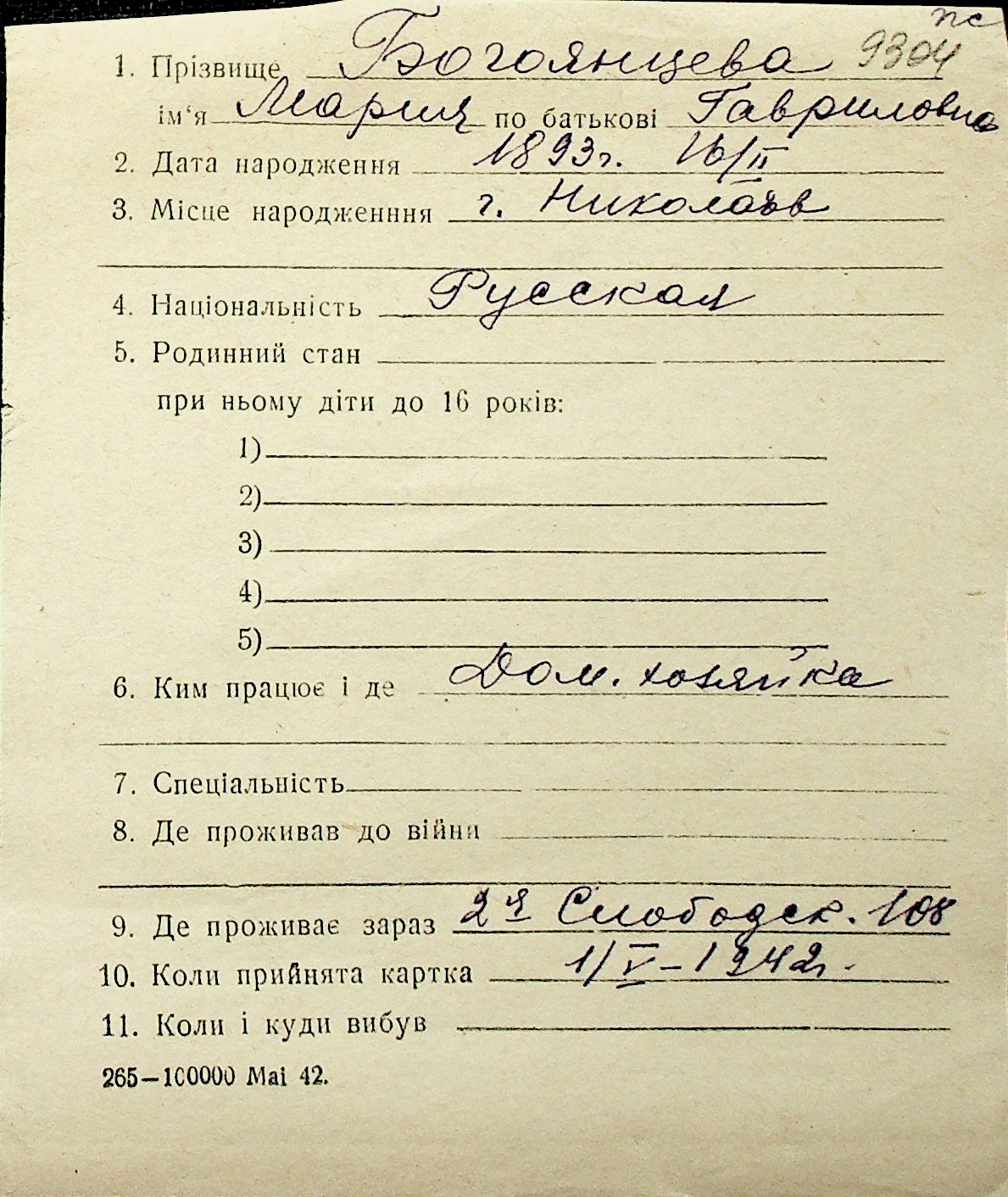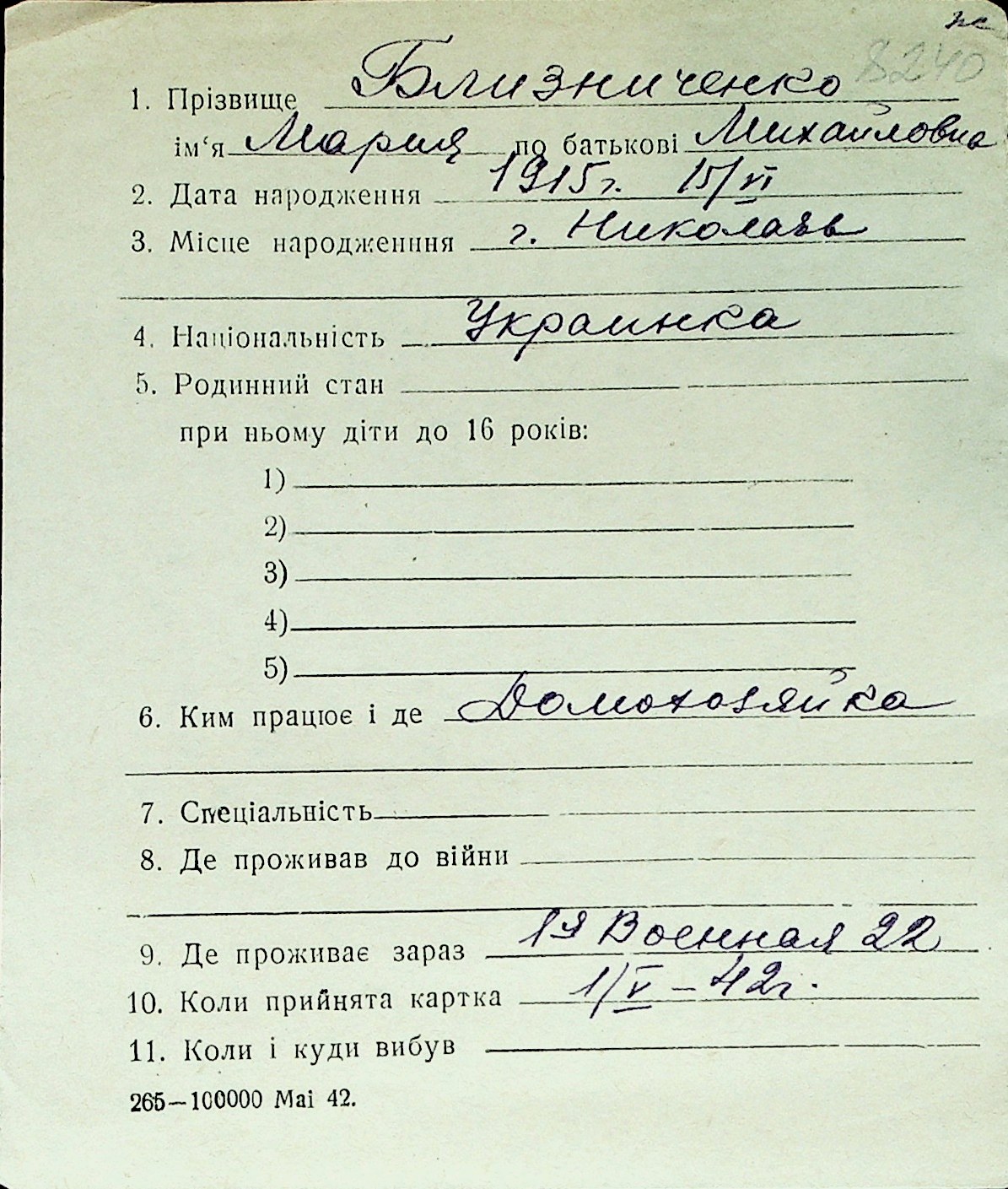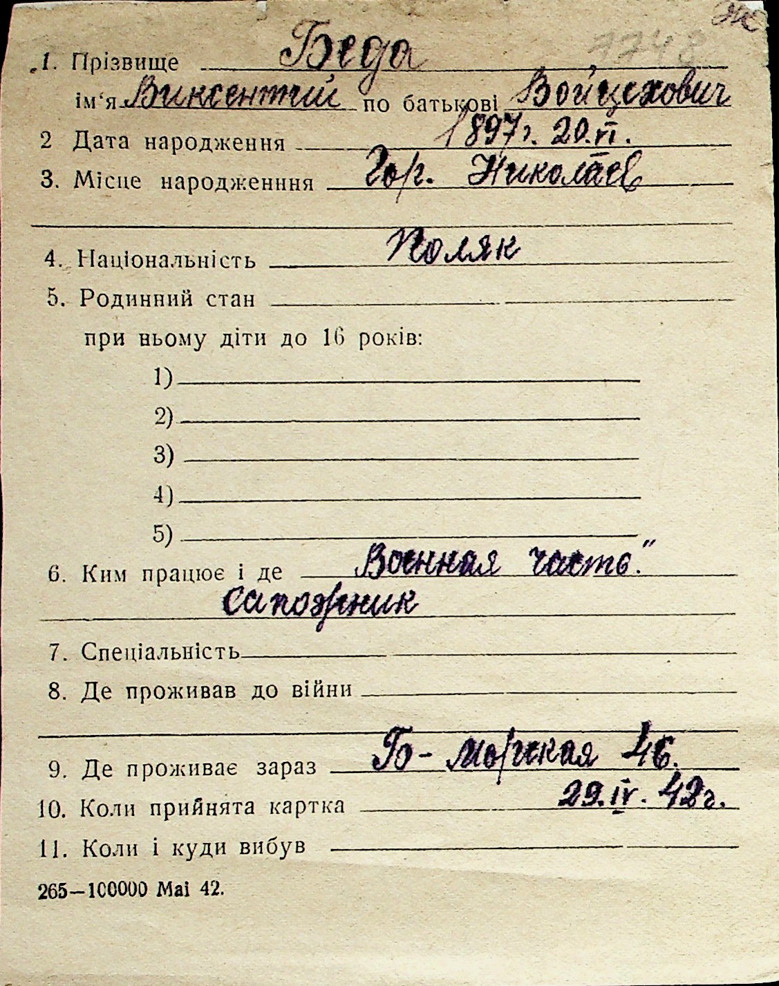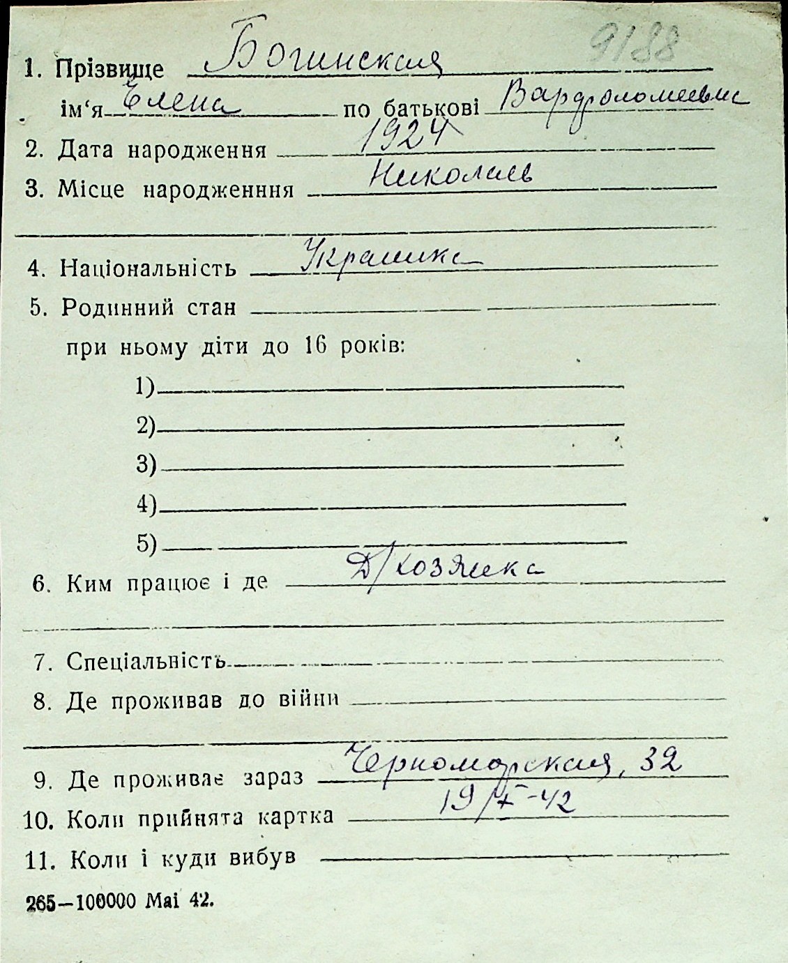 ◦ ◦ Перелік карток на осіб, які мешкали у м. Миколаїв у період окупації 1941–1944 років